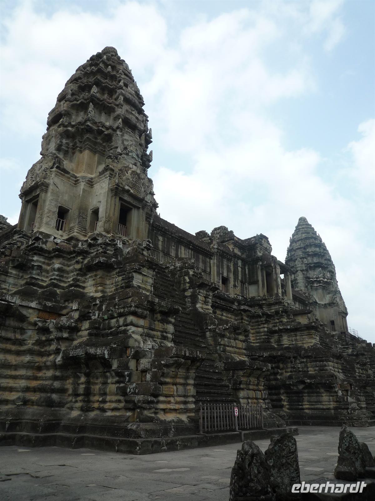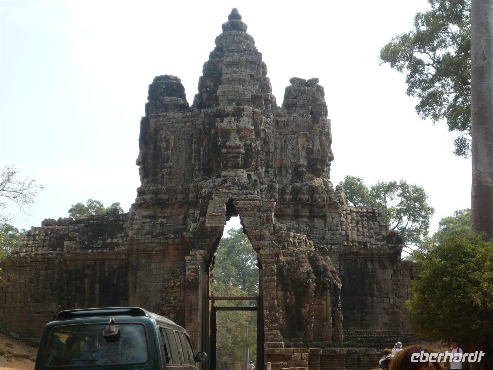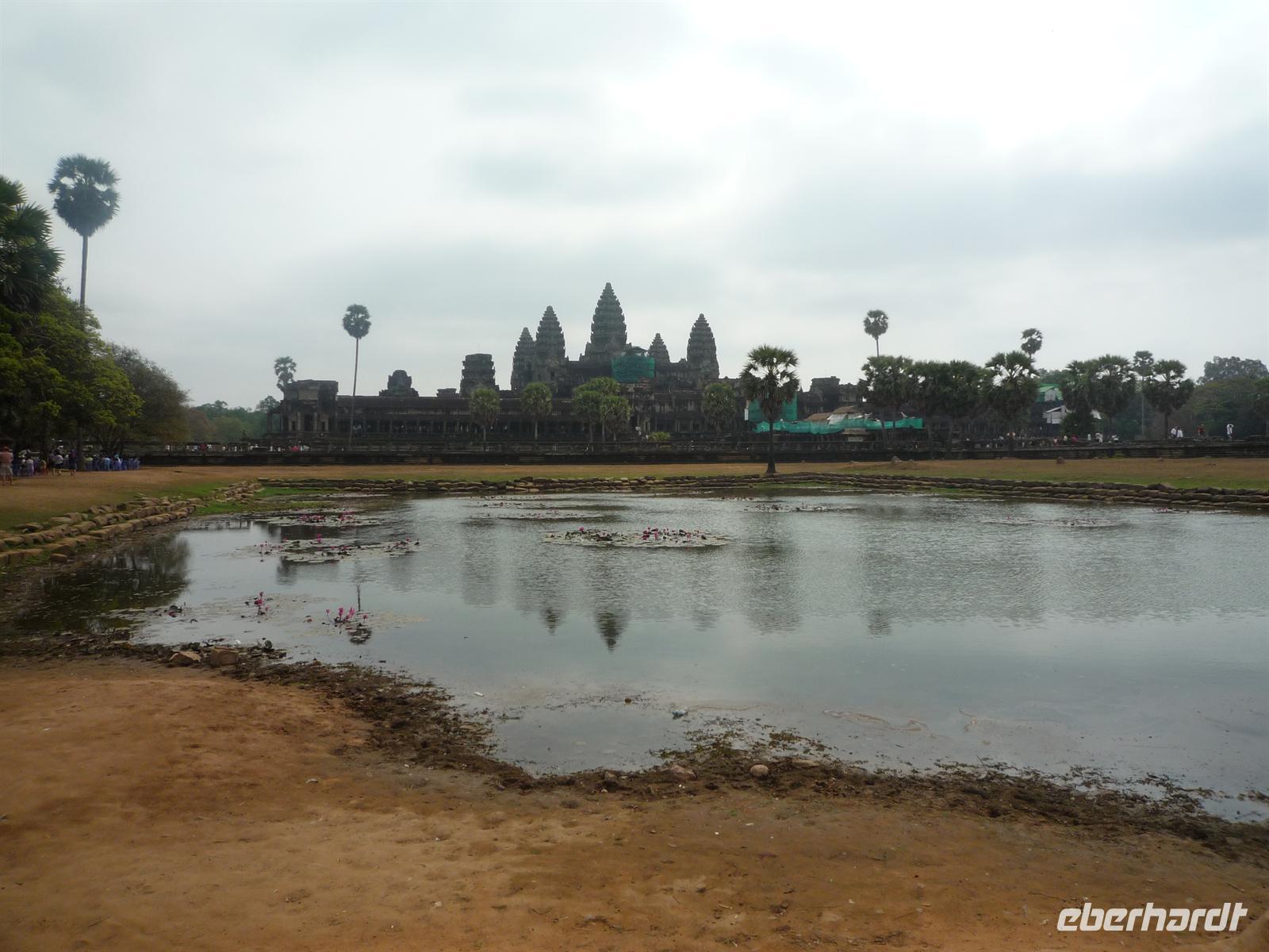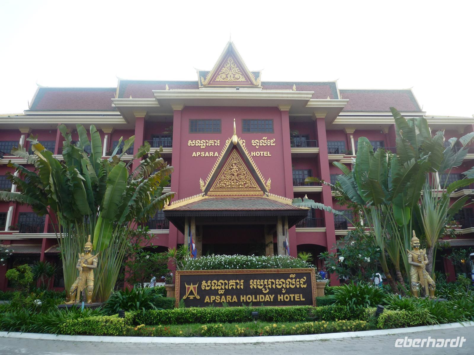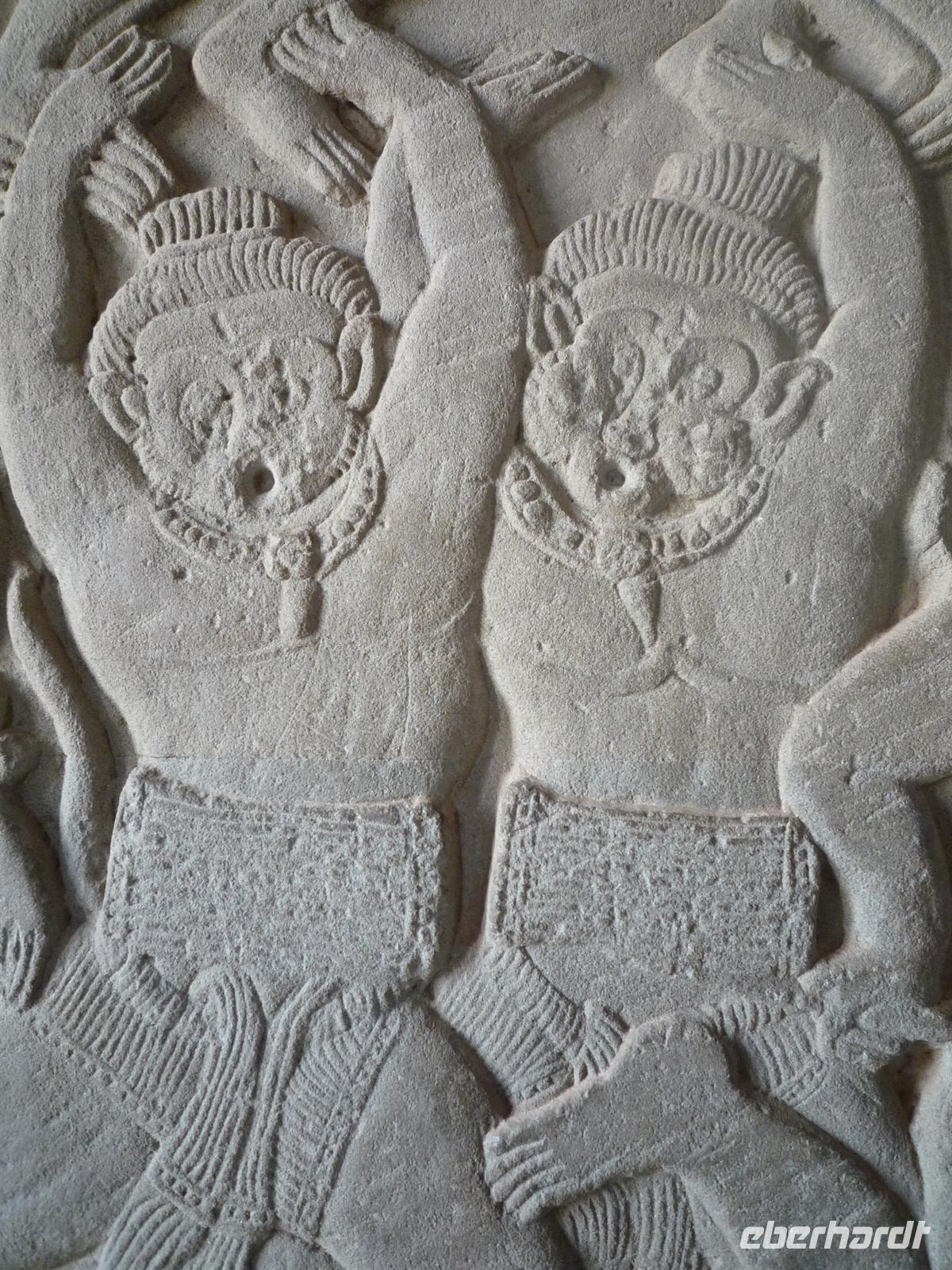 Ab heute steht mit Sicherheit einer der Höhepunkte auf dem Programm, die Besichtigung der Tempelanlagen von Angkor. Angkor bedeutet soviel wie Königsstadt oder Hauptstadt. Die meisten Besucher denken dabei vor allem an die beiden berühmten Tempel von Angkor Wat und Angkor Thom. Aber es gibt noch viele Tempel mehr, die in einem Zeitraum von mehr als 600 Jahren entstanden sind. Höhepunkt der Bauepoche waren dabei sicher die beiden schon genannten Anlagen. Wir besichtigen zuerst das unter König Suryavarmann II. erbaute Angkor Wat. Es ist ein beeindruckender Anblick schon zu Beginn des Rundgangs. Unser Reiseleiter Thol macht uns auf verschiedenen Details aufmerksam, erklärt die verschiedenen Reliefarten. Mit Hilfe einer Lotusblume erklärt er zum besseren verstehen, das architektonische Prinzip der Turmbauten und auch die immer wiederkehrenden Motive in den Wandverzierungen. Es gibt fast keinen Stein der nicht mit Verzierungen versehen ist. Immer wiederkehrendes Motiv sind auch Apsara-Tänzerinnen. Vorbei an den Bibliotheken gehen wir zur Nordost-Seite des Tempels. Von hier hat man einen Blick auf alle fünf Türme. Der mittlere und zugleich höchste Turm im Zentralheiligtum stellt den Berg Meru, den Berg der Götter, dar. Wir befinden uns jetzt in der ersten Galerie und das kann man ganz wörtlich nehmen. Hier befinden sich verschiedene, bis zu 100 m lange Reliefs mit Darstellungen aus dem Hinduismus. Der Erbauer war Anhänger dieser Religion, später wandte er sich dann zum Buddhismus. Daher hat Angkor - Königsstadt - noch einen Beinahmen bekommen. Mit Wat bezeichnen die Khmer einen buddhistischen Tempel. Die Reliefs zeigen Geschichten wie den Zweikampf zwischen Vishnu und den Dämonen Kalanemi oder Himmel und Hölle mit dem Totenrichter Yama und zahlreiche andere. Es ist faszinierend mit welchem Detailreichtum alle Reliefs ausgestattet sind. Man sieht zahlreiche Krieger, Elefanten, Götter und Dämonen und alles ist so gestaltet, das sich eine Geschichte erzählen lässt. Diese für uns fremde Götterwelt lässt sich dadurch etwas besser erfassen. Anschließend gehen wir auf die nächste Galerie und stehen in einem Hofraum. Vor uns ist jetzt das Zentralheiligtum mit seinen markanten Türmen, die 3. Ebende. Da heute Buddhatag ist, ist sie aber geschlossen. Wir werden aber morgen wieder kommen. Langsam begeben wir uns wieder nach unten und gehen dann langsam wieder zurück zum Haupteingang. Immer mal wieder einen Blick zurück nehmend verlassen wir dieses gewaltige Zeugnis aus dem 12. Jh.Inzwischen sind über drei Stunden vergangen und wir machen zuerst eine Mittagspause.