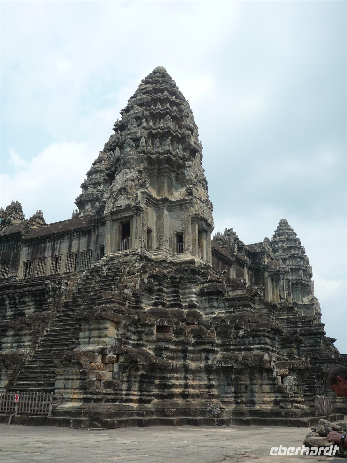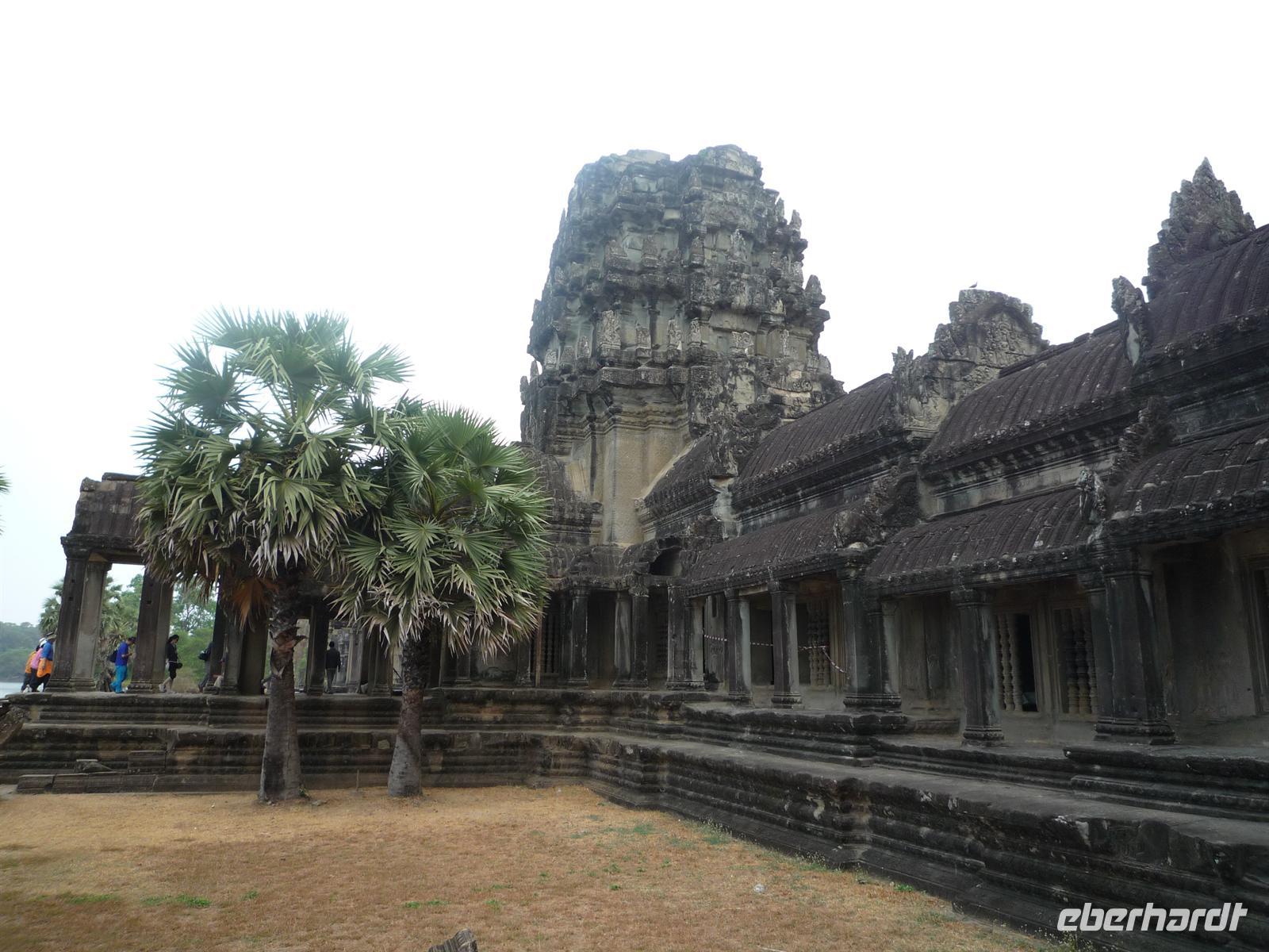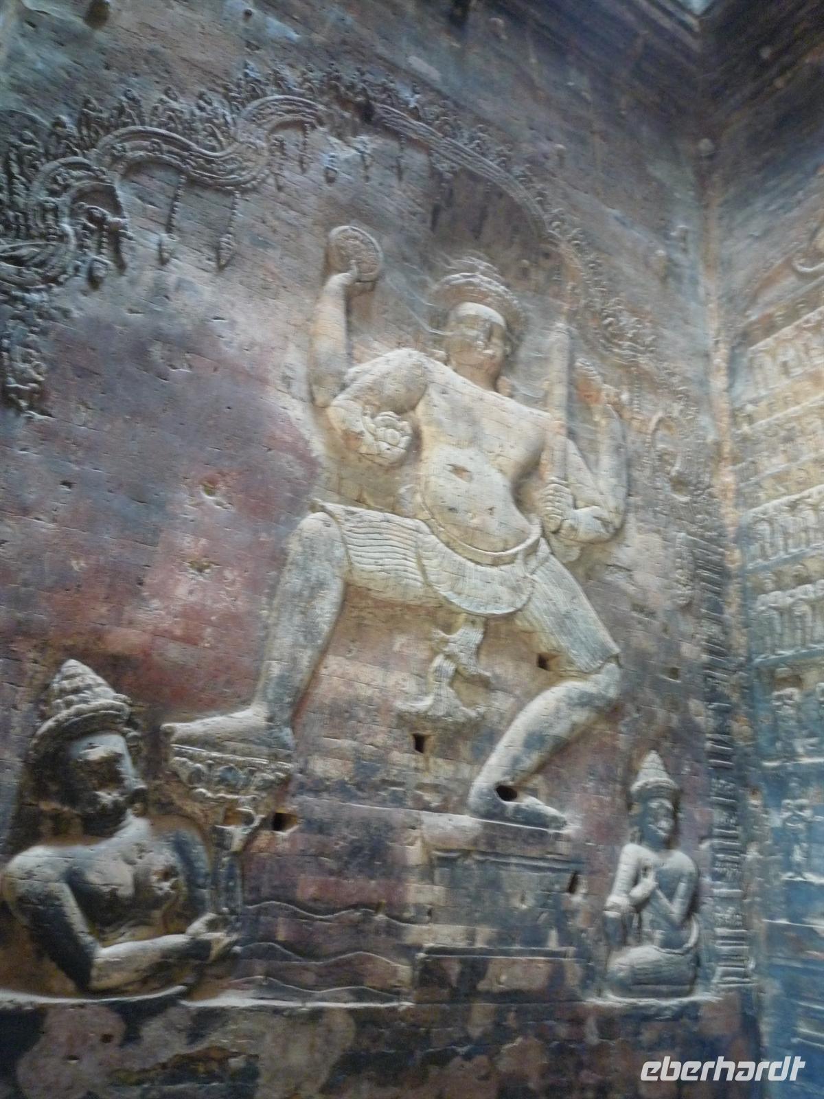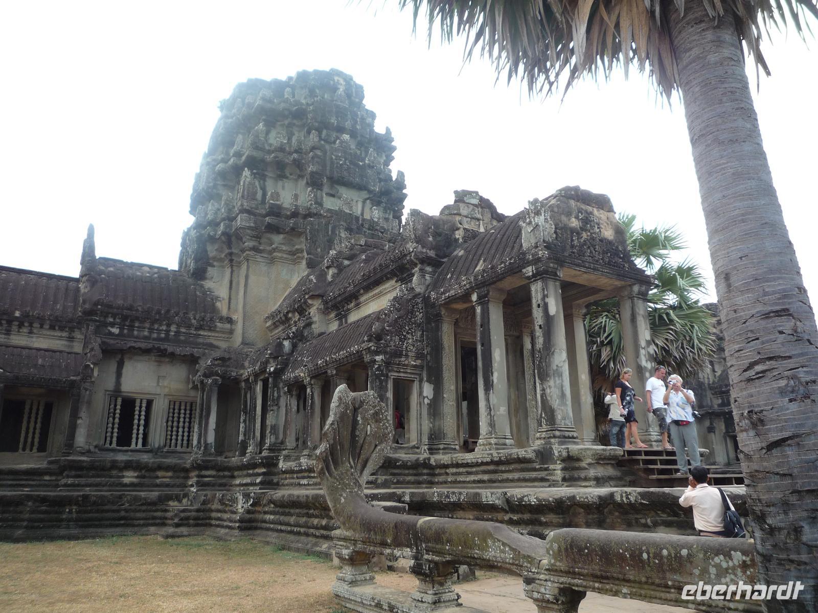 Ab heute steht mit Sicherheit einer der Höhepunkte auf dem Programm, die Besichtigung der Tempelanlagen von Angkor. Angkor bedeutet soviel wie Königsstadt oder Hauptstadt. Die meisten Besucher denken dabei vor allem an die beiden berühmten Tempel von Angkor Wat und Angkor Thom. Aber es gibt noch viele Tempel mehr, die in einem Zeitraum von mehr als 600 Jahren entstanden sind. Höhepunkt der Bauepoche waren dabei sicher die beiden schon genannten Anlagen. Wir besichtigen zuerst das unter König Suryavarmann II. erbaute Angkor Wat. Es ist ein beeindruckender Anblick schon zu Beginn des Rundgangs. Unser Reiseleiter Thol macht uns auf verschiedenen Details aufmerksam, erklärt die verschiedenen Reliefarten. Mit Hilfe einer Lotusblume erklärt er zum besseren verstehen, das architektonische Prinzip der Turmbauten und auch die immer wiederkehrenden Motive in den Wandverzierungen. Es gibt fast keinen Stein der nicht mit Verzierungen versehen ist. Immer wiederkehrendes Motiv sind auch Apsara-Tänzerinnen. Vorbei an den Bibliotheken gehen wir zur Nordost-Seite des Tempels. Von hier hat man einen Blick auf alle fünf Türme. Der mittlere und zugleich höchste Turm im Zentralheiligtum stellt den Berg Meru, den Berg der Götter, dar. Wir befinden uns jetzt in der ersten Galerie und das kann man ganz wörtlich nehmen. Hier befinden sich verschiedene, bis zu 100 m lange Reliefs mit Darstellungen aus dem Hinduismus. Der Erbauer war Anhänger dieser Religion, später wandte er sich dann zum Buddhismus. Daher hat Angkor - Königsstadt - noch einen Beinahmen bekommen. Mit Wat bezeichnen die Khmer einen buddhistischen Tempel. Die Reliefs zeigen Geschichten wie den Zweikampf zwischen Vishnu und den Dämonen Kalanemi oder Himmel und Hölle mit dem Totenrichter Yama und zahlreiche andere. Es ist faszinierend mit welchem Detailreichtum alle Reliefs ausgestattet sind. Man sieht zahlreiche Krieger, Elefanten, Götter und Dämonen und alles ist so gestaltet, das sich eine Geschichte erzählen lässt. Diese für uns fremde Götterwelt lässt sich dadurch etwas besser erfassen. Anschließend gehen wir auf die nächste Galerie und stehen in einem Hofraum. Vor uns ist jetzt das Zentralheiligtum mit seinen markanten Türmen, die 3. Ebende. Da heute Buddhatag ist, ist sie aber geschlossen. Wir werden aber morgen wieder kommen. Langsam begeben wir uns wieder nach unten und gehen dann langsam wieder zurück zum Haupteingang. Immer mal wieder einen Blick zurück nehmend verlassen wir dieses gewaltige Zeugnis aus dem 12. Jh.Inzwischen sind über drei Stunden vergangen und wir machen zuerst eine Mittagspause.