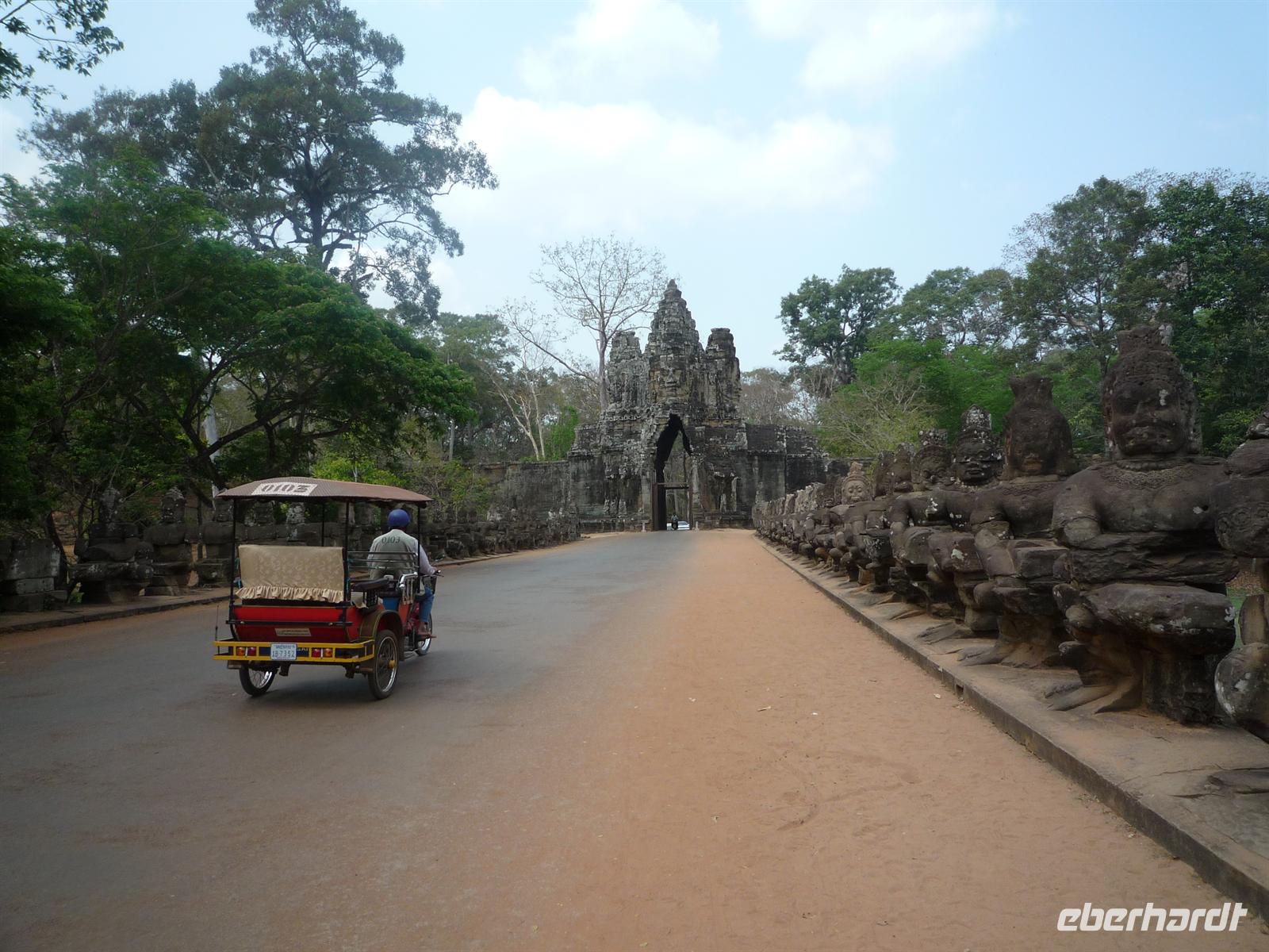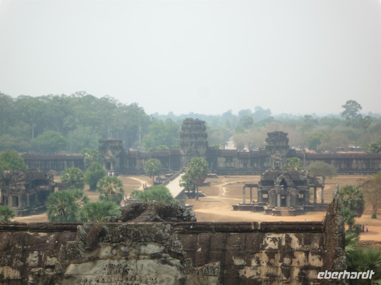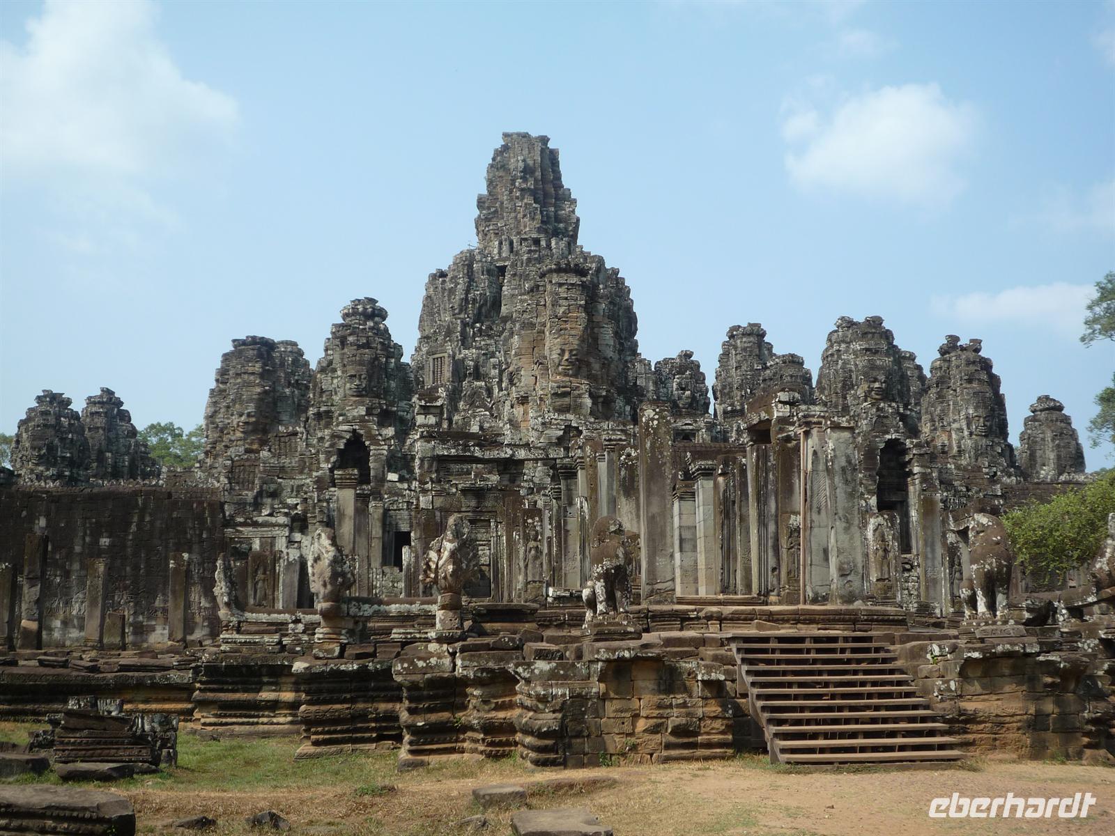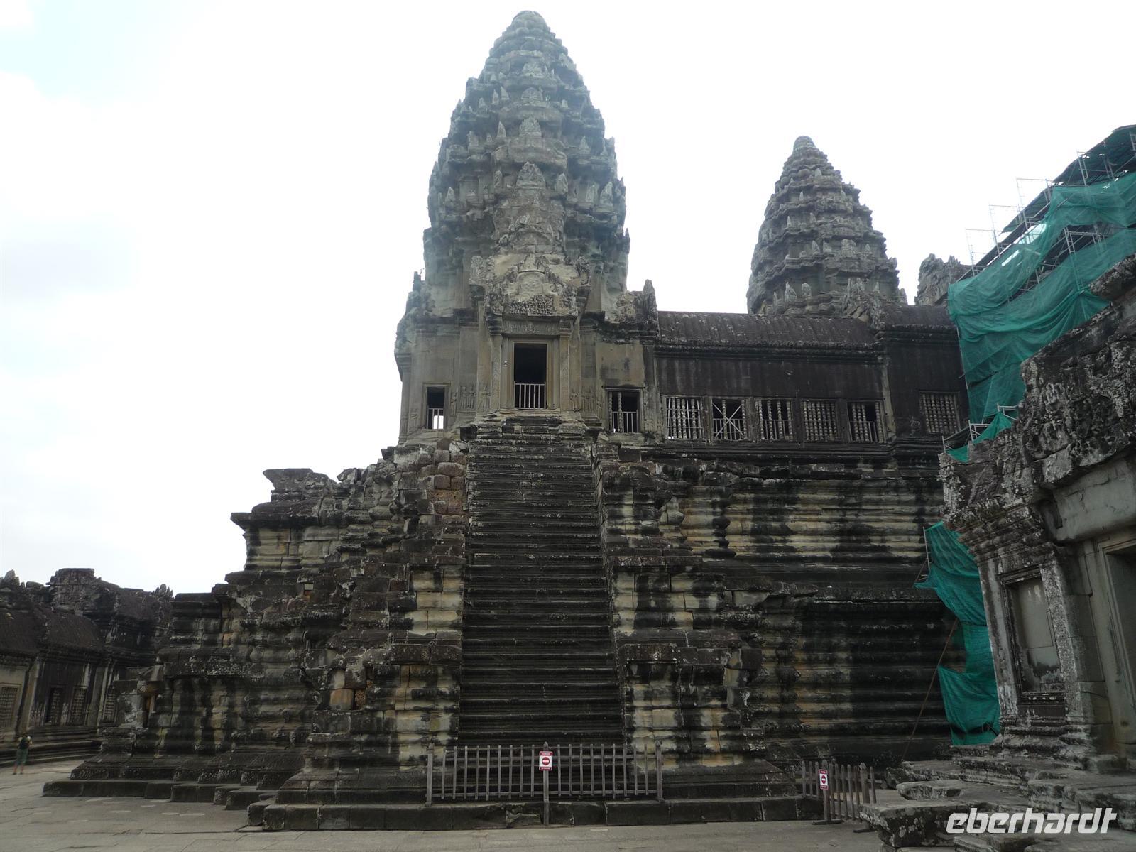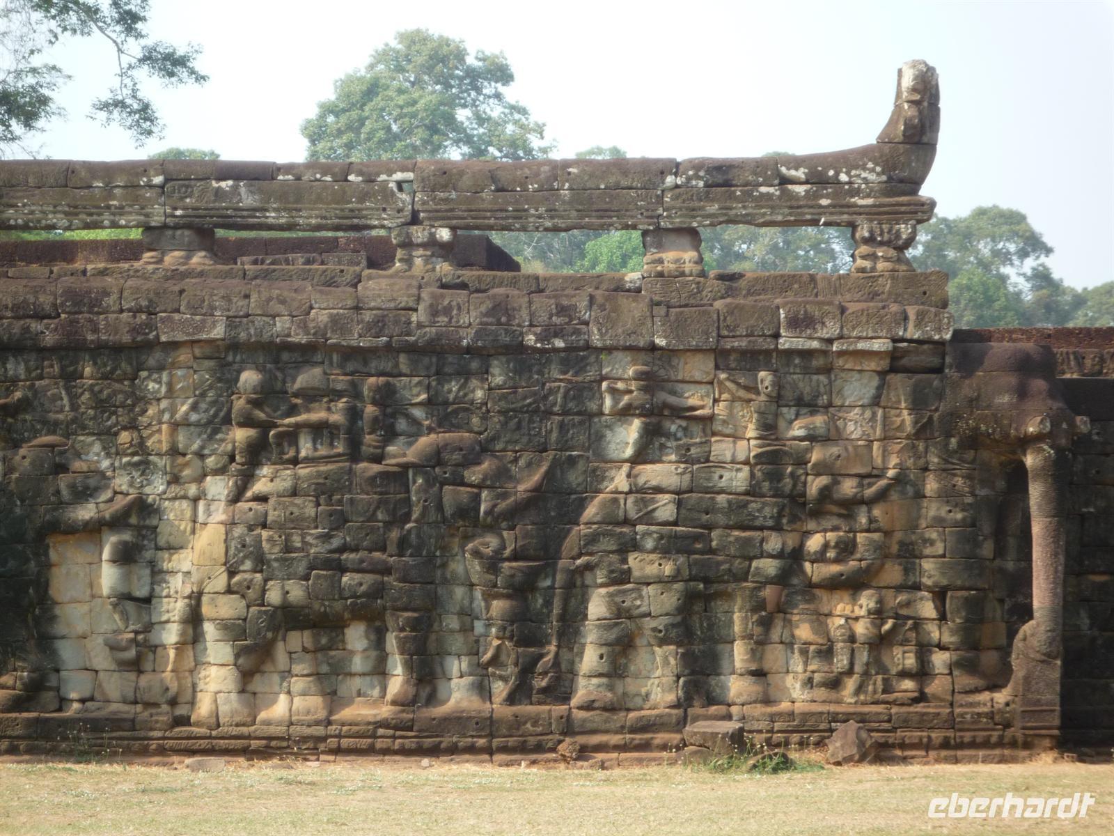 Ab heute steht mit Sicherheit einer der Höhepunkte auf dem Programm, die Besichtigung der Tempelanlagen von Angkor. Angkor bedeutet soviel wie Königsstadt oder Hauptstadt. Die meisten Besucher denken dabei vor allem an die beiden berühmten Tempel von Angkor Wat und Angkor Thom. Aber es gibt noch viele Tempel mehr, die in einem Zeitraum von mehr als 600 Jahren entstanden sind. Höhepunkt der Bauepoche waren dabei sicher die beiden schon genannten Anlagen. Wir besichtigen zuerst das unter König Suryavarmann II. erbaute Angkor Wat. Es ist ein beeindruckender Anblick schon zu Beginn des Rundgangs. Unser Reiseleiter Thol macht uns auf verschiedenen Details aufmerksam, erklärt die verschiedenen Reliefarten. Mit Hilfe einer Lotusblume erklärt er zum besseren verstehen, das architektonische Prinzip der Turmbauten und auch die immer wiederkehrenden Motive in den Wandverzierungen. Es gibt fast keinen Stein der nicht mit Verzierungen versehen ist. Immer wiederkehrendes Motiv sind auch Apsara-Tänzerinnen. Vorbei an den Bibliotheken gehen wir zur Nordost-Seite des Tempels. Von hier hat man einen Blick auf alle fünf Türme. Der mittlere und zugleich höchste Turm im Zentralheiligtum stellt den Berg Meru, den Berg der Götter, dar. Wir befinden uns jetzt in der ersten Galerie und das kann man ganz wörtlich nehmen. Hier befinden sich verschiedene, bis zu 100 m lange Reliefs mit Darstellungen aus dem Hinduismus. Der Erbauer war Anhänger dieser Religion, später wandte er sich dann zum Buddhismus. Daher hat Angkor - Königsstadt - noch einen Beinahmen bekommen. Mit Wat bezeichnen die Khmer einen buddhistischen Tempel. Die Reliefs zeigen Geschichten wie den Zweikampf zwischen Vishnu und den Dämonen Kalanemi oder Himmel und Hölle mit dem Totenrichter Yama und zahlreiche andere. Es ist faszinierend mit welchem Detailreichtum alle Reliefs ausgestattet sind. Man sieht zahlreiche Krieger, Elefanten, Götter und Dämonen und alles ist so gestaltet, das sich eine Geschichte erzählen lässt. Diese für uns fremde Götterwelt lässt sich dadurch etwas besser erfassen. Anschließend gehen wir auf die nächste Galerie und stehen in einem Hofraum. Vor uns ist jetzt das Zentralheiligtum mit seinen markanten Türmen, die 3. Ebende. Da heute Buddhatag ist, ist sie aber geschlossen. Wir werden aber morgen wieder kommen. Langsam begeben wir uns wieder nach unten und gehen dann langsam wieder zurück zum Haupteingang. Immer mal wieder einen Blick zurück nehmend verlassen wir dieses gewaltige Zeugnis aus dem 12. Jh.Inzwischen sind über drei Stunden vergangen und wir machen zuerst eine Mittagspause.