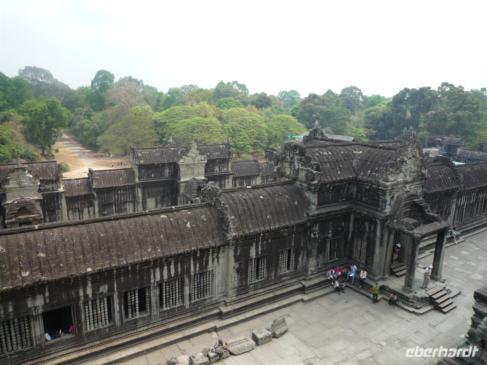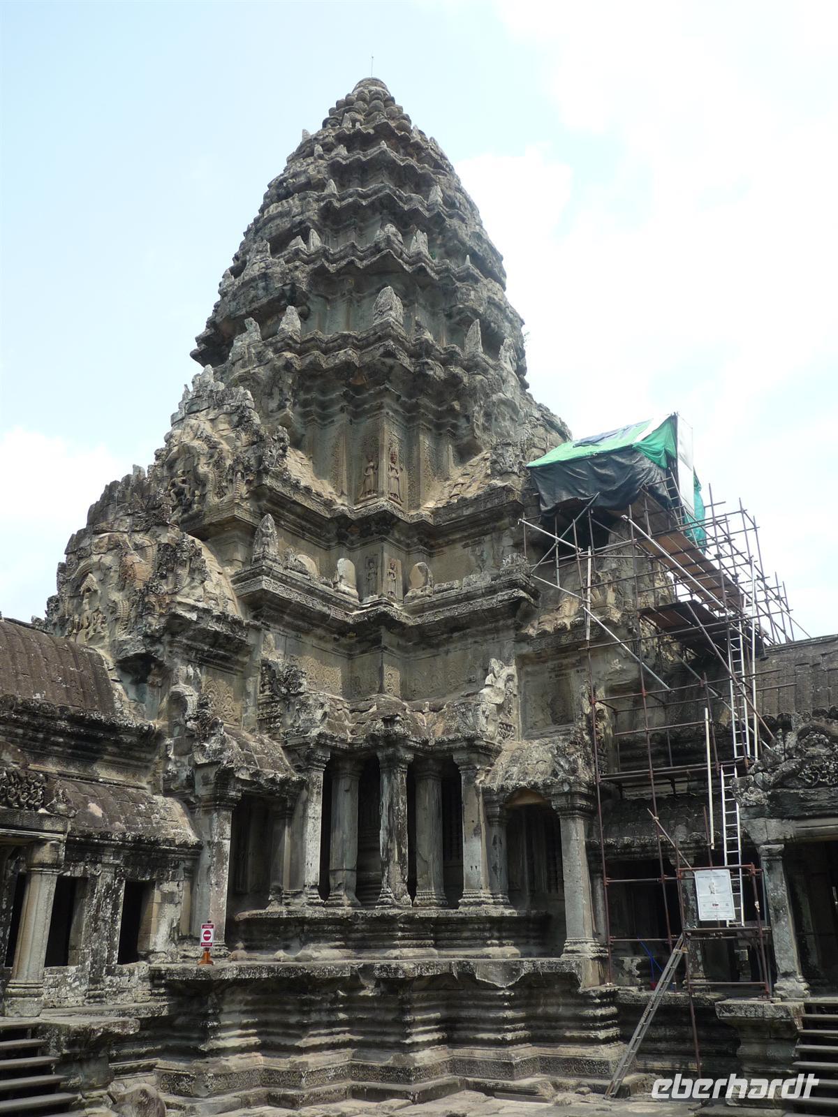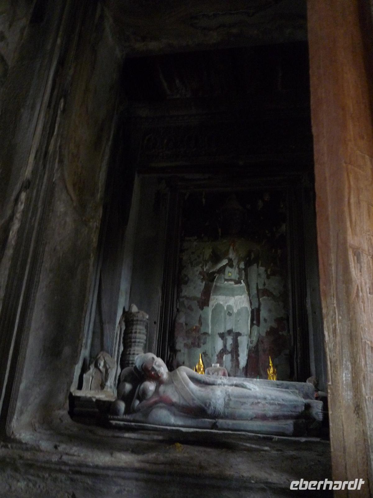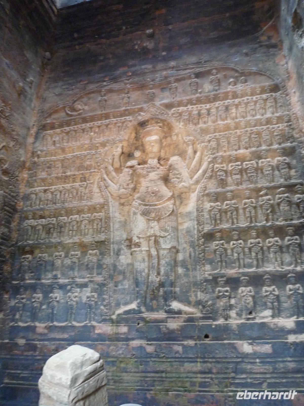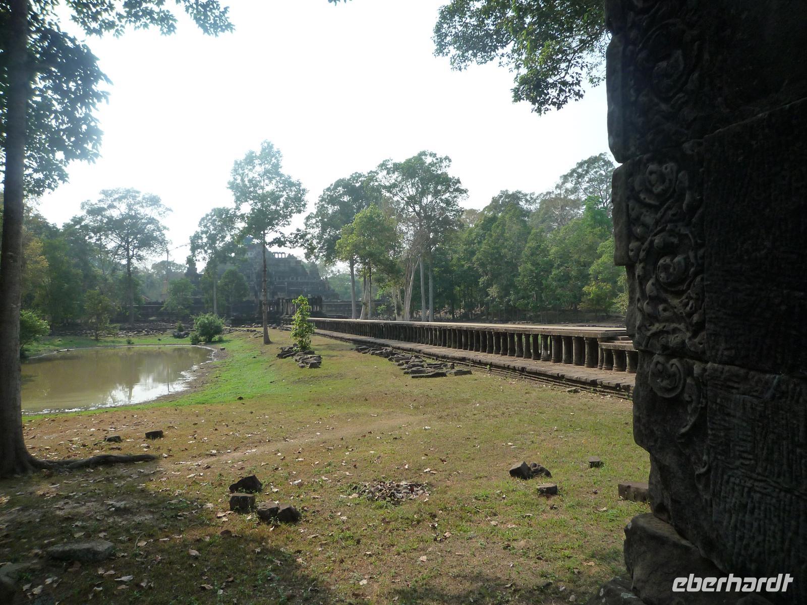 Ab heute steht mit Sicherheit einer der Höhepunkte auf dem Programm, die Besichtigung der Tempelanlagen von Angkor. Angkor bedeutet soviel wie Königsstadt oder Hauptstadt. Die meisten Besucher denken dabei vor allem an die beiden berühmten Tempel von Angkor Wat und Angkor Thom. Aber es gibt noch viele Tempel mehr, die in einem Zeitraum von mehr als 600 Jahren entstanden sind. Höhepunkt der Bauepoche waren dabei sicher die beiden schon genannten Anlagen. Wir besichtigen zuerst das unter König Suryavarmann II. erbaute Angkor Wat. Es ist ein beeindruckender Anblick schon zu Beginn des Rundgangs. Unser Reiseleiter Thol macht uns auf verschiedenen Details aufmerksam, erklärt die verschiedenen Reliefarten. Mit Hilfe einer Lotusblume erklärt er zum besseren verstehen, das architektonische Prinzip der Turmbauten und auch die immer wiederkehrenden Motive in den Wandverzierungen. Es gibt fast keinen Stein der nicht mit Verzierungen versehen ist. Immer wiederkehrendes Motiv sind auch Apsara-Tänzerinnen. Vorbei an den Bibliotheken gehen wir zur Nordost-Seite des Tempels. Von hier hat man einen Blick auf alle fünf Türme. Der mittlere und zugleich höchste Turm im Zentralheiligtum stellt den Berg Meru, den Berg der Götter, dar. Wir befinden uns jetzt in der ersten Galerie und das kann man ganz wörtlich nehmen. Hier befinden sich verschiedene, bis zu 100 m lange Reliefs mit Darstellungen aus dem Hinduismus. Der Erbauer war Anhänger dieser Religion, später wandte er sich dann zum Buddhismus. Daher hat Angkor - Königsstadt - noch einen Beinahmen bekommen. Mit Wat bezeichnen die Khmer einen buddhistischen Tempel. Die Reliefs zeigen Geschichten wie den Zweikampf zwischen Vishnu und den Dämonen Kalanemi oder Himmel und Hölle mit dem Totenrichter Yama und zahlreiche andere. Es ist faszinierend mit welchem Detailreichtum alle Reliefs ausgestattet sind. Man sieht zahlreiche Krieger, Elefanten, Götter und Dämonen und alles ist so gestaltet, das sich eine Geschichte erzählen lässt. Diese für uns fremde Götterwelt lässt sich dadurch etwas besser erfassen. Anschließend gehen wir auf die nächste Galerie und stehen in einem Hofraum. Vor uns ist jetzt das Zentralheiligtum mit seinen markanten Türmen, die 3. Ebende. Da heute Buddhatag ist, ist sie aber geschlossen. Wir werden aber morgen wieder kommen. Langsam begeben wir uns wieder nach unten und gehen dann langsam wieder zurück zum Haupteingang. Immer mal wieder einen Blick zurück nehmend verlassen wir dieses gewaltige Zeugnis aus dem 12. Jh.Inzwischen sind über drei Stunden vergangen und wir machen zuerst eine Mittagspause.