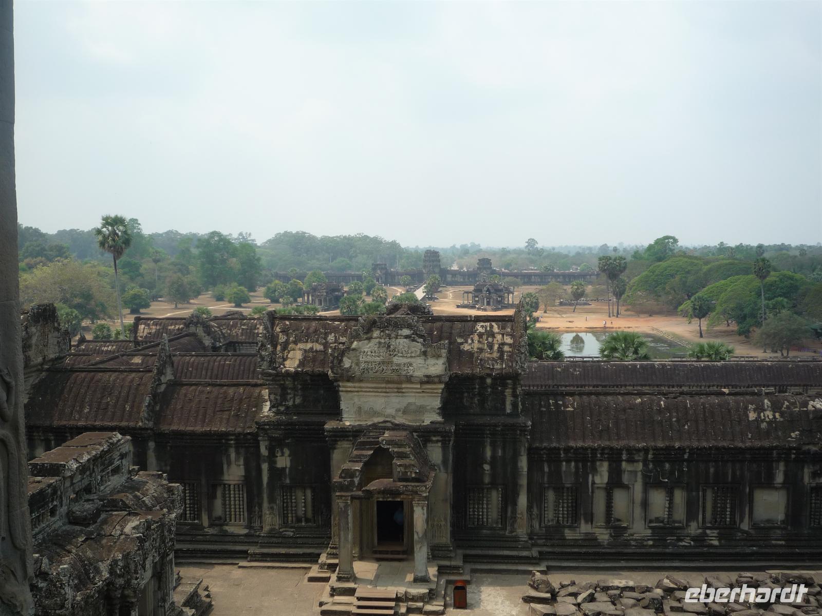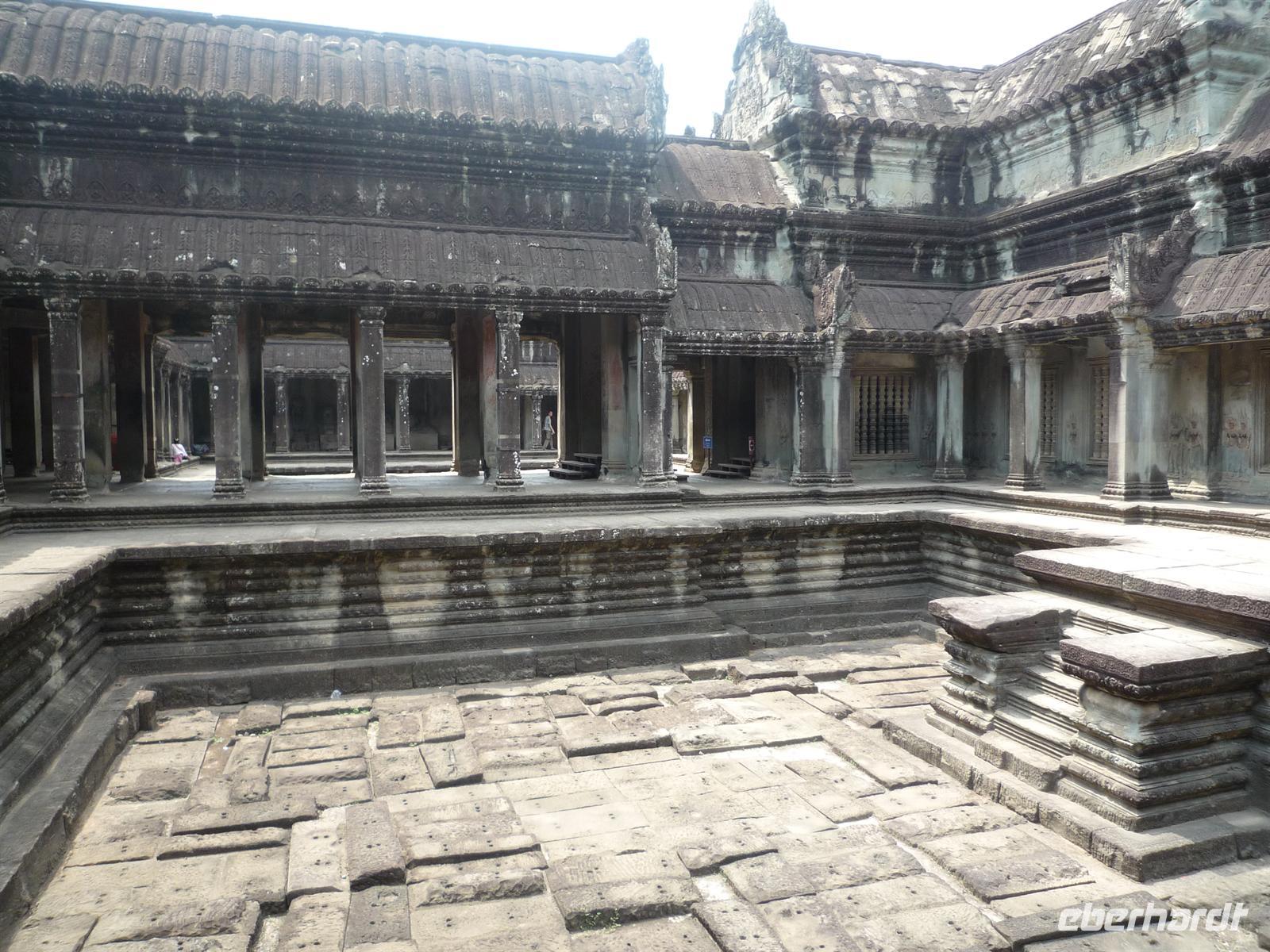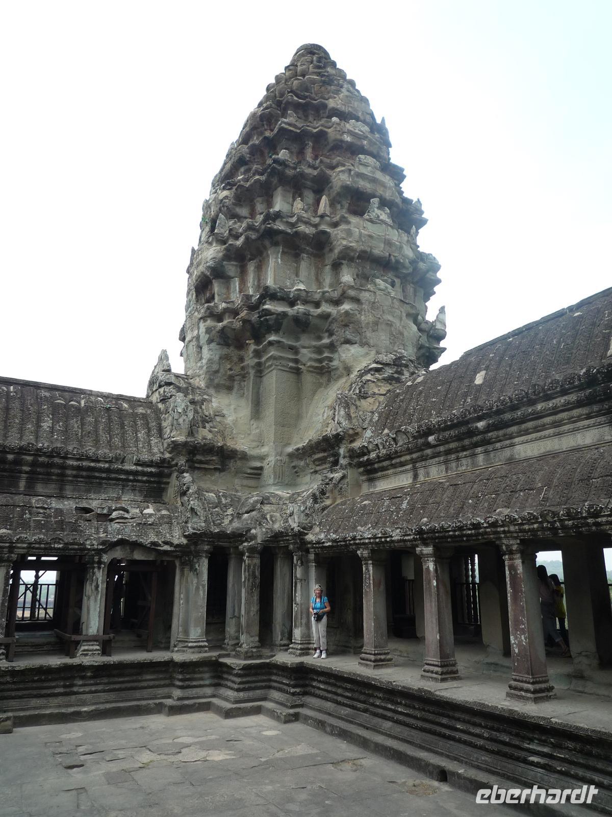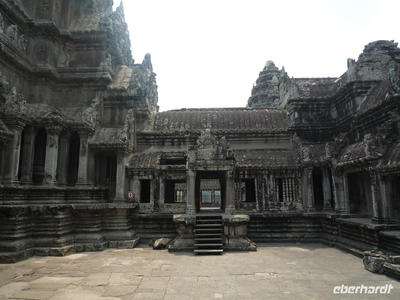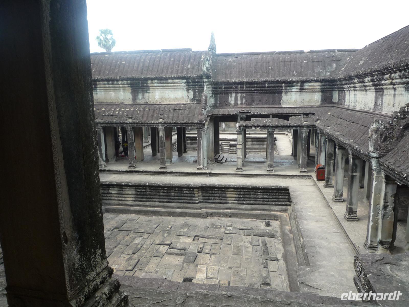 Ab heute steht mit Sicherheit einer der Höhepunkte auf dem Programm, die Besichtigung der Tempelanlagen von Angkor. Angkor bedeutet soviel wie Königsstadt oder Hauptstadt. Die meisten Besucher denken dabei vor allem an die beiden berühmten Tempel von Angkor Wat und Angkor Thom. Aber es gibt noch viele Tempel mehr, die in einem Zeitraum von mehr als 600 Jahren entstanden sind. Höhepunkt der Bauepoche waren dabei sicher die beiden schon genannten Anlagen. Wir besichtigen zuerst das unter König Suryavarmann II. erbaute Angkor Wat. Es ist ein beeindruckender Anblick schon zu Beginn des Rundgangs. Unser Reiseleiter Thol macht uns auf verschiedenen Details aufmerksam, erklärt die verschiedenen Reliefarten. Mit Hilfe einer Lotusblume erklärt er zum besseren verstehen, das architektonische Prinzip der Turmbauten und auch die immer wiederkehrenden Motive in den Wandverzierungen. Es gibt fast keinen Stein der nicht mit Verzierungen versehen ist. Immer wiederkehrendes Motiv sind auch Apsara-Tänzerinnen. Vorbei an den Bibliotheken gehen wir zur Nordost-Seite des Tempels. Von hier hat man einen Blick auf alle fünf Türme. Der mittlere und zugleich höchste Turm im Zentralheiligtum stellt den Berg Meru, den Berg der Götter, dar. Wir befinden uns jetzt in der ersten Galerie und das kann man ganz wörtlich nehmen. Hier befinden sich verschiedene, bis zu 100 m lange Reliefs mit Darstellungen aus dem Hinduismus. Der Erbauer war Anhänger dieser Religion, später wandte er sich dann zum Buddhismus. Daher hat Angkor - Königsstadt - noch einen Beinahmen bekommen. Mit Wat bezeichnen die Khmer einen buddhistischen Tempel. Die Reliefs zeigen Geschichten wie den Zweikampf zwischen Vishnu und den Dämonen Kalanemi oder Himmel und Hölle mit dem Totenrichter Yama und zahlreiche andere. Es ist faszinierend mit welchem Detailreichtum alle Reliefs ausgestattet sind. Man sieht zahlreiche Krieger, Elefanten, Götter und Dämonen und alles ist so gestaltet, das sich eine Geschichte erzählen lässt. Diese für uns fremde Götterwelt lässt sich dadurch etwas besser erfassen. Anschließend gehen wir auf die nächste Galerie und stehen in einem Hofraum. Vor uns ist jetzt das Zentralheiligtum mit seinen markanten Türmen, die 3. Ebende. Da heute Buddhatag ist, ist sie aber geschlossen. Wir werden aber morgen wieder kommen. Langsam begeben wir uns wieder nach unten und gehen dann langsam wieder zurück zum Haupteingang. Immer mal wieder einen Blick zurück nehmend verlassen wir dieses gewaltige Zeugnis aus dem 12. Jh.Inzwischen sind über drei Stunden vergangen und wir machen zuerst eine Mittagspause.