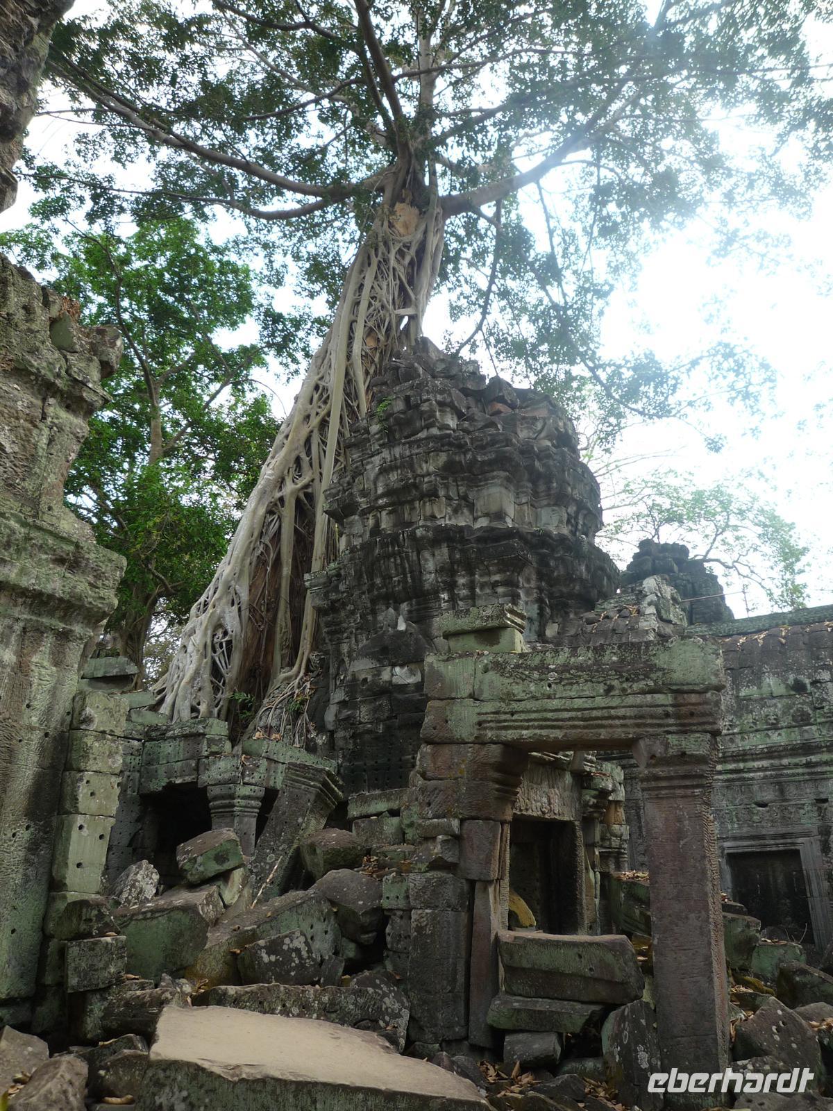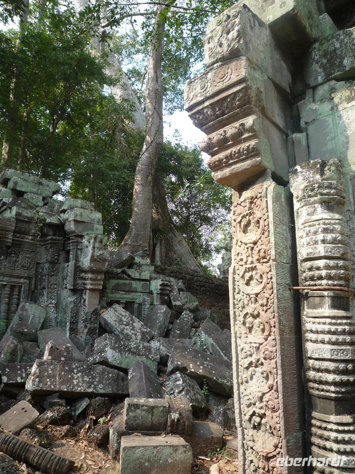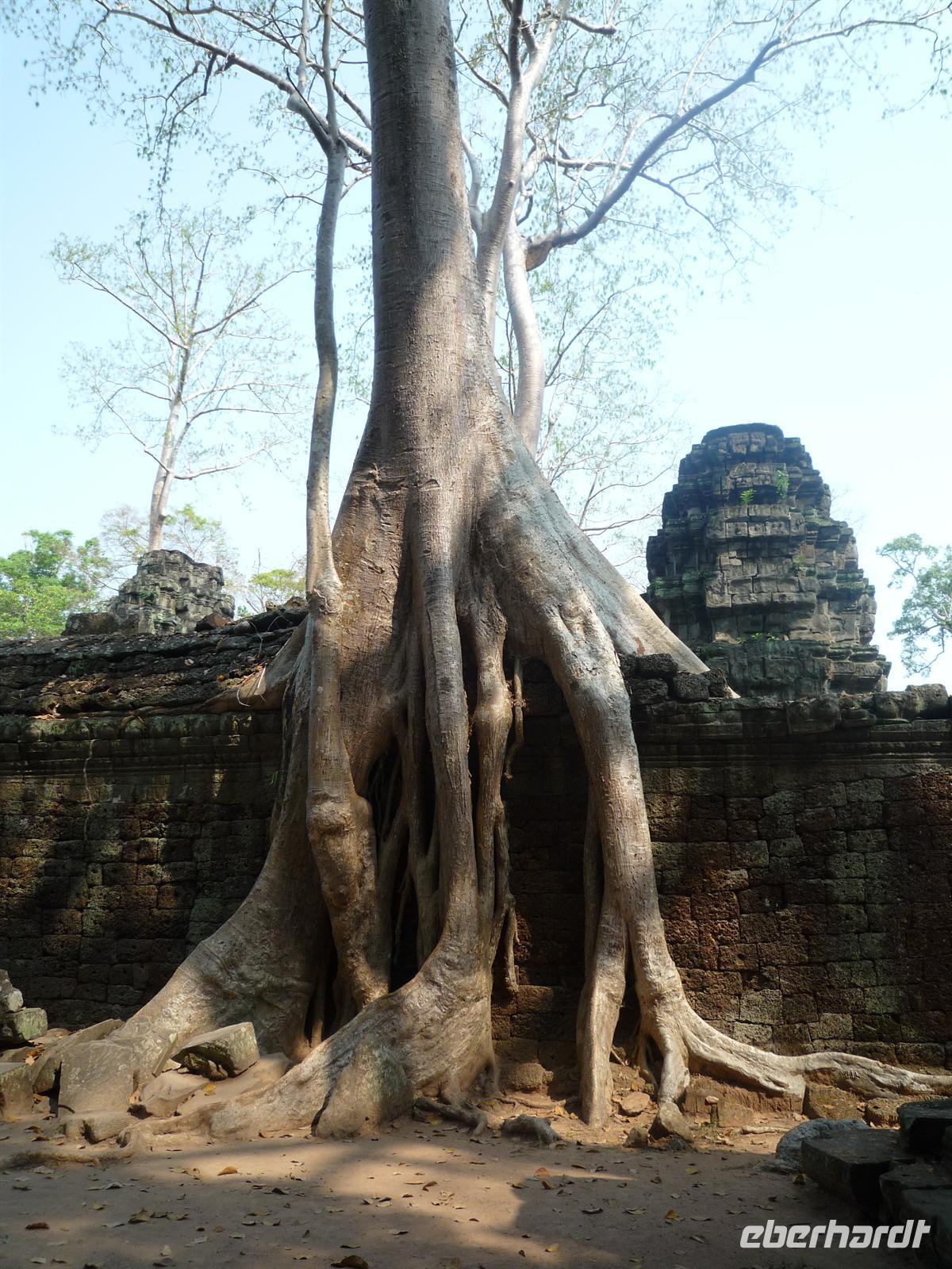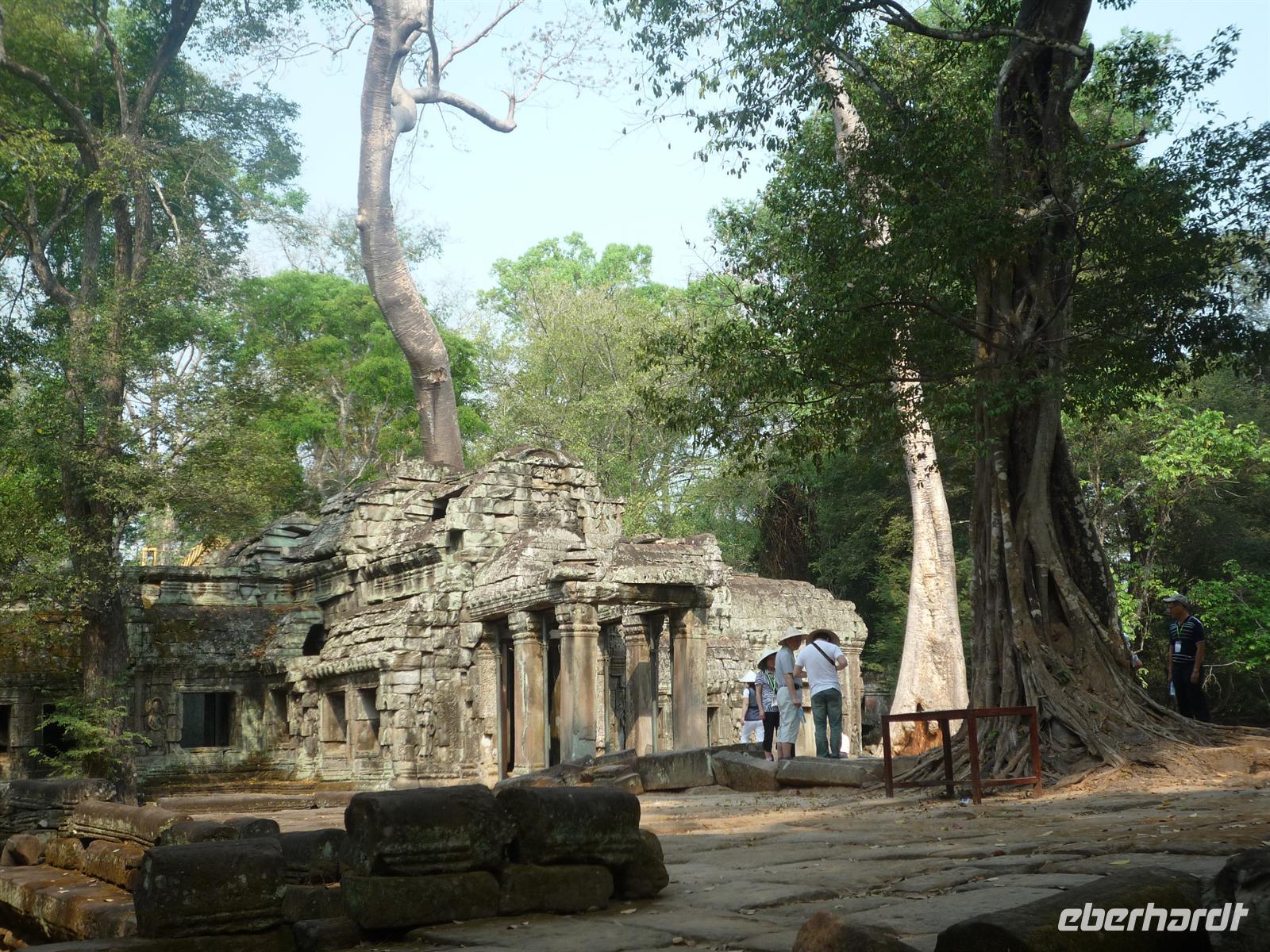 Vier weitere, in ihrer Art unterschiedliche, Tempelanlagen besuchen wir heute. Zuerst besuchen wir heute den meistbesuchten Tempel, Ta Prohm, uns ist er besser bekannt als Dschungeltempel. Wie auch bei allen anderen Besichtigungen nutzt unser Reiseleiter Thol nicht die Wege und Besichtigungszeiten wie alle anderen Gruppen. So betreten wir Ta Prohm durch einen Nebeneingang und können eine ganze Weile die Anlage fast allein genießen. Majestätisch stehen die Bäume über den Ruinen, haben sie sich einverleibt. Mächtige Wurzeln haben sich wie Schlangen entlang der Mauern geschoben und man hat den Eindruck, sie halten die Mauern zusammen. Dabei ist es eher umgekehrt. Gewaltig und Beeindruckend.
