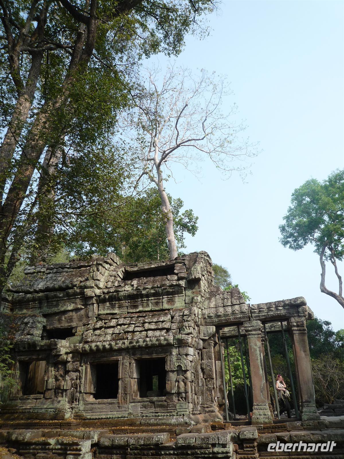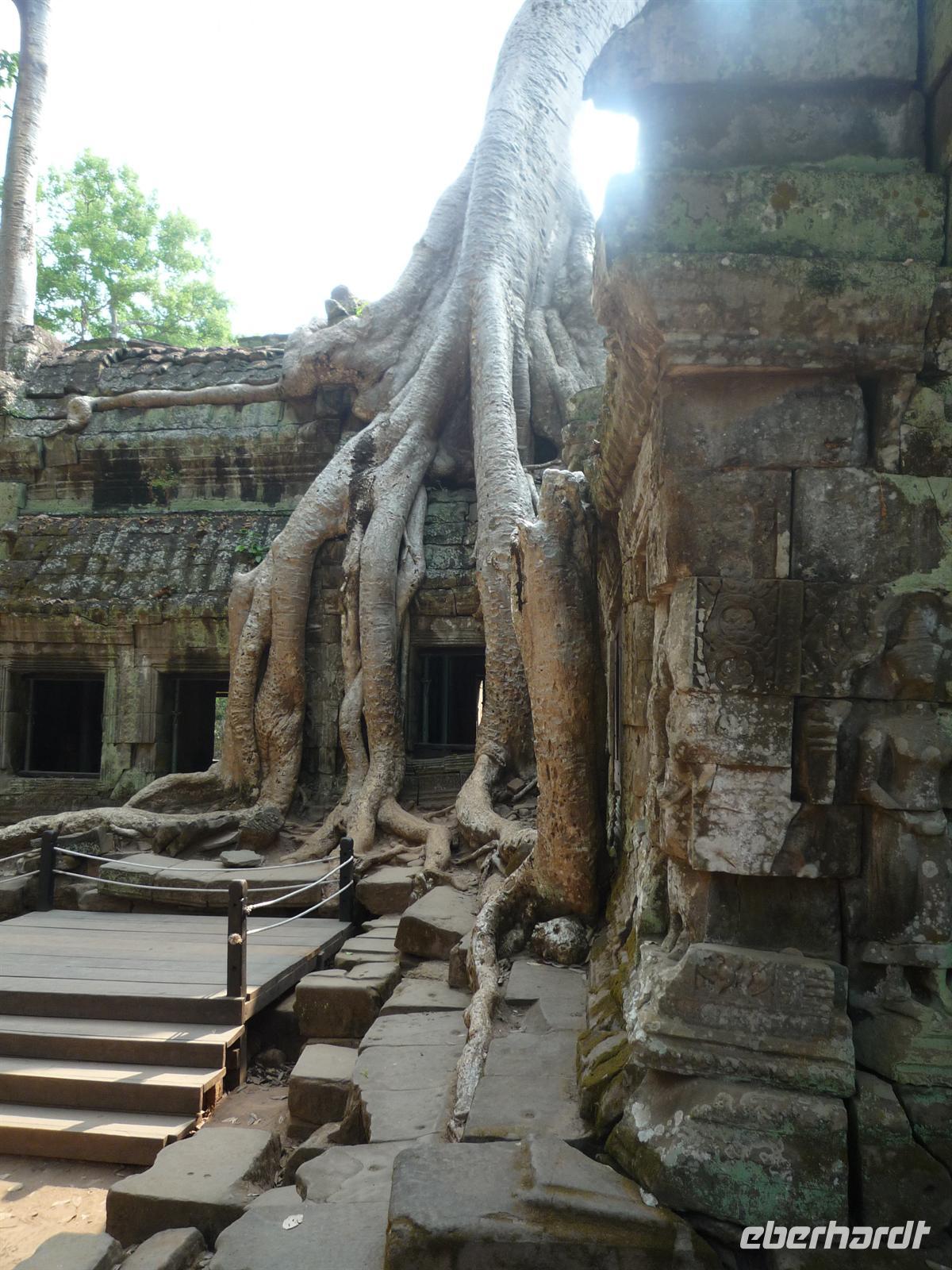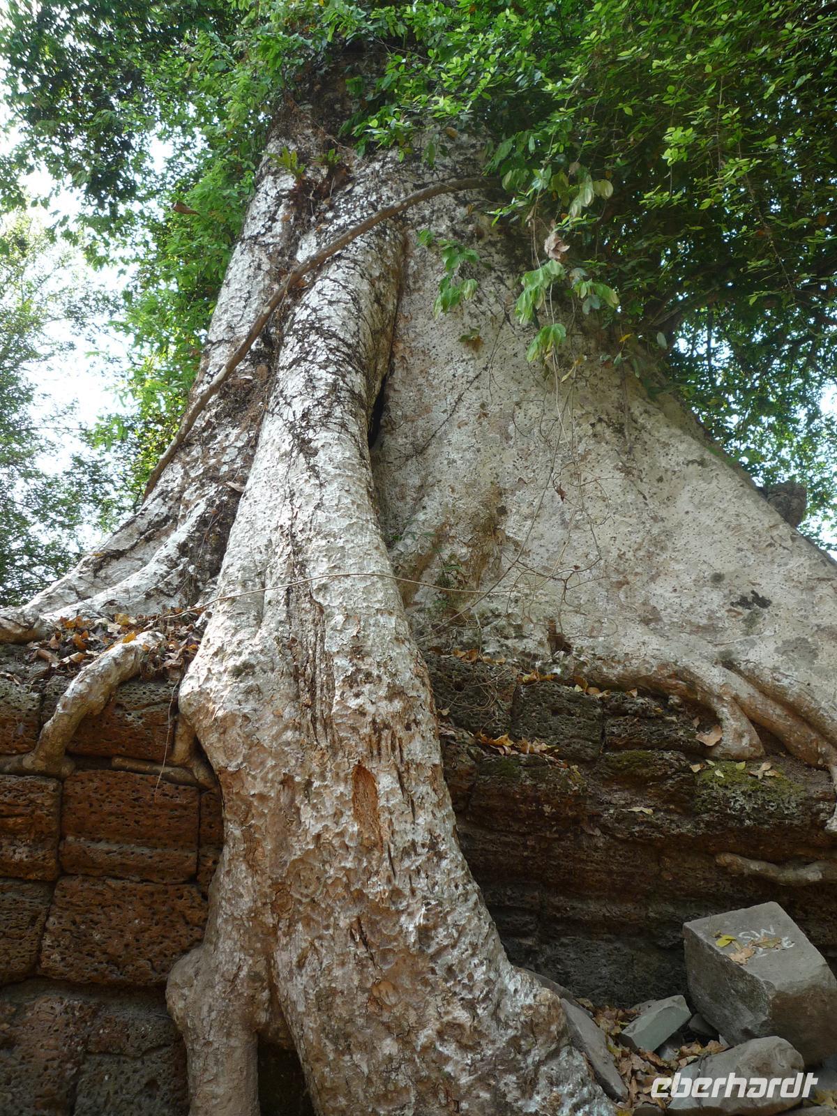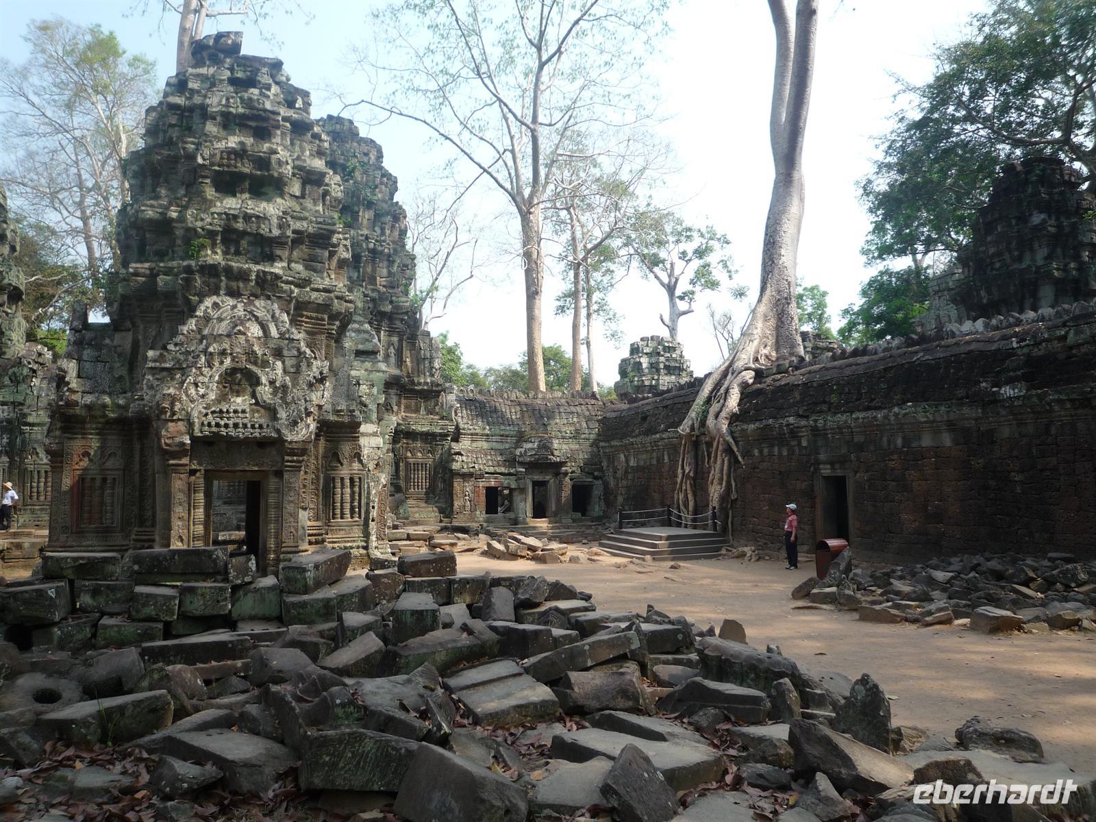 Vier weitere, in ihrer Art unterschiedliche, Tempelanlagen besuchen wir heute. Zuerst besuchen wir heute den meistbesuchten Tempel, Ta Prohm, uns ist er besser bekannt als Dschungeltempel. Wie auch bei allen anderen Besichtigungen nutzt unser Reiseleiter Thol nicht die Wege und Besichtigungszeiten wie alle anderen Gruppen. So betreten wir Ta Prohm durch einen Nebeneingang und können eine ganze Weile die Anlage fast allein genießen. Majestätisch stehen die Bäume über den Ruinen, haben sie sich einverleibt. Mächtige Wurzeln haben sich wie Schlangen entlang der Mauern geschoben und man hat den Eindruck, sie halten die Mauern zusammen. Dabei ist es eher umgekehrt. Gewaltig und Beeindruckend.
