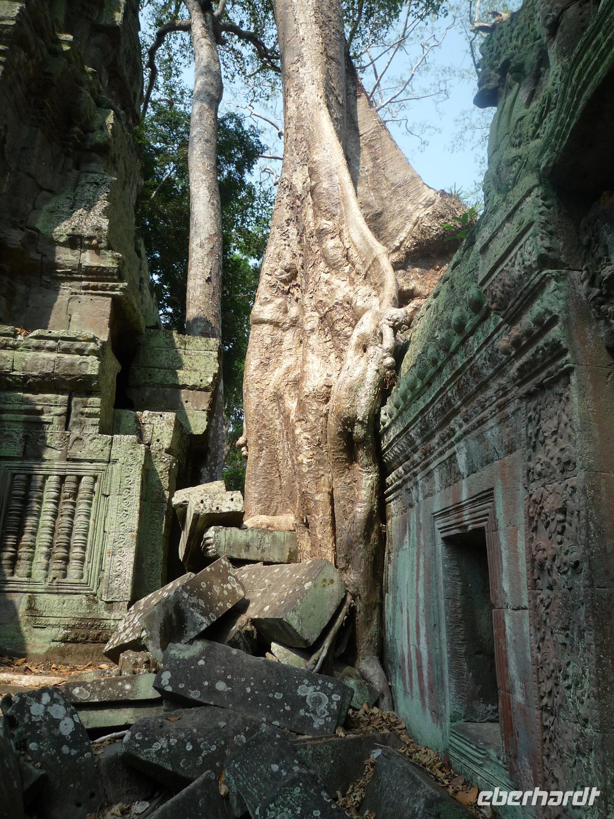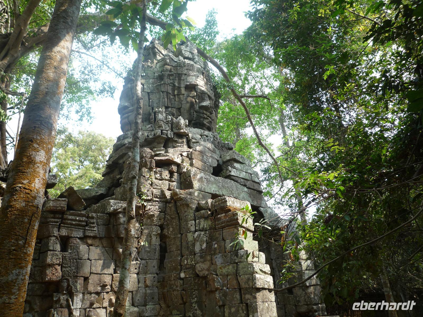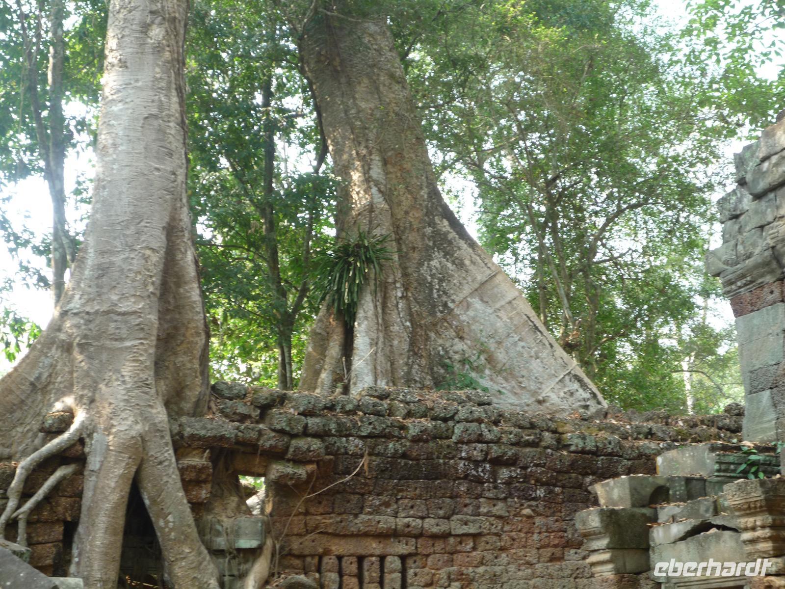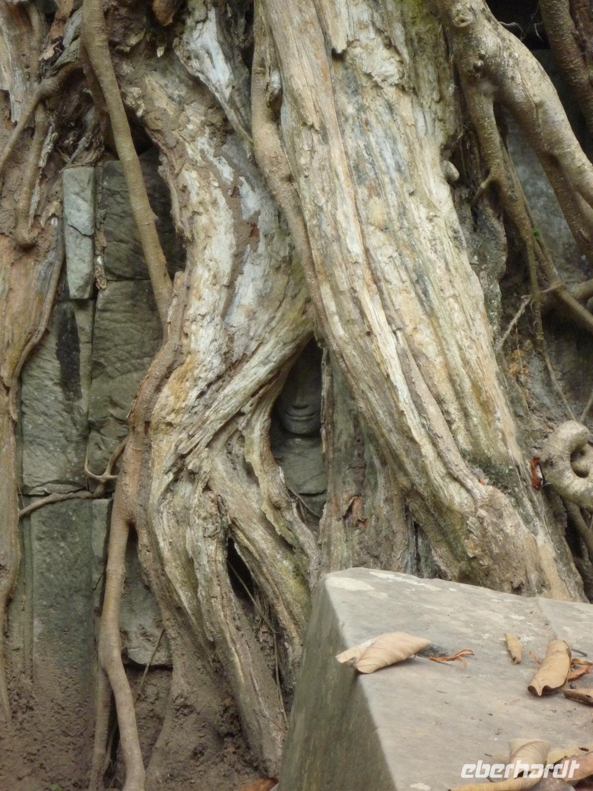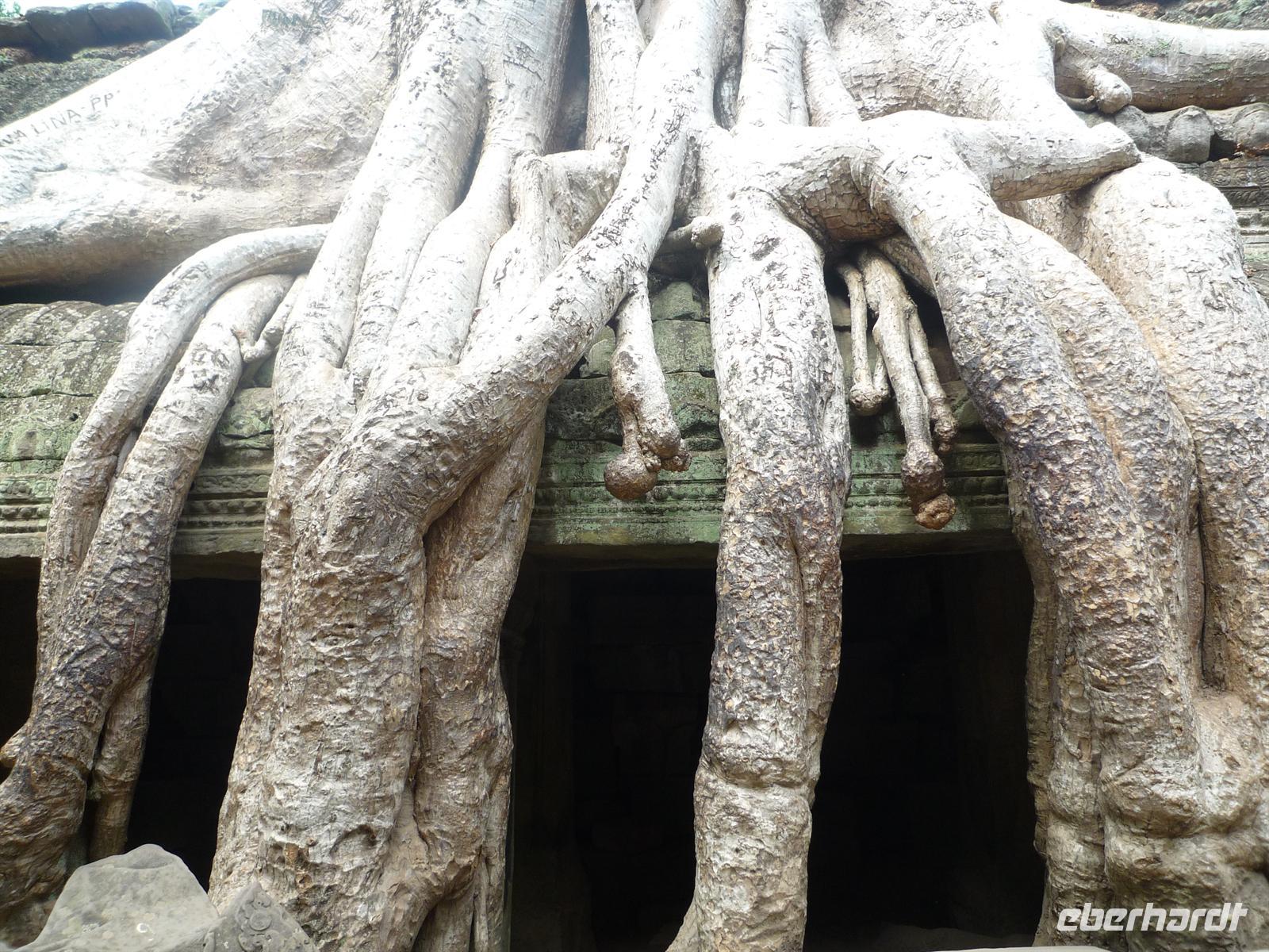 Vier weitere, in ihrer Art unterschiedliche, Tempelanlagen besuchen wir heute. Zuerst besuchen wir heute den meistbesuchten Tempel, Ta Prohm, uns ist er besser bekannt als Dschungeltempel. Wie auch bei allen anderen Besichtigungen nutzt unser Reiseleiter Thol nicht die Wege und Besichtigungszeiten wie alle anderen Gruppen. So betreten wir Ta Prohm durch einen Nebeneingang und können eine ganze Weile die Anlage fast allein genießen. Majestätisch stehen die Bäume über den Ruinen, haben sie sich einverleibt. Mächtige Wurzeln haben sich wie Schlangen entlang der Mauern geschoben und man hat den Eindruck, sie halten die Mauern zusammen. Dabei ist es eher umgekehrt. Gewaltig und Beeindruckend.