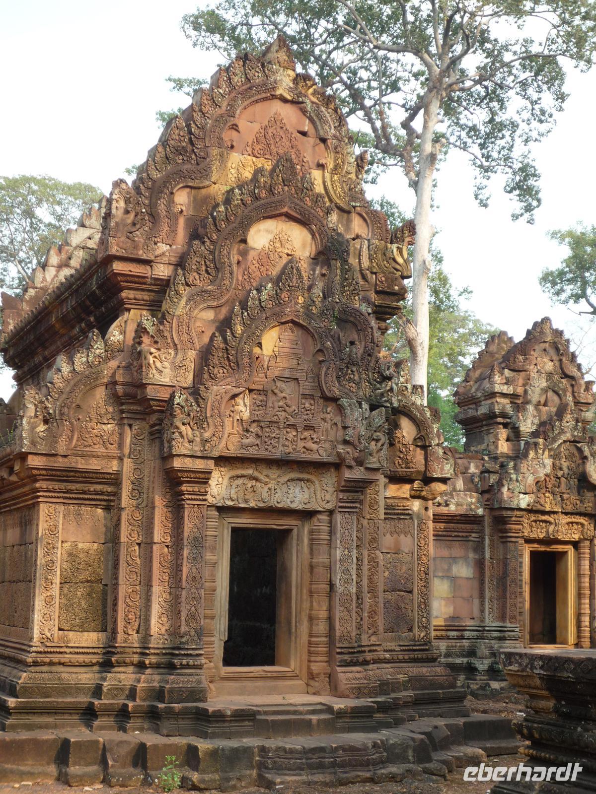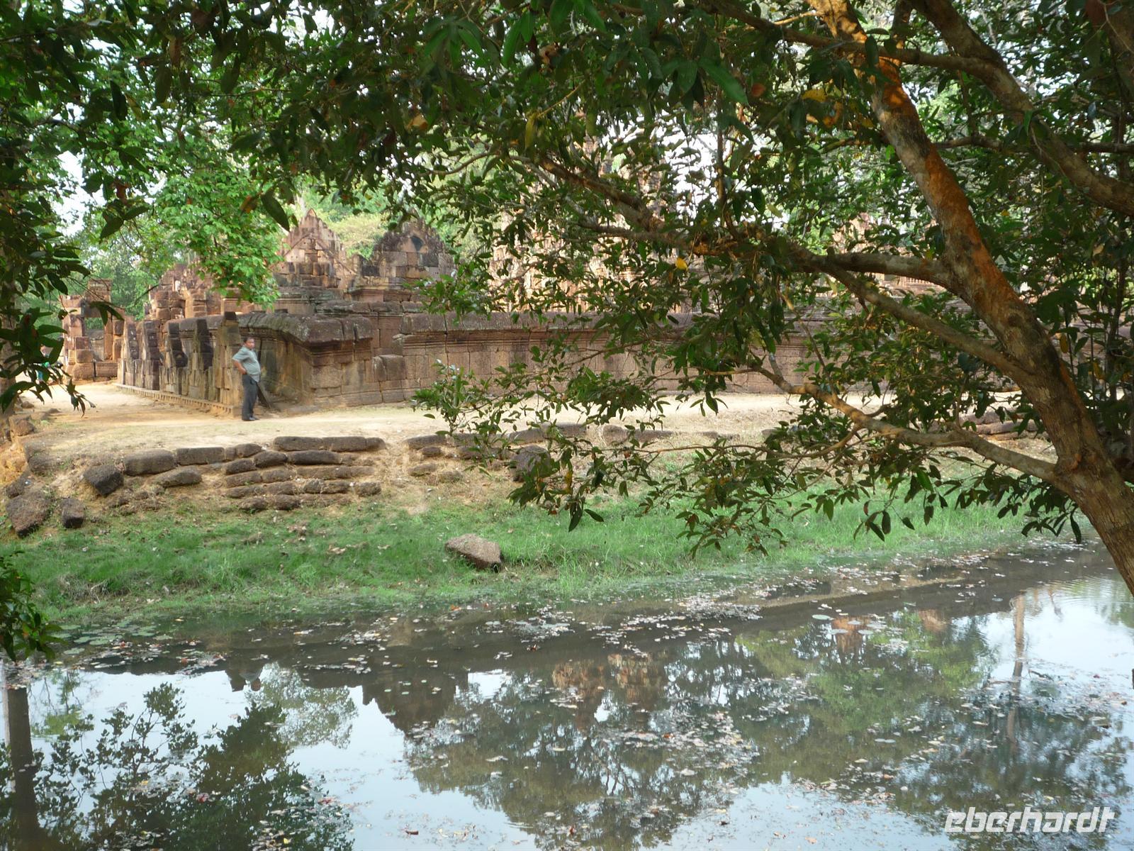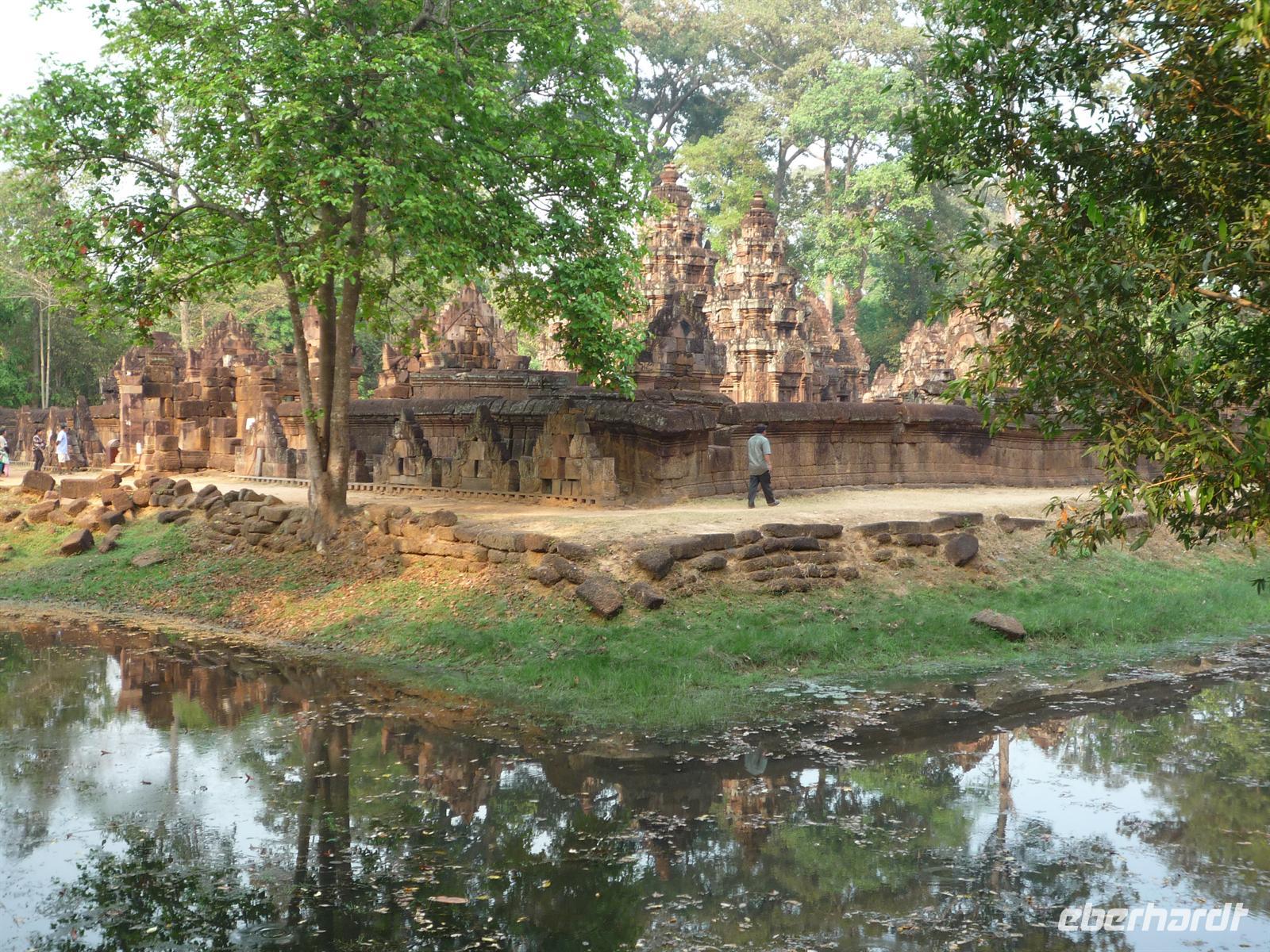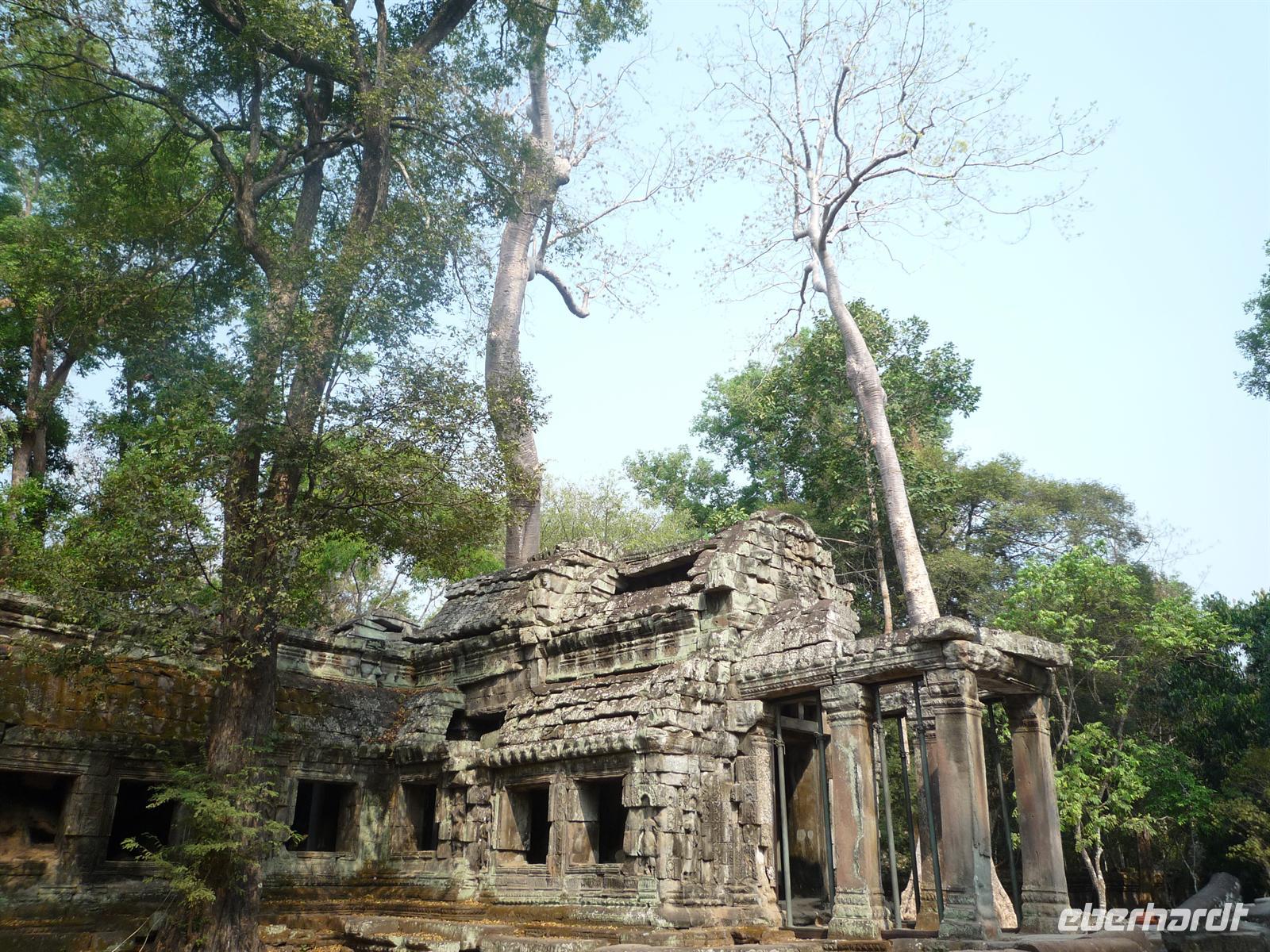 Vier weitere, in ihrer Art unterschiedliche, Tempelanlagen besuchen wir heute. Zuerst besuchen wir heute den meistbesuchten Tempel, Ta Prohm, uns ist er besser bekannt als Dschungeltempel. Wie auch bei allen anderen Besichtigungen nutzt unser Reiseleiter Thol nicht die Wege und Besichtigungszeiten wie alle anderen Gruppen. So betreten wir Ta Prohm durch einen Nebeneingang und können eine ganze Weile die Anlage fast allein genießen. Majestätisch stehen die Bäume über den Ruinen, haben sie sich einverleibt. Mächtige Wurzeln haben sich wie Schlangen entlang der Mauern geschoben und man hat den Eindruck, sie halten die Mauern zusammen. Dabei ist es eher umgekehrt. Gewaltig und Beeindruckend.