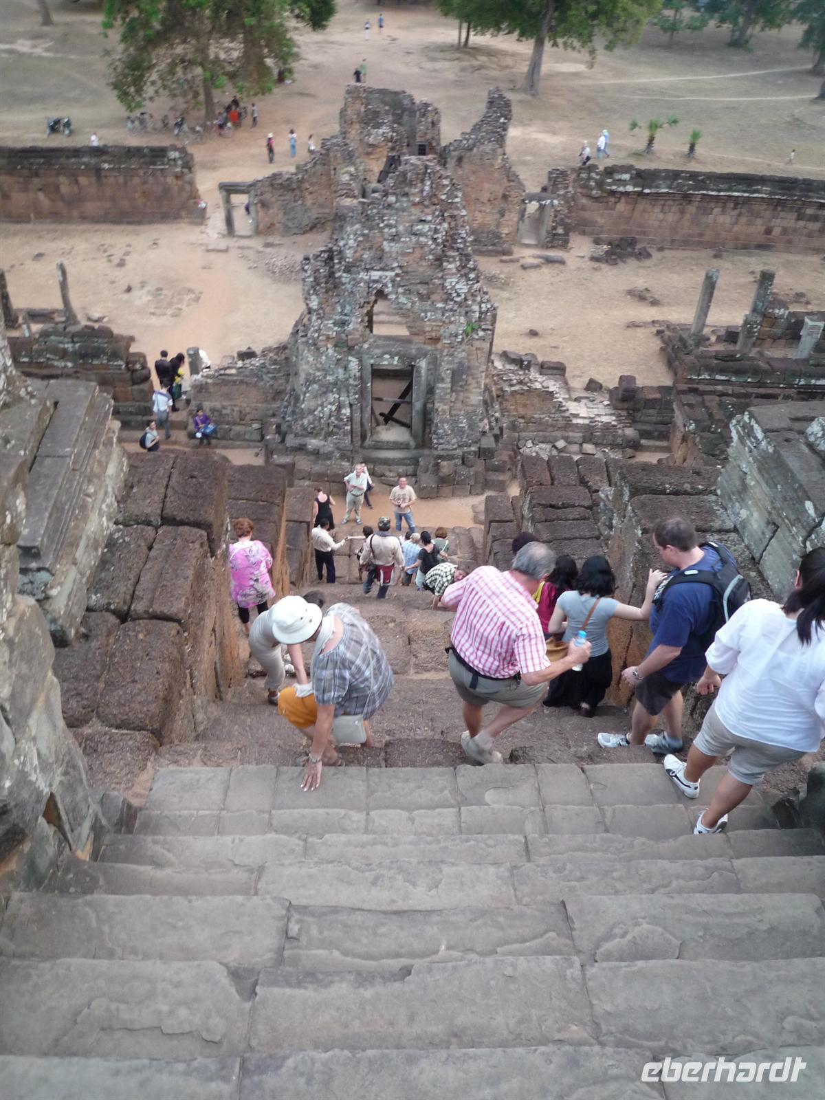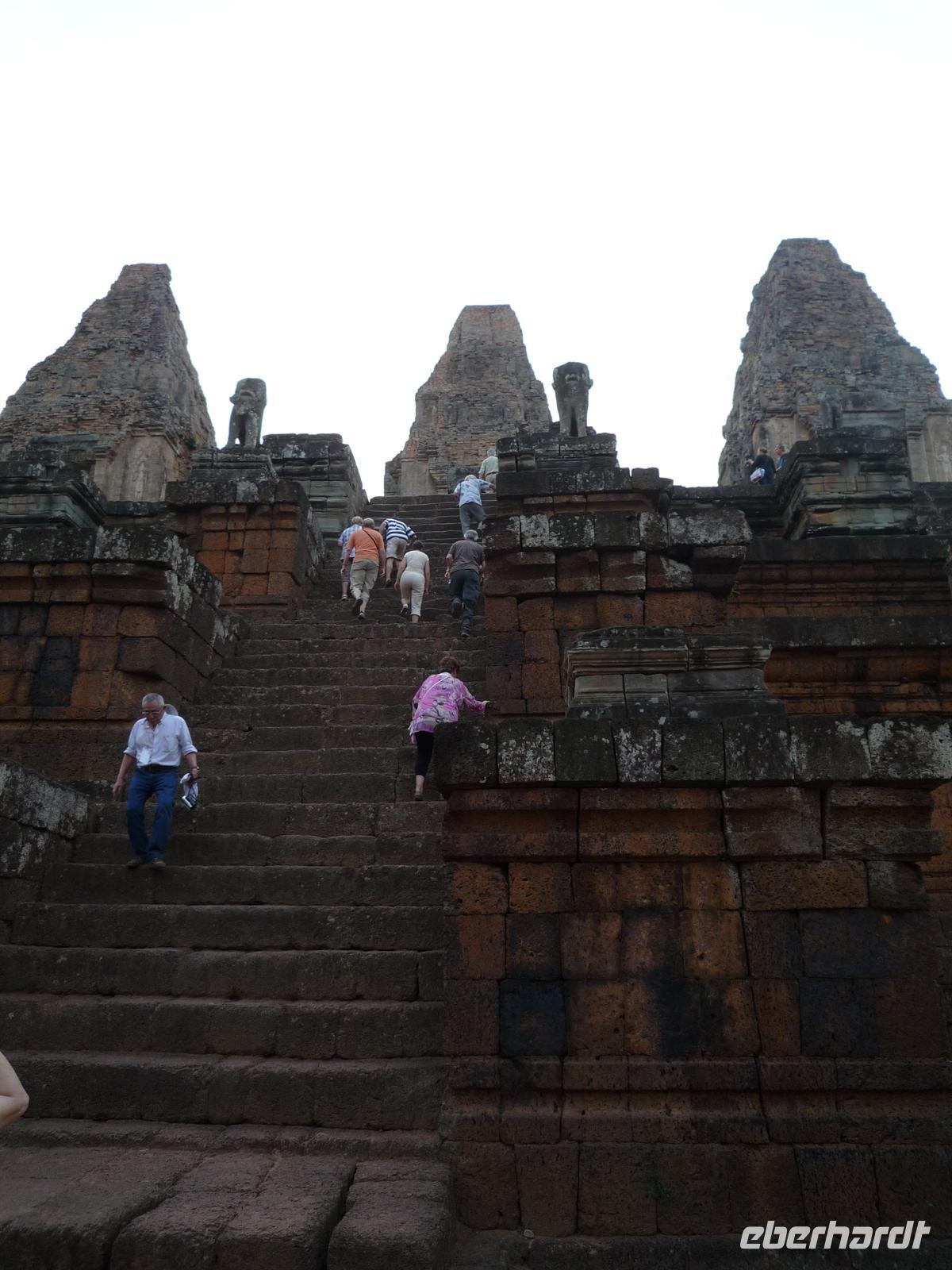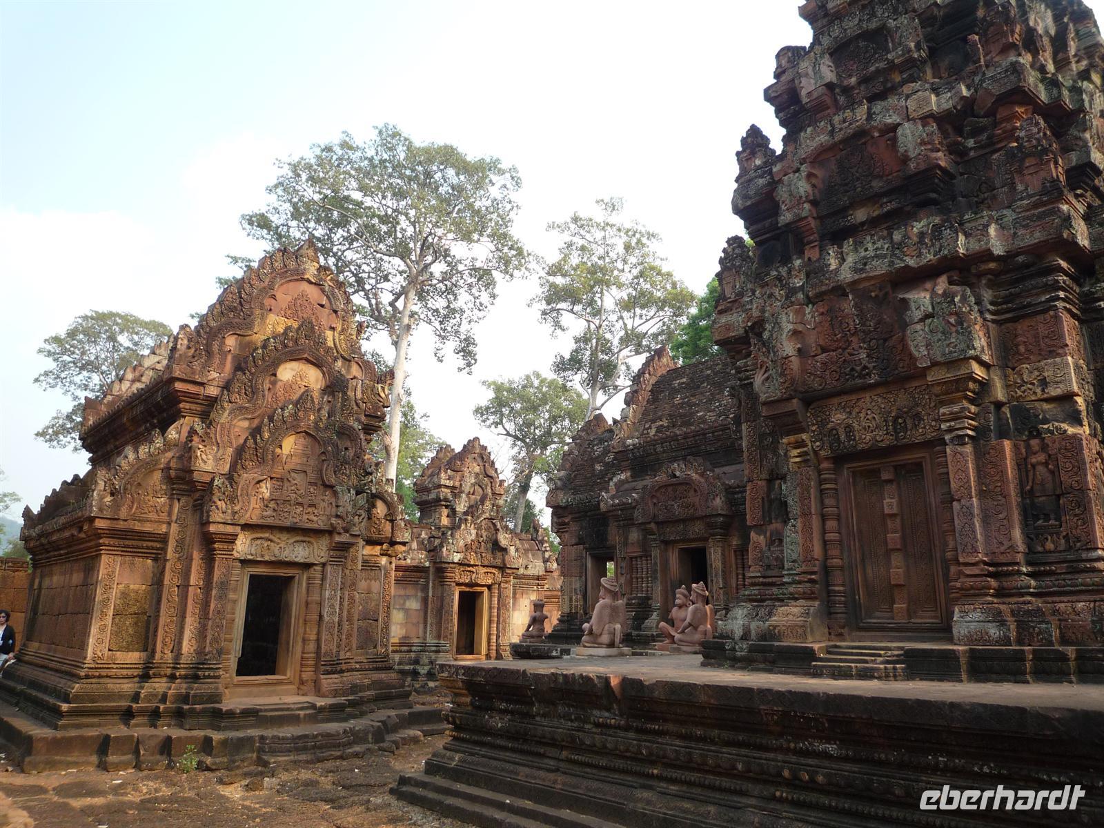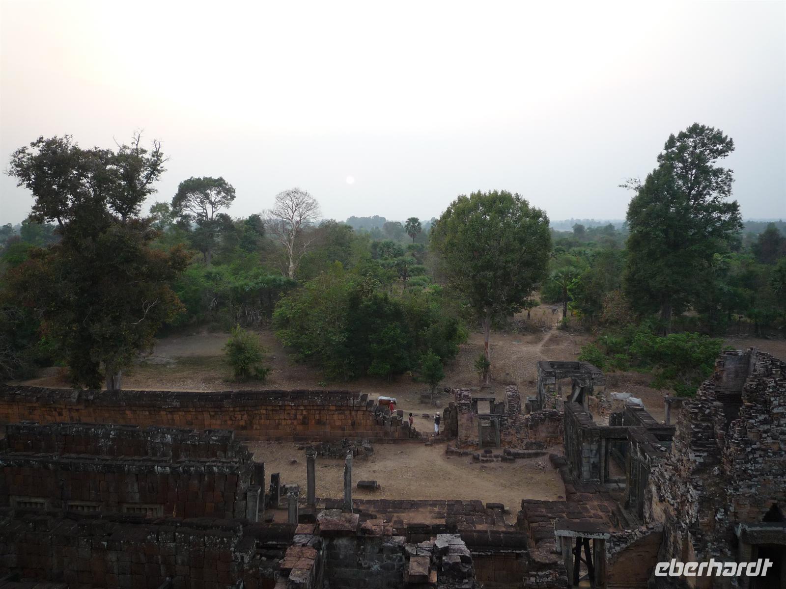Nächster Stopp ist am Tempel „Prasat Kravan“. Die noch vorhandenen Türme sind nicht, wie sonst aus Sandstein, sondern aus Ziegelsteinen errichtet. Auf den ersten Blick erscheinen sie eher unspektakulär. Von Bedeutung sind die gut erhaltenen Backsteinreliefs mit Darstellungen von hinduistischen Göttern. Nicht weit entfernt findet sich der Tempel Banteay Kdei. Hierbei handelt es sich um ein Kloster, umgeben von einer Mauer aus Vulkangestein. Ursprünglich vom Dschungel völlig überwuchert wurde die Anlage bereits 1946 freigelegt, dabei allerdings nur wenig restauriert. Auch heute noch muss aller drei Monate das „Unkraut“ entfernt werden. Der Dschungel holt sich schnell zurück, was ihm gehört. An den Eingängen finden sich wieder Gesichtertürme und im inneren gibt es fast keinen Stein der nicht verziert ist. Danach klettern wir nun bei Sonnenschein auf die 3. Ebene von Angkor Wat, um den Ausblick zu genießen, der uns gestern verwehrt war. Anschließend haben wir uns eine Mittagspause verdient, bevor wir zum letzten Tempel für heute aufbrechen. Gute 20 Kilometer müssen wir bis zum Tempel Banteay Srei oder auch Frauentempel fahren. Die Anlage stammt aus der Mitte des 10 Jh. und ist ein Juwel unter den Tempeln. Die Faszination stammt zweifellos vom Variantenreichtum seines Dekors. Die filigran gearbeiteten Ornamentverzierungen - meist Blumen und Rankenwerk - überziehen die wichtigsten Gebäudeteile. Unwahrscheinlich viele Details gibt es zu entdecken. Uns ist inzwischen ganz schön heiß, die Sonne scheint heute unbarmherzig auf uns herab. Da heißt es viel trinken und jeder von uns greift immer wieder gern zu neuen Wasserflasche bei einsteigen in den Bus. Unser Fahrer hat sich immer darum gekümmert, dass ausreichend kostbares Nass vorhanden ist. Auf der Fahrt zurück Richtung Siem Reap halten wir noch in einem Dorf und sehen uns an, wie man aus dem Saft der Zuckerpalme Palmenzucker herstellt. Eine durchaus mühsame Arbeit. Den Sonnenuntergang erleben wir am bzw. auf dem Tempel Pre Rup, einer ebenfalls aus dem 10. Jh. stammenden pyramidenförmigen Anlage. Die untergehende Sonne bringt die Ziegelsteine zum „glühen“ aber genauso gut kann man von oben den Untergang der Sonne genießen. Zurück zum Hotel heißt es duschen und anschließend fahren wir zum Essen.