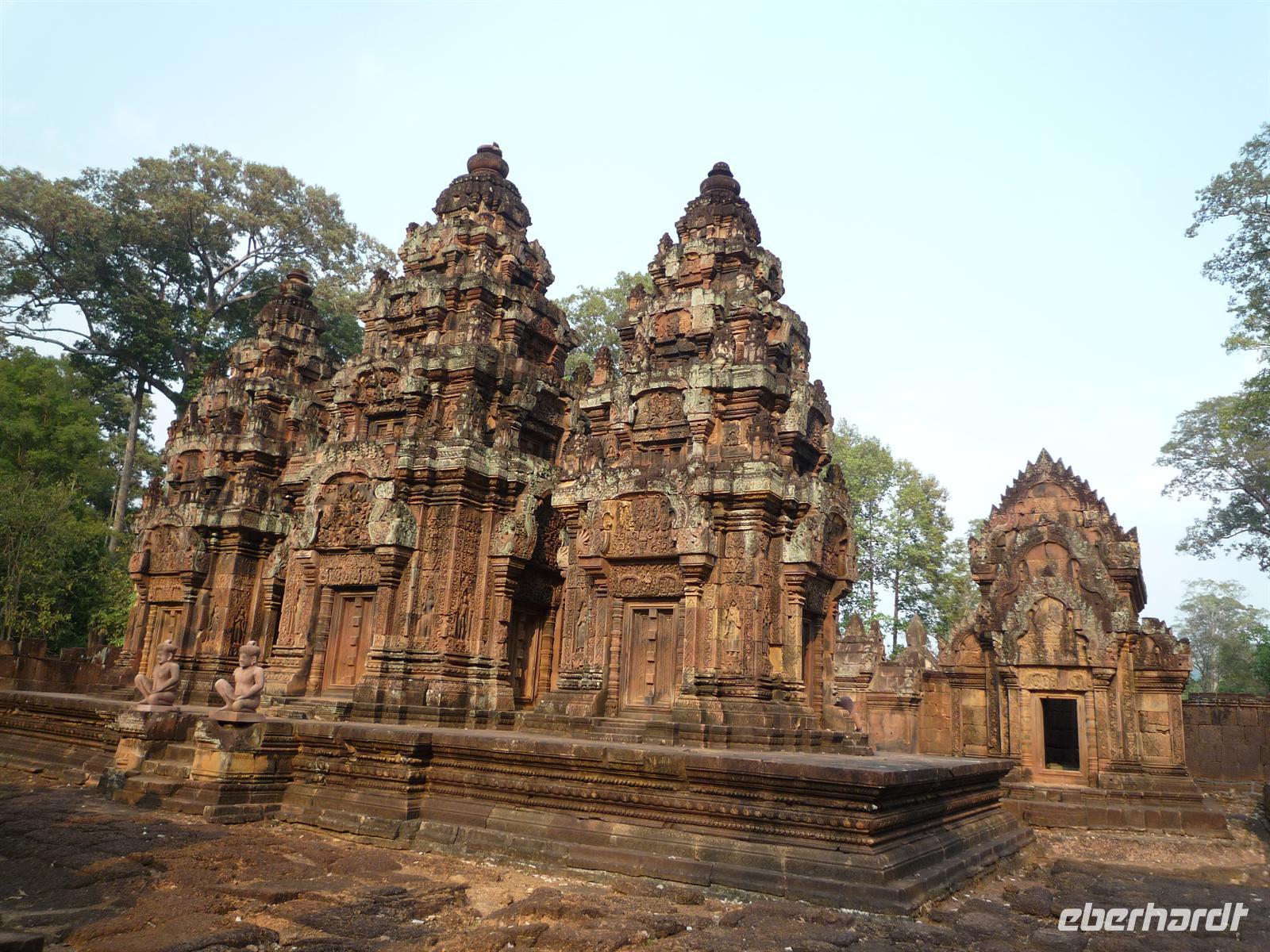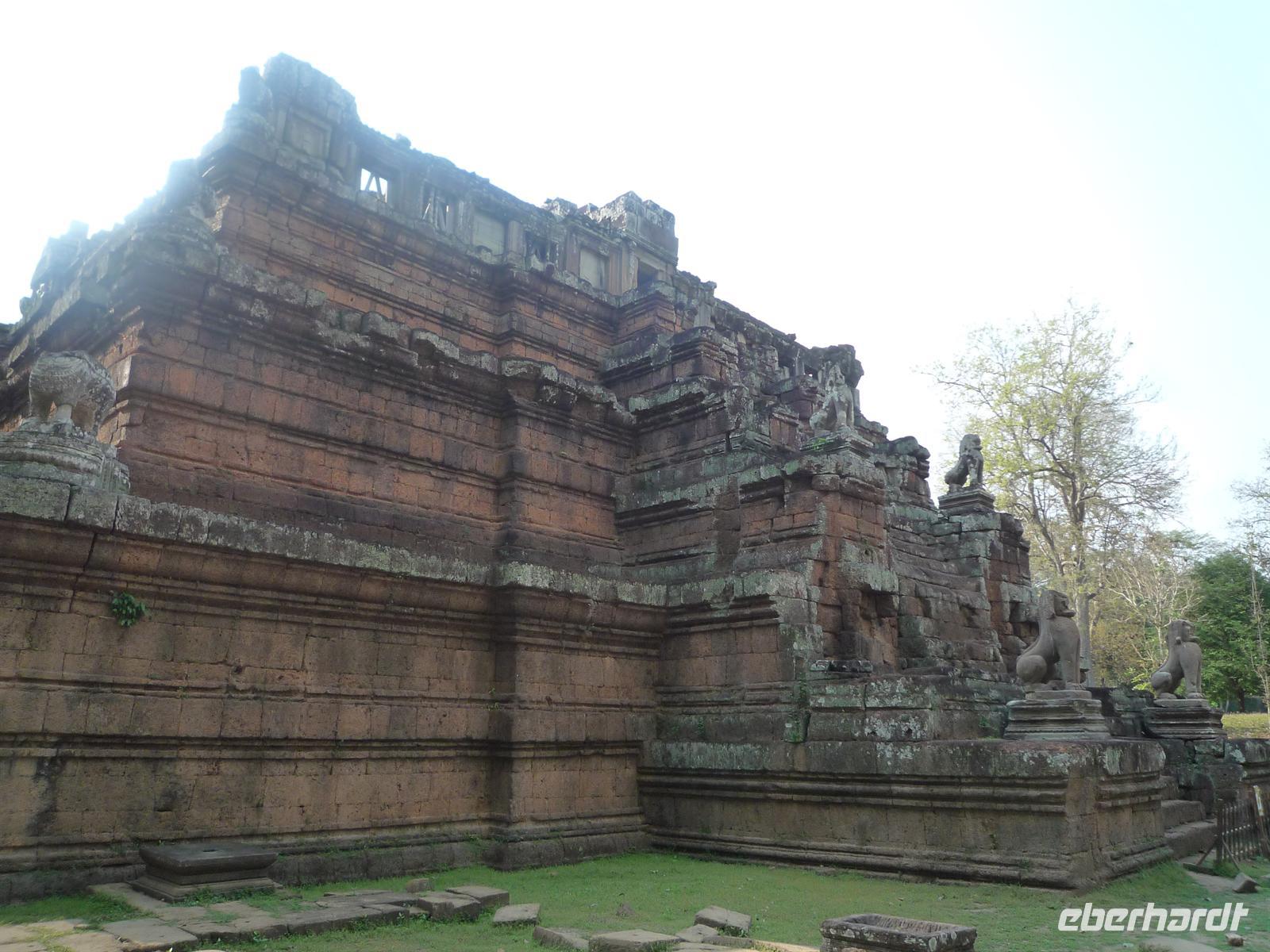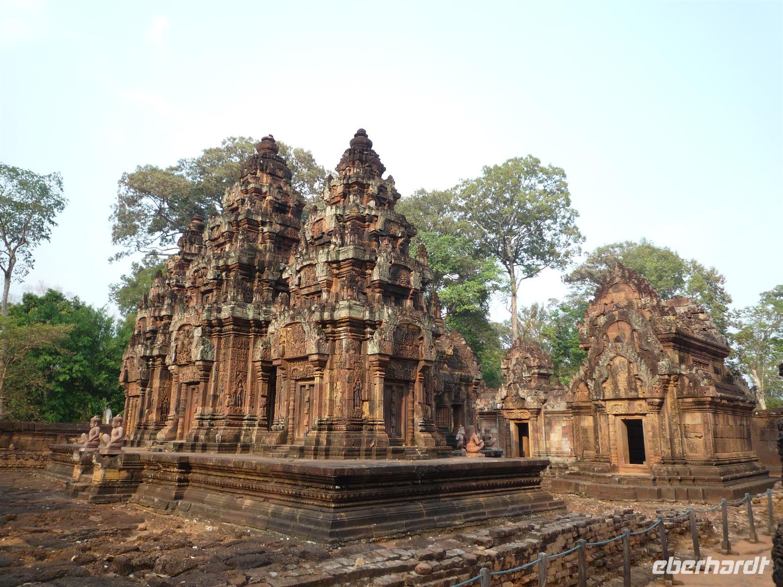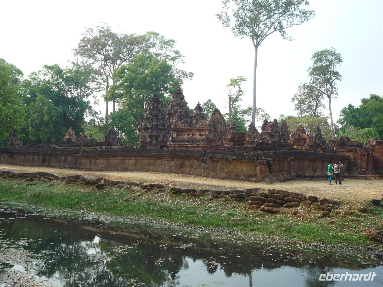 Nächster Stopp ist am Tempel „Prasat Kravan“. Die noch vorhandenen Türme sind nicht, wie sonst aus Sandstein, sondern aus Ziegelsteinen errichtet. Auf den ersten Blick erscheinen sie eher unspektakulär. Von Bedeutung sind die gut erhaltenen Backsteinreliefs mit Darstellungen von hinduistischen Göttern. Nicht weit entfernt findet sich der Tempel Banteay Kdei. Hierbei handelt es sich um ein Kloster, umgeben von einer Mauer aus Vulkangestein. Ursprünglich vom Dschungel völlig überwuchert wurde die Anlage bereits 1946 freigelegt, dabei allerdings nur wenig restauriert. Auch heute noch muss aller drei Monate das „Unkraut“ entfernt werden. Der Dschungel holt sich schnell zurück, was ihm gehört. An den Eingängen finden sich wieder Gesichtertürme und im inneren gibt es fast keinen Stein der nicht verziert ist. Danach klettern wir nun bei Sonnenschein auf die 3. Ebene von Angkor Wat, um den Ausblick zu genießen, der uns gestern verwehrt war. Anschließend haben wir uns eine Mittagspause verdient, bevor wir zum letzten Tempel für heute aufbrechen. Gute 20 Kilometer müssen wir bis zum Tempel Banteay Srei oder auch Frauentempel fahren. Die Anlage stammt aus der Mitte des 10 Jh. und ist ein Juwel unter den Tempeln. Die Faszination stammt zweifellos vom Variantenreichtum seines Dekors. Die filigran gearbeiteten Ornamentverzierungen - meist Blumen und Rankenwerk - überziehen die wichtigsten Gebäudeteile. Unwahrscheinlich viele Details gibt es zu entdecken. Uns ist inzwischen ganz schön heiß, die Sonne scheint heute unbarmherzig auf uns herab. Da heißt es viel trinken und jeder von uns greift immer wieder gern zu neuen Wasserflasche bei einsteigen in den Bus. Unser Fahrer hat sich immer darum gekümmert, dass ausreichend kostbares Nass vorhanden ist. Auf der Fahrt zurück Richtung Siem Reap halten wir noch in einem Dorf und sehen uns an, wie man aus dem Saft der Zuckerpalme Palmenzucker herstellt. Eine durchaus mühsame Arbeit. Den Sonnenuntergang erleben wir am bzw. auf dem Tempel Pre Rup, einer ebenfalls aus dem 10. Jh. stammenden pyramidenförmigen Anlage. Die untergehende Sonne bringt die Ziegelsteine zum „glühen“ aber genauso gut kann man von oben den Untergang der Sonne genießen. Zurück zum Hotel heißt es duschen und anschließend fahren wir zum Essen.