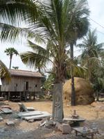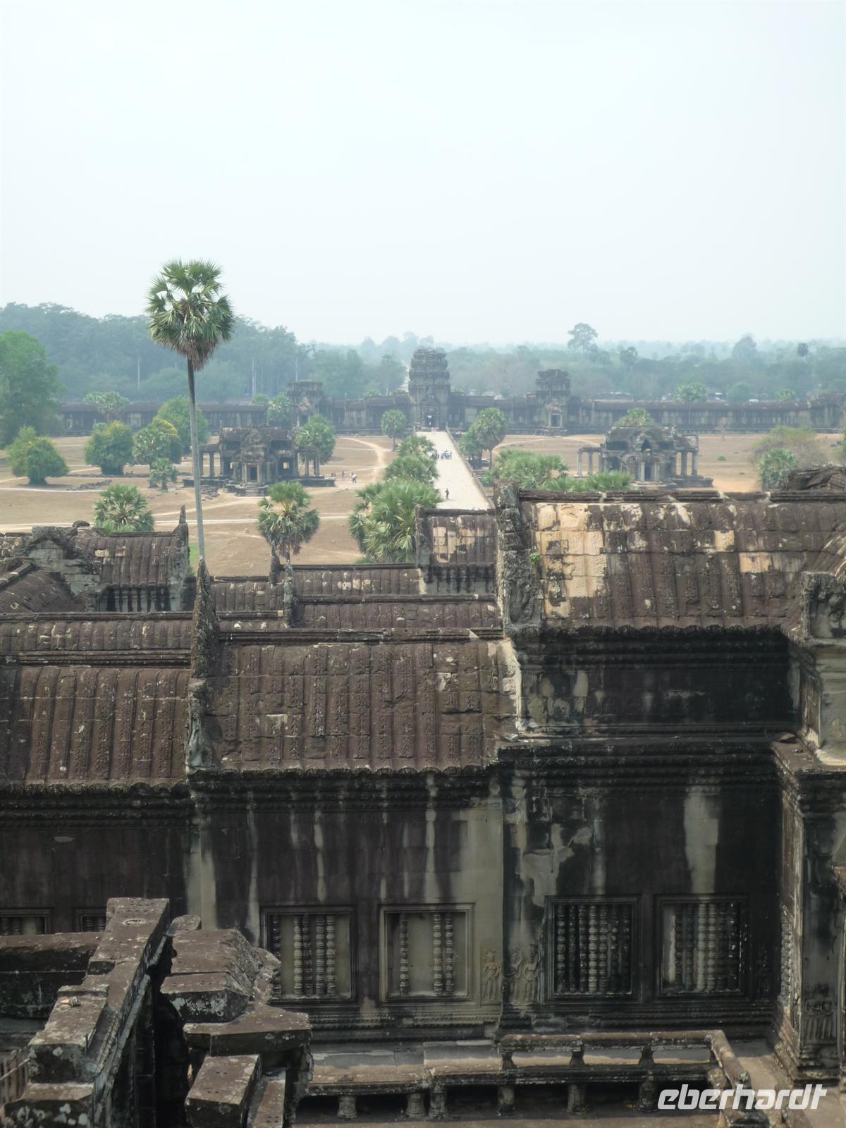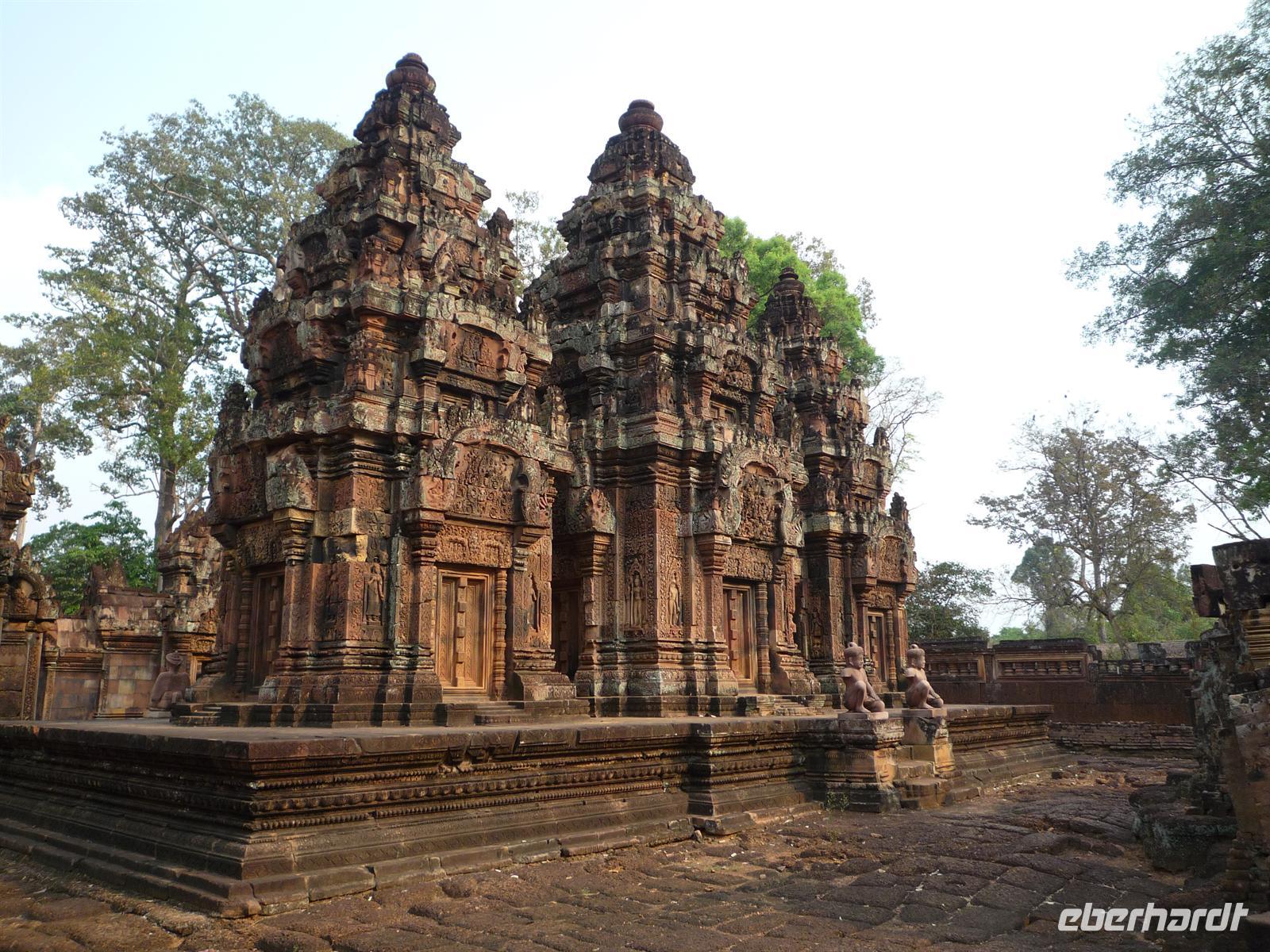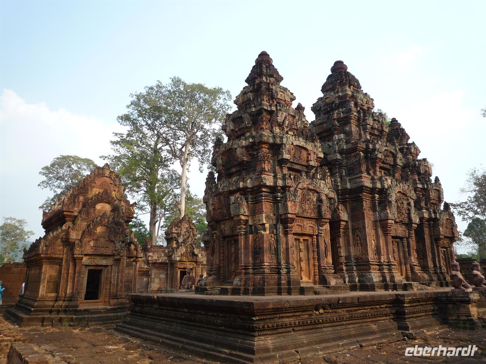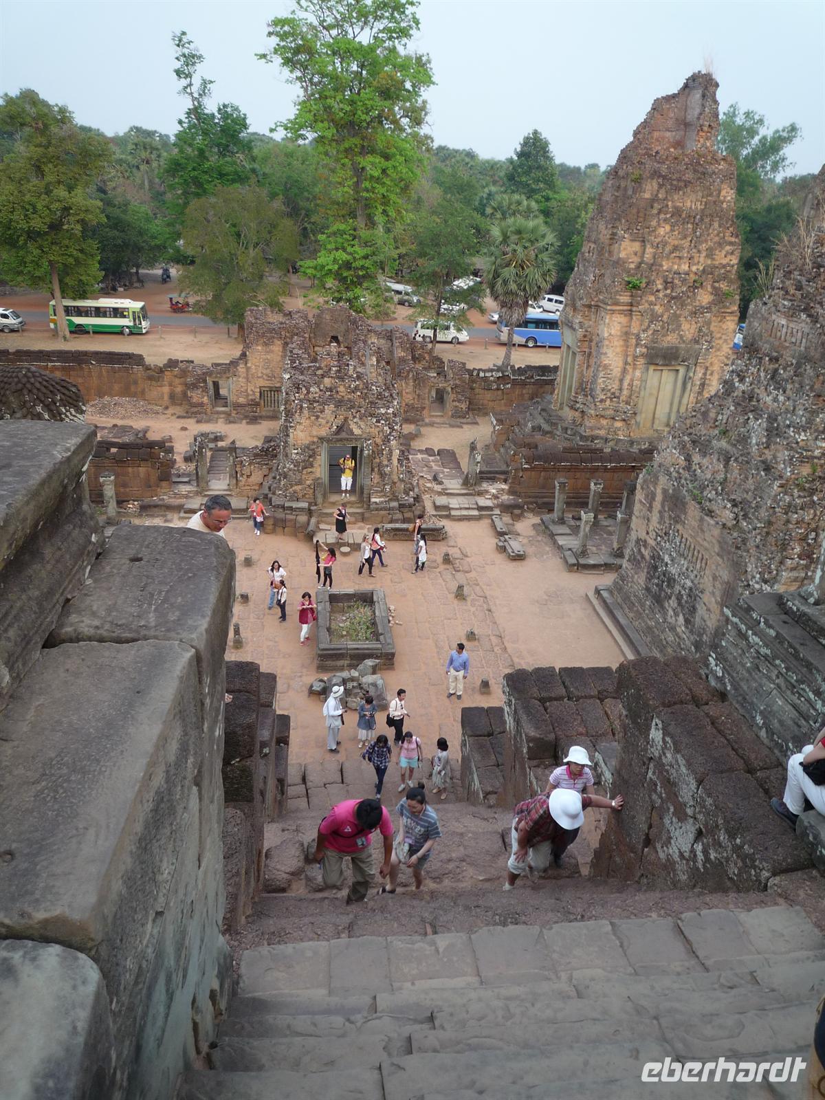 Nächster Stopp ist am Tempel „Prasat Kravan“. Die noch vorhandenen Türme sind nicht, wie sonst aus Sandstein, sondern aus Ziegelsteinen errichtet. Auf den ersten Blick erscheinen sie eher unspektakulär. Von Bedeutung sind die gut erhaltenen Backsteinreliefs mit Darstellungen von hinduistischen Göttern. Nicht weit entfernt findet sich der Tempel Banteay Kdei. Hierbei handelt es sich um ein Kloster, umgeben von einer Mauer aus Vulkangestein. Ursprünglich vom Dschungel völlig überwuchert wurde die Anlage bereits 1946 freigelegt, dabei allerdings nur wenig restauriert. Auch heute noch muss aller drei Monate das „Unkraut“ entfernt werden. Der Dschungel holt sich schnell zurück, was ihm gehört. An den Eingängen finden sich wieder Gesichtertürme und im inneren gibt es fast keinen Stein der nicht verziert ist. Danach klettern wir nun bei Sonnenschein auf die 3. Ebene von Angkor Wat, um den Ausblick zu genießen, der uns gestern verwehrt war. Anschließend haben wir uns eine Mittagspause verdient, bevor wir zum letzten Tempel für heute aufbrechen. Gute 20 Kilometer müssen wir bis zum Tempel Banteay Srei oder auch Frauentempel fahren. Die Anlage stammt aus der Mitte des 10 Jh. und ist ein Juwel unter den Tempeln. Die Faszination stammt zweifellos vom Variantenreichtum seines Dekors. Die filigran gearbeiteten Ornamentverzierungen - meist Blumen und Rankenwerk - überziehen die wichtigsten Gebäudeteile. Unwahrscheinlich viele Details gibt es zu entdecken. Uns ist inzwischen ganz schön heiß, die Sonne scheint heute unbarmherzig auf uns herab. Da heißt es viel trinken und jeder von uns greift immer wieder gern zu neuen Wasserflasche bei einsteigen in den Bus. Unser Fahrer hat sich immer darum gekümmert, dass ausreichend kostbares Nass vorhanden ist. Auf der Fahrt zurück Richtung Siem Reap halten wir noch in einem Dorf und sehen uns an, wie man aus dem Saft der Zuckerpalme Palmenzucker herstellt. Eine durchaus mühsame Arbeit. Den Sonnenuntergang erleben wir am bzw. auf dem Tempel Pre Rup, einer ebenfalls aus dem 10. Jh. stammenden pyramidenförmigen Anlage. Die untergehende Sonne bringt die Ziegelsteine zum „glühen“ aber genauso gut kann man von oben den Untergang der Sonne genießen. Zurück zum Hotel heißt es duschen und anschließend fahren wir zum Essen.