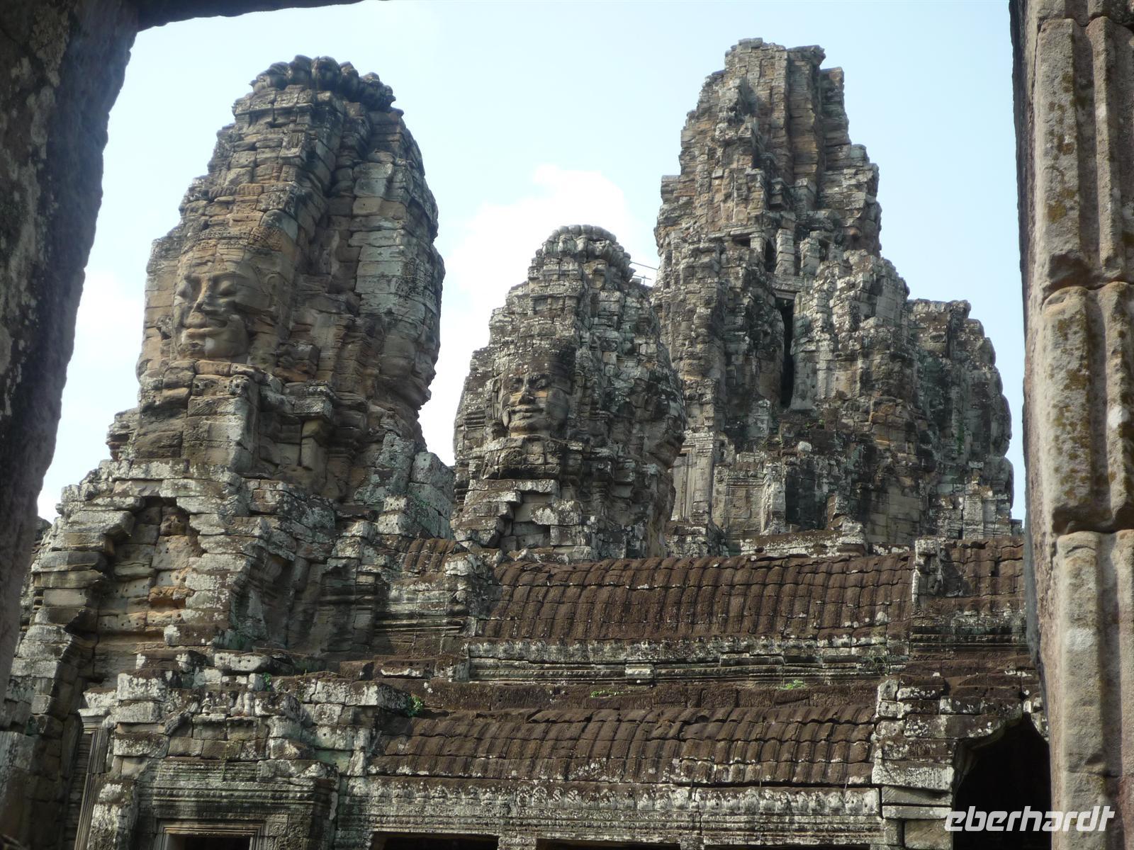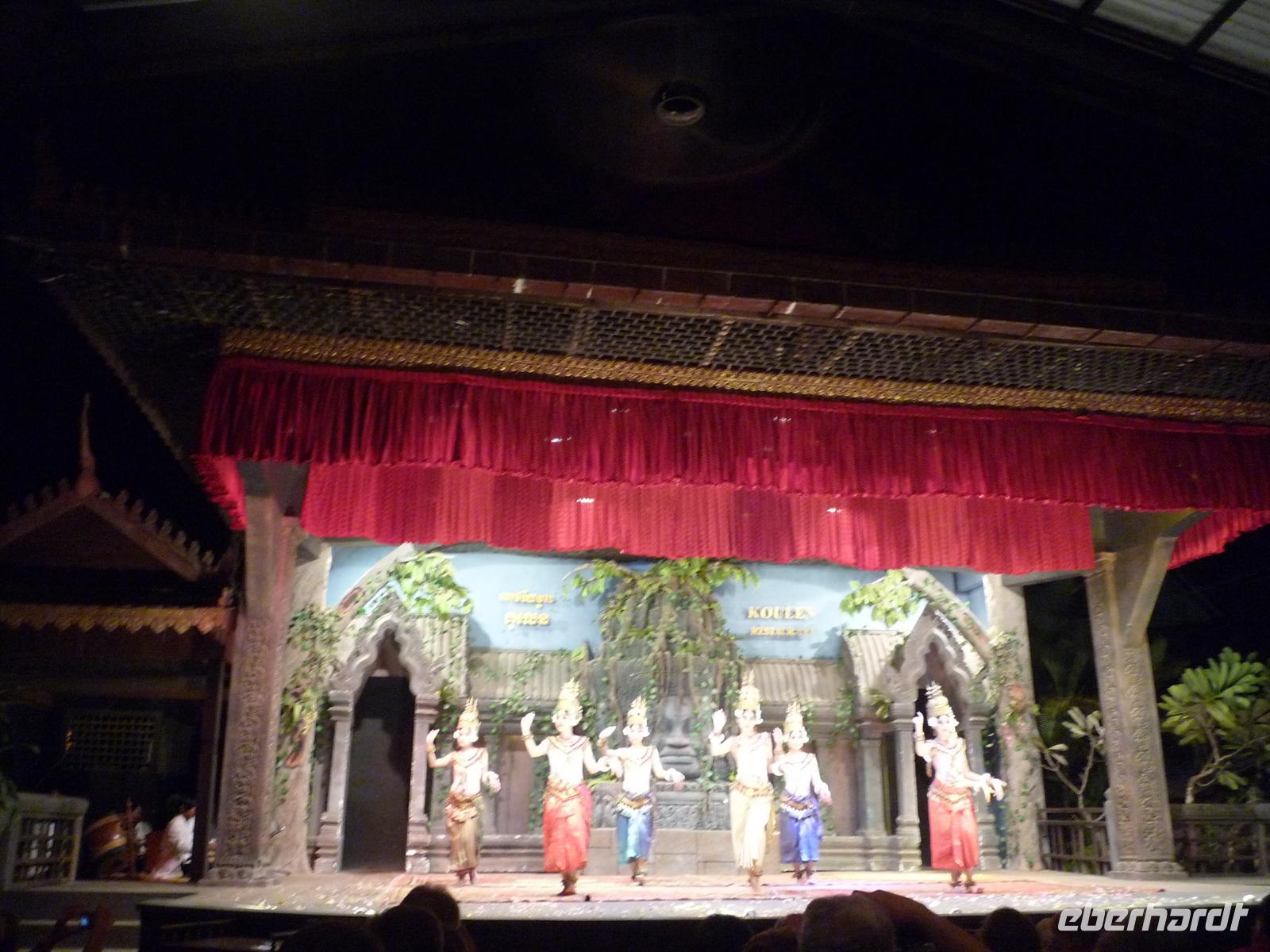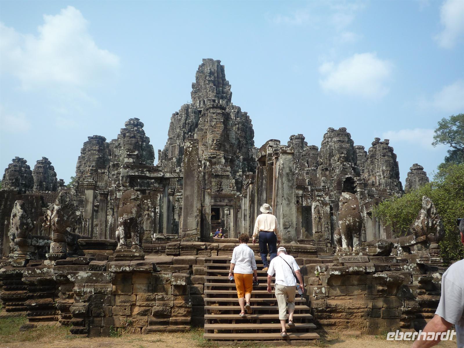 Am Nachmittag besuchen wir Angkor Thom, was Große Stadt bedeutet. Jayarvaman VII. begann Ende des 12. Jh. mit dem Bau dieser Stadt, nachdem er in Kriegen gegen die Cham seine Macht gefestigt hatte. Über einen Damm gehen wir auf das Südtor zu, welches mit seinen Gesichtern sehr imposant ist. Nach dem Tor steigen wir in einen kleineren Bus und fahren ein Stück bis zum Bayon Tempel, einem mysteriösen und zugleich faszinierenden Ort. Schon von weiten ist dieser Tempel faszinieren mit seinen Gesichtertürme etwas ganz besonderes. Ich persönlich habe eine große Ehrfurcht vor diesem Bauwerk und den Gedanken der Erbauer. Ursprünglich handelte es sich um ein Buddhistisches Heiligtum. Erst später wandte sich der König dem Hinduismus zu. Die vier Gesichter pro Turm stellten die beschützende Macht des Bodhisattva Lokeshvara Samantamukha (Herr der Welt) dar, der in alle vier Himmelsrichtungen des Reiches blickt. Auch hier finden sich wieder reichlich verzierte Galerien, nach dem Aufstieg zur oberen Terrasse laufen wir direkt an den Gesichtern vorbei. Vom Bayon gehen wir dann weiter zur Elefantenterrasse, die ihren Namen durch die Reliefdarstellung von Elefanten bekommen hat. Sie hat eine Länge von 300 Metern, hier nahm der Herrscher früher Paraden ab. Anschließend gelangen wir zur Terrasse des Leprakönigs. Das Wort Lepra hat hier allerdings nicht mit der Krankheit zu tun sondern bedeutet, dass der Herrscher dieses Bauwerk nicht vollenden könnte. Wenn der König vor Fertigstellung verstarb wurde nicht weiter gebaut, der neue Herrscher baute für sich einen neuen Tempel. Wir haben heute viel gesehen und die Eindrücke müssen erst noch einmal sortiert werden. Nach einer Pause im Hotel fahren wir zum Abendessen. Das Restaurant bietet zum Abendessen eine Tanzshow mit Apsara-Tänzerinnen. Ihre Gelenkigkeit in den Fingern und die dazu erforderliche Körperbeherrschung sind einmalig. Zum Ende der Vorführung stellten sich alle Tänzerinnen auf der Bühne auf und plötzlich strömten zahlreiche Menschen auf die Bühne um sich mit den Tänzerinnen fotografieren zu lassen.