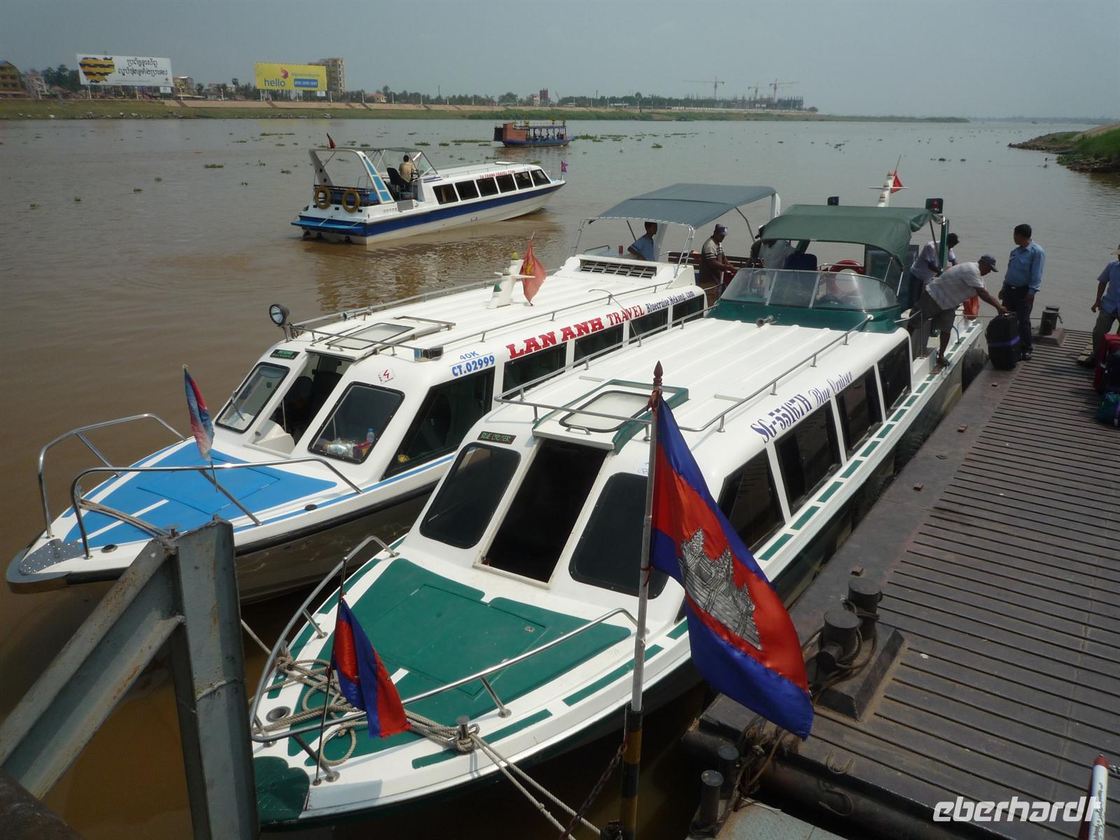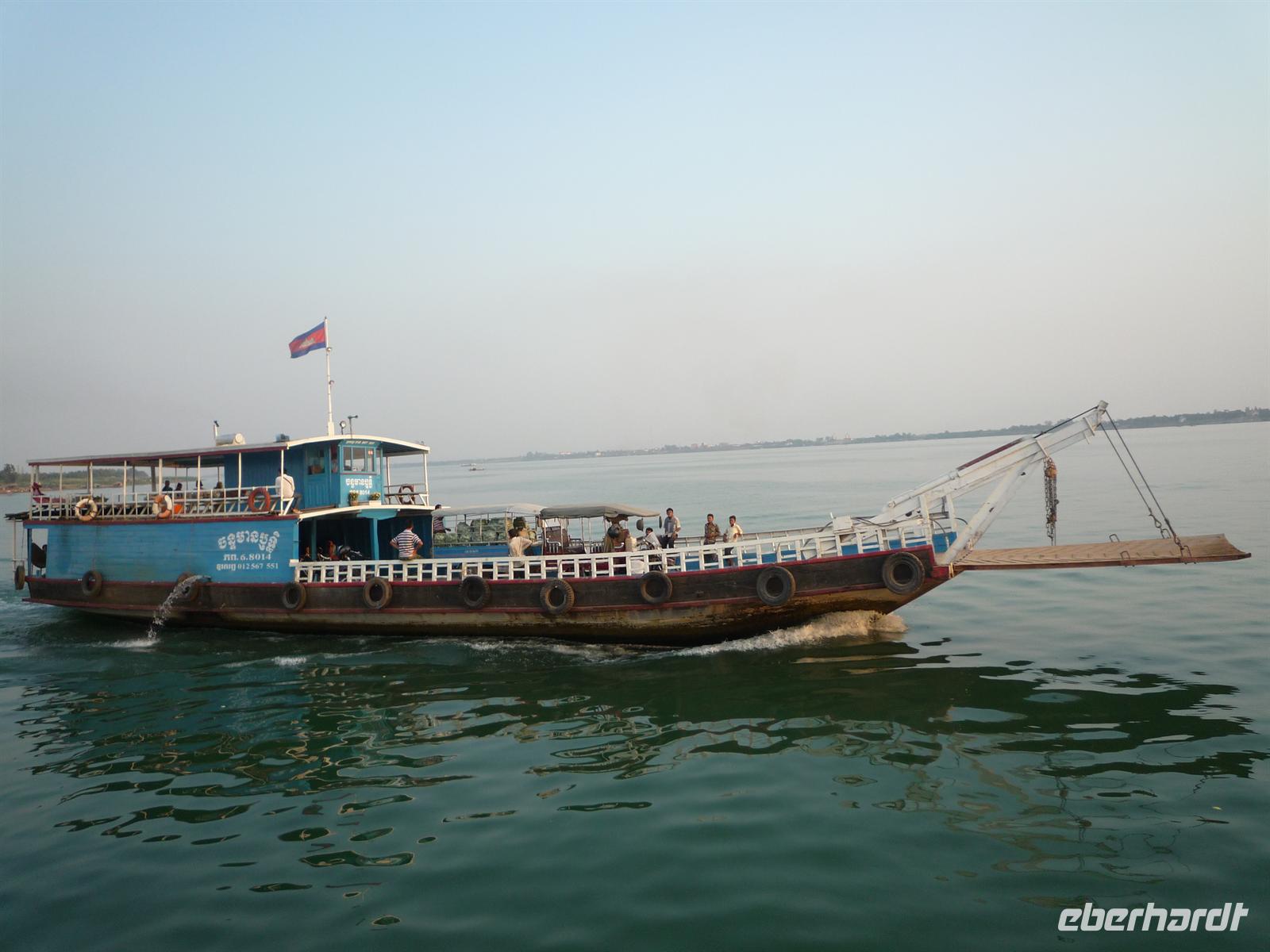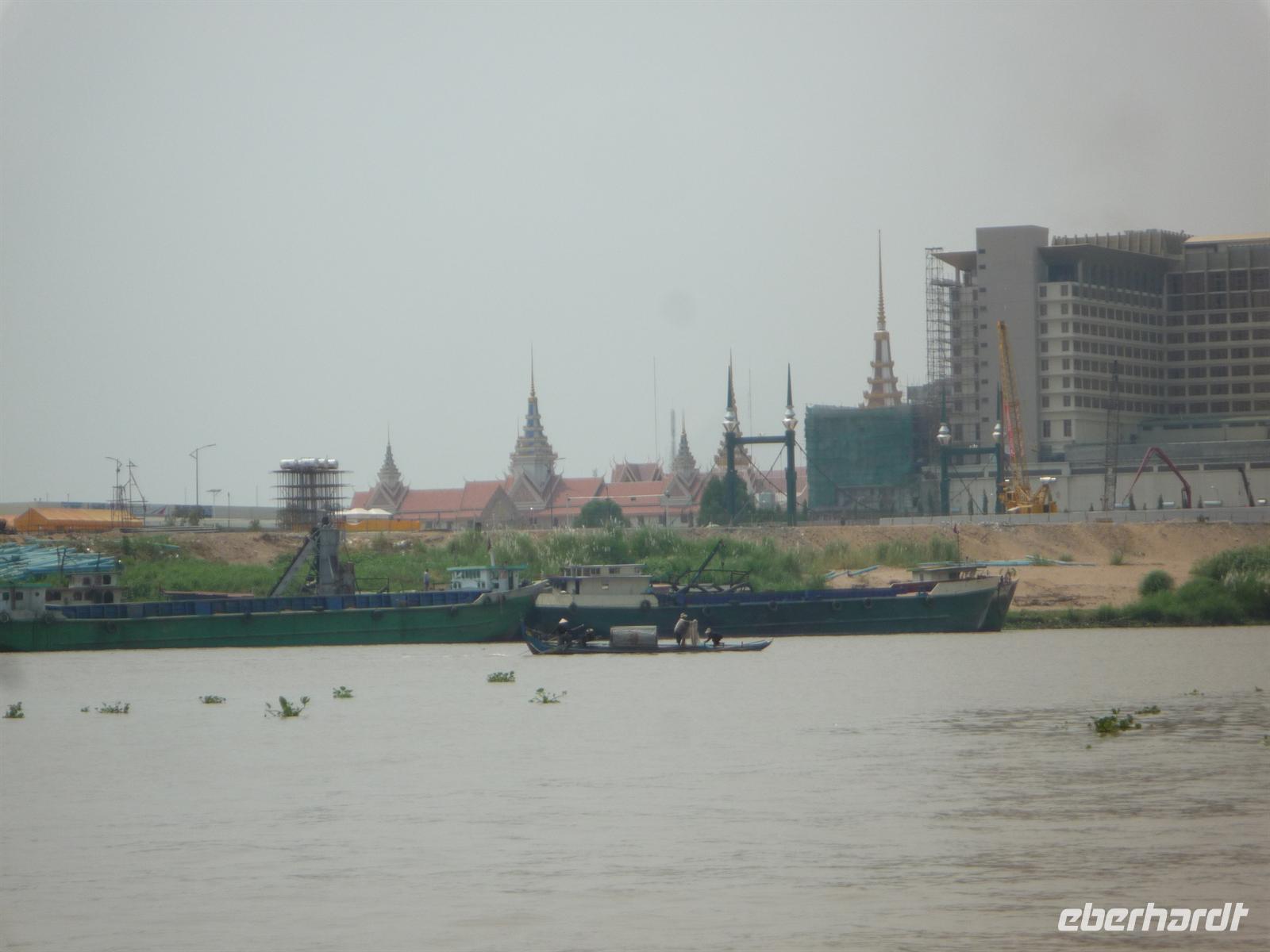 Heute geht es am Morgen mit dem Schnellboot nach Kambodscha. Wir haben ein Boot für uns, was doch recht schnell entlang de Mekongs gleitet. Wir beobachten die Landschaft, während wir uns der Grenze nähern. Plötzlich gibt es einen Knall und der Motor unseres Boots geht aus. Wir befürchten schon schlimmes und so kommt es auch, trotz Reparaturversuchen der Crew, springt das Boot nicht mehr an. Sogleich kommt ein weiteres Boot uns zur Hilfe, und wir werden abgeschleppt. Nun geht es langsam und gemächlich den Mekong entlang bis wir die vietnamesische Grenzstation erreichen. Dort warten wir nur eine kurze Weile bis dann doch recht schnell ein neues Boot kommt und so fahren wir nach unserem kleinen Erlebnis weiter. Nach 5 Minuten müssen wir das Boot aber nochmals verlassen, da wir die Granzstation zu Kambodscha betreten. Hier erhalten wir unsere Pässe und lassen uns den Einreisestempel geben. Wir fahren weiter noch ca. 3 Stunden bis nach Phnom Penh. Unterwegs beobachten wir die Dörfer am Mekong - denn viele leben von und mit dem, Fluss. Auch eine Massage ist auf dem Boot möglich. In Phnom Penh erwartet uns unser Reiseleiter und begleitet uns in unser Hotel, das wirklich sehr schön und gut ausgestattet ist. Der Nachmittag ist frei - viele von uns entspannen bei schönem Wetter am Pool. Zum Abendessen sind wir in einem Restaurant, wo traditionelle Khmerspeisen serviert werden. Geschmeckt hat es wieder sehr gut.