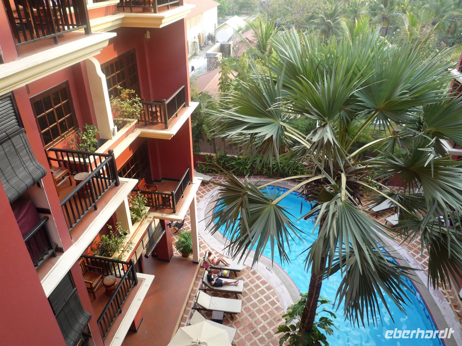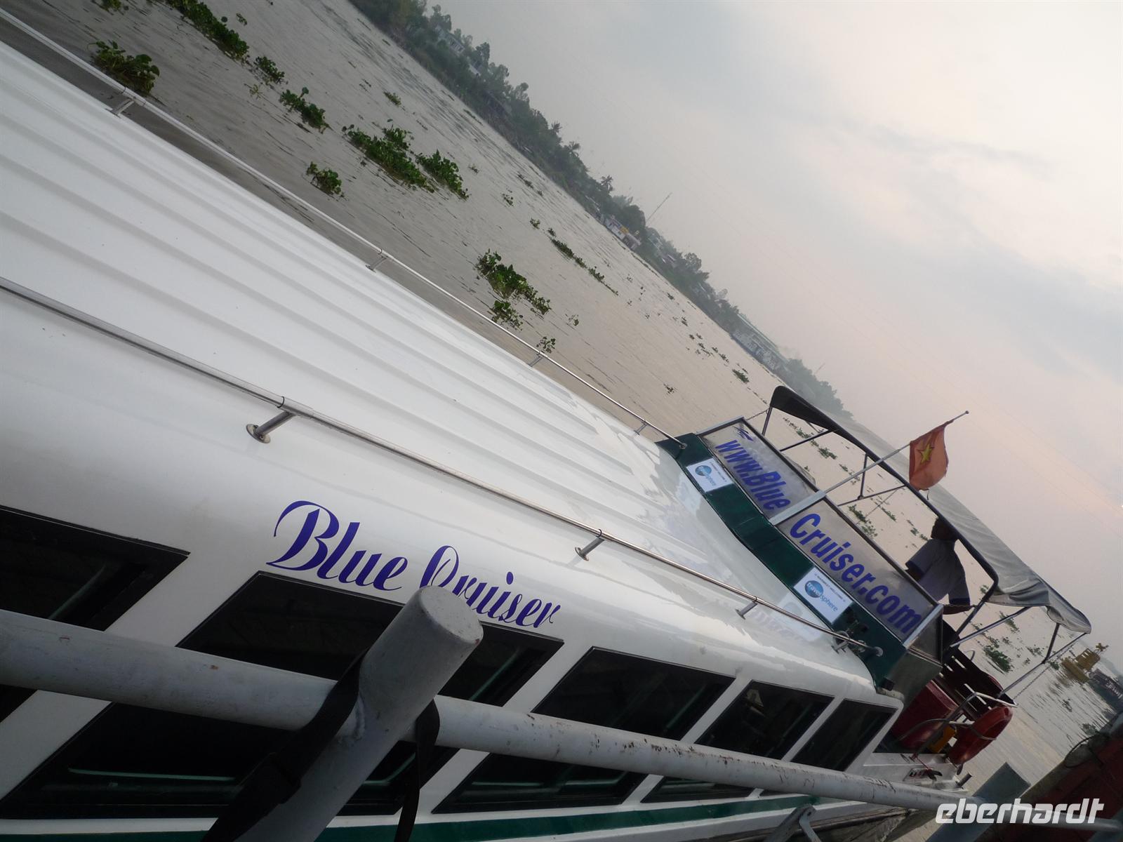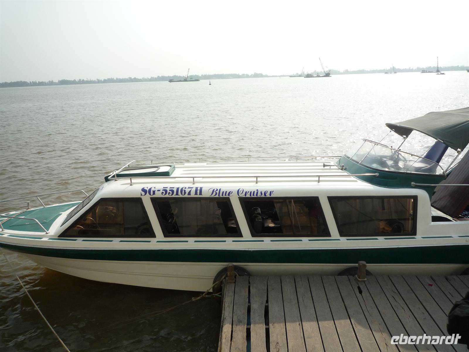 Heute geht es am Morgen mit dem Schnellboot nach Kambodscha. Wir haben ein Boot für uns, was doch recht schnell entlang de Mekongs gleitet. Wir beobachten die Landschaft, während wir uns der Grenze nähern. Plötzlich gibt es einen Knall und der Motor unseres Boots geht aus. Wir befürchten schon schlimmes und so kommt es auch, trotz Reparaturversuchen der Crew, springt das Boot nicht mehr an. Sogleich kommt ein weiteres Boot uns zur Hilfe, und wir werden abgeschleppt. Nun geht es langsam und gemächlich den Mekong entlang bis wir die vietnamesische Grenzstation erreichen. Dort warten wir nur eine kurze Weile bis dann doch recht schnell ein neues Boot kommt und so fahren wir nach unserem kleinen Erlebnis weiter. Nach 5 Minuten müssen wir das Boot aber nochmals verlassen, da wir die Granzstation zu Kambodscha betreten. Hier erhalten wir unsere Pässe und lassen uns den Einreisestempel geben. Wir fahren weiter noch ca. 3 Stunden bis nach Phnom Penh. Unterwegs beobachten wir die Dörfer am Mekong - denn viele leben von und mit dem, Fluss. Auch eine Massage ist auf dem Boot möglich. In Phnom Penh erwartet uns unser Reiseleiter und begleitet uns in unser Hotel, das wirklich sehr schön und gut ausgestattet ist. Der Nachmittag ist frei - viele von uns entspannen bei schönem Wetter am Pool. Zum Abendessen sind wir in einem Restaurant, wo traditionelle Khmerspeisen serviert werden. Geschmeckt hat es wieder sehr gut.