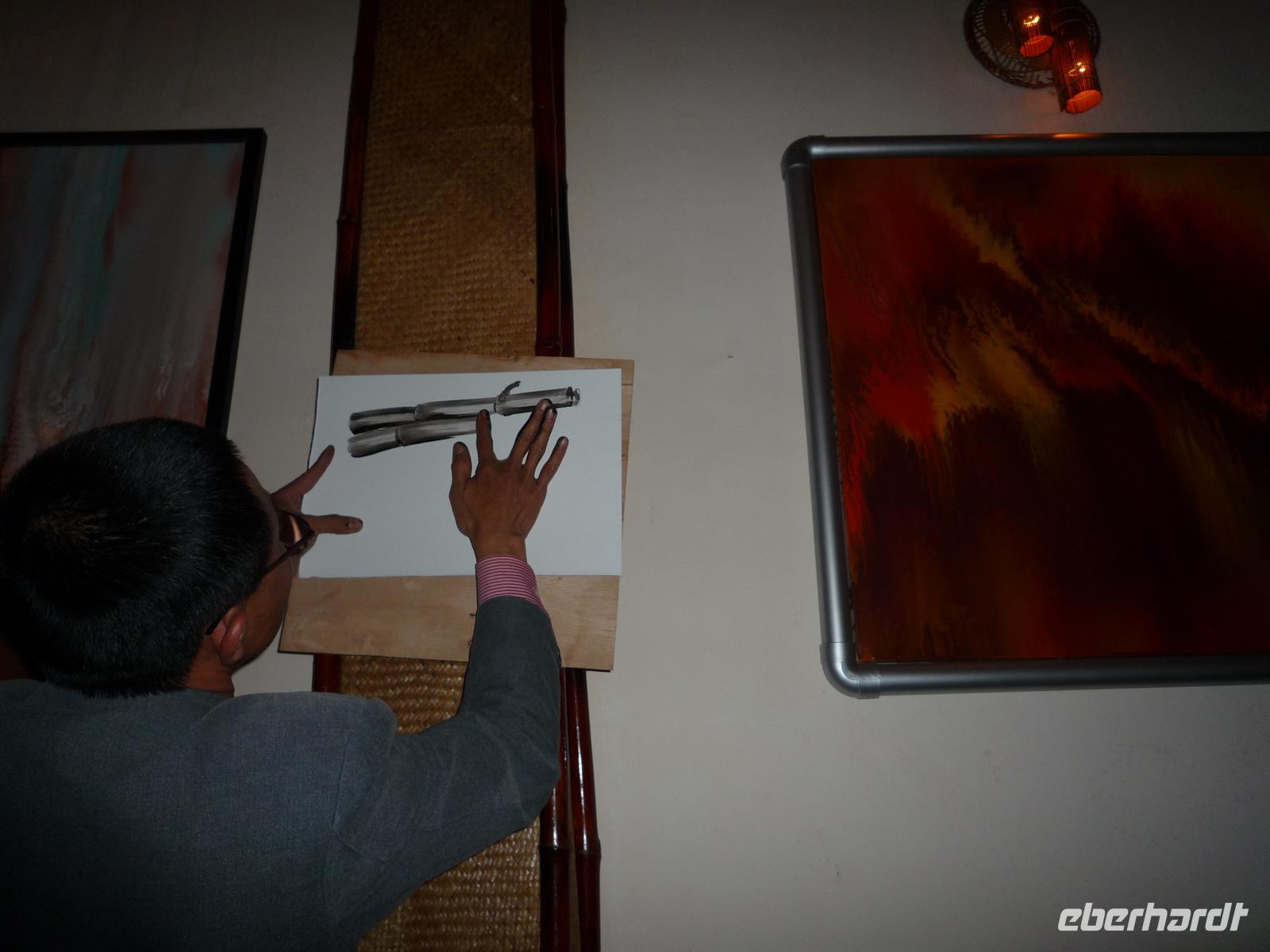 Der Vormittag steht nochmals zur freien Verfügung. Die Sonne lacht und einige nutzen die Zeit für einen Spaziergang. Gegen Mittag fahren wir zum Flughafen und es geht heute nach Da Lat. Nach der Ankunft in der Stadt, des ewigen Frühlings besuchen wir noch am Prenn-Wasserfall, der auf dem Weg liegt. Ein kleiner Spaziergang über die Hängebrücke und hinter dem Wasserfall entlang entspannt und bildet einen schönen Abschluss des Tages. Nach dem Bezug unseres zentral gelegenen, neuen Hotels, fahren wir zum Abendessen bei einem Künstler ins Art Café. Nach dem Essen lädt er einige Gäste von uns ein, mit ihm gemeinsam Bilder mit Tusche und den Fingern zu malen - eine interessante Angelegenheit.