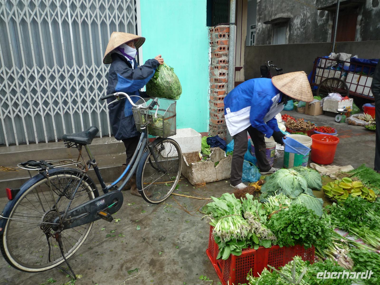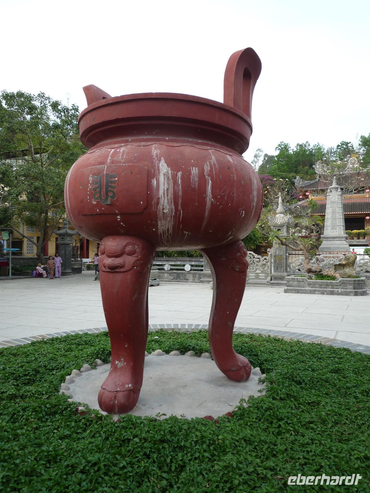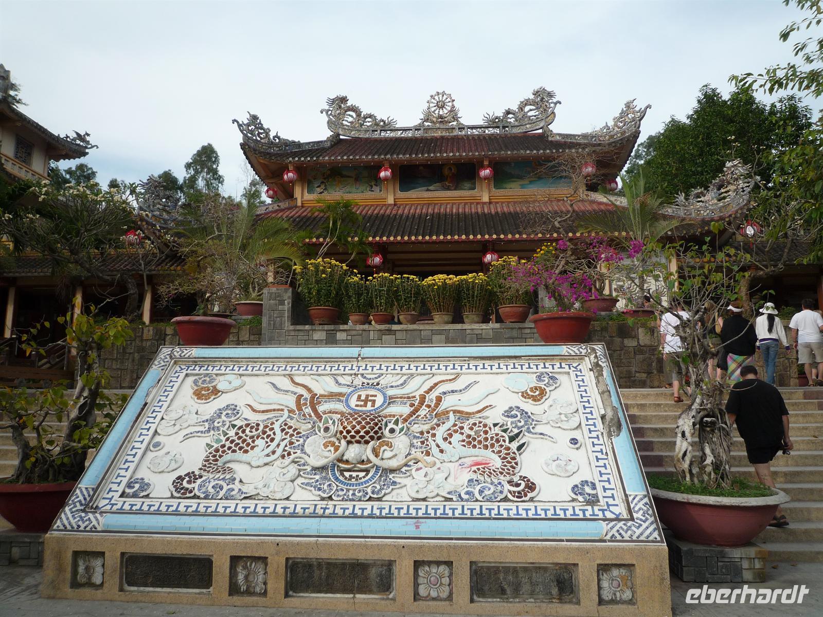 Die Linh Phuoc-Pagode wurde zwischen 1949 und 1992 erbaut und wurde seitdem von einer Reihe von buddhistischen Mönchen geleitet und 1990 von ihnen renoviert. Im zweiten Stockwerk des Turmes, in dem in jedem Stockwerk ein anderer Gott verehrt wird, ist die größte Glocke Zentralvietnams zu finden. Die Glocke misst 4,4 Meter in der Höhe und wiegt etwa 8,5 Tonnen. Abschließend besuchen wir noch den quirligen Markt im Zentrum der Stadt, bevor wir in der Nähe zu Abend essen. Als Spezialität gibt es heute zum Nachtisch gebackene Bananen, die vor unseren Augen flambiert wurden.