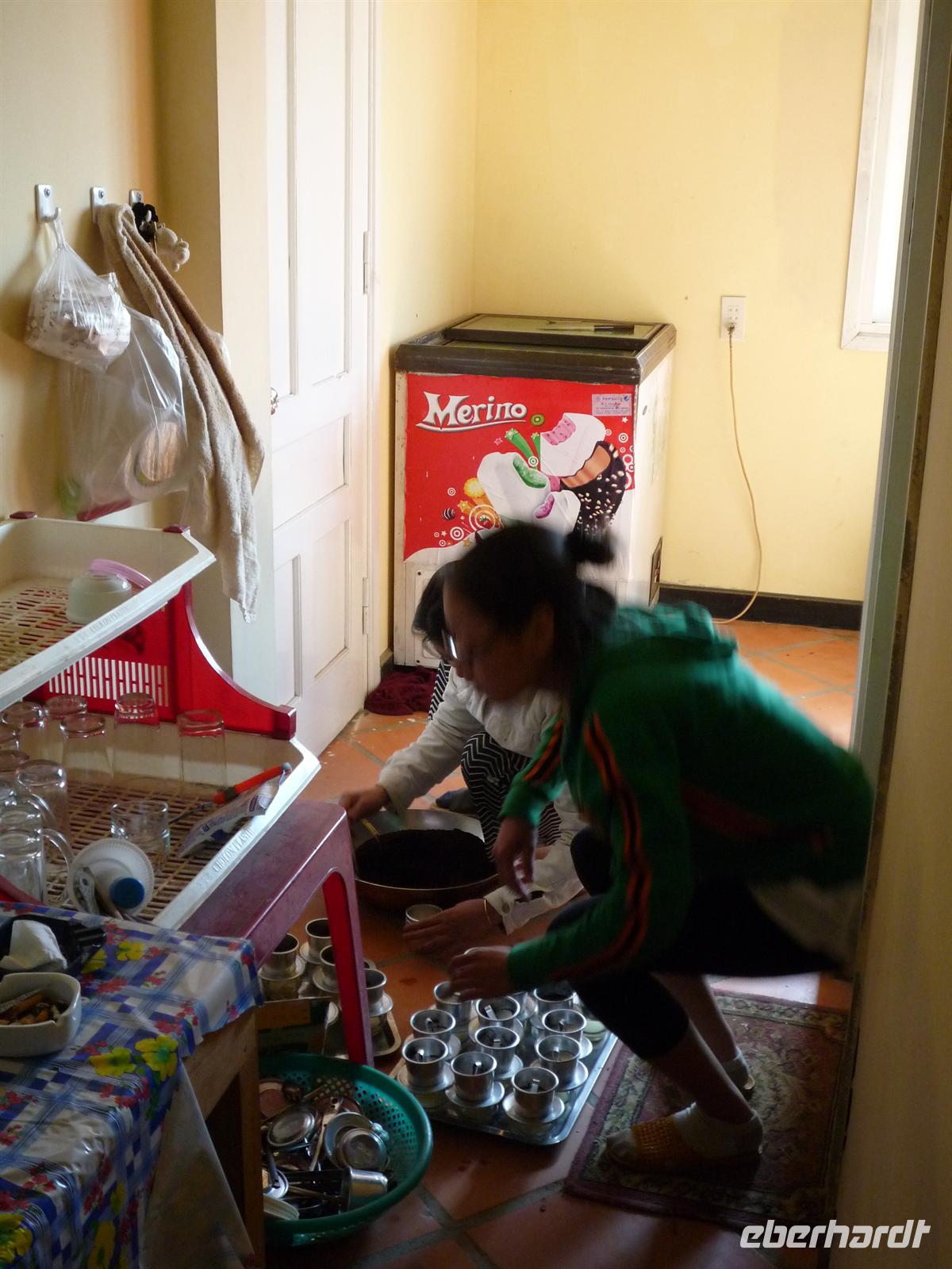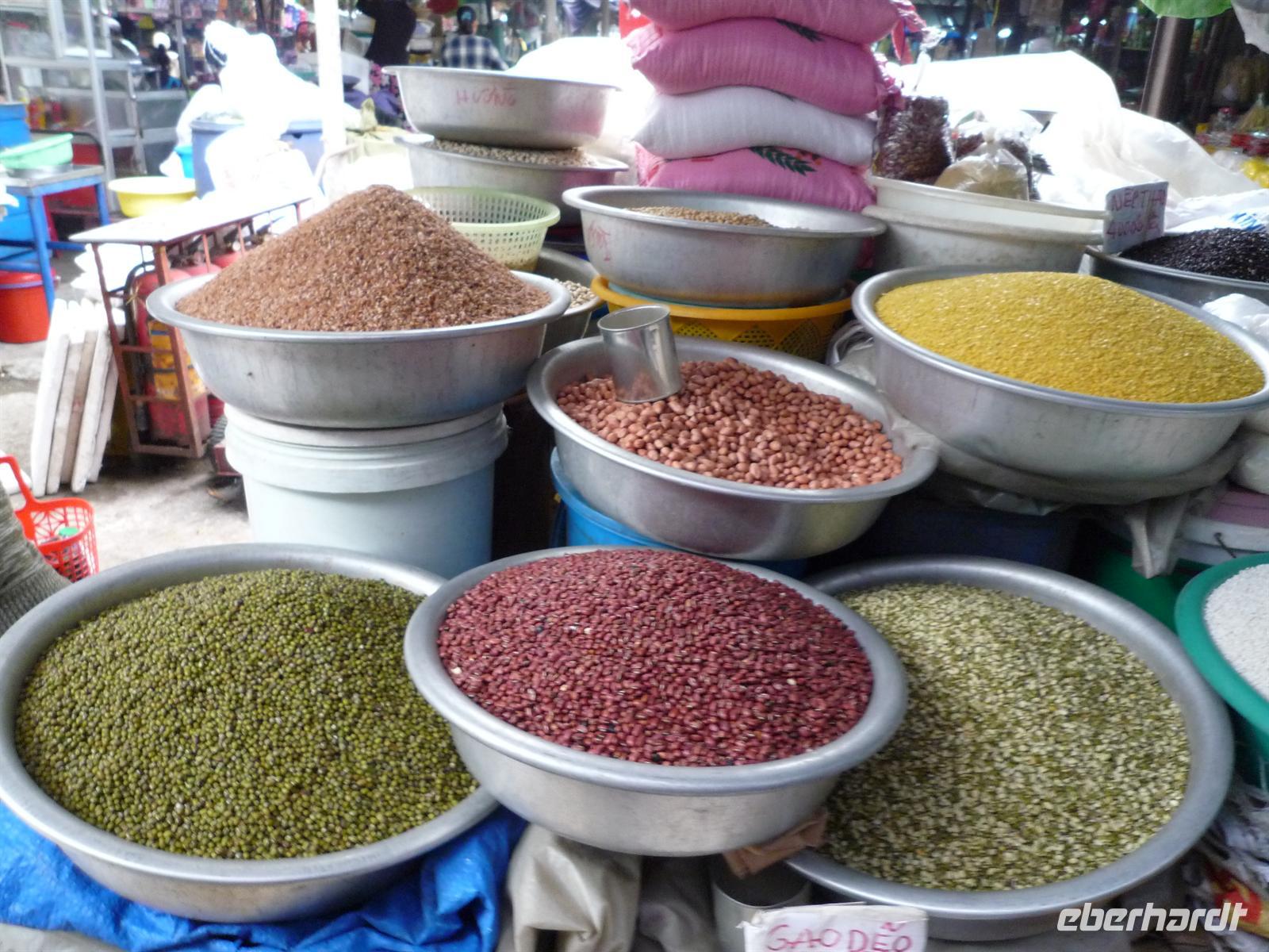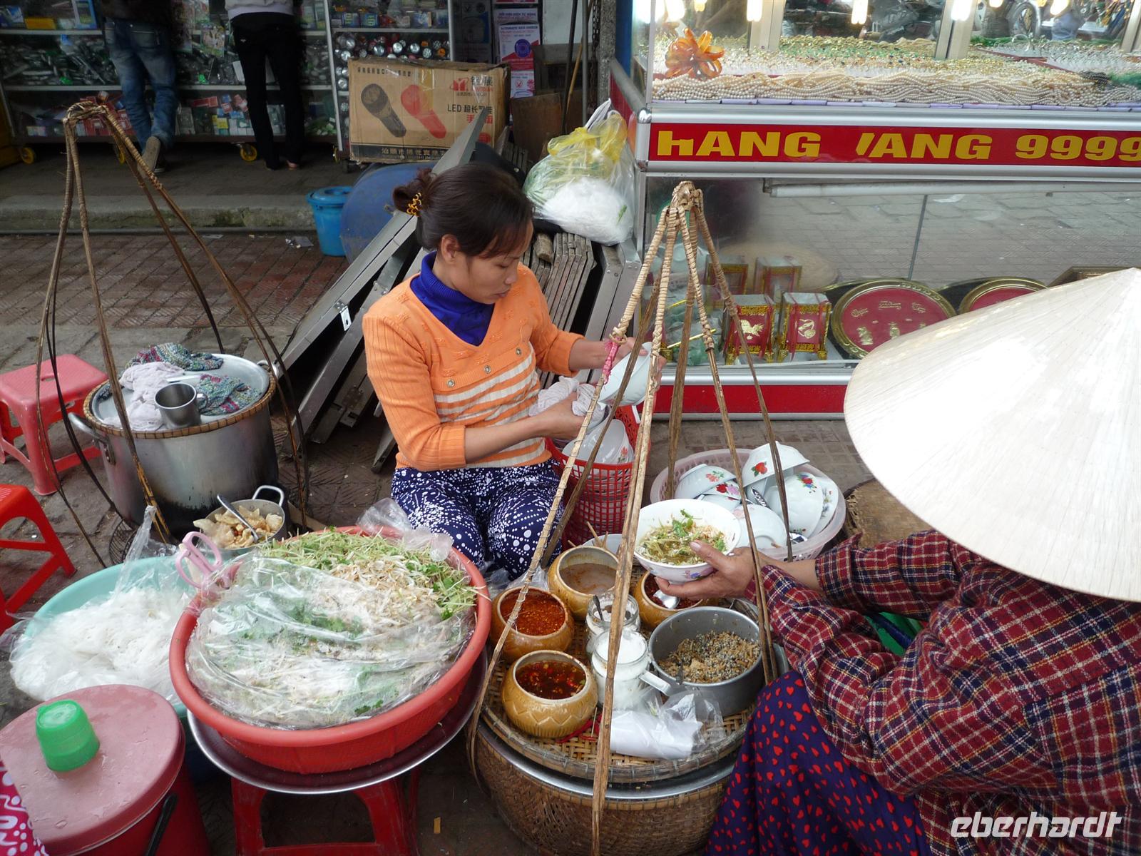 Die Linh Phuoc-Pagode wurde zwischen 1949 und 1992 erbaut und wurde seitdem von einer Reihe von buddhistischen Mönchen geleitet und 1990 von ihnen renoviert. Im zweiten Stockwerk des Turmes, in dem in jedem Stockwerk ein anderer Gott verehrt wird, ist die größte Glocke Zentralvietnams zu finden. Die Glocke misst 4,4 Meter in der Höhe und wiegt etwa 8,5 Tonnen. Abschließend besuchen wir noch den quirligen Markt im Zentrum der Stadt, bevor wir in der Nähe zu Abend essen. Als Spezialität gibt es heute zum Nachtisch gebackene Bananen, die vor unseren Augen flambiert wurden.