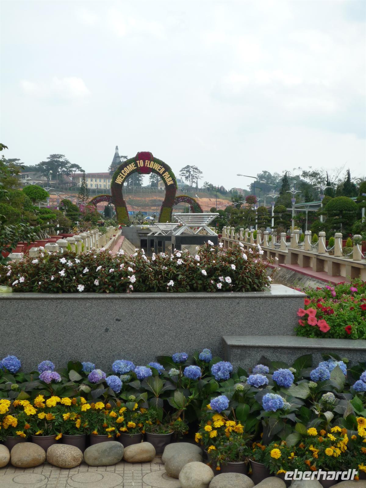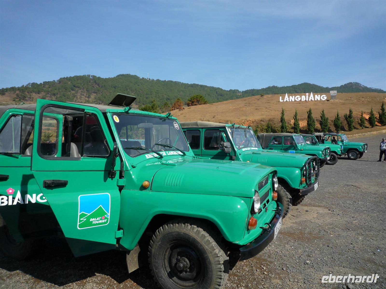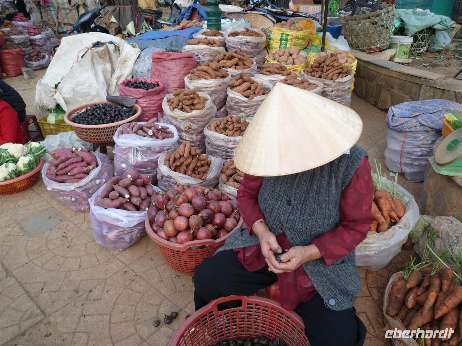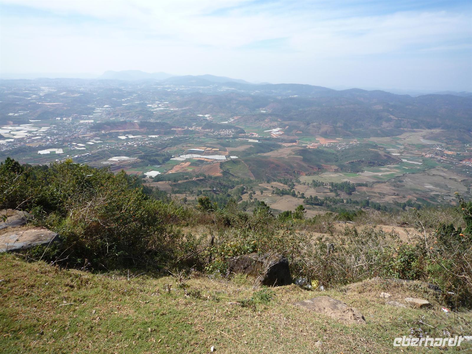 Da Lat ist so etwas wie der Garten von Vietnam. In seiner Umgebung gibt es unzählige Plantagen wo Gemüse und Obst angebaut wird, wo Blumen gezüchtet werden. Wir fahren zuerst zu einem Nationalpark, wo wir in Jeeps umsteigen und auf einen Aussichtspunkt fahren, wo wir den tollen Blick ins Tal begutachten. Oben verkaufen auch einige Bergvölker ihre Waren. Anschließend fahren wir mit dem Bus noch zu einem typischen Dorf, wo wir uns das traditionelle Wohnhaus anschauen können.