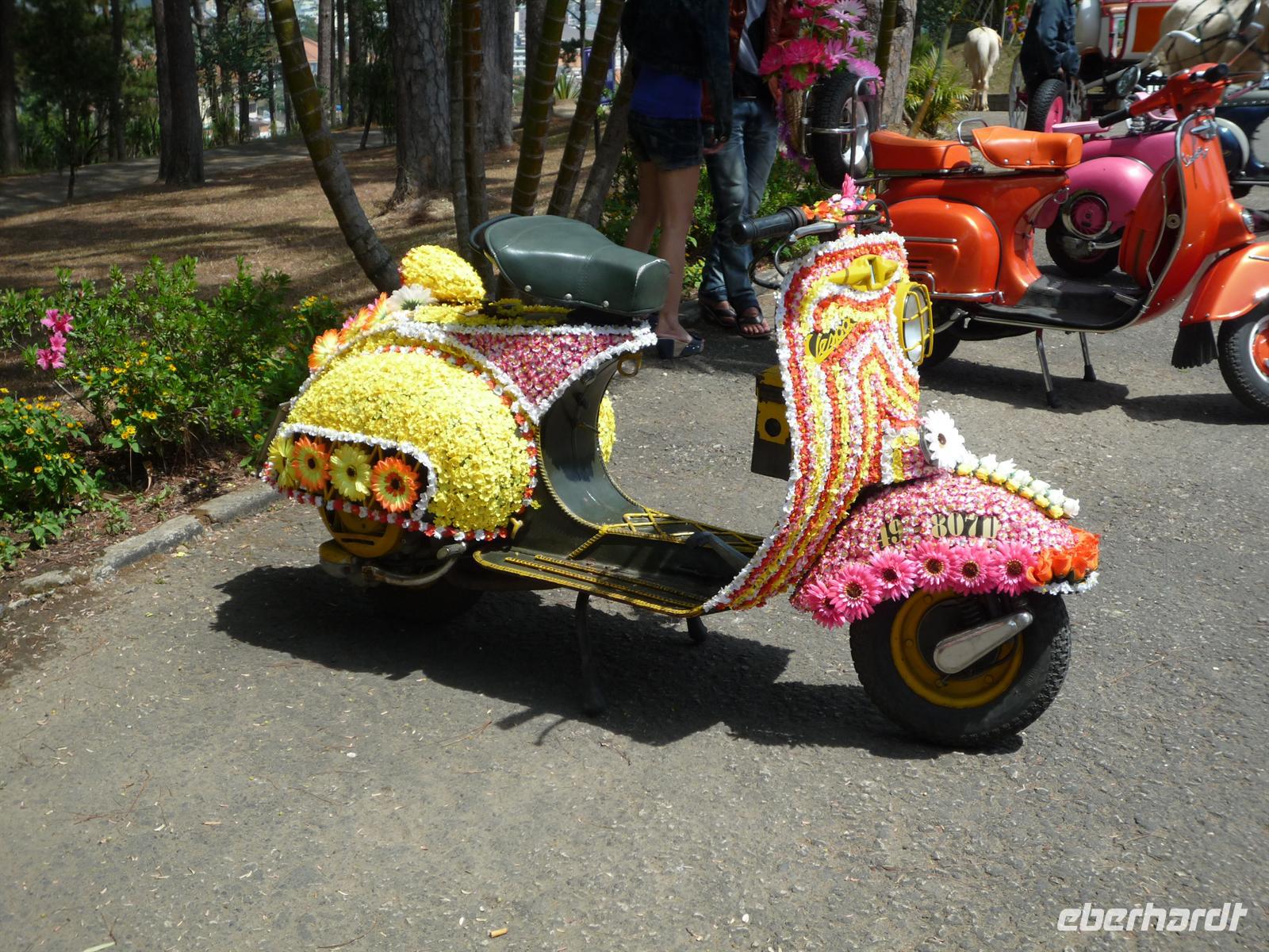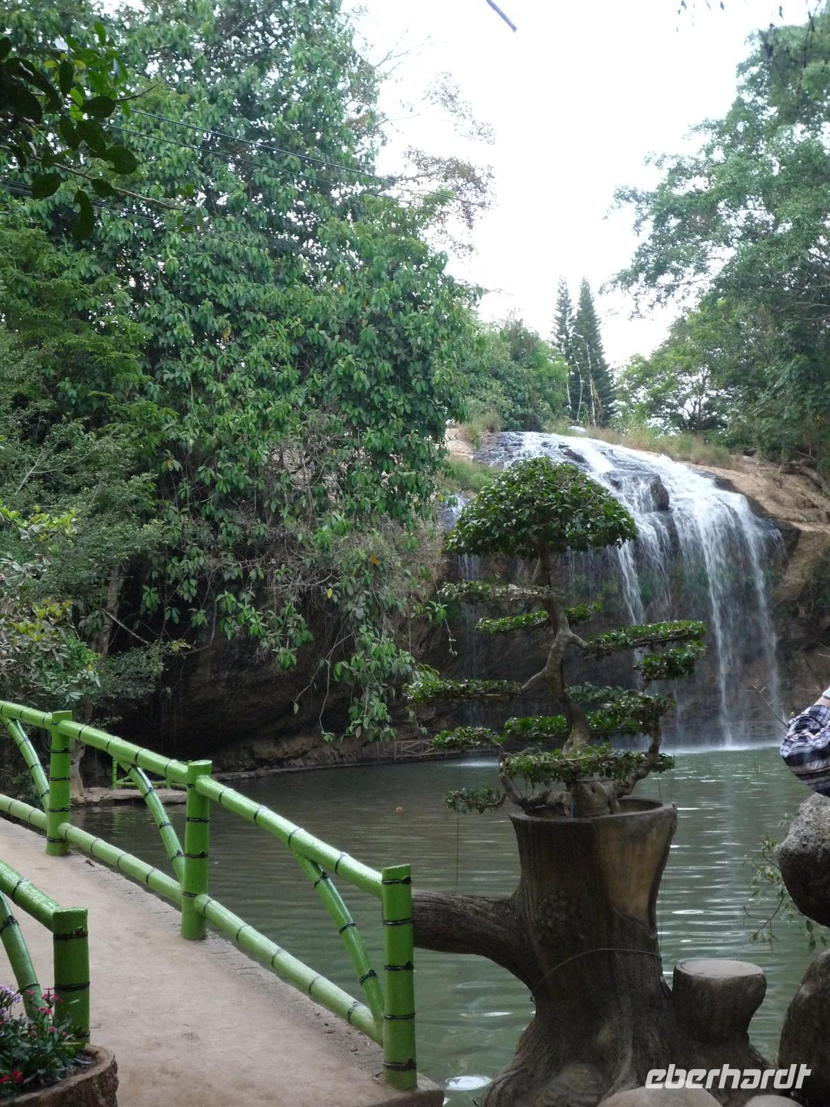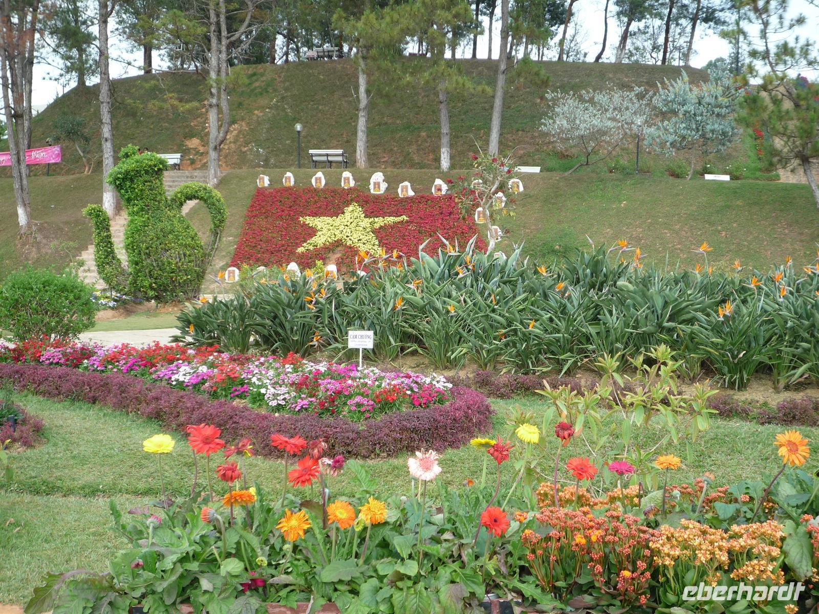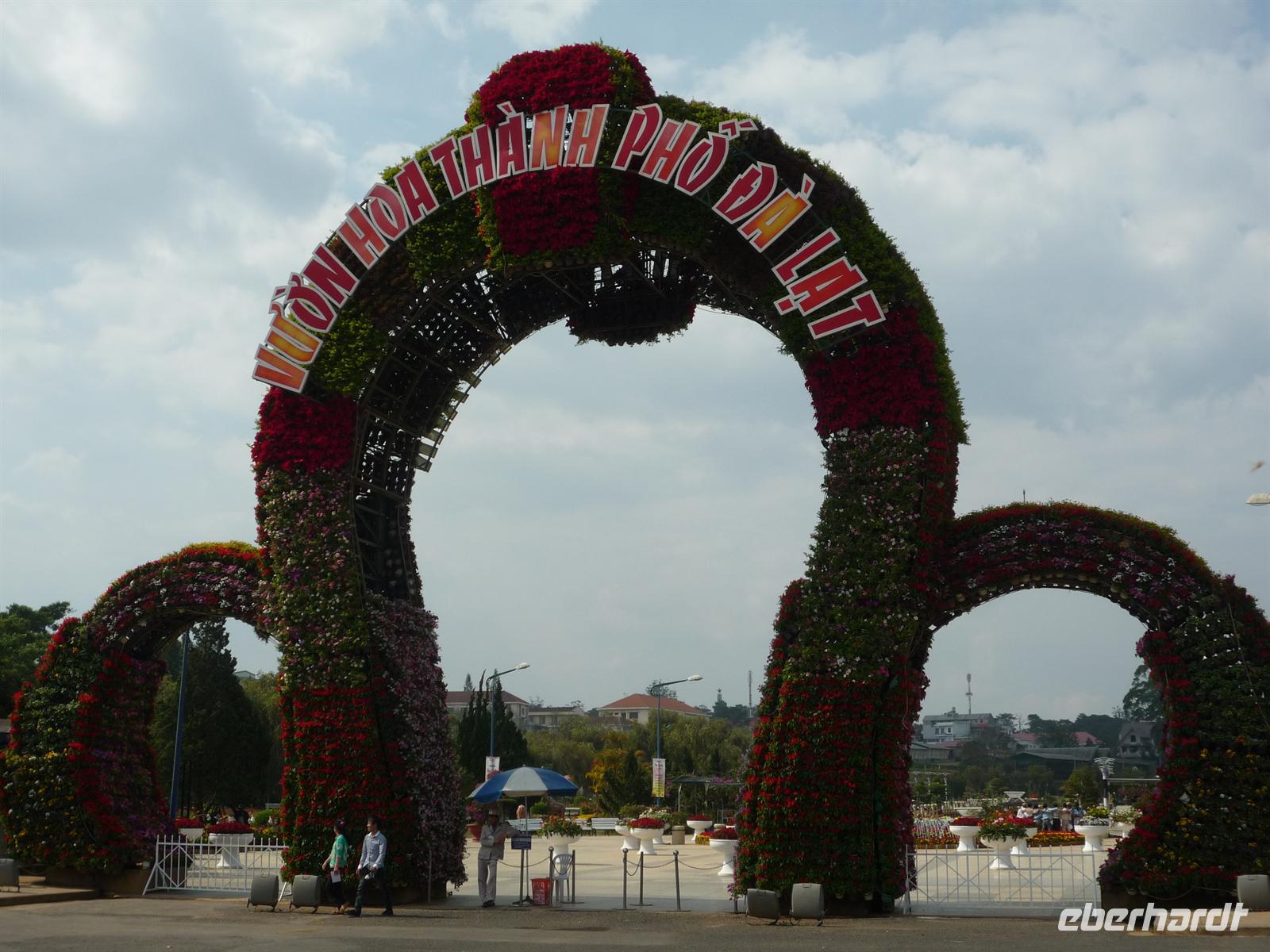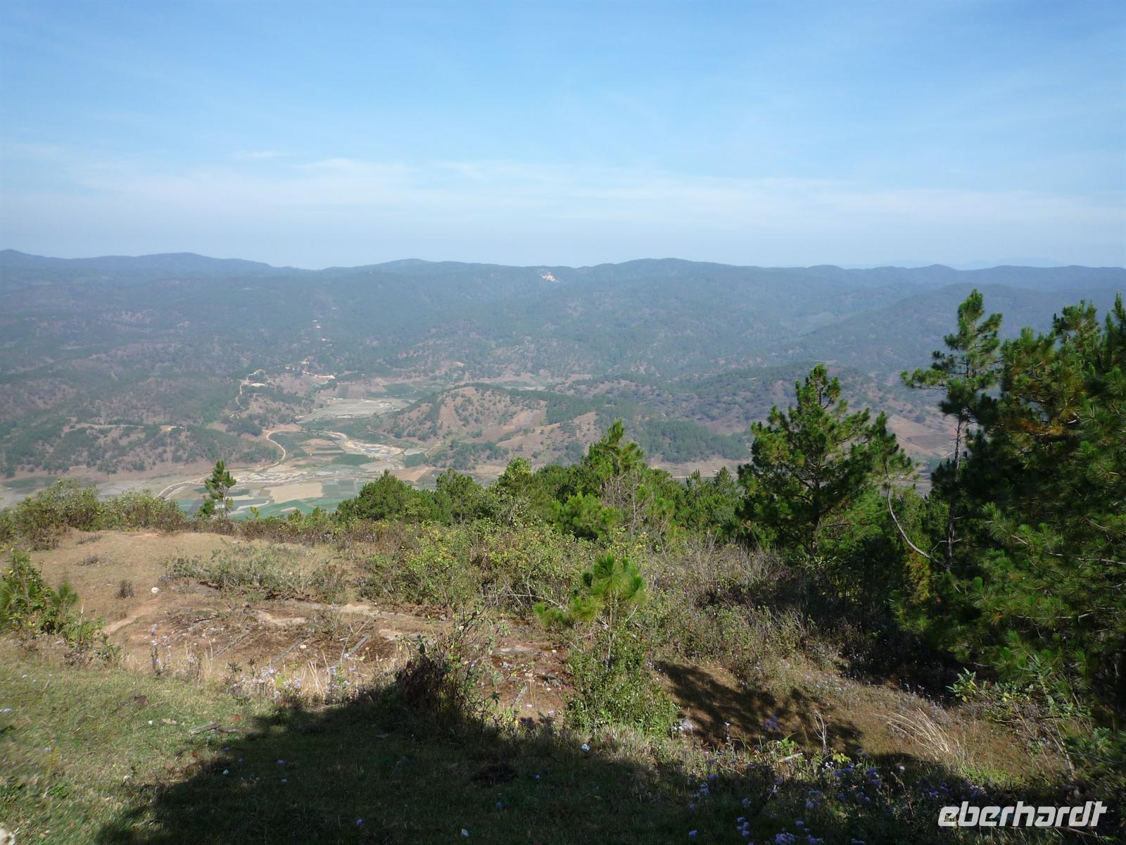 Da Lat ist so etwas wie der Garten von Vietnam. In seiner Umgebung gibt es unzählige Plantagen wo Gemüse und Obst angebaut wird, wo Blumen gezüchtet werden. Wir fahren zuerst zu einem Nationalpark, wo wir in Jeeps umsteigen und auf einen Aussichtspunkt fahren, wo wir den tollen Blick ins Tal begutachten. Oben verkaufen auch einige Bergvölker ihre Waren. Anschließend fahren wir mit dem Bus noch zu einem typischen Dorf, wo wir uns das traditionelle Wohnhaus anschauen können.
