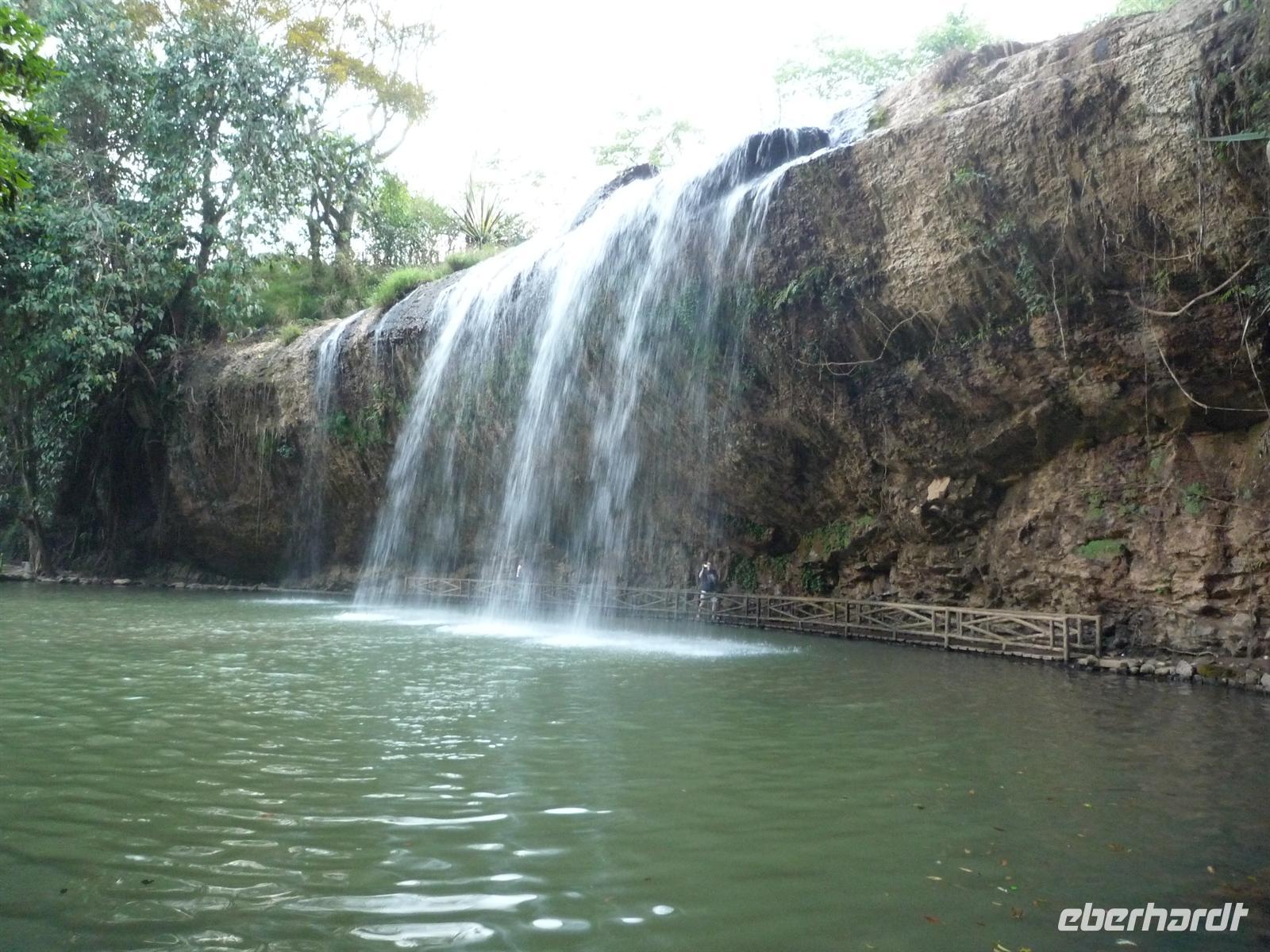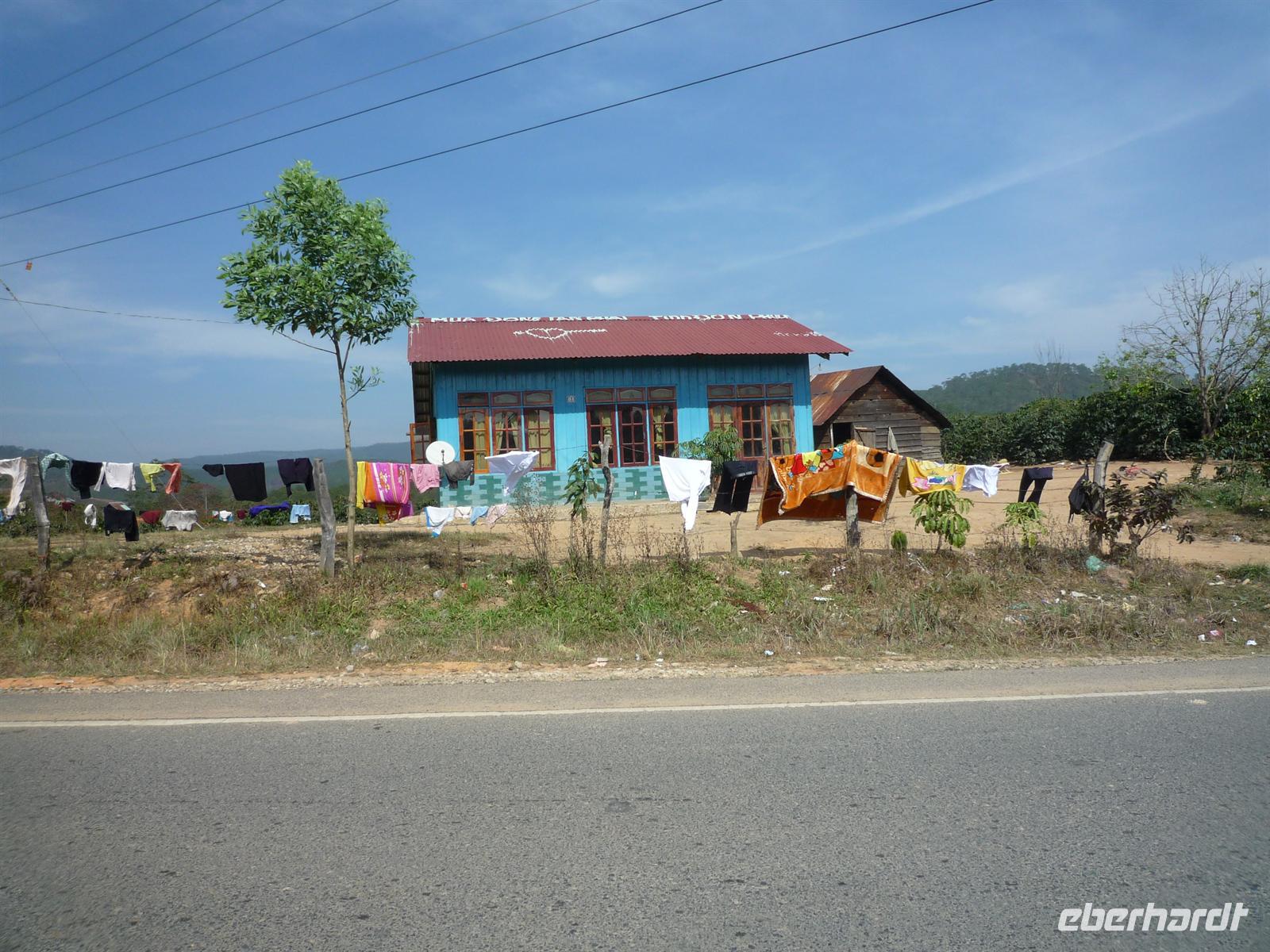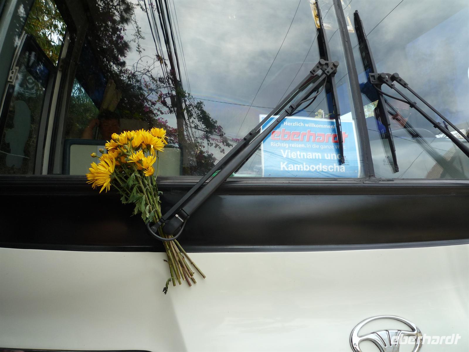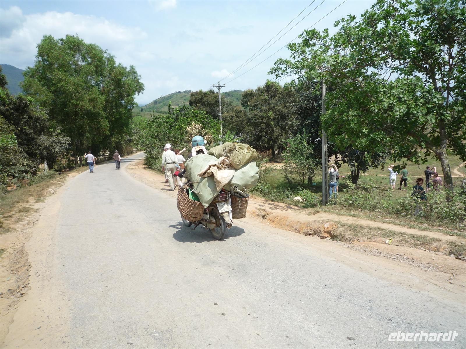 Da Lat ist so etwas wie der Garten von Vietnam. In seiner Umgebung gibt es unzählige Plantagen wo Gemüse und Obst angebaut wird, wo Blumen gezüchtet werden. Wir fahren zuerst zu einem Nationalpark, wo wir in Jeeps umsteigen und auf einen Aussichtspunkt fahren, wo wir den tollen Blick ins Tal begutachten. Oben verkaufen auch einige Bergvölker ihre Waren. Anschließend fahren wir mit dem Bus noch zu einem typischen Dorf, wo wir uns das traditionelle Wohnhaus anschauen können.