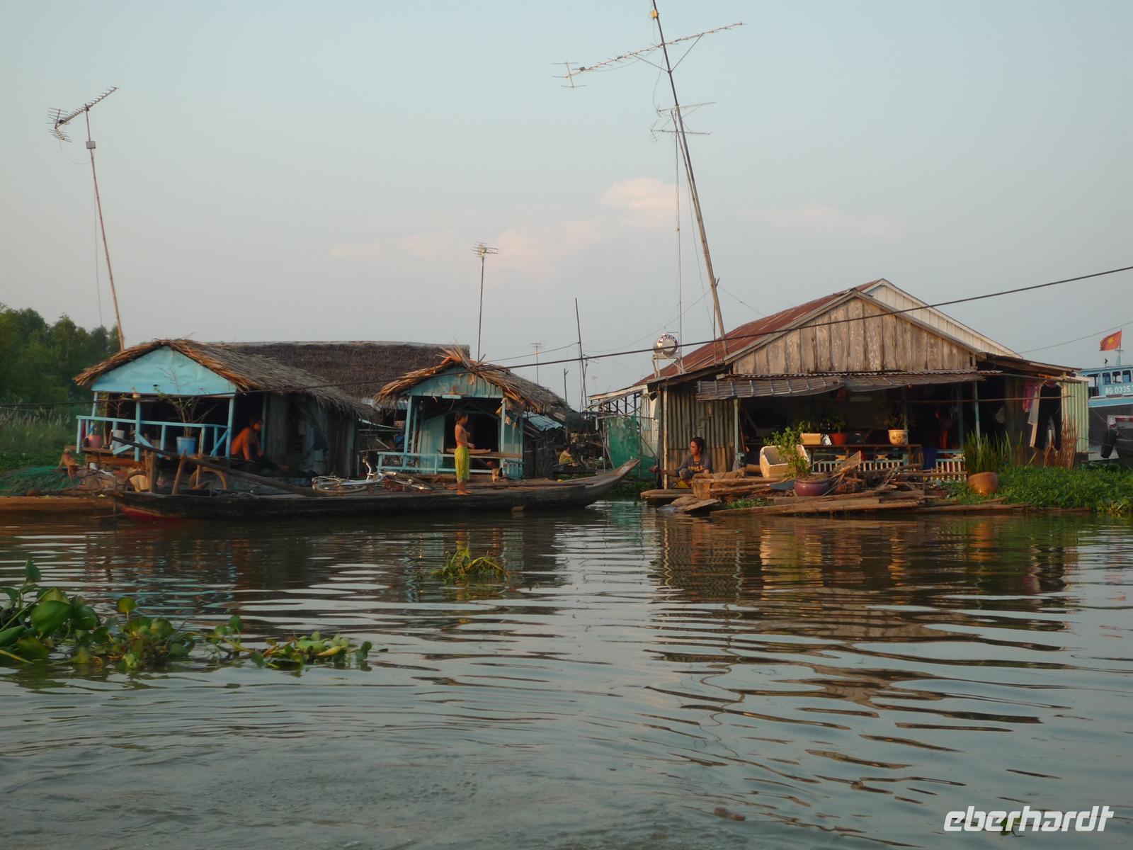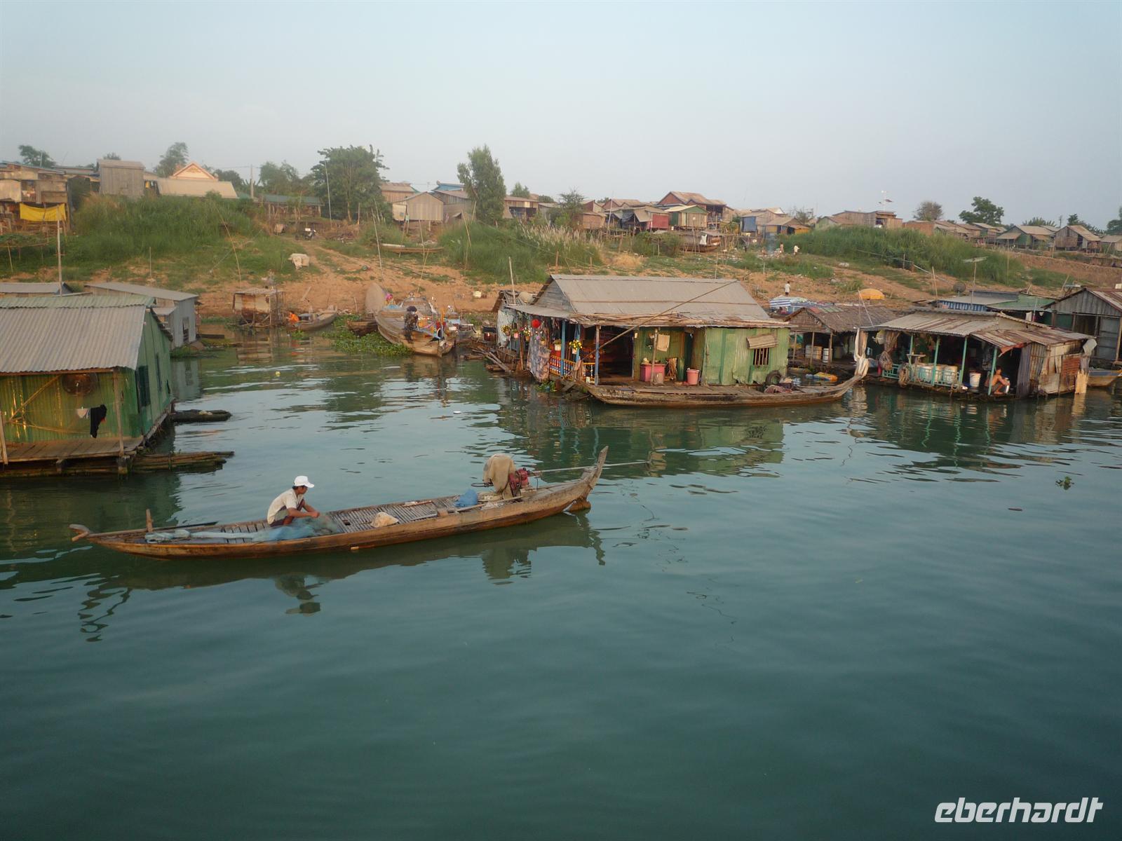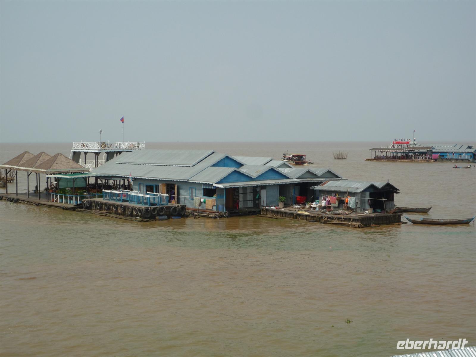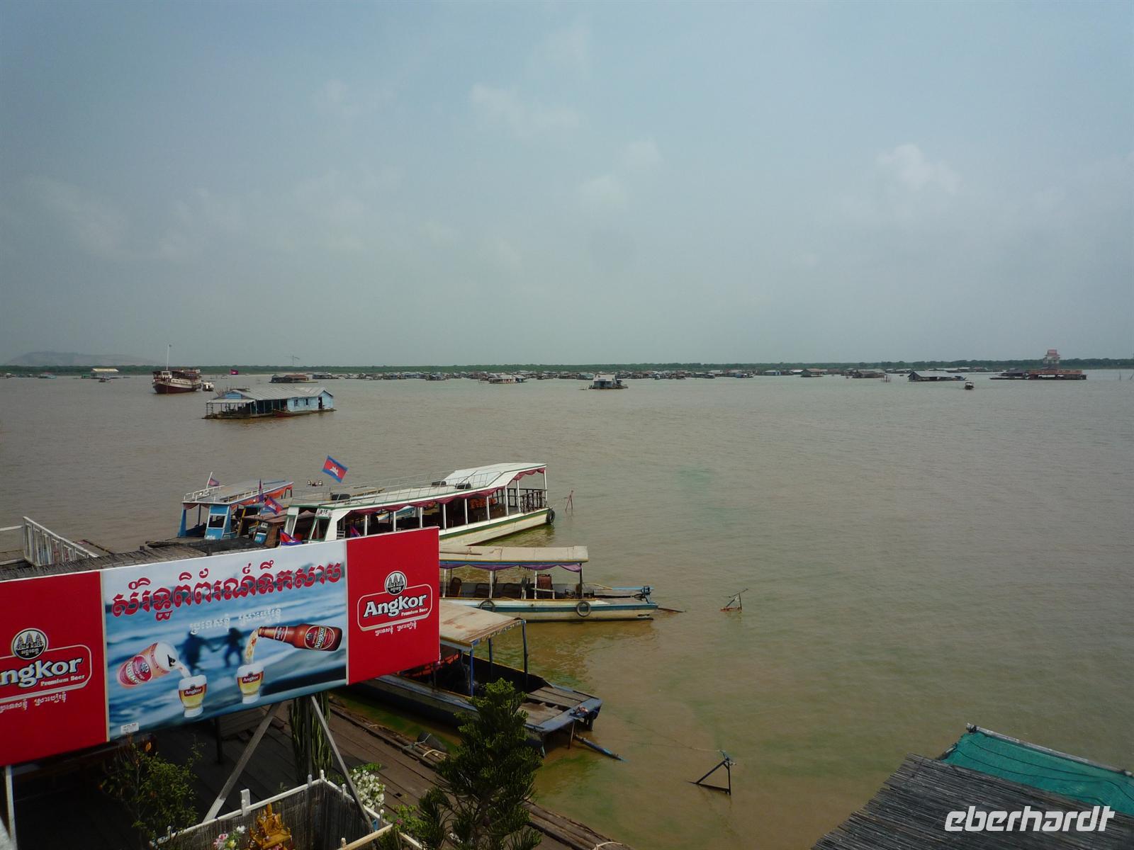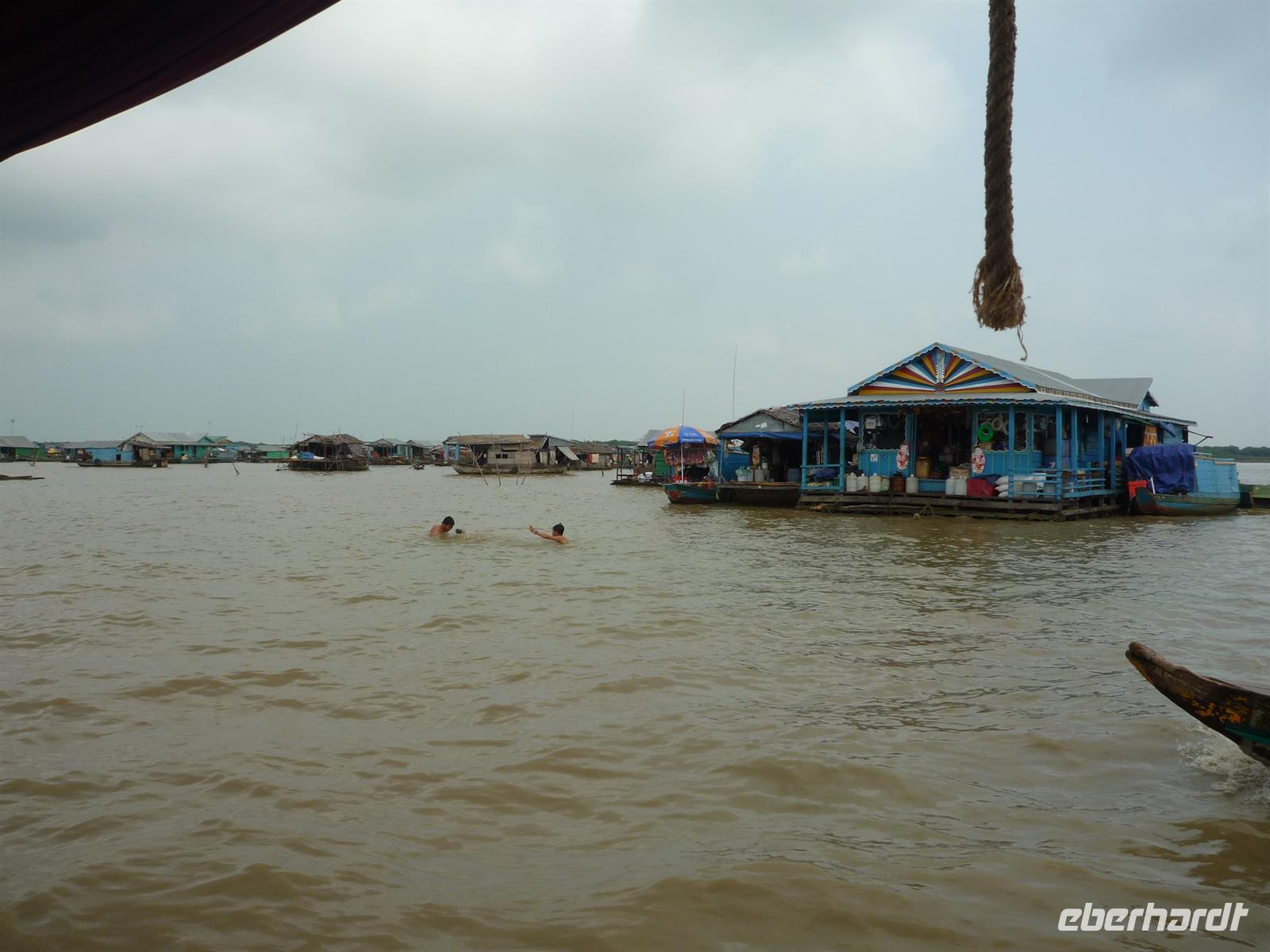 Am zeitigen Morgen fahren zwei unserer Gäste zum Eleantenreiten. Mit einem Tuk Tuk werden Sie zum Südtor von Angkor Thom gebracht und auf dem Elefanten geht es dann weiter bis zum Bayon Tempel. Um 9 Uhr treffen wir uns dann alle wieder am Hotel und machen noch einen Ausflug zum Tonle Sap-See. Auf dem Weg dahin laufen wir noch durch ein Dorf und haben die Gelegenheit durch ein buddhistisches Kloster zu gehen. Wir können auch für einige Minuten den Vorbereitungen für eine Einäscherung beiwohnen. Im Kloster werden alle Konfessionen eingeäschert, egal ob Christ, Buddhist oder Hindi. Mit einem Boot fahren wir dann auf dem Tonle Sap bis zum schwimmenden Dorf. Auch hier spielt sich das gesamte Leben auf dem Wasser ab. Der Tonle Sap See fungiert als Wassersammelbecken für den Mekong, in der Regenzeit fließt das Wasser aus dem Mekong in den Tonle Sap und seine Fläche dehnt sich auf 10000 km² aus. In der Trockenzeit lehrt sich der See wieder und verkleinert seine Oberfläche auf 2500 km². Entsprechend verändert sich auch die Wasserhöhe und schwankt von einem bis 10 Meter. Ohne den See wäre das Leben in Kambodscha so nicht möglich. Auch der Fischreichtum ist beeindruckend, 500 Arten leben im See, davon sind 100 kommerziell verwertbar. Fisch ist eines der wichtigsten Nahrungsmittel in Kambodscha. Ein Stopp an einem schwimmenden Souvenirgeschäft ist nicht sehr beeindruckend. Immer gibt es hier auch kleine Kinder, welche betteln oder sich für einen Dollar mit einer Schlange fotografieren lassen wollen. Ob sie wirklich sehr arm sind oder nur vor geschickt werden ist nicht nachzuvollziehen. Auf der Rückfahrt zum Hotel gehen wir noch zum Mittagessen.