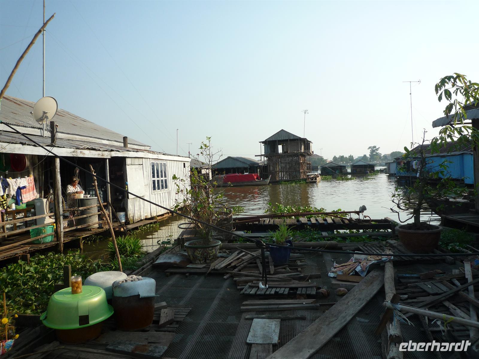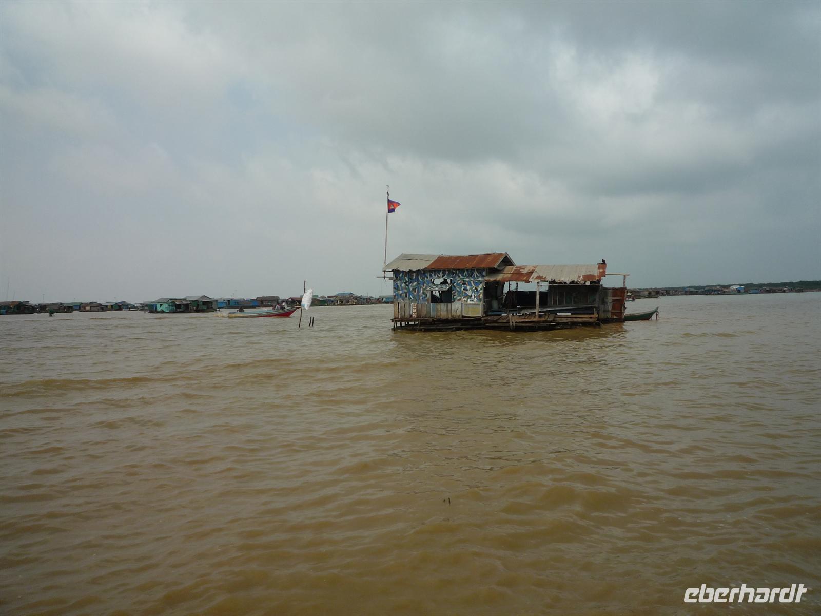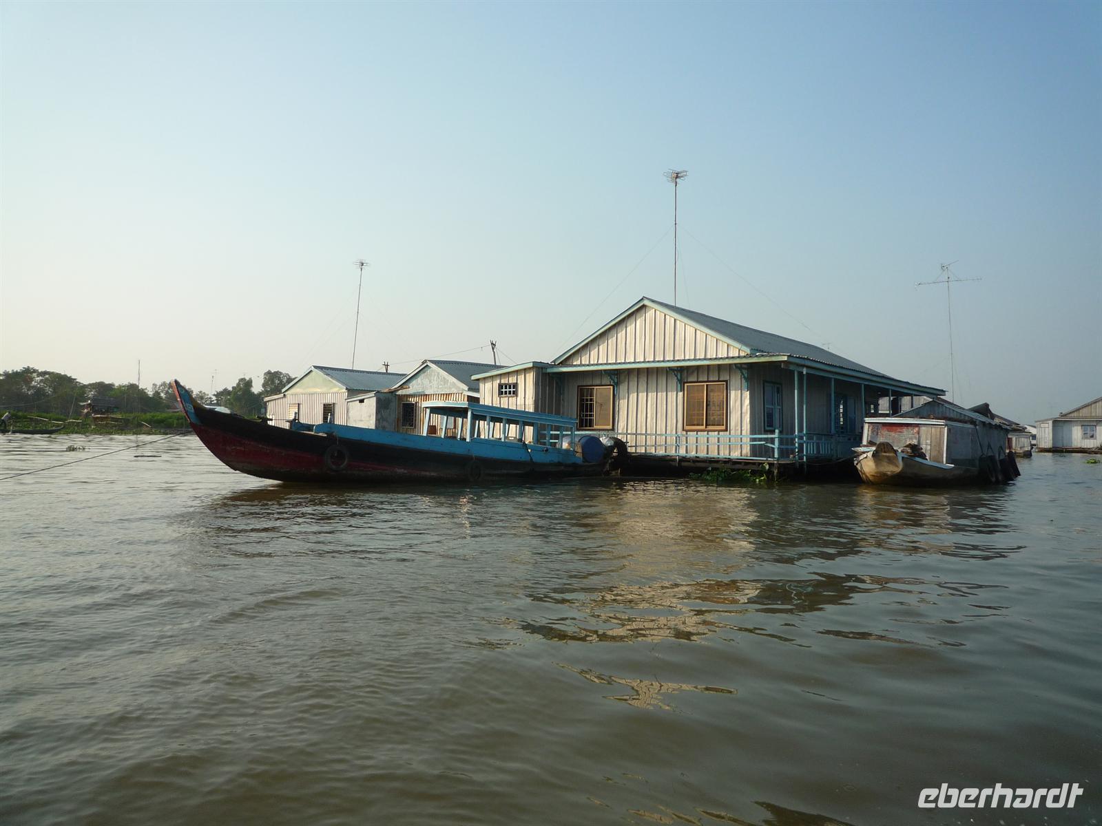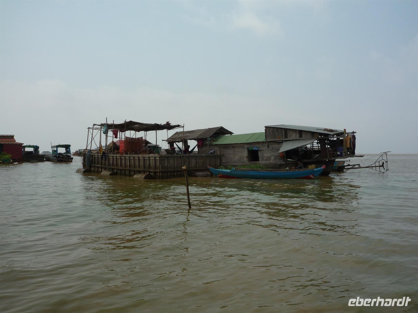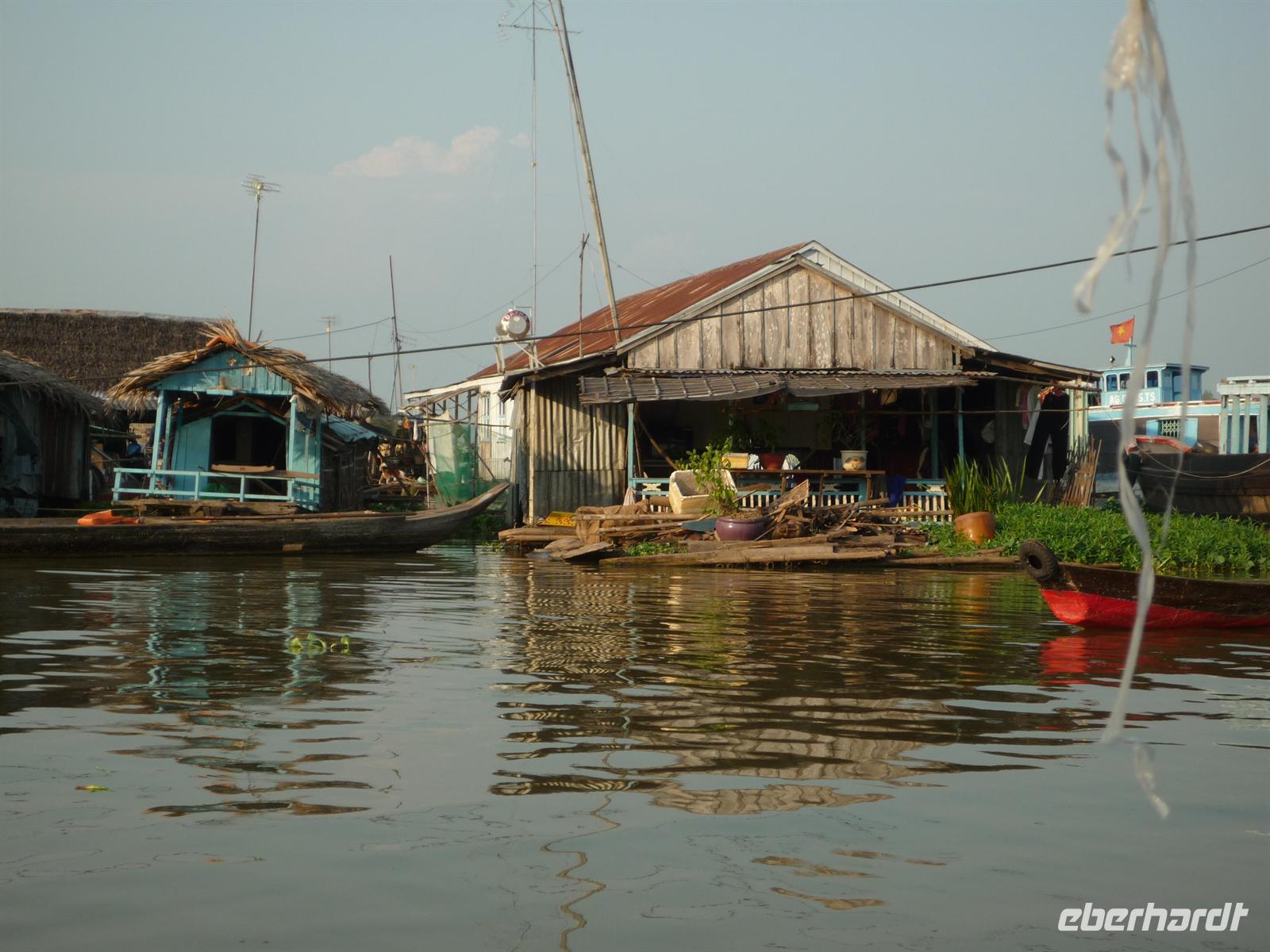 Am zeitigen Morgen fahren zwei unserer Gäste zum Eleantenreiten. Mit einem Tuk Tuk werden Sie zum Südtor von Angkor Thom gebracht und auf dem Elefanten geht es dann weiter bis zum Bayon Tempel. Um 9 Uhr treffen wir uns dann alle wieder am Hotel und machen noch einen Ausflug zum Tonle Sap-See. Auf dem Weg dahin laufen wir noch durch ein Dorf und haben die Gelegenheit durch ein buddhistisches Kloster zu gehen. Wir können auch für einige Minuten den Vorbereitungen für eine Einäscherung beiwohnen. Im Kloster werden alle Konfessionen eingeäschert, egal ob Christ, Buddhist oder Hindi. Mit einem Boot fahren wir dann auf dem Tonle Sap bis zum schwimmenden Dorf. Auch hier spielt sich das gesamte Leben auf dem Wasser ab. Der Tonle Sap See fungiert als Wassersammelbecken für den Mekong, in der Regenzeit fließt das Wasser aus dem Mekong in den Tonle Sap und seine Fläche dehnt sich auf 10000 km² aus. In der Trockenzeit lehrt sich der See wieder und verkleinert seine Oberfläche auf 2500 km². Entsprechend verändert sich auch die Wasserhöhe und schwankt von einem bis 10 Meter. Ohne den See wäre das Leben in Kambodscha so nicht möglich. Auch der Fischreichtum ist beeindruckend, 500 Arten leben im See, davon sind 100 kommerziell verwertbar. Fisch ist eines der wichtigsten Nahrungsmittel in Kambodscha. Ein Stopp an einem schwimmenden Souvenirgeschäft ist nicht sehr beeindruckend. Immer gibt es hier auch kleine Kinder, welche betteln oder sich für einen Dollar mit einer Schlange fotografieren lassen wollen. Ob sie wirklich sehr arm sind oder nur vor geschickt werden ist nicht nachzuvollziehen. Auf der Rückfahrt zum Hotel gehen wir noch zum Mittagessen.