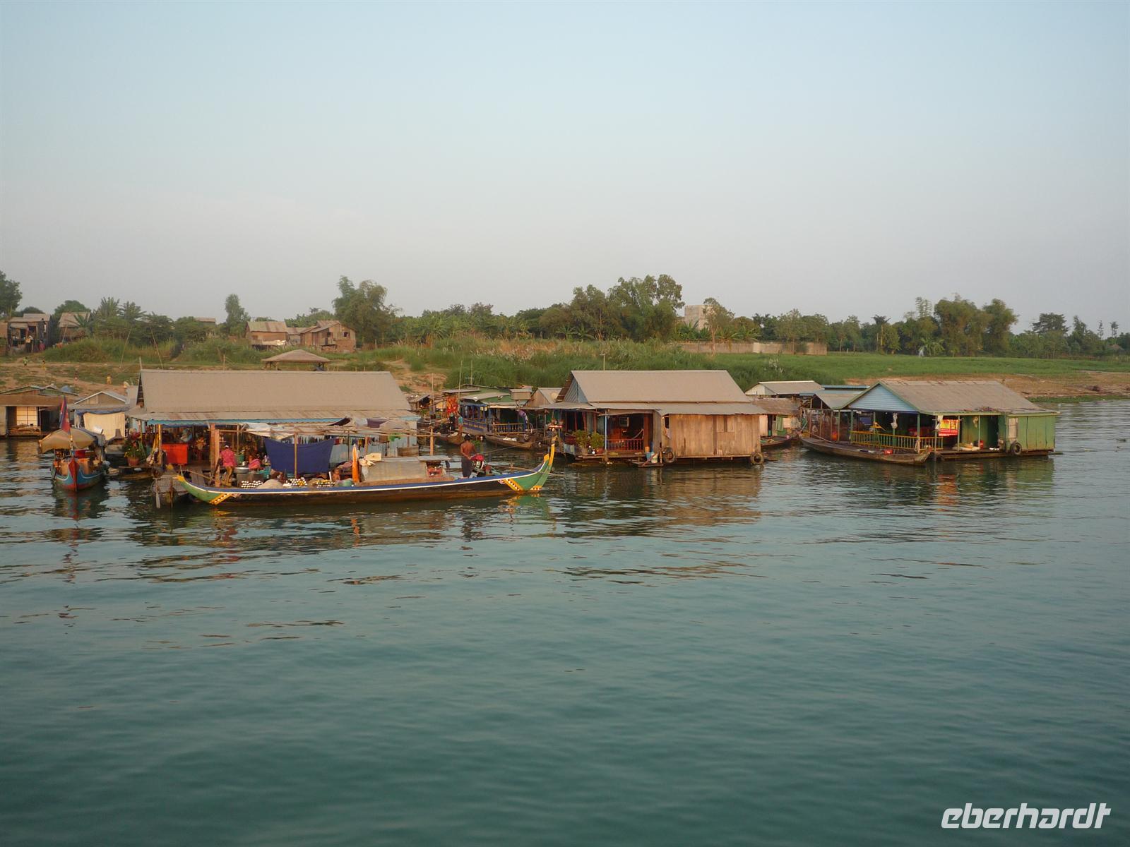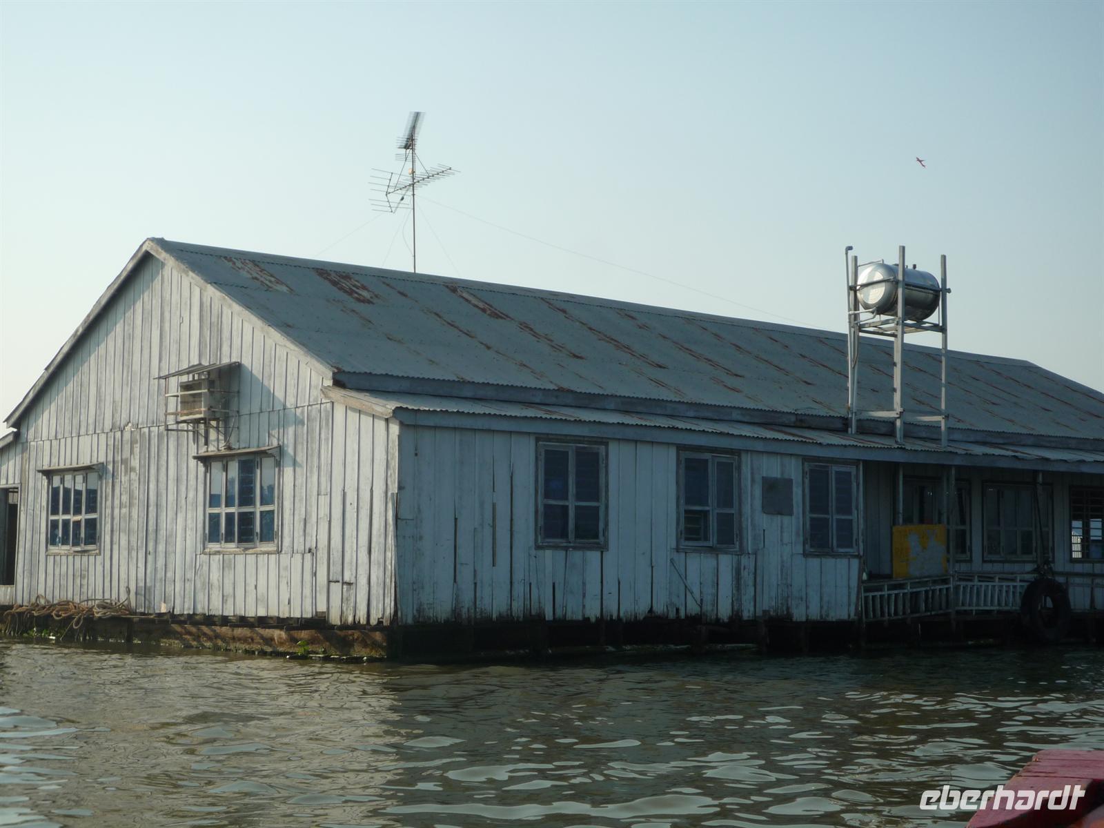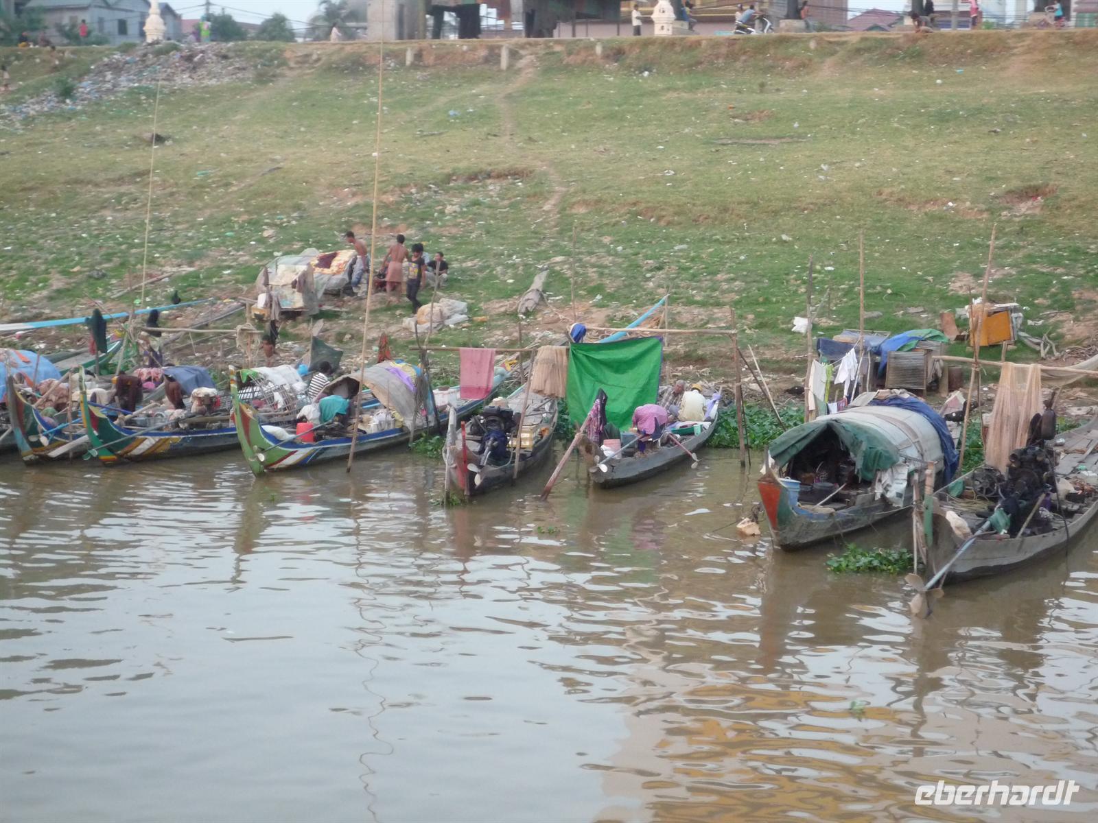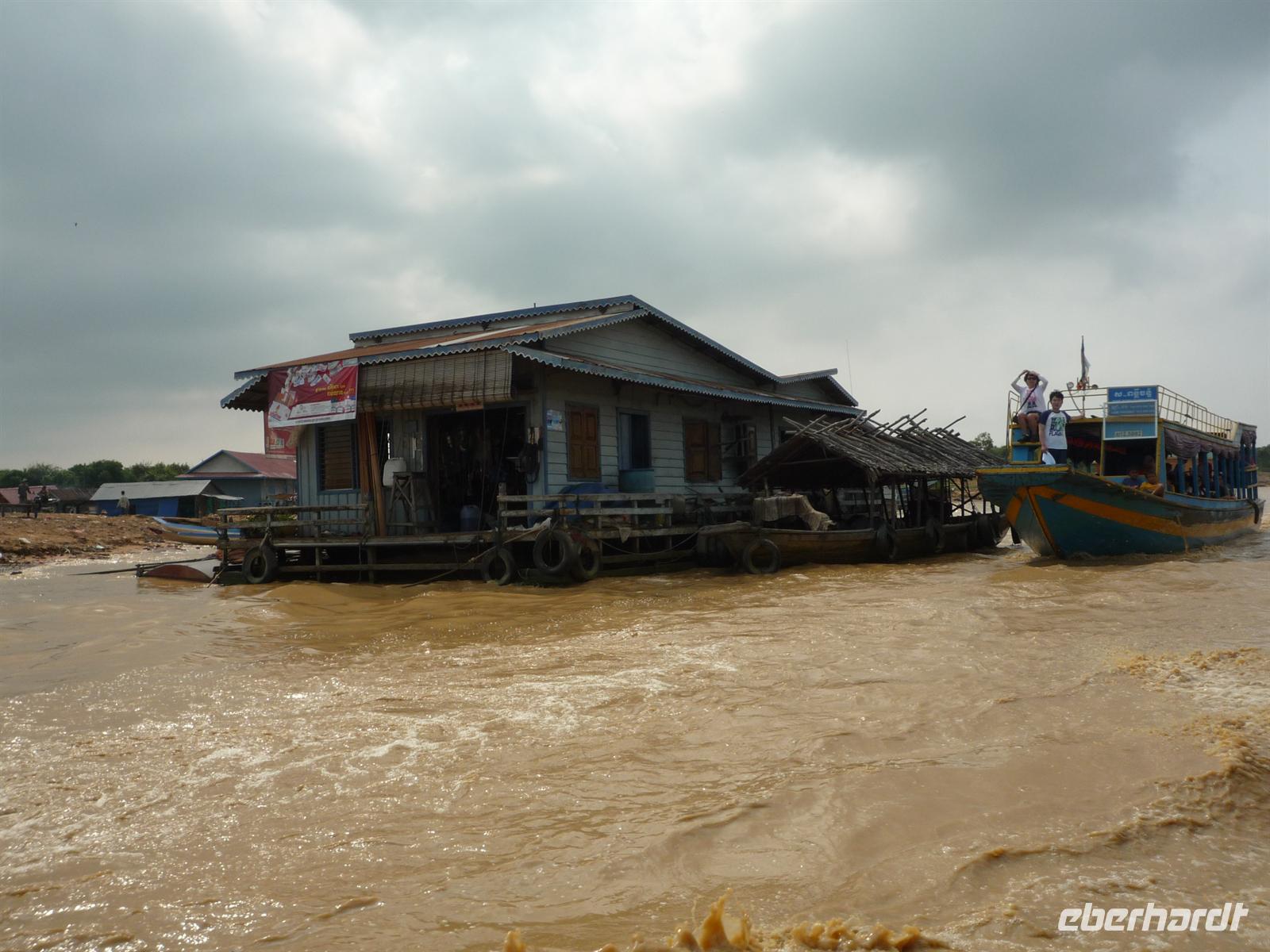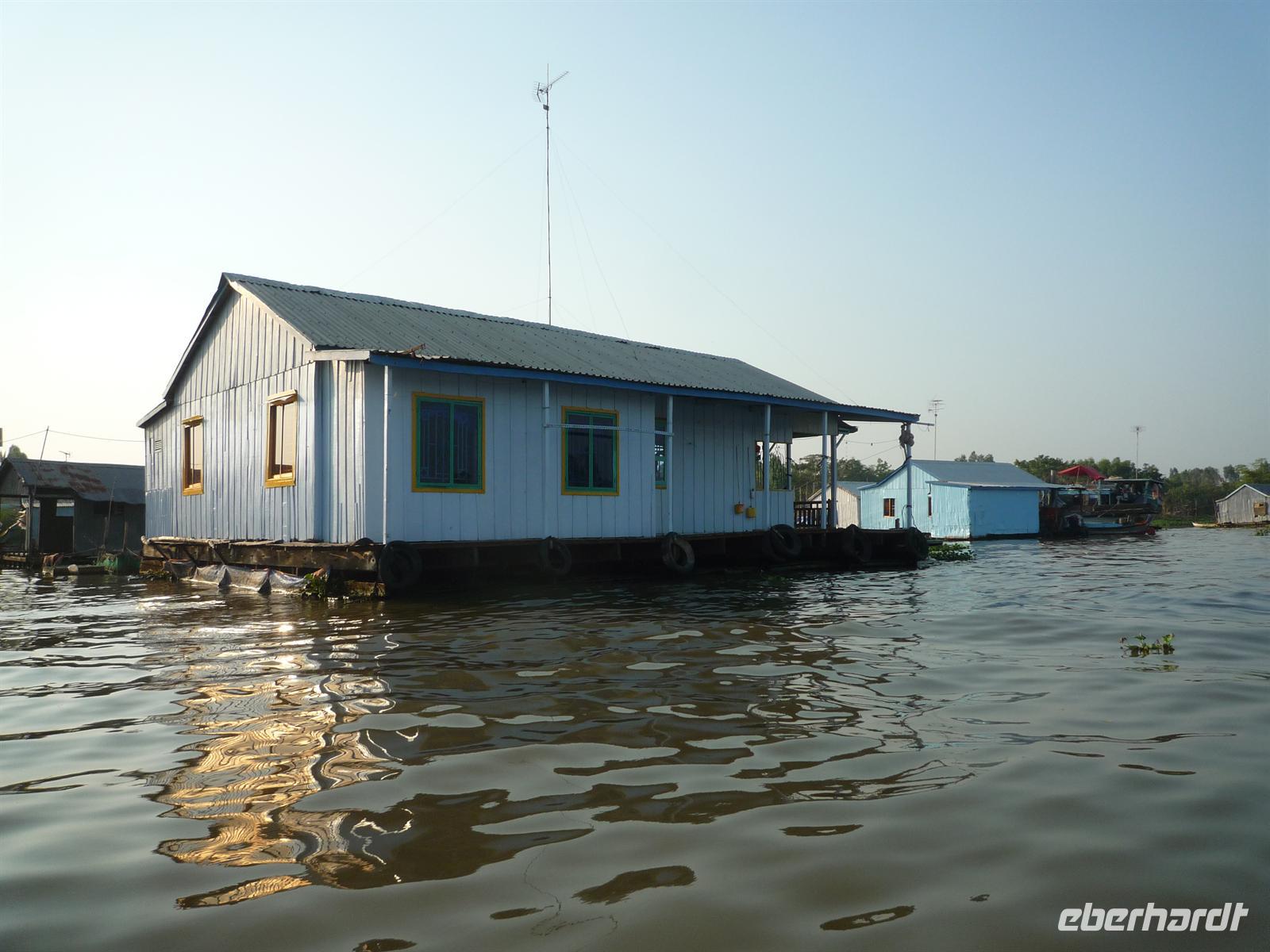 Am zeitigen Morgen fahren zwei unserer Gäste zum Eleantenreiten. Mit einem Tuk Tuk werden Sie zum Südtor von Angkor Thom gebracht und auf dem Elefanten geht es dann weiter bis zum Bayon Tempel. Um 9 Uhr treffen wir uns dann alle wieder am Hotel und machen noch einen Ausflug zum Tonle Sap-See. Auf dem Weg dahin laufen wir noch durch ein Dorf und haben die Gelegenheit durch ein buddhistisches Kloster zu gehen. Wir können auch für einige Minuten den Vorbereitungen für eine Einäscherung beiwohnen. Im Kloster werden alle Konfessionen eingeäschert, egal ob Christ, Buddhist oder Hindi. Mit einem Boot fahren wir dann auf dem Tonle Sap bis zum schwimmenden Dorf. Auch hier spielt sich das gesamte Leben auf dem Wasser ab. Der Tonle Sap See fungiert als Wassersammelbecken für den Mekong, in der Regenzeit fließt das Wasser aus dem Mekong in den Tonle Sap und seine Fläche dehnt sich auf 10000 km² aus. In der Trockenzeit lehrt sich der See wieder und verkleinert seine Oberfläche auf 2500 km². Entsprechend verändert sich auch die Wasserhöhe und schwankt von einem bis 10 Meter. Ohne den See wäre das Leben in Kambodscha so nicht möglich. Auch der Fischreichtum ist beeindruckend, 500 Arten leben im See, davon sind 100 kommerziell verwertbar. Fisch ist eines der wichtigsten Nahrungsmittel in Kambodscha. Ein Stopp an einem schwimmenden Souvenirgeschäft ist nicht sehr beeindruckend. Immer gibt es hier auch kleine Kinder, welche betteln oder sich für einen Dollar mit einer Schlange fotografieren lassen wollen. Ob sie wirklich sehr arm sind oder nur vor geschickt werden ist nicht nachzuvollziehen. Auf der Rückfahrt zum Hotel gehen wir noch zum Mittagessen.
