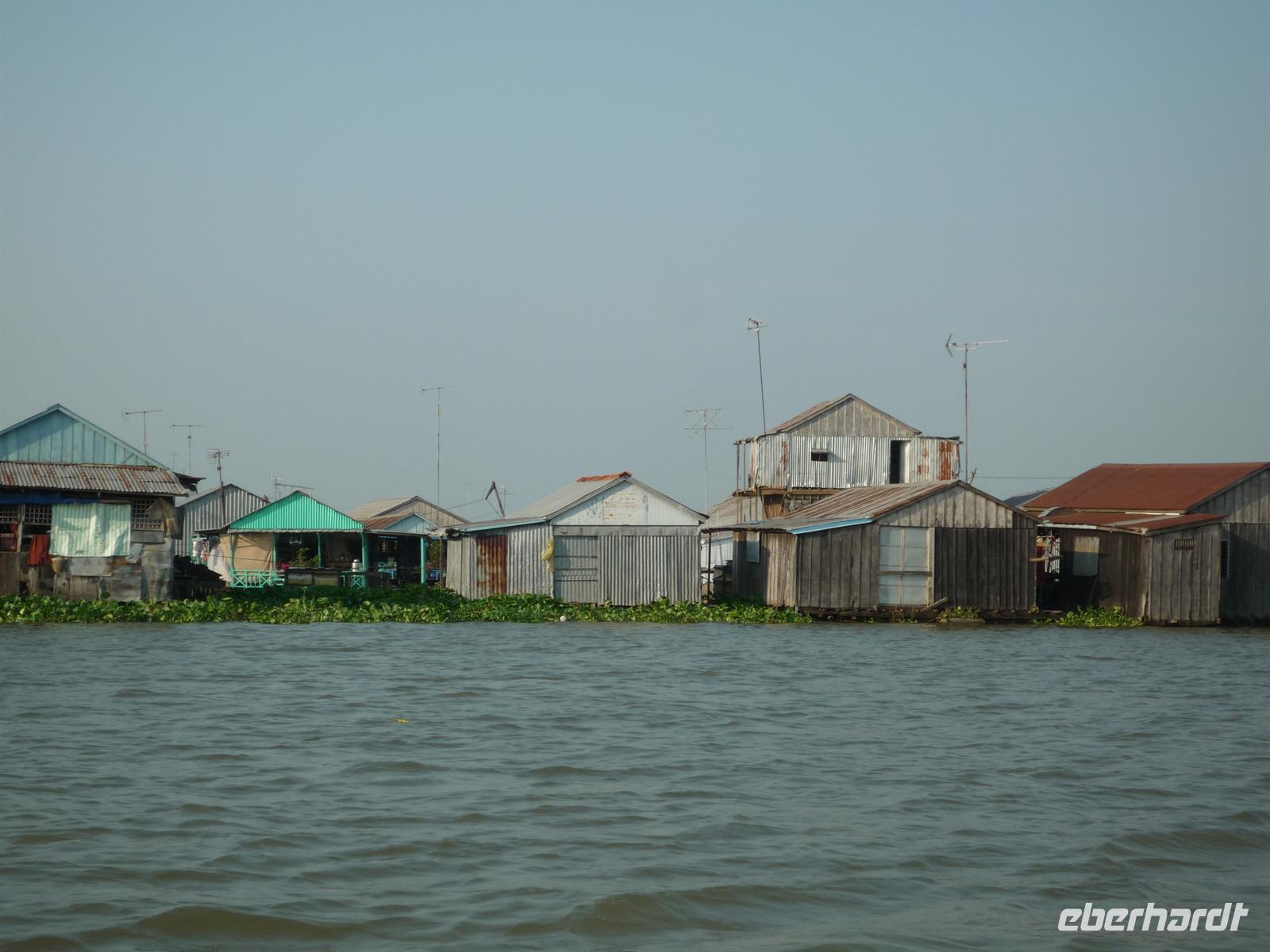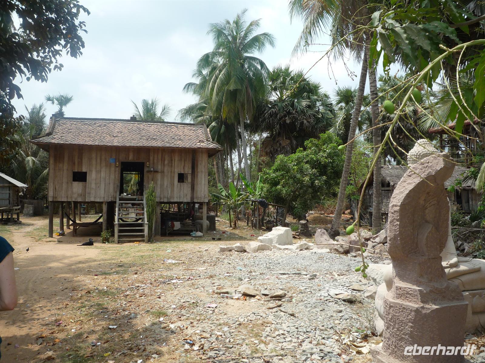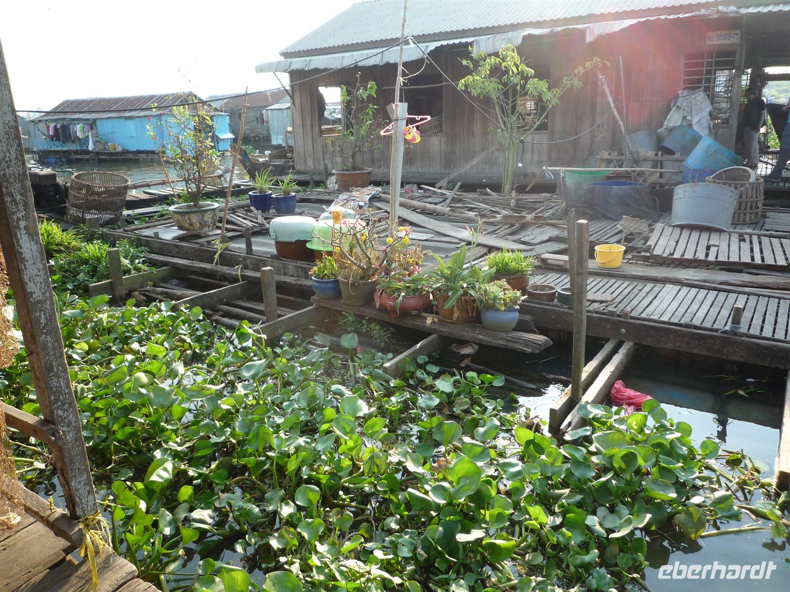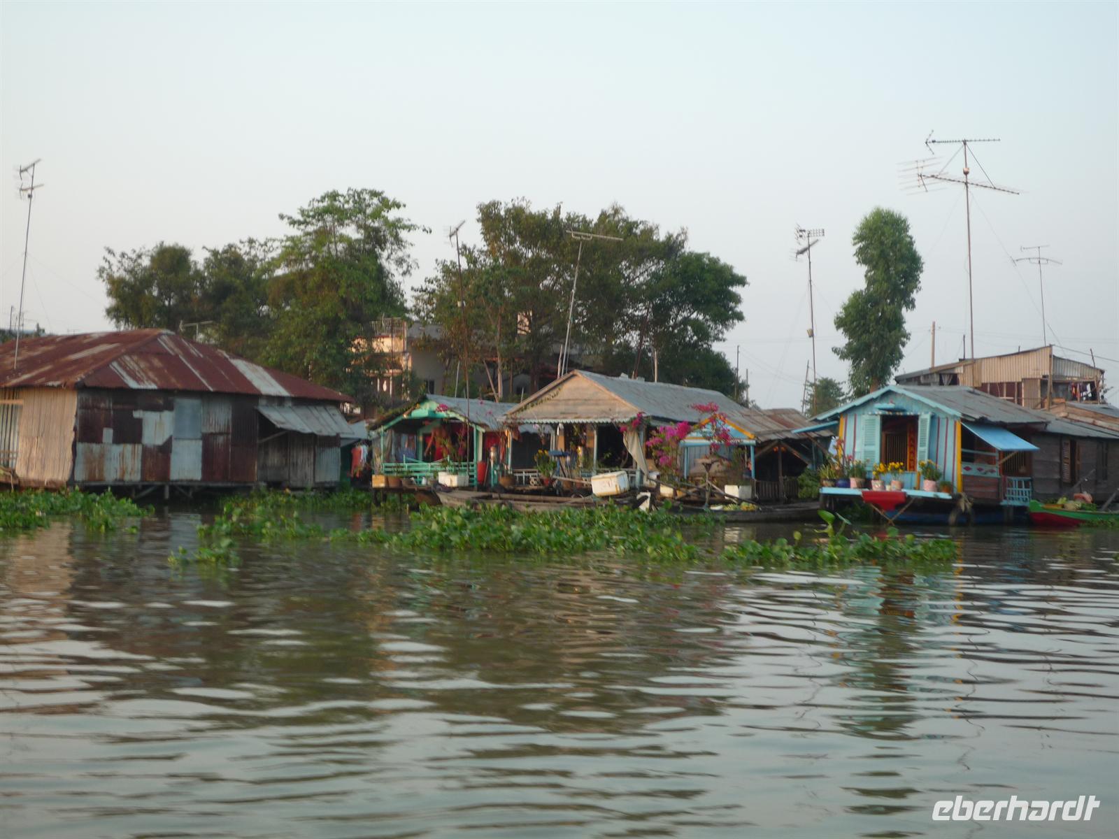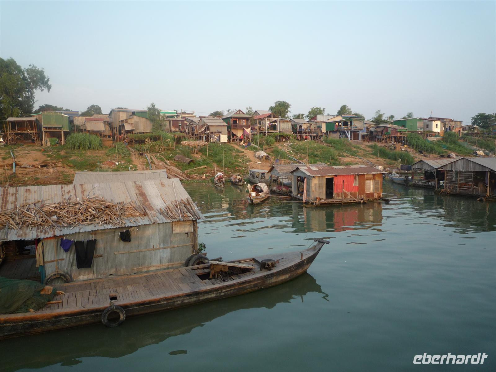 Am zeitigen Morgen fahren zwei unserer Gäste zum Eleantenreiten. Mit einem Tuk Tuk werden Sie zum Südtor von Angkor Thom gebracht und auf dem Elefanten geht es dann weiter bis zum Bayon Tempel. Um 9 Uhr treffen wir uns dann alle wieder am Hotel und machen noch einen Ausflug zum Tonle Sap-See. Auf dem Weg dahin laufen wir noch durch ein Dorf und haben die Gelegenheit durch ein buddhistisches Kloster zu gehen. Wir können auch für einige Minuten den Vorbereitungen für eine Einäscherung beiwohnen. Im Kloster werden alle Konfessionen eingeäschert, egal ob Christ, Buddhist oder Hindi. Mit einem Boot fahren wir dann auf dem Tonle Sap bis zum schwimmenden Dorf. Auch hier spielt sich das gesamte Leben auf dem Wasser ab. Der Tonle Sap See fungiert als Wassersammelbecken für den Mekong, in der Regenzeit fließt das Wasser aus dem Mekong in den Tonle Sap und seine Fläche dehnt sich auf 10000 km² aus. In der Trockenzeit lehrt sich der See wieder und verkleinert seine Oberfläche auf 2500 km². Entsprechend verändert sich auch die Wasserhöhe und schwankt von einem bis 10 Meter. Ohne den See wäre das Leben in Kambodscha so nicht möglich. Auch der Fischreichtum ist beeindruckend, 500 Arten leben im See, davon sind 100 kommerziell verwertbar. Fisch ist eines der wichtigsten Nahrungsmittel in Kambodscha. Ein Stopp an einem schwimmenden Souvenirgeschäft ist nicht sehr beeindruckend. Immer gibt es hier auch kleine Kinder, welche betteln oder sich für einen Dollar mit einer Schlange fotografieren lassen wollen. Ob sie wirklich sehr arm sind oder nur vor geschickt werden ist nicht nachzuvollziehen. Auf der Rückfahrt zum Hotel gehen wir noch zum Mittagessen.