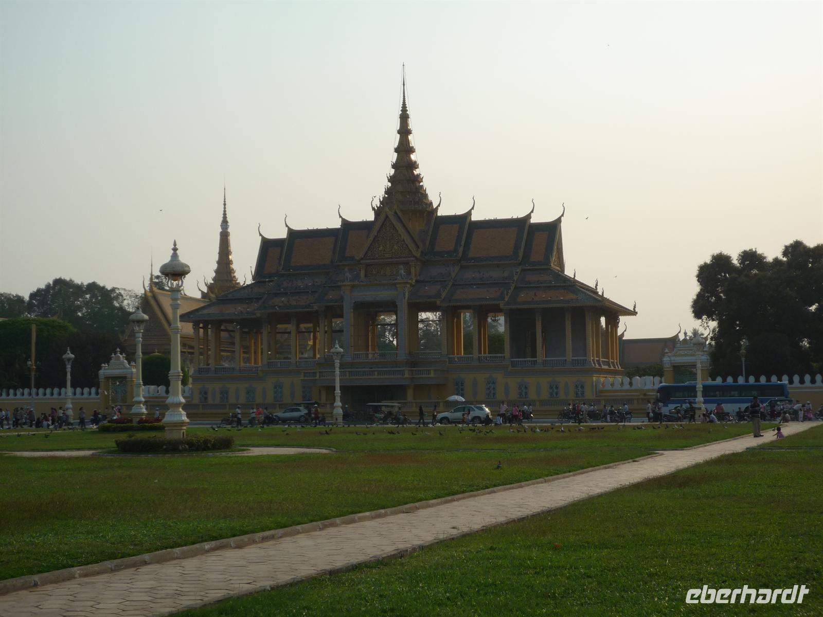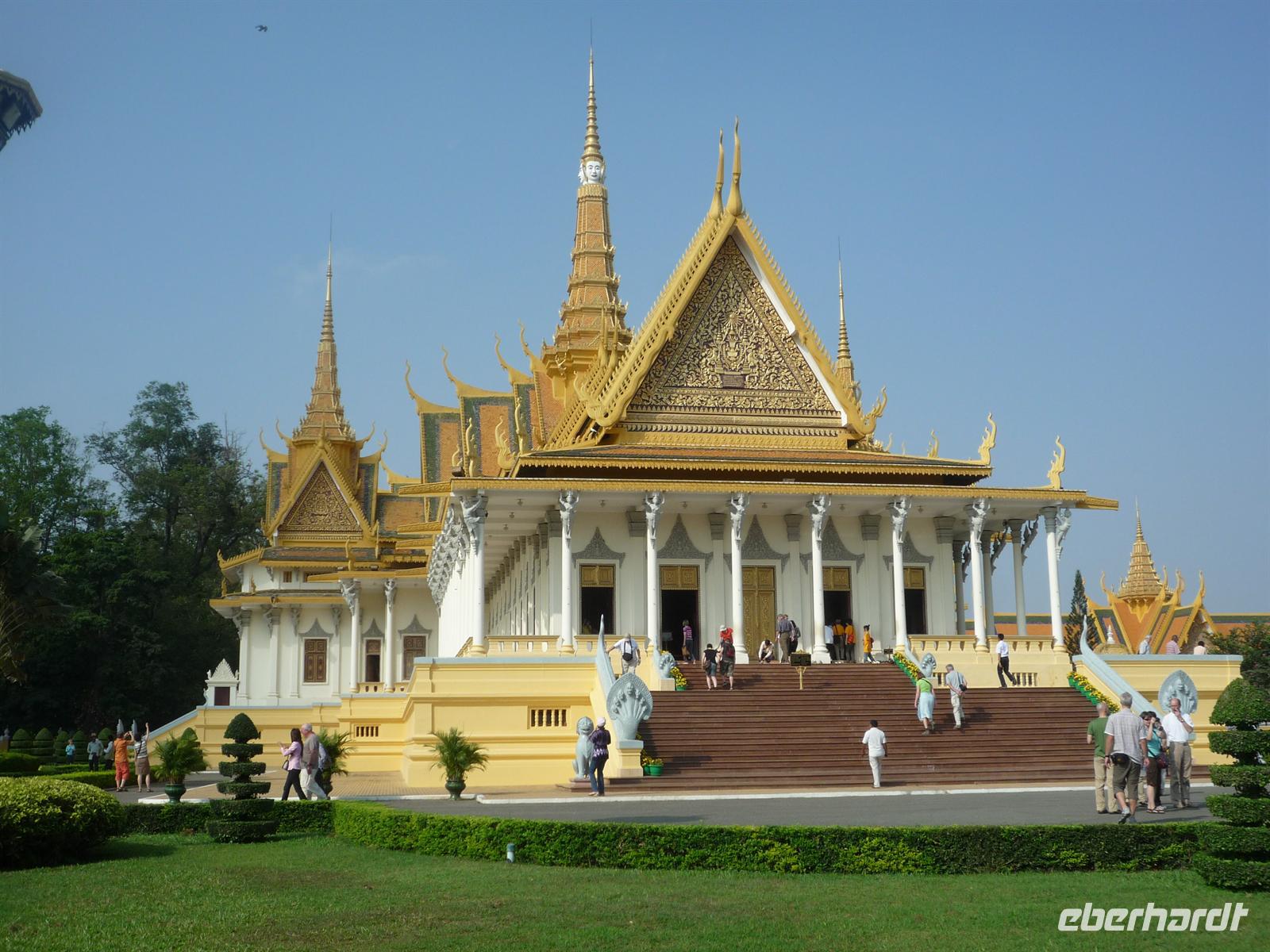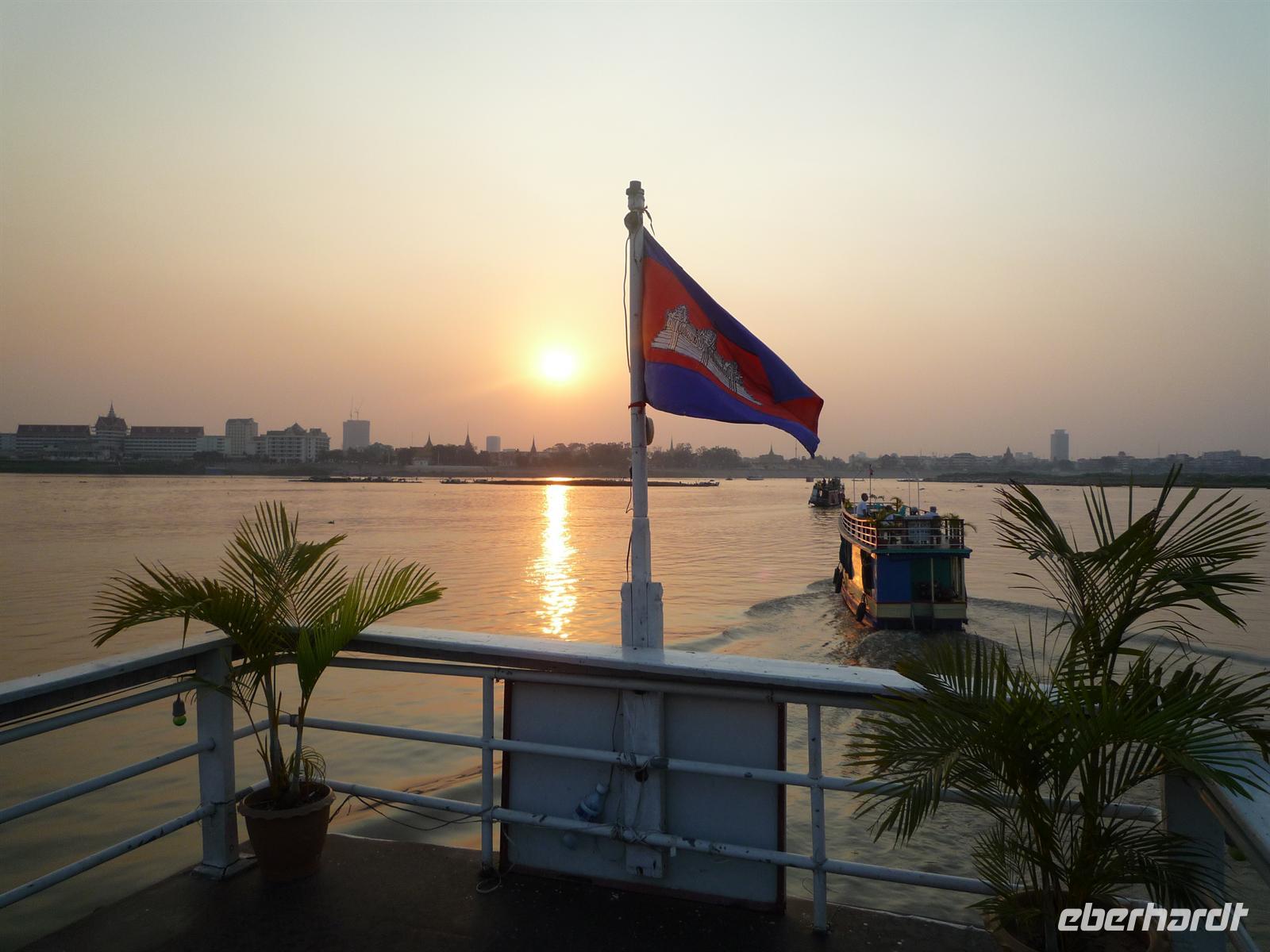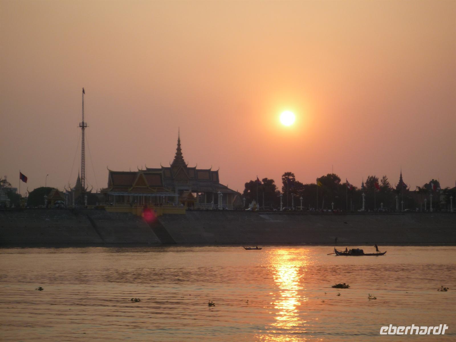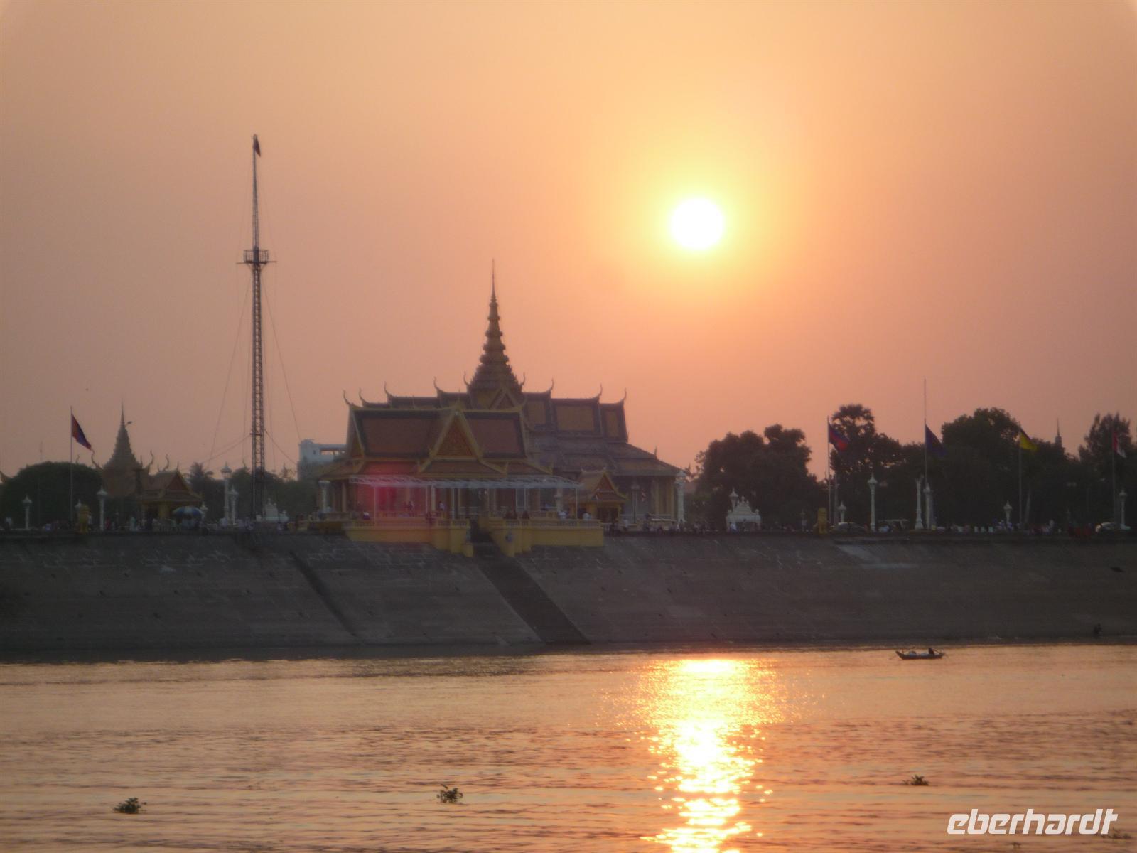In Phnom Penh haben wir drei Besichtigungspunkte auf dem Programm. Zuerst fahren wir zum Königspalast. Die Palastanlage existiert seit 1886 an dieser Stelle, wurde zuerst aus Holz und später aus Stein gebaut. Das der königliche Palast an dieser Stelle gebaut wurde kommt nicht von ungefähr, er liegt genau an der Stelle wo der Tonle Sap-Fluss in den Mekong mündet. Der Palast ist glanzvoll mit viel Prunk ausgestattet, was im Gegensatz zur Armut im Land steht. Ein Gruppenfoto vor dem Palast darf natürlich nicht fehlen. Unser Rundgang führt uns auch zur Silberpagode. Auf dem Fußboden liegen 5329 in Frankreich gefertigte Bodenfließen aus Silber, zu einem Gewicht von je 1,125 kg, also insgesamt knapp 6000 kg Silber. Einen Teil davon kann man sehen, aber der größte Teil ist, zum Schutz, mit Teppichen ausgelegt. Im Inneren ist auf einem Altar eine grüne Buddhafigur zu sehen und davor steht in einer Glasvitrine eine Buddhafigur aus Purem Gold mit zahlreichen Edelsteinen verziert. Nicht weit entfernt vom Palast befindet sich das Nationalmuseum, ein markantes braunrotes Gebäude im traditionellen Khmerstil. Ausgestellt werden hier ca. 5000 Exponate, das Museum ist weltweit führend in der Sammlung von Khmerkunst. Die Khmer sind der Volksstamm der mit 90% in diesem Land die Stammbevölkerung stellt. Wir bestaunen die Ausstellungstücke aus den verschiedenen Epochen, vor allem sind es hinduistische Götter und Buddhafiguren. Abschließend besuchen wir noch das Hauptheiligtum der Stadt, das Wat Phnom. Ein kleiner Schrein erinnert an die Gründerin der Pagode, Frau Penh. Der Nachmittag steht wieder zur freien Verfügung. Einige Gäste und ich besuchen das Tuol-Sleng-Genozied-Museums an. Hier bekommen wir einen kleinen Eindruck vom schrecklichsten Kapitel kambodschanischer Geschichte. In diesem ehemaligen Gefängnis wurde zwischen 1976 und 1979 über 17000 Gefangene gefoltert und gedemütigt und anschließend zur Hinrichtung auf die Killing Fields gebracht. Schweigend verlassen wir das ehemalige Gefängnis, immer noch nicht begreifend, was in den Menschen vorgegangen sein muss, die diesen Völkermord zu verantworten haben. Wir fahren natürlich mit dem typischen Fortbewegungsmittel in Kambodscha, dem TukTuk, einer Rikscha mit Moped. Das sollte man in Kambodscha genutzt haben, denn es ist eine bequeme und doch spannende Art die Stadt zu erkunden. Anschließend treffen wir uns wieder und unternehmen eine schöne Bootsfahrt auf dem Mekong. Wir sehen das Leben am und vom Mekong, denn auch hier gibt es schwimmende Dörfer. Zum Abschluss sehen wir den roten Sonnenball hinter dem Königspalast untergehen - der schönste Sonnenuntergang der Reise!