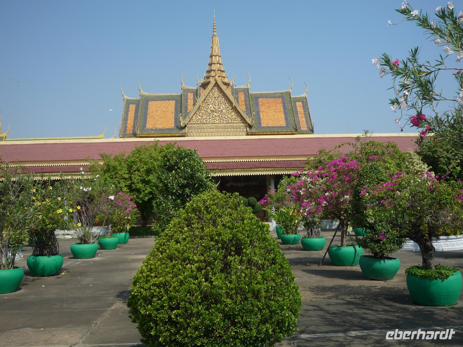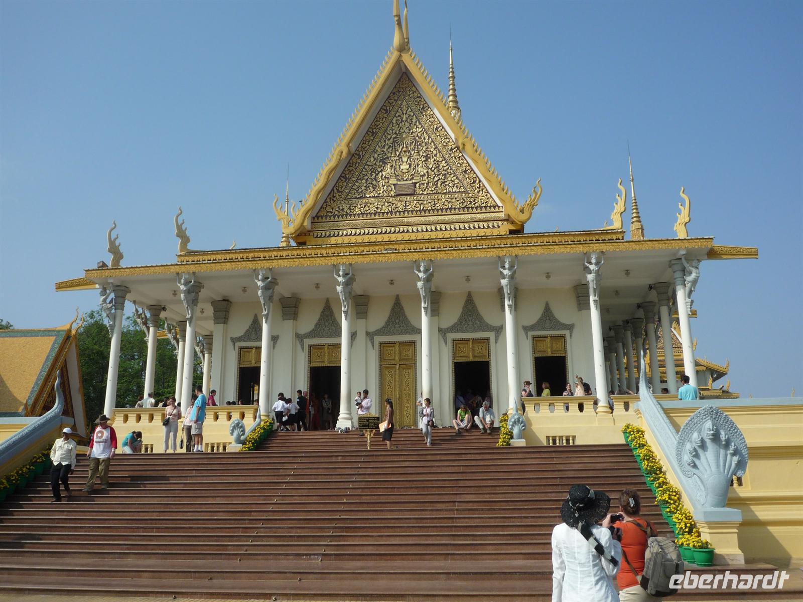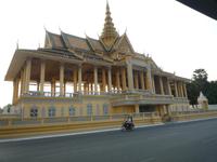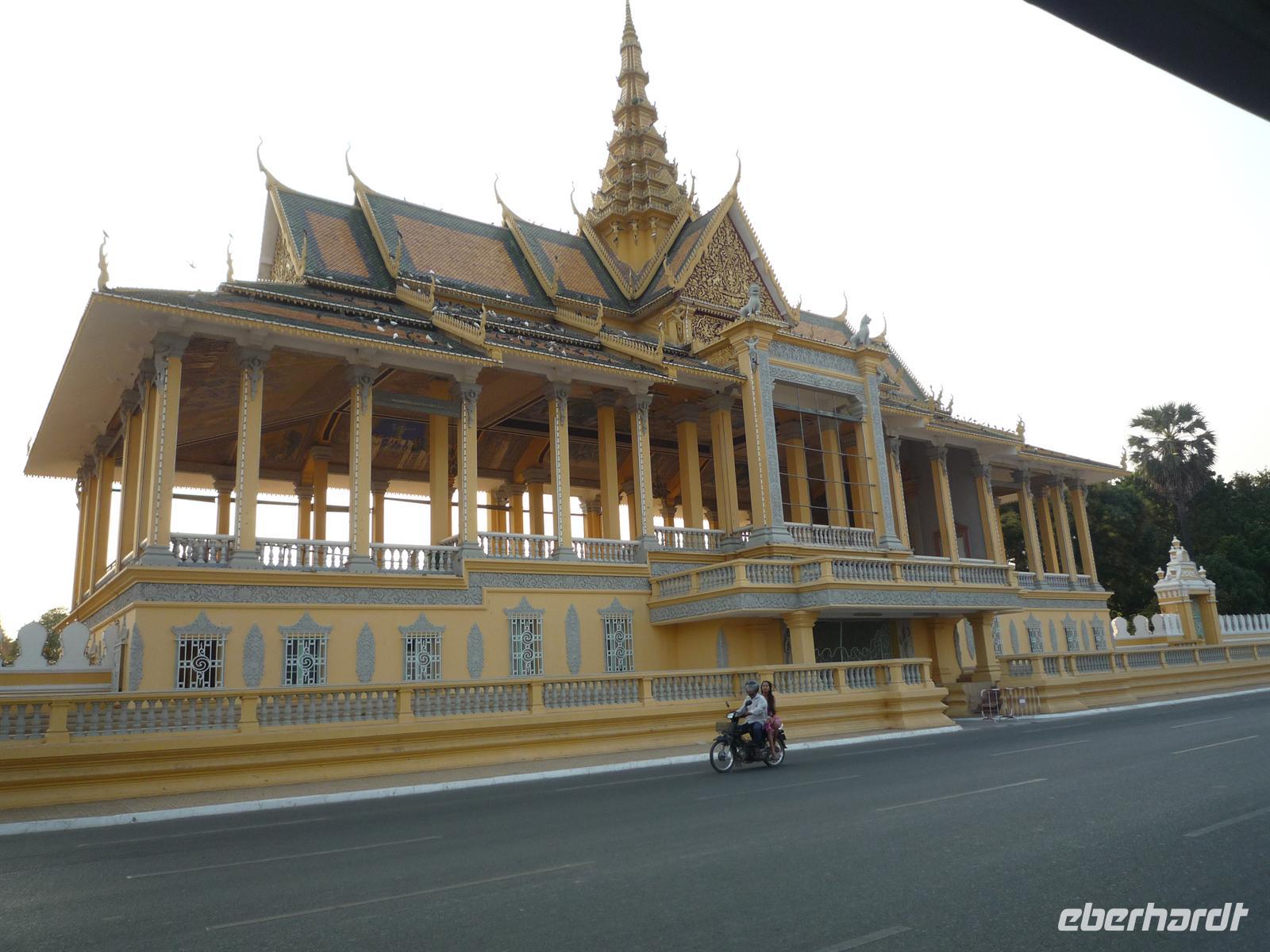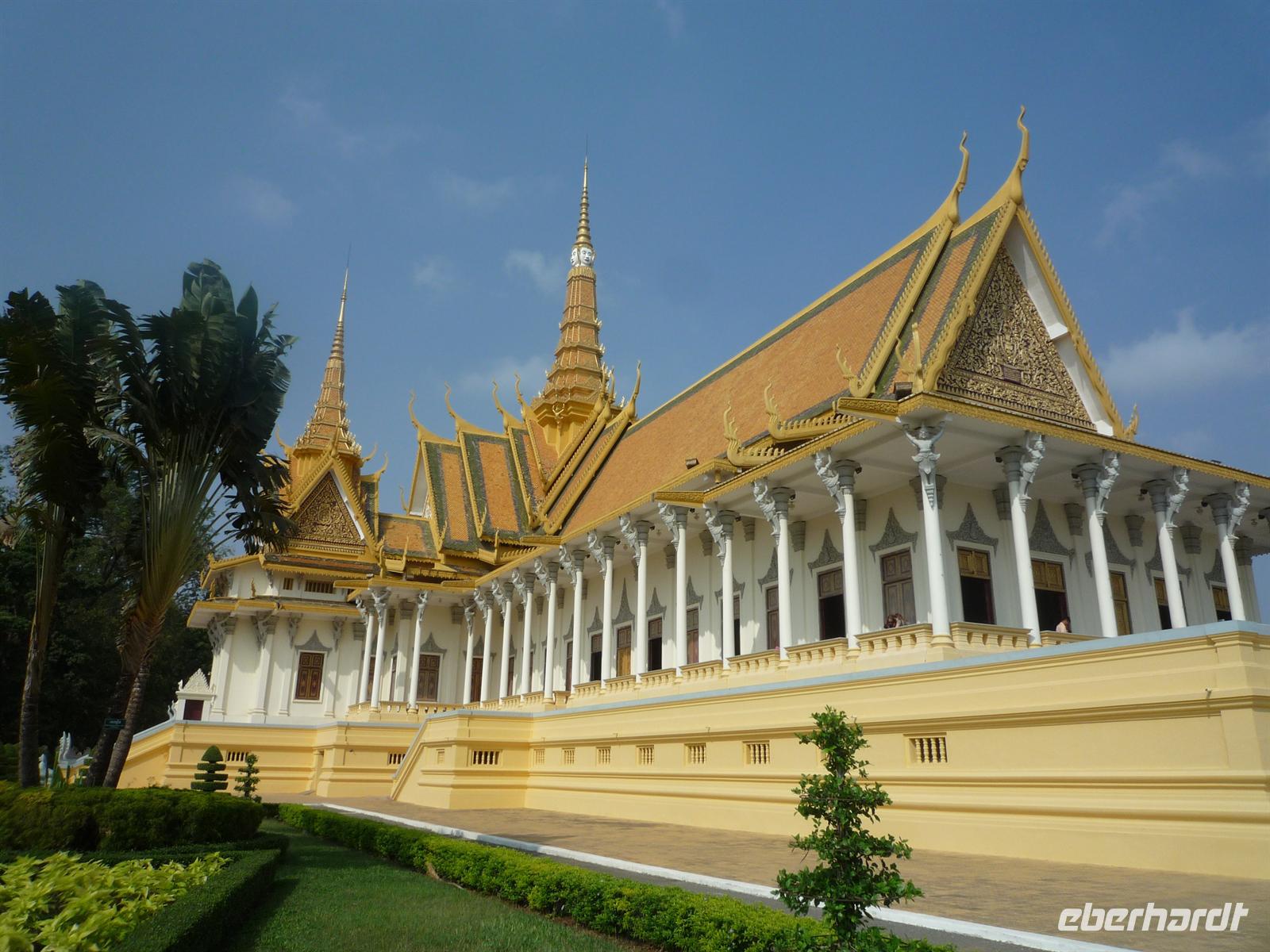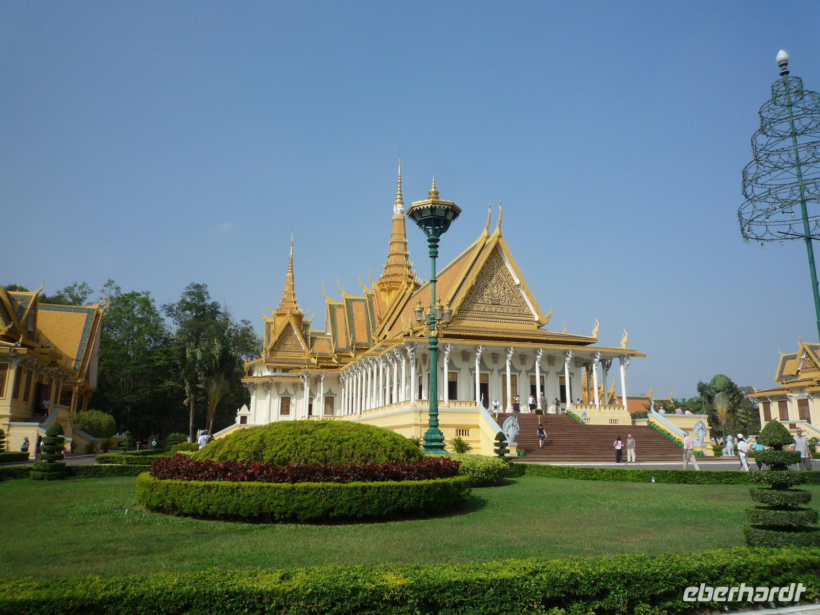 In Phnom Penh haben wir drei Besichtigungspunkte auf dem Programm. Zuerst fahren wir zum Königspalast. Die Palastanlage existiert seit 1886 an dieser Stelle, wurde zuerst aus Holz und später aus Stein gebaut. Das der königliche Palast an dieser Stelle gebaut wurde kommt nicht von ungefähr, er liegt genau an der Stelle wo der Tonle Sap-Fluss in den Mekong mündet. Der Palast ist glanzvoll mit viel Prunk ausgestattet, was im Gegensatz zur Armut im Land steht. Ein Gruppenfoto vor dem Palast darf natürlich nicht fehlen. Unser Rundgang führt uns auch zur Silberpagode. Auf dem Fußboden liegen 5329 in Frankreich gefertigte Bodenfließen aus Silber, zu einem Gewicht von je 1,125 kg, also insgesamt knapp 6000 kg Silber. Einen Teil davon kann man sehen, aber der größte Teil ist, zum Schutz, mit Teppichen ausgelegt. Im Inneren ist auf einem Altar eine grüne Buddhafigur zu sehen und davor steht in einer Glasvitrine eine Buddhafigur aus Purem Gold mit zahlreichen Edelsteinen verziert. Nicht weit entfernt vom Palast befindet sich das Nationalmuseum, ein markantes braunrotes Gebäude im traditionellen Khmerstil. Ausgestellt werden hier ca. 5000 Exponate, das Museum ist weltweit führend in der Sammlung von Khmerkunst. Die Khmer sind der Volksstamm der mit 90% in diesem Land die Stammbevölkerung stellt. Wir bestaunen die Ausstellungstücke aus den verschiedenen Epochen, vor allem sind es hinduistische Götter und Buddhafiguren. Abschließend besuchen wir noch das Hauptheiligtum der Stadt, das Wat Phnom. Ein kleiner Schrein erinnert an die Gründerin der Pagode, Frau Penh. Der Nachmittag steht wieder zur freien Verfügung. Einige Gäste und ich besuchen das Tuol-Sleng-Genozied-Museums an. Hier bekommen wir einen kleinen Eindruck vom schrecklichsten Kapitel kambodschanischer Geschichte. In diesem ehemaligen Gefängnis wurde zwischen 1976 und 1979 über 17000 Gefangene gefoltert und gedemütigt und anschließend zur Hinrichtung auf die Killing Fields gebracht. Schweigend verlassen wir das ehemalige Gefängnis, immer noch nicht begreifend, was in den Menschen vorgegangen sein muss, die diesen Völkermord zu verantworten haben. Wir fahren natürlich mit dem typischen Fortbewegungsmittel in Kambodscha, dem TukTuk, einer Rikscha mit Moped. Das sollte man in Kambodscha genutzt haben, denn es ist eine bequeme und doch spannende Art die Stadt zu erkunden. Anschließend treffen wir uns wieder und unternehmen eine schöne Bootsfahrt auf dem Mekong. Wir sehen das Leben am und vom Mekong, denn auch hier gibt es schwimmende Dörfer. Zum Abschluss sehen wir den roten Sonnenball hinter dem Königspalast untergehen - der schönste Sonnenuntergang der Reise!