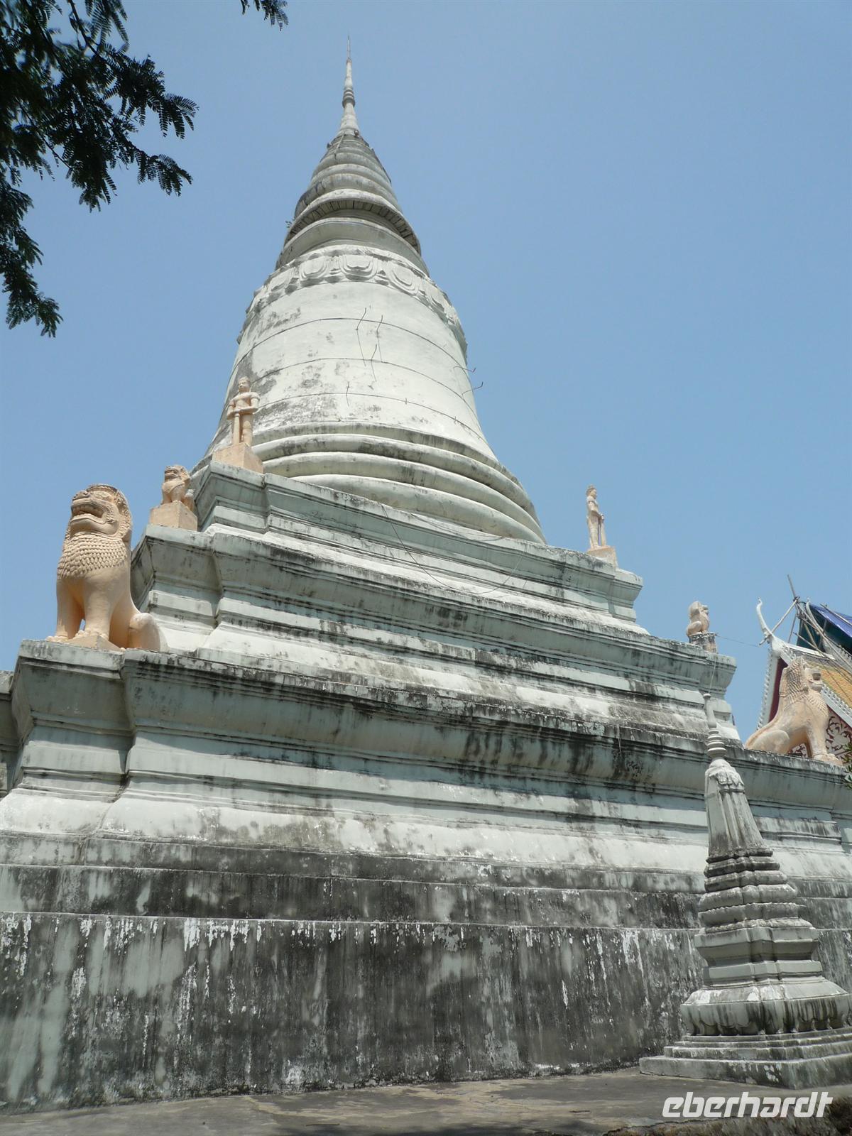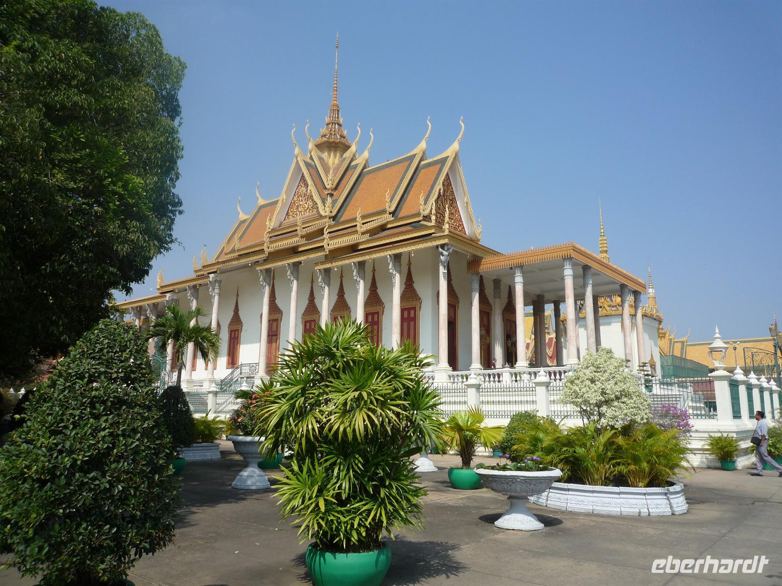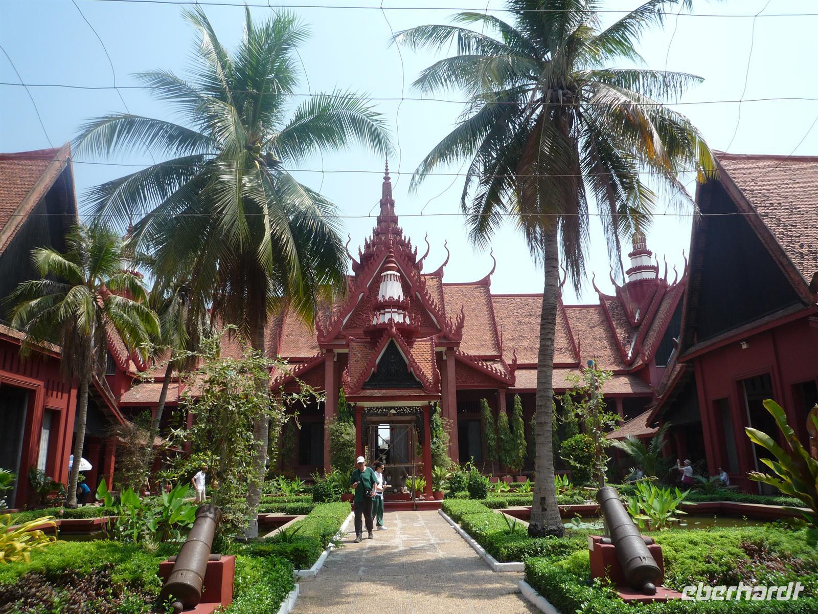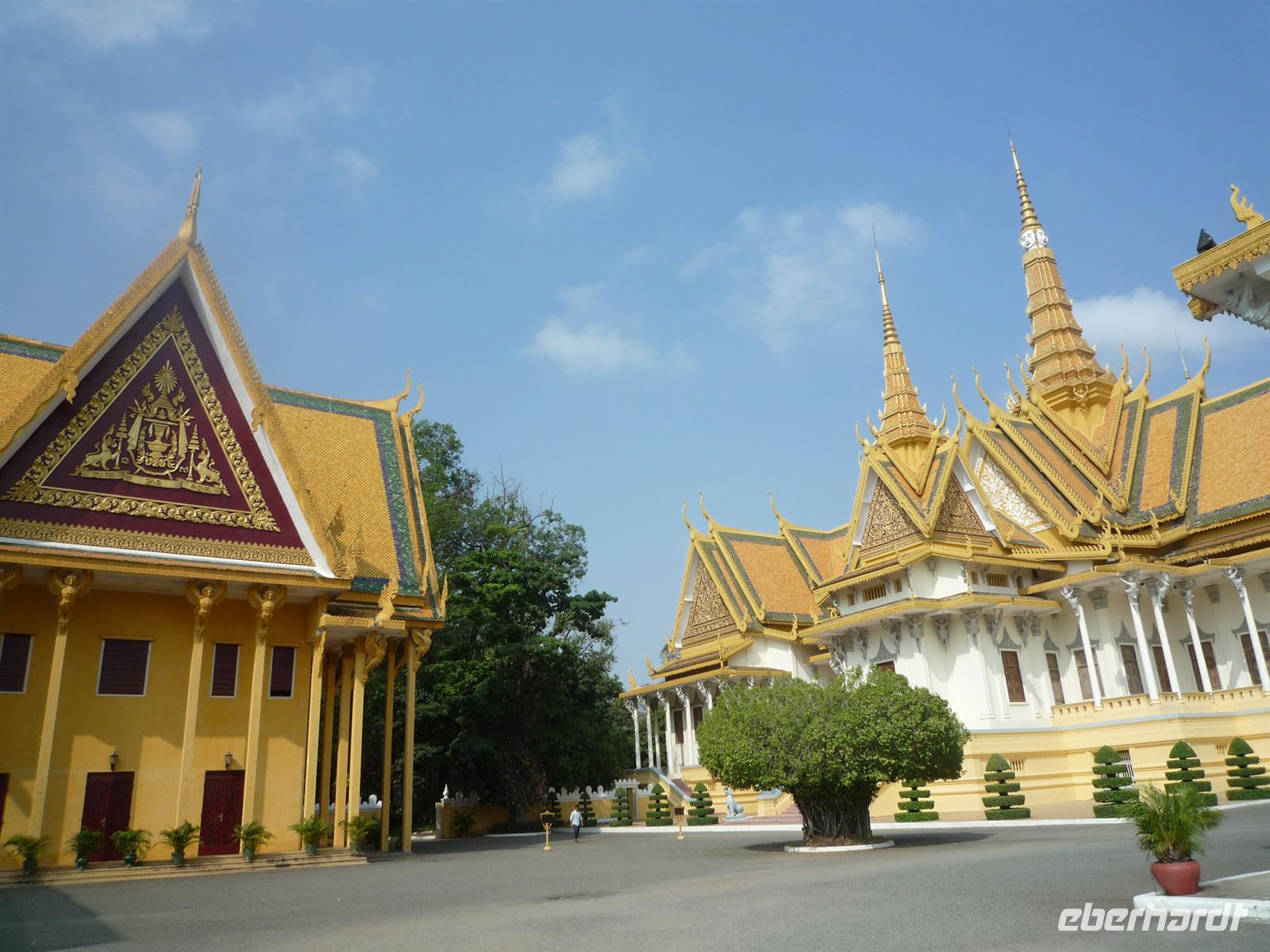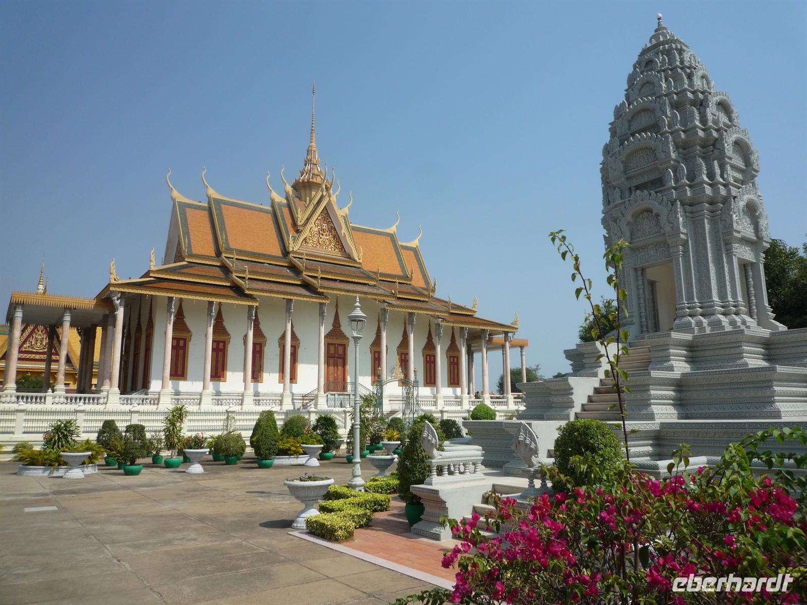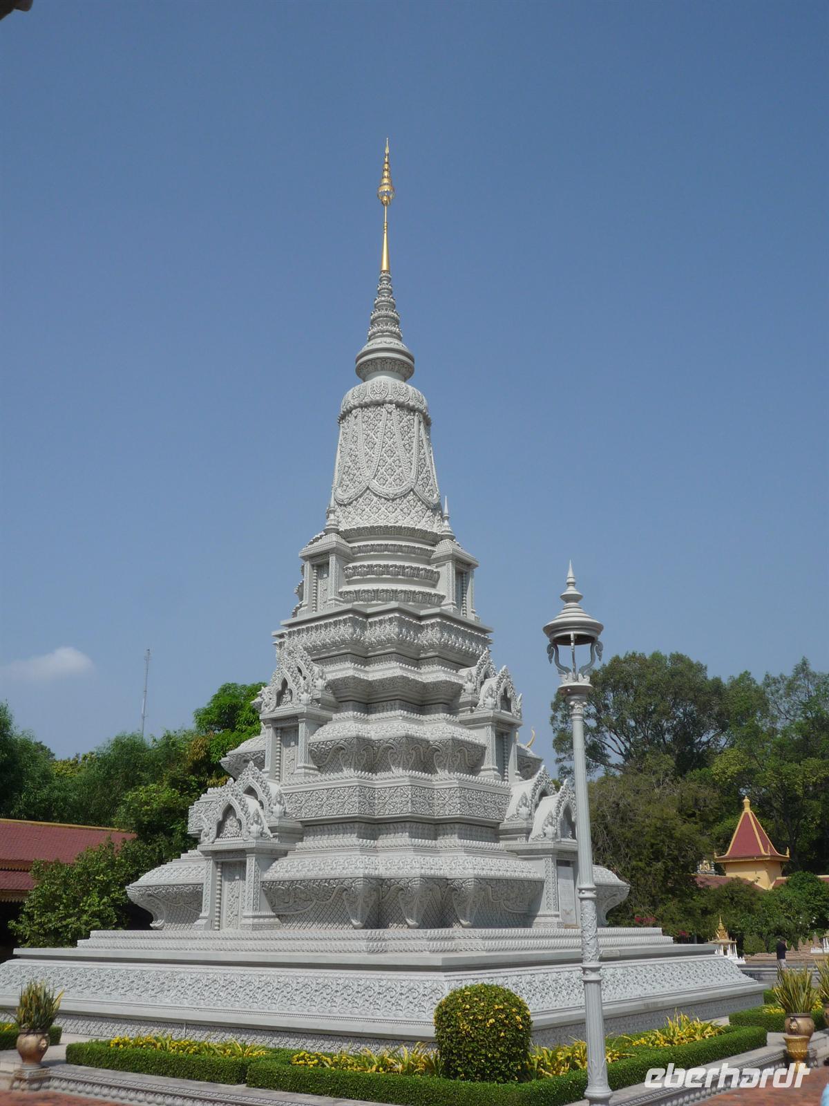 In Phnom Penh haben wir drei Besichtigungspunkte auf dem Programm. Zuerst fahren wir zum Königspalast. Die Palastanlage existiert seit 1886 an dieser Stelle, wurde zuerst aus Holz und später aus Stein gebaut. Das der königliche Palast an dieser Stelle gebaut wurde kommt nicht von ungefähr, er liegt genau an der Stelle wo der Tonle Sap-Fluss in den Mekong mündet. Der Palast ist glanzvoll mit viel Prunk ausgestattet, was im Gegensatz zur Armut im Land steht. Ein Gruppenfoto vor dem Palast darf natürlich nicht fehlen. Unser Rundgang führt uns auch zur Silberpagode. Auf dem Fußboden liegen 5329 in Frankreich gefertigte Bodenfließen aus Silber, zu einem Gewicht von je 1,125 kg, also insgesamt knapp 6000 kg Silber. Einen Teil davon kann man sehen, aber der größte Teil ist, zum Schutz, mit Teppichen ausgelegt. Im Inneren ist auf einem Altar eine grüne Buddhafigur zu sehen und davor steht in einer Glasvitrine eine Buddhafigur aus Purem Gold mit zahlreichen Edelsteinen verziert. Nicht weit entfernt vom Palast befindet sich das Nationalmuseum, ein markantes braunrotes Gebäude im traditionellen Khmerstil. Ausgestellt werden hier ca. 5000 Exponate, das Museum ist weltweit führend in der Sammlung von Khmerkunst. Die Khmer sind der Volksstamm der mit 90% in diesem Land die Stammbevölkerung stellt. Wir bestaunen die Ausstellungstücke aus den verschiedenen Epochen, vor allem sind es hinduistische Götter und Buddhafiguren. Abschließend besuchen wir noch das Hauptheiligtum der Stadt, das Wat Phnom. Ein kleiner Schrein erinnert an die Gründerin der Pagode, Frau Penh. Der Nachmittag steht wieder zur freien Verfügung. Einige Gäste und ich besuchen das Tuol-Sleng-Genozied-Museums an. Hier bekommen wir einen kleinen Eindruck vom schrecklichsten Kapitel kambodschanischer Geschichte. In diesem ehemaligen Gefängnis wurde zwischen 1976 und 1979 über 17000 Gefangene gefoltert und gedemütigt und anschließend zur Hinrichtung auf die Killing Fields gebracht. Schweigend verlassen wir das ehemalige Gefängnis, immer noch nicht begreifend, was in den Menschen vorgegangen sein muss, die diesen Völkermord zu verantworten haben. Wir fahren natürlich mit dem typischen Fortbewegungsmittel in Kambodscha, dem TukTuk, einer Rikscha mit Moped. Das sollte man in Kambodscha genutzt haben, denn es ist eine bequeme und doch spannende Art die Stadt zu erkunden. Anschließend treffen wir uns wieder und unternehmen eine schöne Bootsfahrt auf dem Mekong. Wir sehen das Leben am und vom Mekong, denn auch hier gibt es schwimmende Dörfer. Zum Abschluss sehen wir den roten Sonnenball hinter dem Königspalast untergehen - der schönste Sonnenuntergang der Reise!