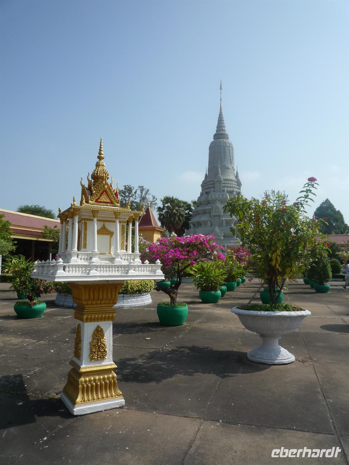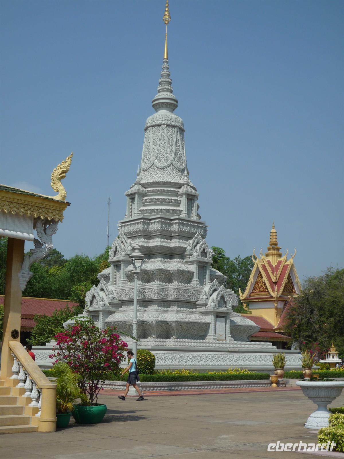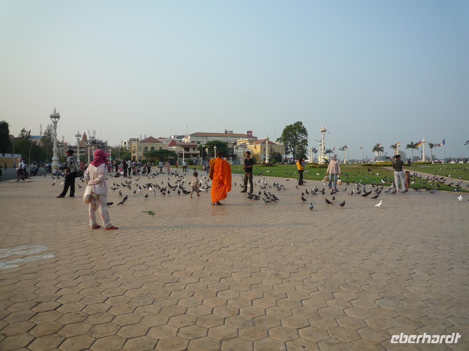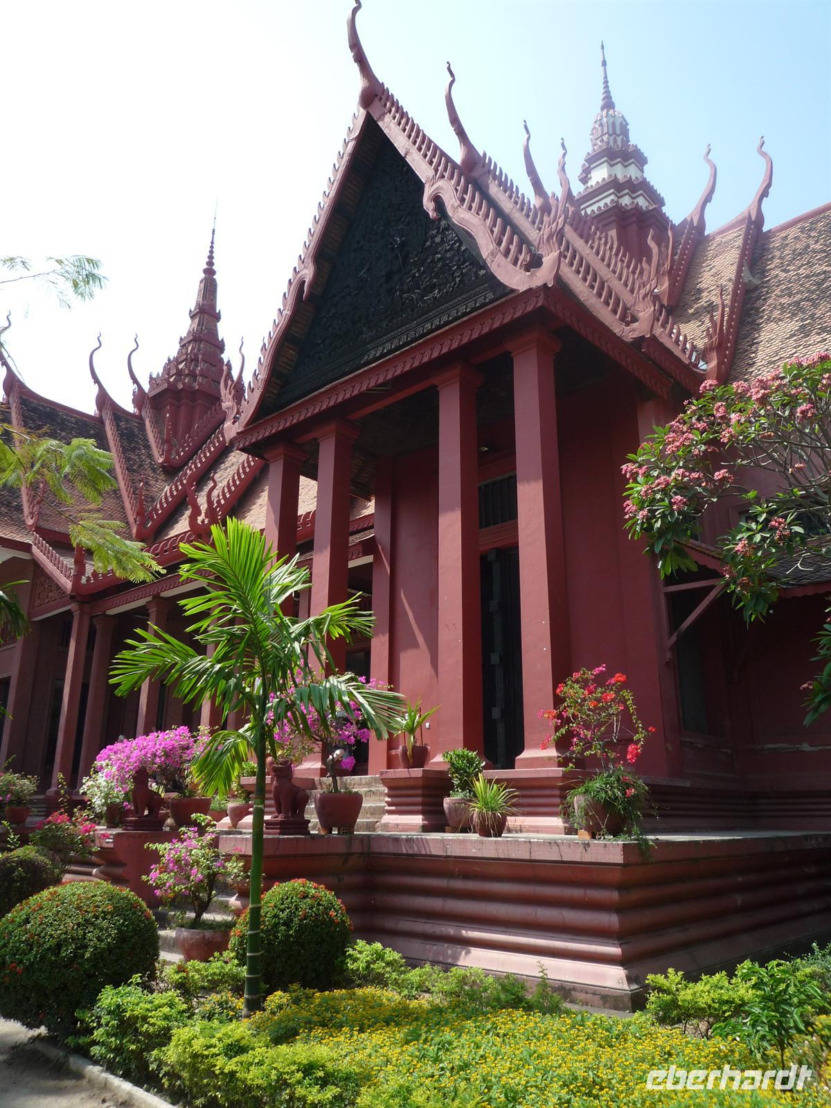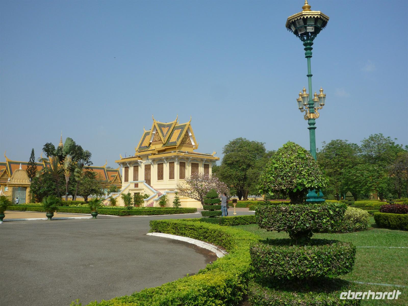 In Phnom Penh haben wir drei Besichtigungspunkte auf dem Programm. Zuerst fahren wir zum Königspalast. Die Palastanlage existiert seit 1886 an dieser Stelle, wurde zuerst aus Holz und später aus Stein gebaut. Das der königliche Palast an dieser Stelle gebaut wurde kommt nicht von ungefähr, er liegt genau an der Stelle wo der Tonle Sap-Fluss in den Mekong mündet. Der Palast ist glanzvoll mit viel Prunk ausgestattet, was im Gegensatz zur Armut im Land steht. Ein Gruppenfoto vor dem Palast darf natürlich nicht fehlen. Unser Rundgang führt uns auch zur Silberpagode. Auf dem Fußboden liegen 5329 in Frankreich gefertigte Bodenfließen aus Silber, zu einem Gewicht von je 1,125 kg, also insgesamt knapp 6000 kg Silber. Einen Teil davon kann man sehen, aber der größte Teil ist, zum Schutz, mit Teppichen ausgelegt. Im Inneren ist auf einem Altar eine grüne Buddhafigur zu sehen und davor steht in einer Glasvitrine eine Buddhafigur aus Purem Gold mit zahlreichen Edelsteinen verziert. Nicht weit entfernt vom Palast befindet sich das Nationalmuseum, ein markantes braunrotes Gebäude im traditionellen Khmerstil. Ausgestellt werden hier ca. 5000 Exponate, das Museum ist weltweit führend in der Sammlung von Khmerkunst. Die Khmer sind der Volksstamm der mit 90% in diesem Land die Stammbevölkerung stellt. Wir bestaunen die Ausstellungstücke aus den verschiedenen Epochen, vor allem sind es hinduistische Götter und Buddhafiguren. Abschließend besuchen wir noch das Hauptheiligtum der Stadt, das Wat Phnom. Ein kleiner Schrein erinnert an die Gründerin der Pagode, Frau Penh. Der Nachmittag steht wieder zur freien Verfügung. Einige Gäste und ich besuchen das Tuol-Sleng-Genozied-Museums an. Hier bekommen wir einen kleinen Eindruck vom schrecklichsten Kapitel kambodschanischer Geschichte. In diesem ehemaligen Gefängnis wurde zwischen 1976 und 1979 über 17000 Gefangene gefoltert und gedemütigt und anschließend zur Hinrichtung auf die Killing Fields gebracht. Schweigend verlassen wir das ehemalige Gefängnis, immer noch nicht begreifend, was in den Menschen vorgegangen sein muss, die diesen Völkermord zu verantworten haben. Wir fahren natürlich mit dem typischen Fortbewegungsmittel in Kambodscha, dem TukTuk, einer Rikscha mit Moped. Das sollte man in Kambodscha genutzt haben, denn es ist eine bequeme und doch spannende Art die Stadt zu erkunden. Anschließend treffen wir uns wieder und unternehmen eine schöne Bootsfahrt auf dem Mekong. Wir sehen das Leben am und vom Mekong, denn auch hier gibt es schwimmende Dörfer. Zum Abschluss sehen wir den roten Sonnenball hinter dem Königspalast untergehen - der schönste Sonnenuntergang der Reise!