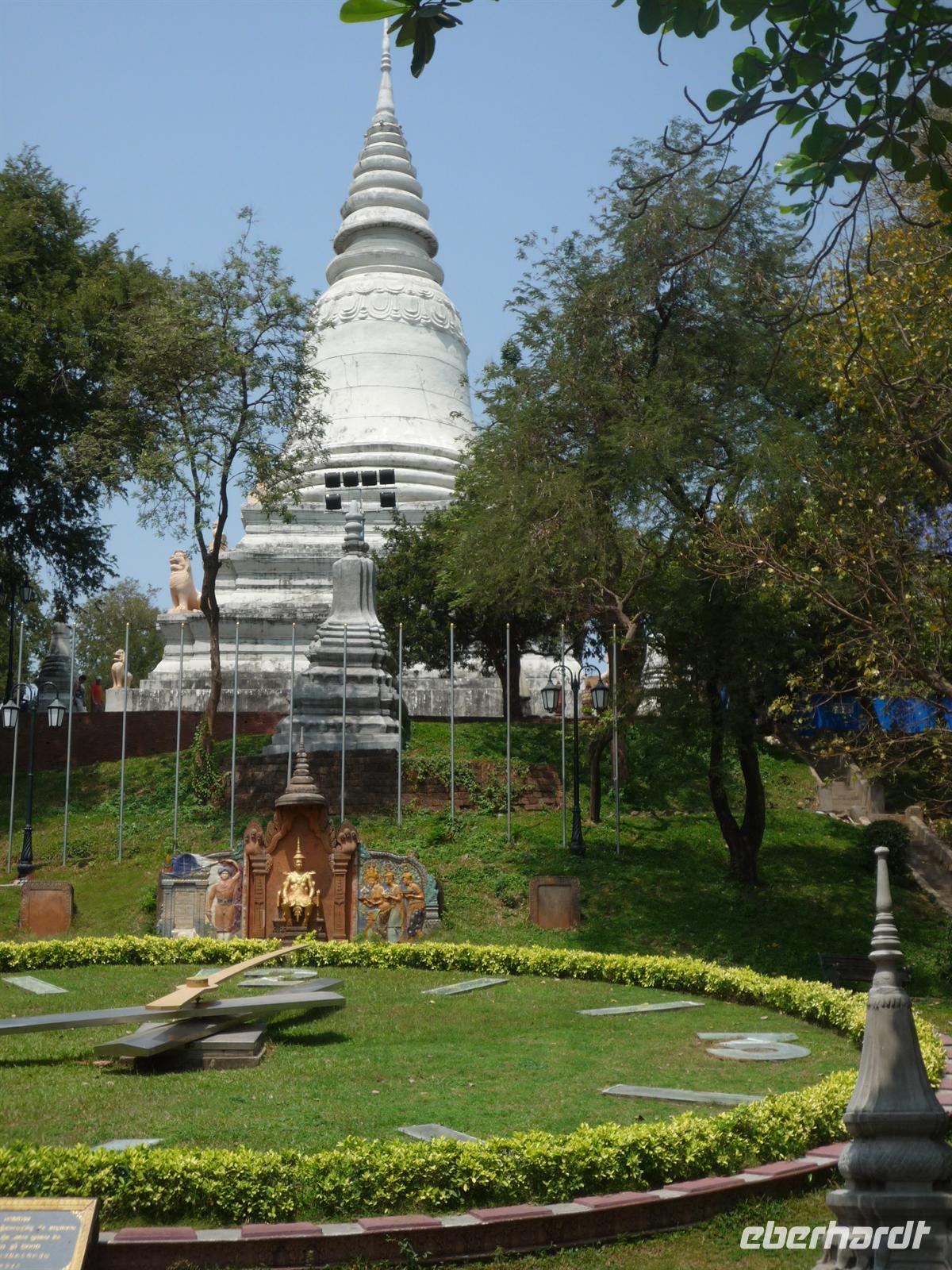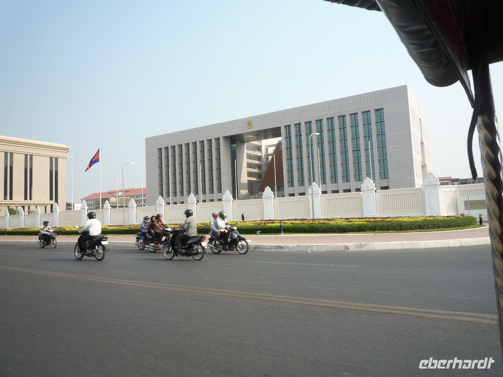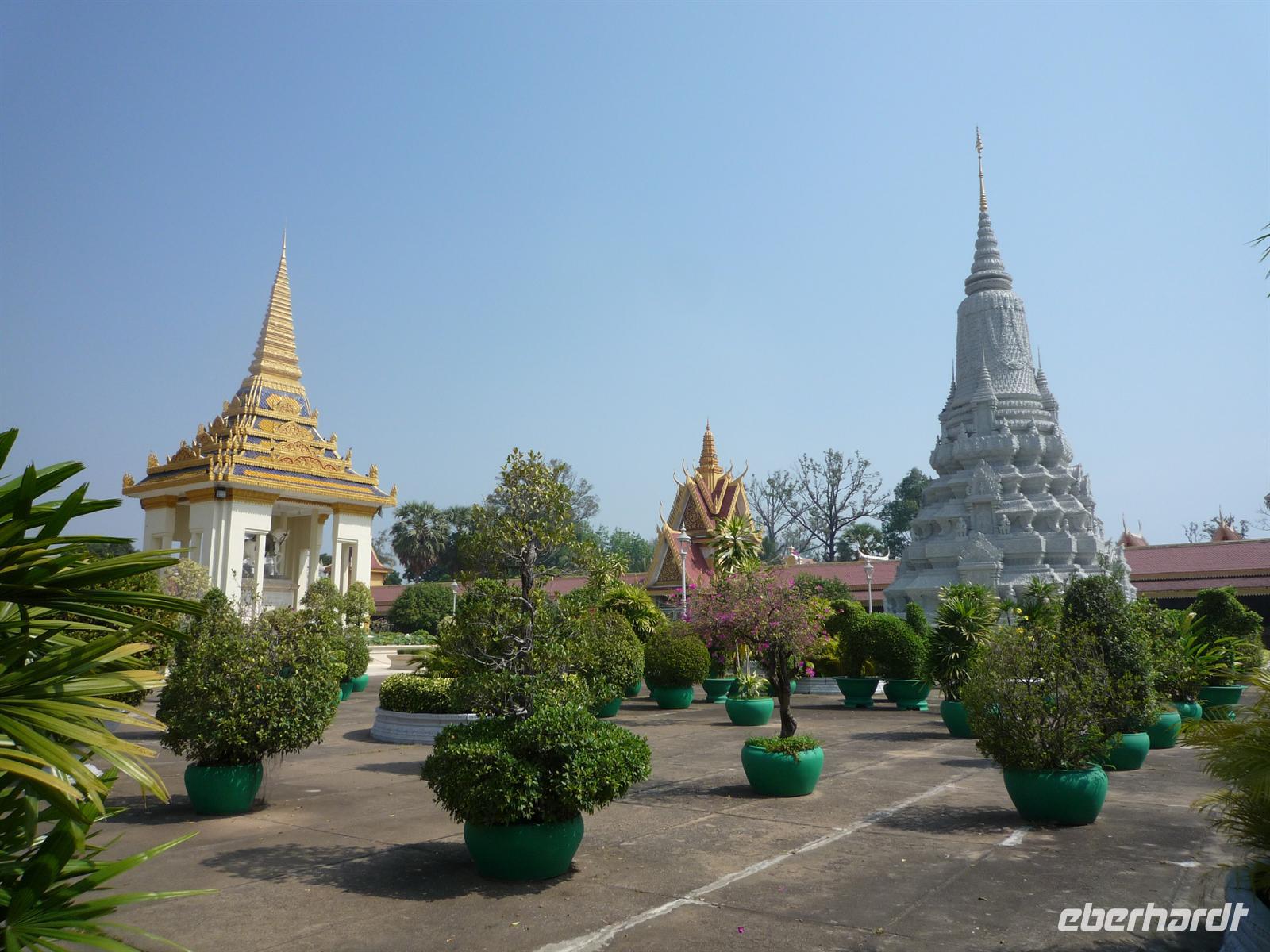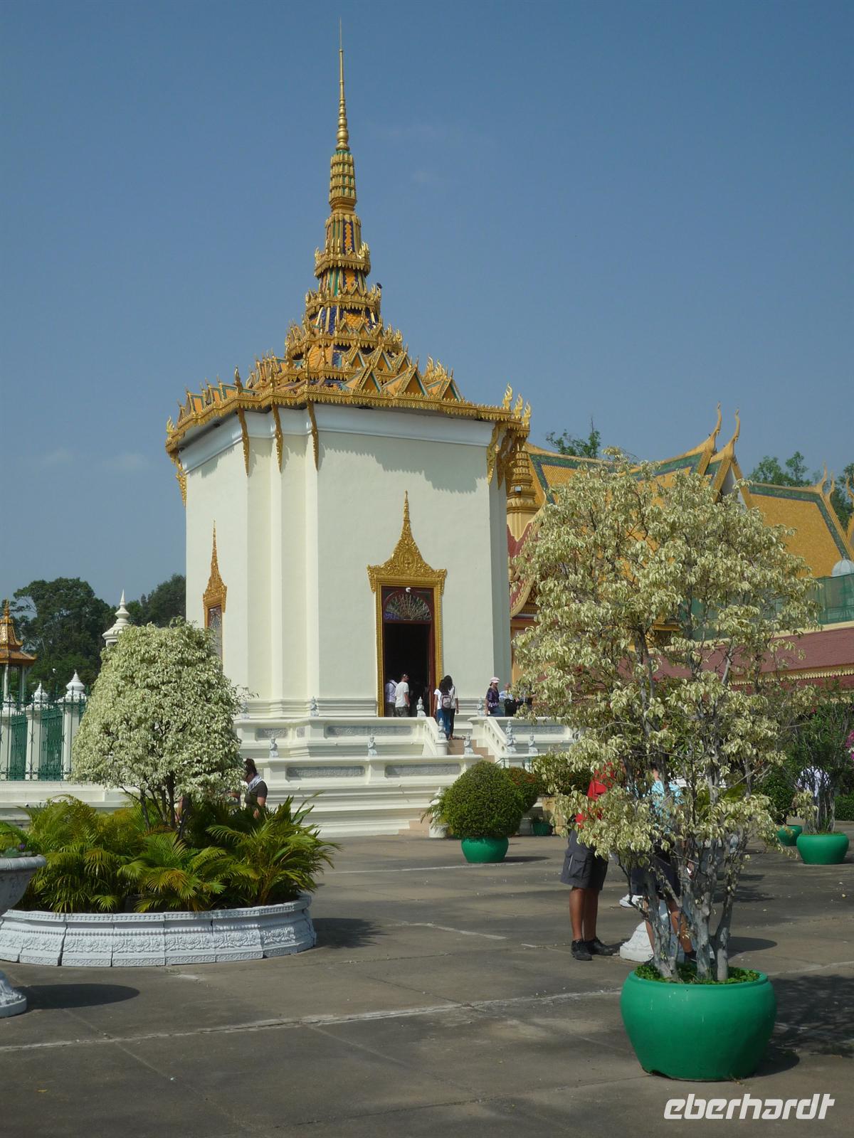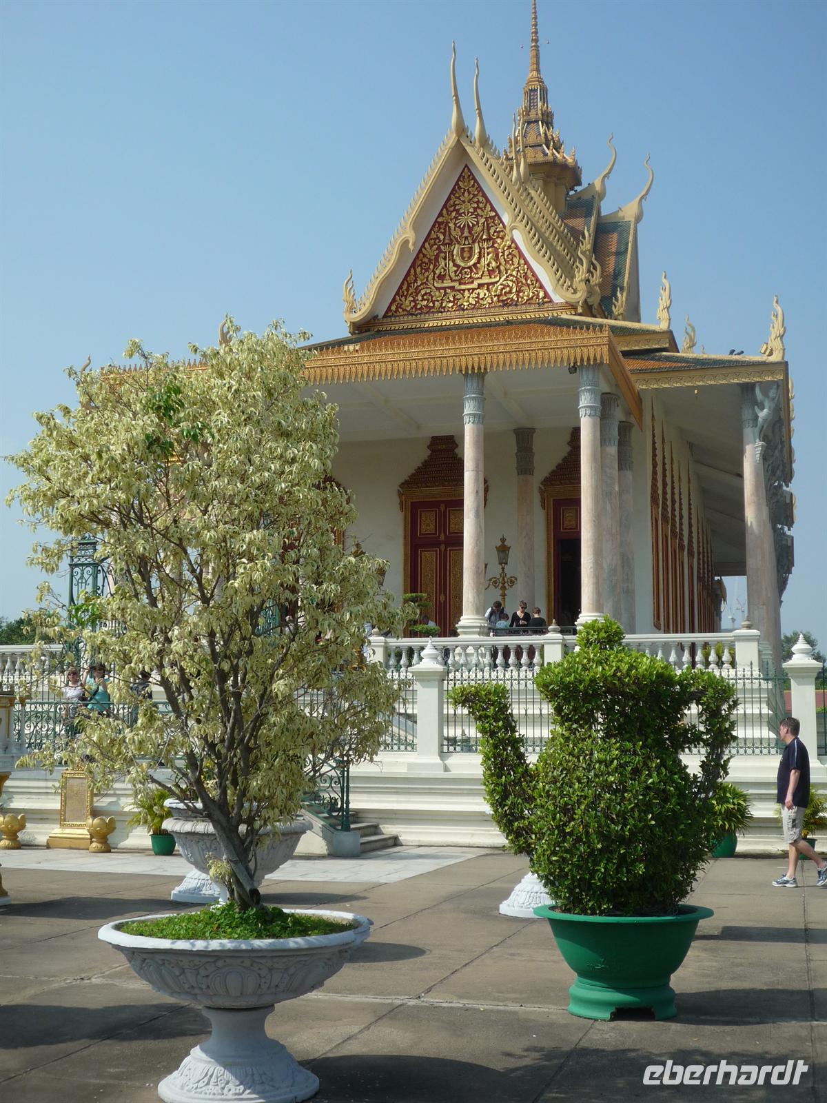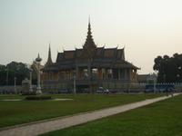 In Phnom Penh haben wir drei Besichtigungspunkte auf dem Programm. Zuerst fahren wir zum Königspalast. Die Palastanlage existiert seit 1886 an dieser Stelle, wurde zuerst aus Holz und später aus Stein gebaut. Das der königliche Palast an dieser Stelle gebaut wurde kommt nicht von ungefähr, er liegt genau an der Stelle wo der Tonle Sap-Fluss in den Mekong mündet. Der Palast ist glanzvoll mit viel Prunk ausgestattet, was im Gegensatz zur Armut im Land steht. Ein Gruppenfoto vor dem Palast darf natürlich nicht fehlen. Unser Rundgang führt uns auch zur Silberpagode. Auf dem Fußboden liegen 5329 in Frankreich gefertigte Bodenfließen aus Silber, zu einem Gewicht von je 1,125 kg, also insgesamt knapp 6000 kg Silber. Einen Teil davon kann man sehen, aber der größte Teil ist, zum Schutz, mit Teppichen ausgelegt. Im Inneren ist auf einem Altar eine grüne Buddhafigur zu sehen und davor steht in einer Glasvitrine eine Buddhafigur aus Purem Gold mit zahlreichen Edelsteinen verziert. Nicht weit entfernt vom Palast befindet sich das Nationalmuseum, ein markantes braunrotes Gebäude im traditionellen Khmerstil. Ausgestellt werden hier ca. 5000 Exponate, das Museum ist weltweit führend in der Sammlung von Khmerkunst. Die Khmer sind der Volksstamm der mit 90% in diesem Land die Stammbevölkerung stellt. Wir bestaunen die Ausstellungstücke aus den verschiedenen Epochen, vor allem sind es hinduistische Götter und Buddhafiguren. Abschließend besuchen wir noch das Hauptheiligtum der Stadt, das Wat Phnom. Ein kleiner Schrein erinnert an die Gründerin der Pagode, Frau Penh. Der Nachmittag steht wieder zur freien Verfügung. Einige Gäste und ich besuchen das Tuol-Sleng-Genozied-Museums an. Hier bekommen wir einen kleinen Eindruck vom schrecklichsten Kapitel kambodschanischer Geschichte. In diesem ehemaligen Gefängnis wurde zwischen 1976 und 1979 über 17000 Gefangene gefoltert und gedemütigt und anschließend zur Hinrichtung auf die Killing Fields gebracht. Schweigend verlassen wir das ehemalige Gefängnis, immer noch nicht begreifend, was in den Menschen vorgegangen sein muss, die diesen Völkermord zu verantworten haben. Wir fahren natürlich mit dem typischen Fortbewegungsmittel in Kambodscha, dem TukTuk, einer Rikscha mit Moped. Das sollte man in Kambodscha genutzt haben, denn es ist eine bequeme und doch spannende Art die Stadt zu erkunden. Anschließend treffen wir uns wieder und unternehmen eine schöne Bootsfahrt auf dem Mekong. Wir sehen das Leben am und vom Mekong, denn auch hier gibt es schwimmende Dörfer. Zum Abschluss sehen wir den roten Sonnenball hinter dem Königspalast untergehen - der schönste Sonnenuntergang der Reise!