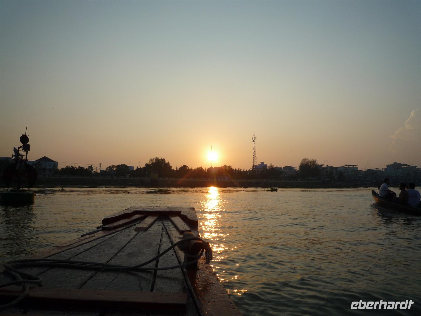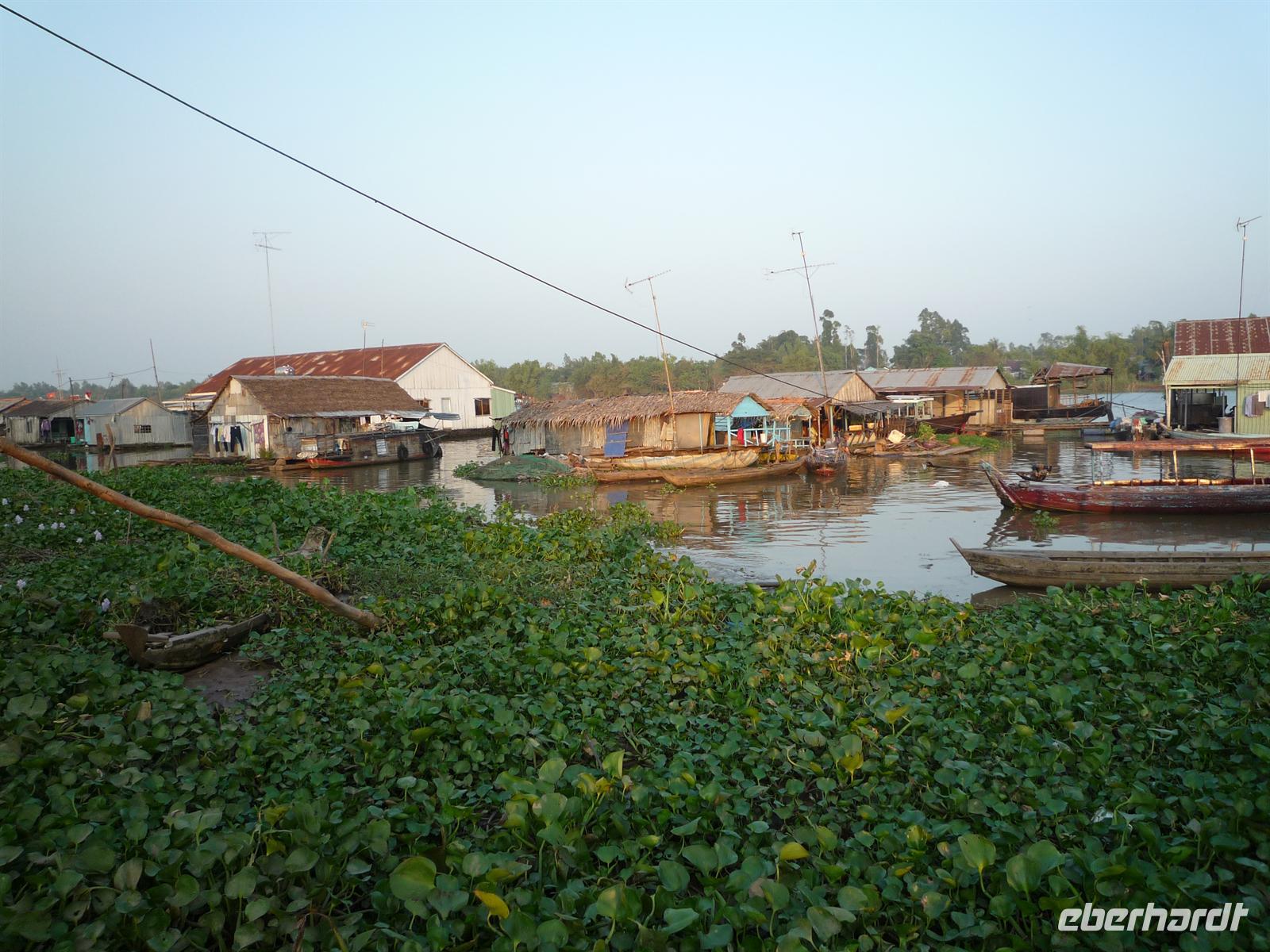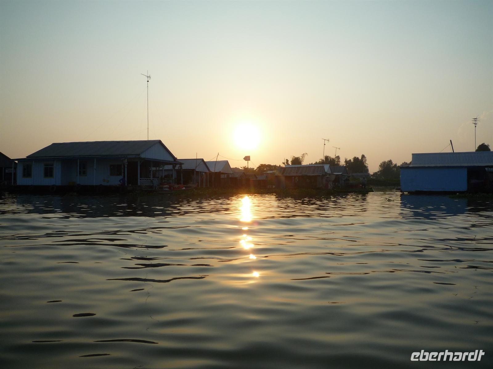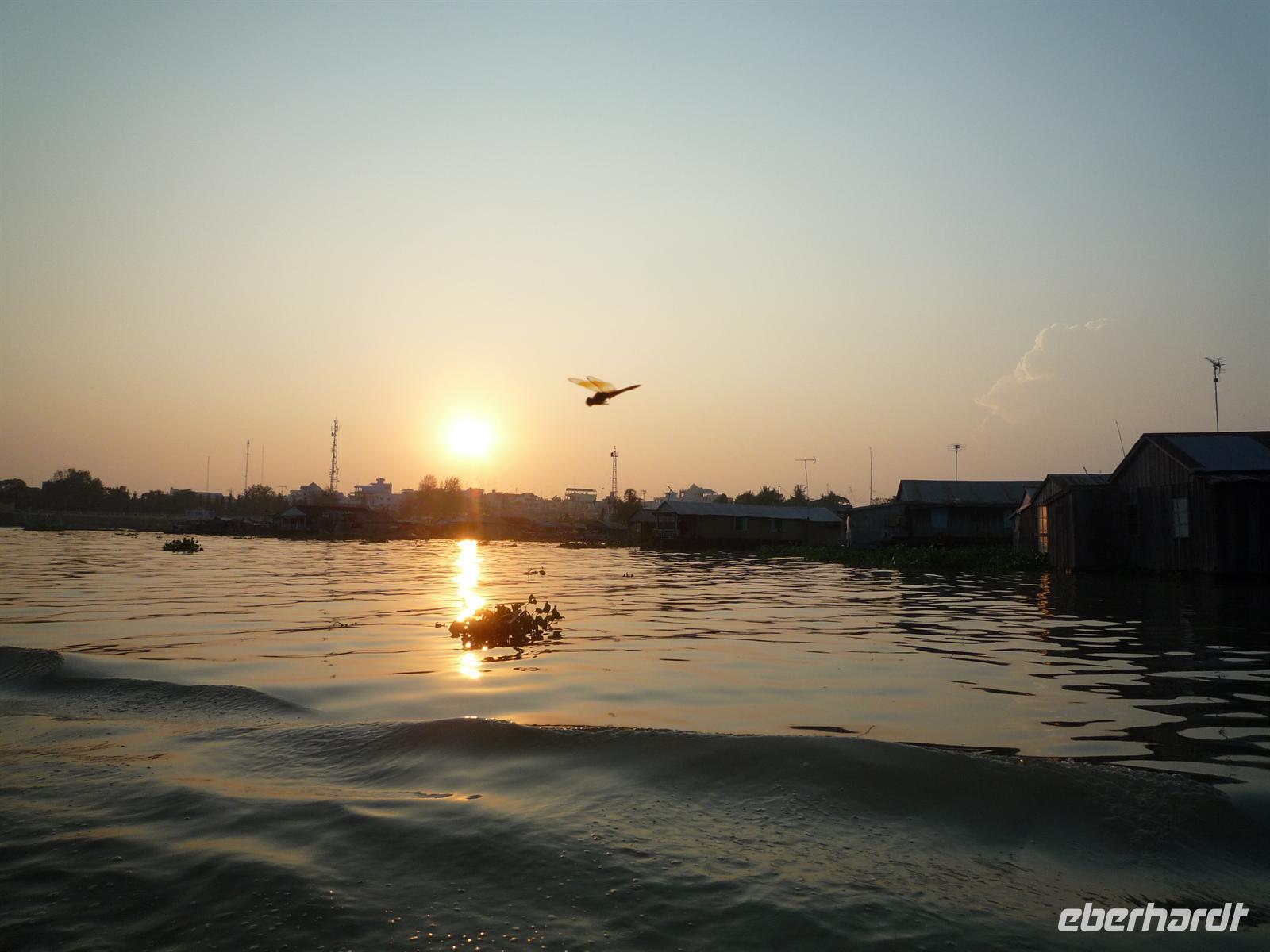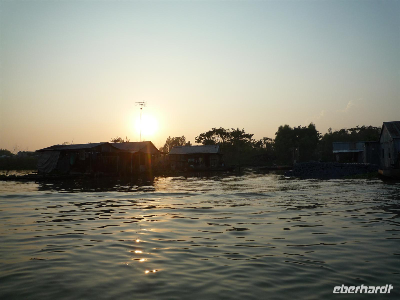 Am Morgen besteigen wir in Can Tho wieder ein Boot und fahren zu den Schwimmenden Märkten. Hier wird noch richtig gehandelt und gefeilscht. Wir beobachten das Treiben, wie die Waren das Boot wechseln. Ot kauft eine Jack-Frucht für uns, die wir anschließend verkosten. Viele tolle Fotomotive ergeben sich für uns. Anschließend fahren wir weiter mit dem Bus in Richtung kambodschanische Grenze. Unterwegs besuchen wir einen Tempel der Sekte Cao Dai, einer Sekte, die sich aus allen anderen Weltreligionen jeweils das Beste heraus nimmt. Wir erreichen Chau Doc am frühen Nachmittag. Nach dem Einchecken steht heute der Tag zur freien Verfügung. Doch Eberhardt und Ot haben mal wieder eine Idee und so treffen wir uns erneut, um einen Bootsausflug zu einem schwimmenden Dorf zu machen. Hier besuchen wir eine Pangasius-Fisch-Aufzuchtsanlage. Viele tausend Fische werden hier auf engstem Raum gehalten. Weiter geht es in ein Cham-Dorf, wo wir herzlich begrüßt werden. Hier im Dorf gibt es sogar eine Mosche. Auf der Rückfahrt geht die Sonne immer weiter unter und das Licht gibt herrliche Farben, die sich im Fluss spiegeln. Wir essen heute sehr gut im Hotel zu Abend.