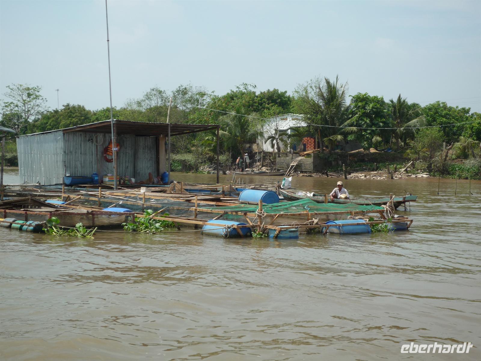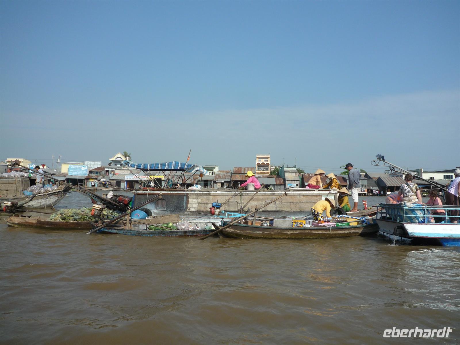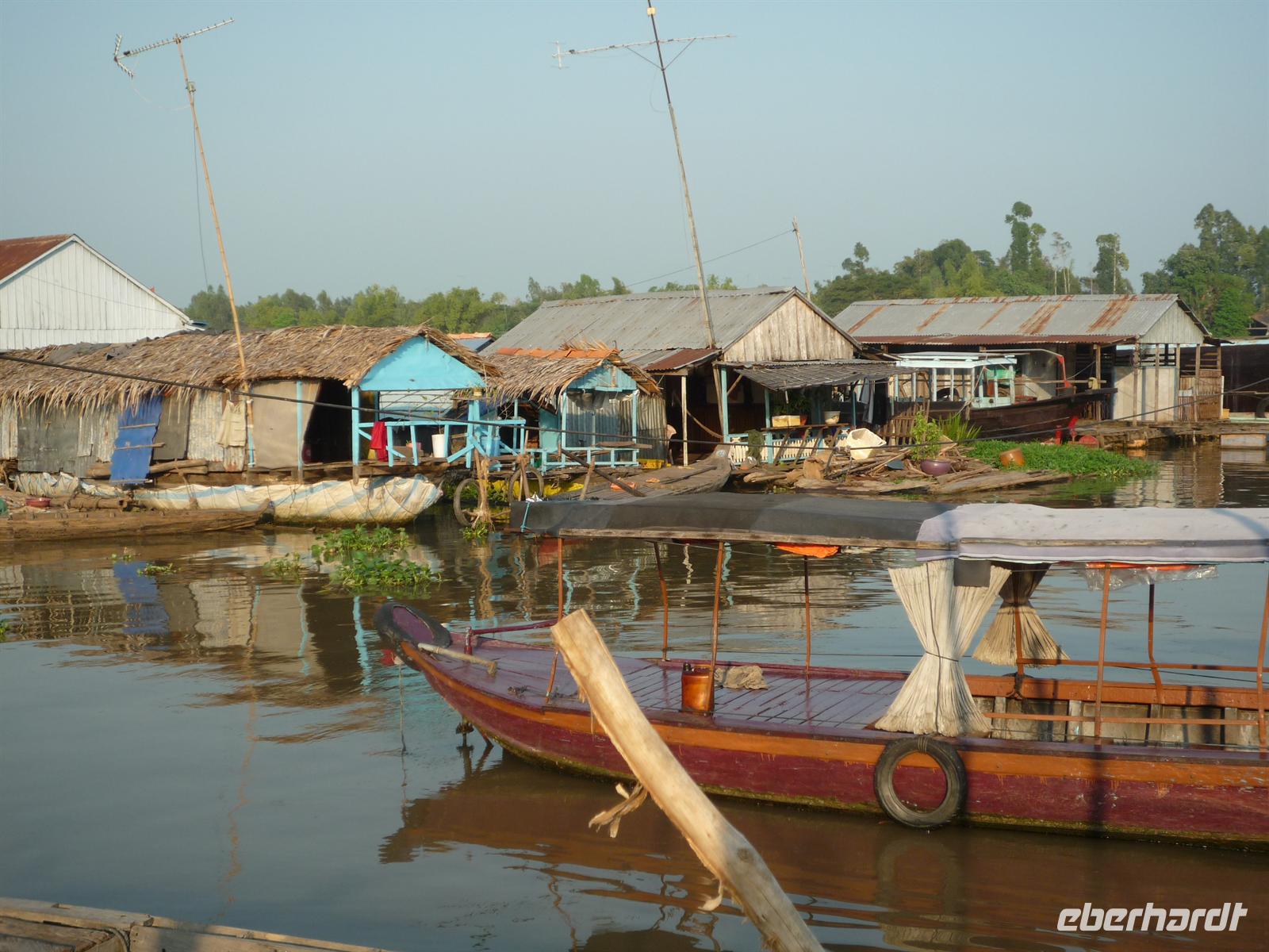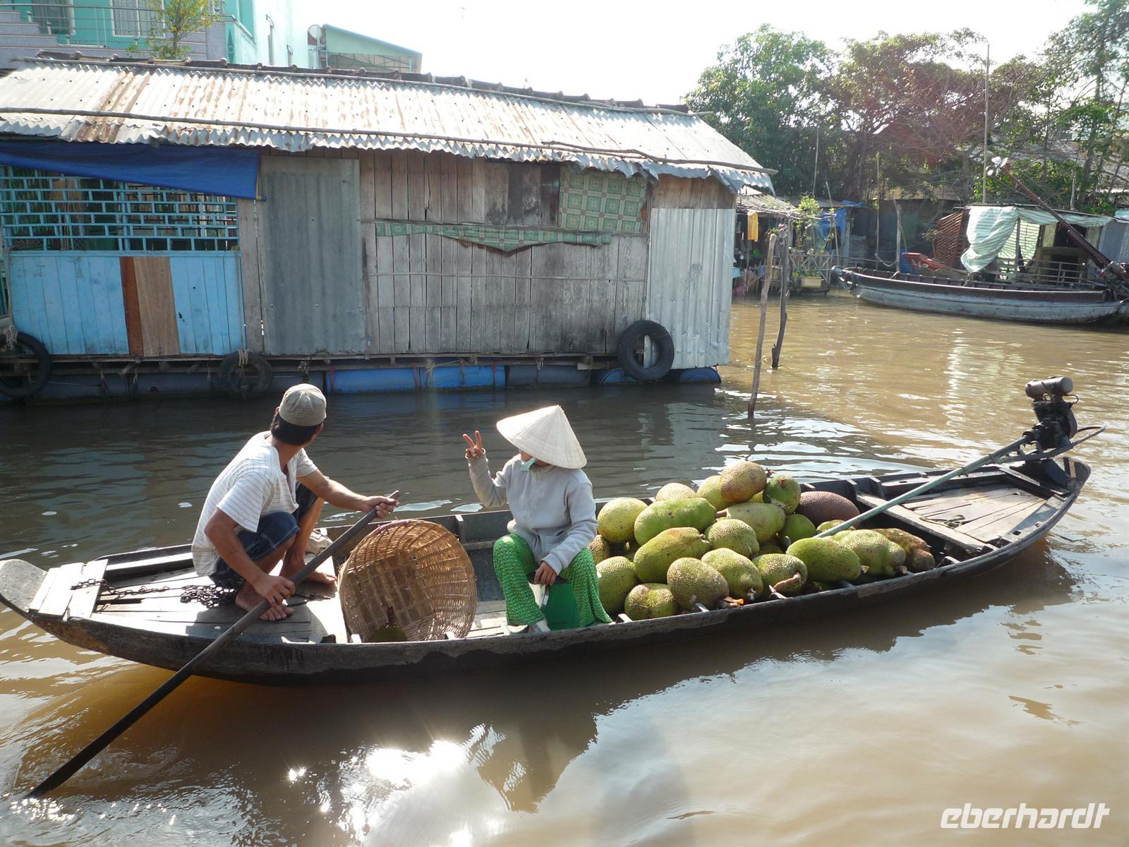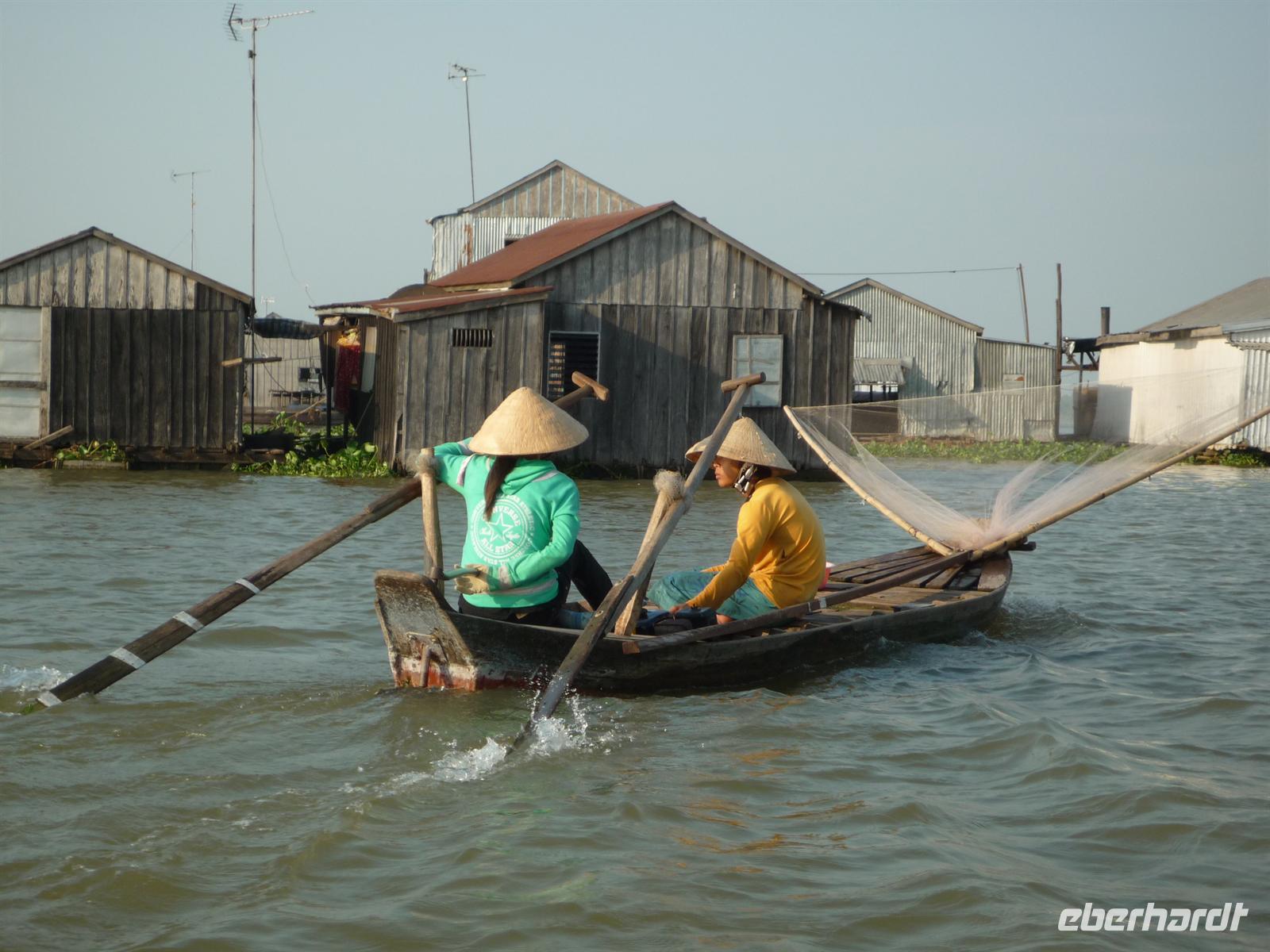 Am Morgen besteigen wir in Can Tho wieder ein Boot und fahren zu den Schwimmenden Märkten. Hier wird noch richtig gehandelt und gefeilscht. Wir beobachten das Treiben, wie die Waren das Boot wechseln. Ot kauft eine Jack-Frucht für uns, die wir anschließend verkosten. Viele tolle Fotomotive ergeben sich für uns. Anschließend fahren wir weiter mit dem Bus in Richtung kambodschanische Grenze. Unterwegs besuchen wir einen Tempel der Sekte Cao Dai, einer Sekte, die sich aus allen anderen Weltreligionen jeweils das Beste heraus nimmt. Wir erreichen Chau Doc am frühen Nachmittag. Nach dem Einchecken steht heute der Tag zur freien Verfügung. Doch Eberhardt und Ot haben mal wieder eine Idee und so treffen wir uns erneut, um einen Bootsausflug zu einem schwimmenden Dorf zu machen. Hier besuchen wir eine Pangasius-Fisch-Aufzuchtsanlage. Viele tausend Fische werden hier auf engstem Raum gehalten. Weiter geht es in ein Cham-Dorf, wo wir herzlich begrüßt werden. Hier im Dorf gibt es sogar eine Mosche. Auf der Rückfahrt geht die Sonne immer weiter unter und das Licht gibt herrliche Farben, die sich im Fluss spiegeln. Wir essen heute sehr gut im Hotel zu Abend.
