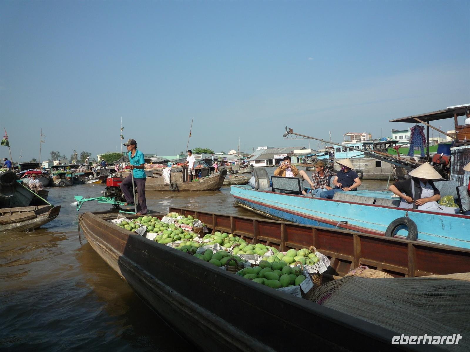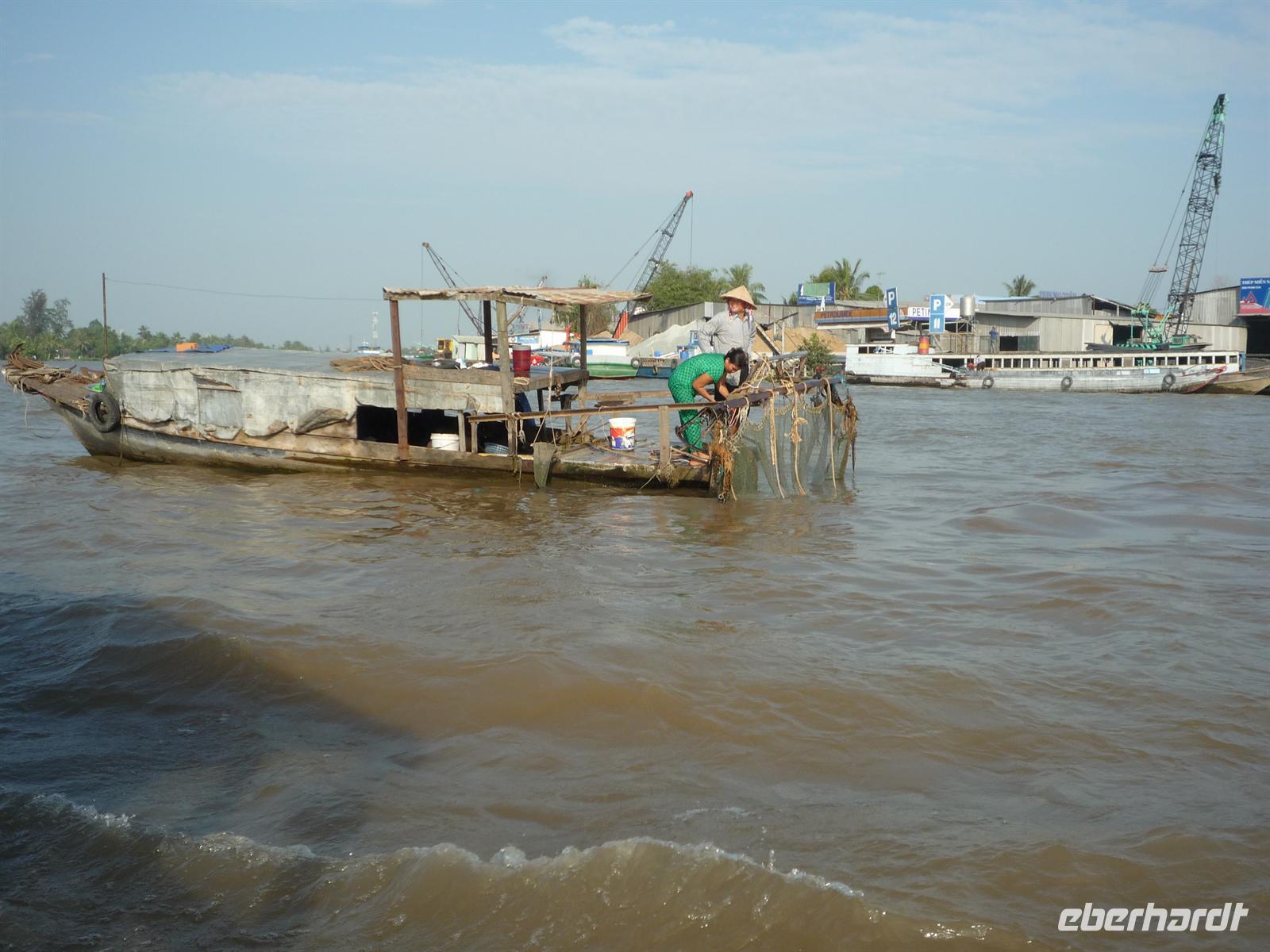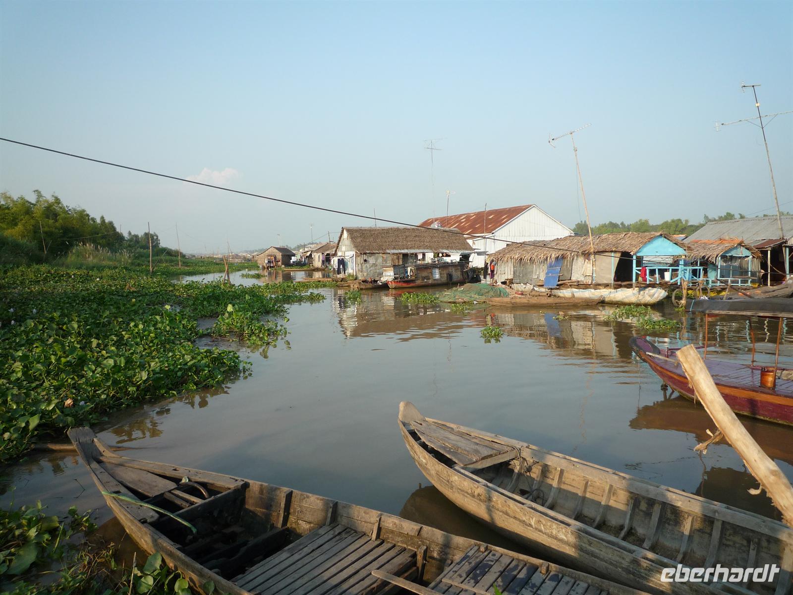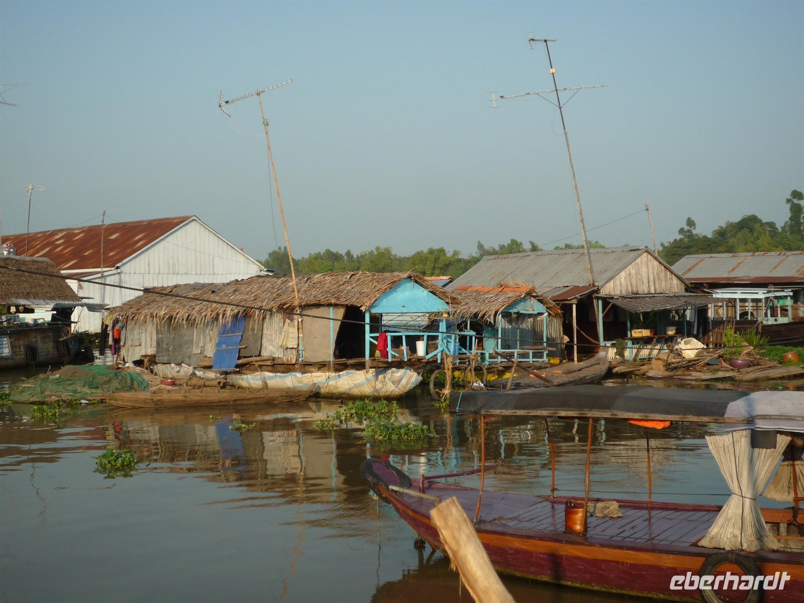 Am Morgen besteigen wir in Can Tho wieder ein Boot und fahren zu den Schwimmenden Märkten. Hier wird noch richtig gehandelt und gefeilscht. Wir beobachten das Treiben, wie die Waren das Boot wechseln. Ot kauft eine Jack-Frucht für uns, die wir anschließend verkosten. Viele tolle Fotomotive ergeben sich für uns. Anschließend fahren wir weiter mit dem Bus in Richtung kambodschanische Grenze. Unterwegs besuchen wir einen Tempel der Sekte Cao Dai, einer Sekte, die sich aus allen anderen Weltreligionen jeweils das Beste heraus nimmt. Wir erreichen Chau Doc am frühen Nachmittag. Nach dem Einchecken steht heute der Tag zur freien Verfügung. Doch Eberhardt und Ot haben mal wieder eine Idee und so treffen wir uns erneut, um einen Bootsausflug zu einem schwimmenden Dorf zu machen. Hier besuchen wir eine Pangasius-Fisch-Aufzuchtsanlage. Viele tausend Fische werden hier auf engstem Raum gehalten. Weiter geht es in ein Cham-Dorf, wo wir herzlich begrüßt werden. Hier im Dorf gibt es sogar eine Mosche. Auf der Rückfahrt geht die Sonne immer weiter unter und das Licht gibt herrliche Farben, die sich im Fluss spiegeln. Wir essen heute sehr gut im Hotel zu Abend.