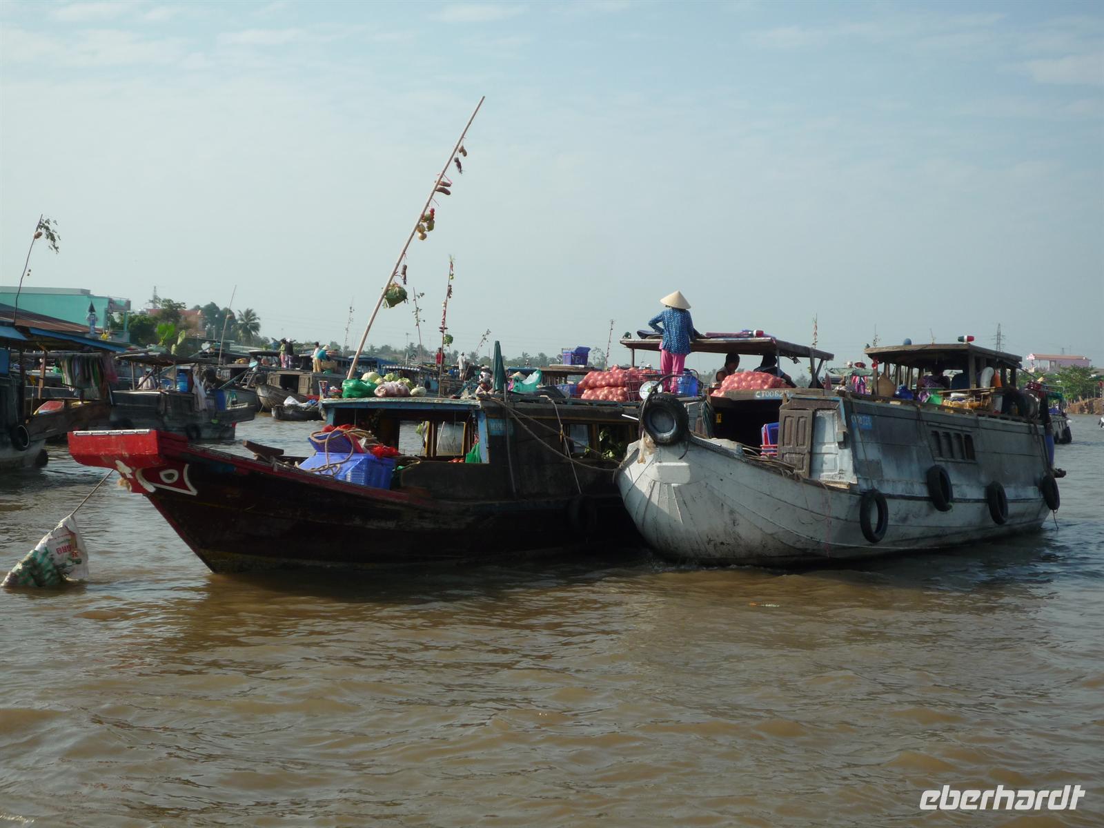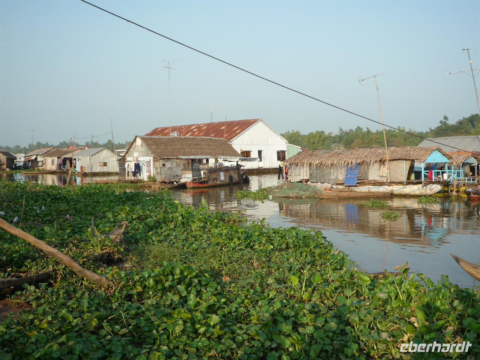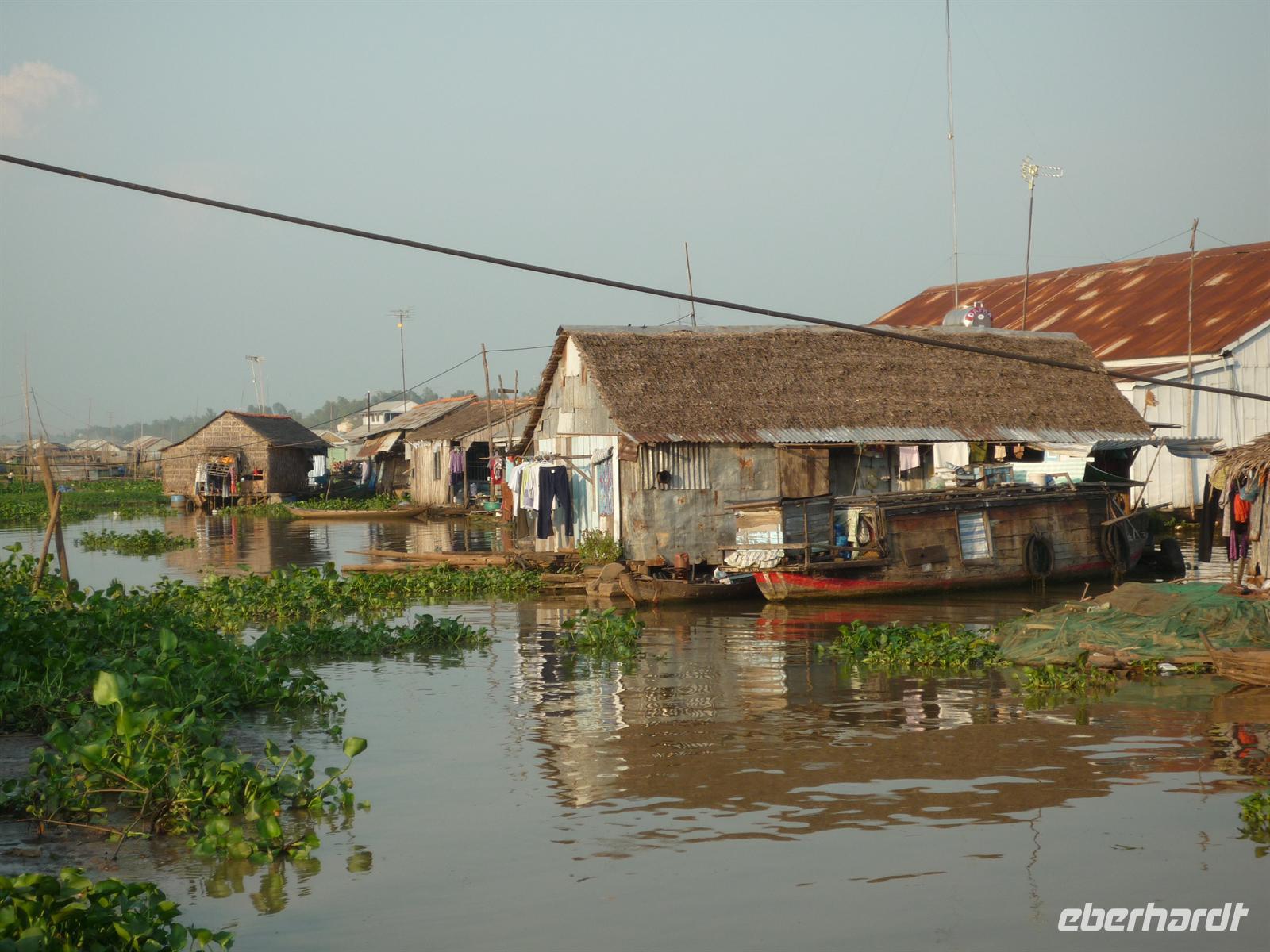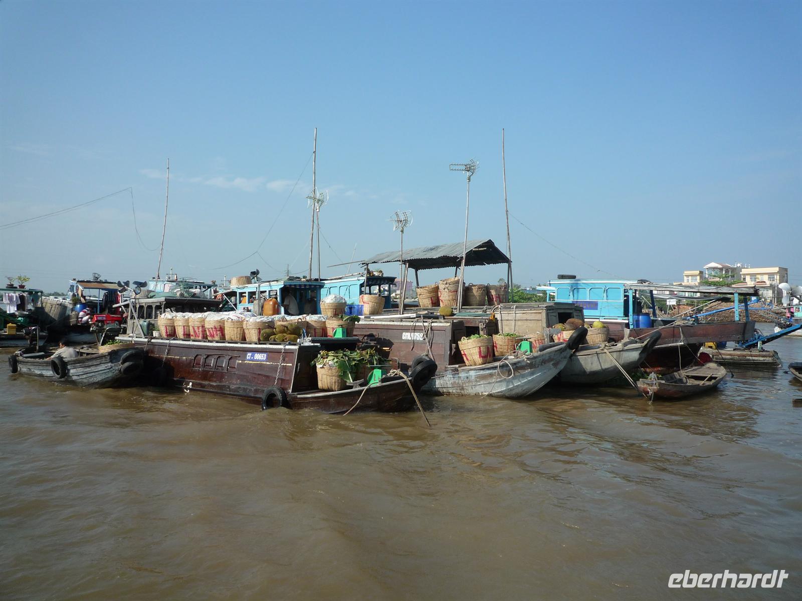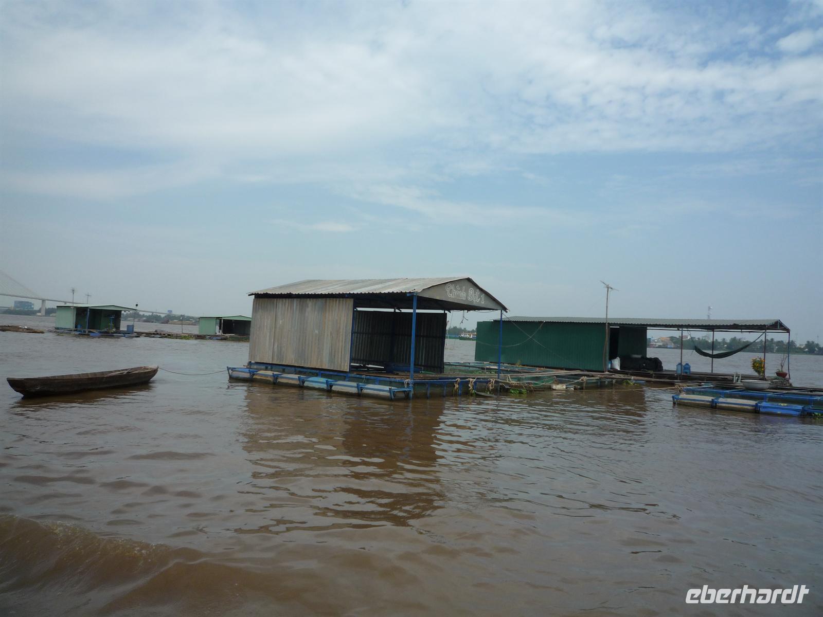 Am Morgen besteigen wir in Can Tho wieder ein Boot und fahren zu den Schwimmenden Märkten. Hier wird noch richtig gehandelt und gefeilscht. Wir beobachten das Treiben, wie die Waren das Boot wechseln. Ot kauft eine Jack-Frucht für uns, die wir anschließend verkosten. Viele tolle Fotomotive ergeben sich für uns. Anschließend fahren wir weiter mit dem Bus in Richtung kambodschanische Grenze. Unterwegs besuchen wir einen Tempel der Sekte Cao Dai, einer Sekte, die sich aus allen anderen Weltreligionen jeweils das Beste heraus nimmt. Wir erreichen Chau Doc am frühen Nachmittag. Nach dem Einchecken steht heute der Tag zur freien Verfügung. Doch Eberhardt und Ot haben mal wieder eine Idee und so treffen wir uns erneut, um einen Bootsausflug zu einem schwimmenden Dorf zu machen. Hier besuchen wir eine Pangasius-Fisch-Aufzuchtsanlage. Viele tausend Fische werden hier auf engstem Raum gehalten. Weiter geht es in ein Cham-Dorf, wo wir herzlich begrüßt werden. Hier im Dorf gibt es sogar eine Mosche. Auf der Rückfahrt geht die Sonne immer weiter unter und das Licht gibt herrliche Farben, die sich im Fluss spiegeln. Wir essen heute sehr gut im Hotel zu Abend.
