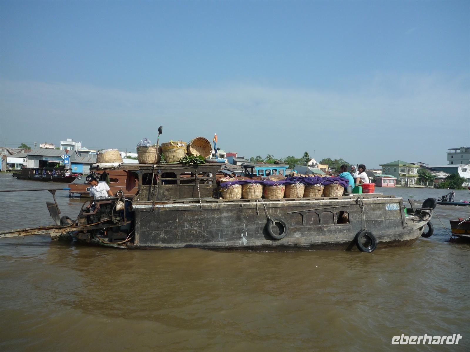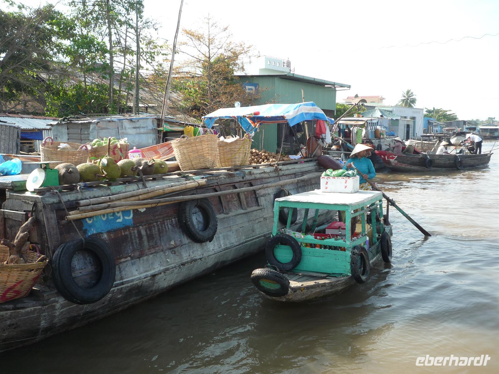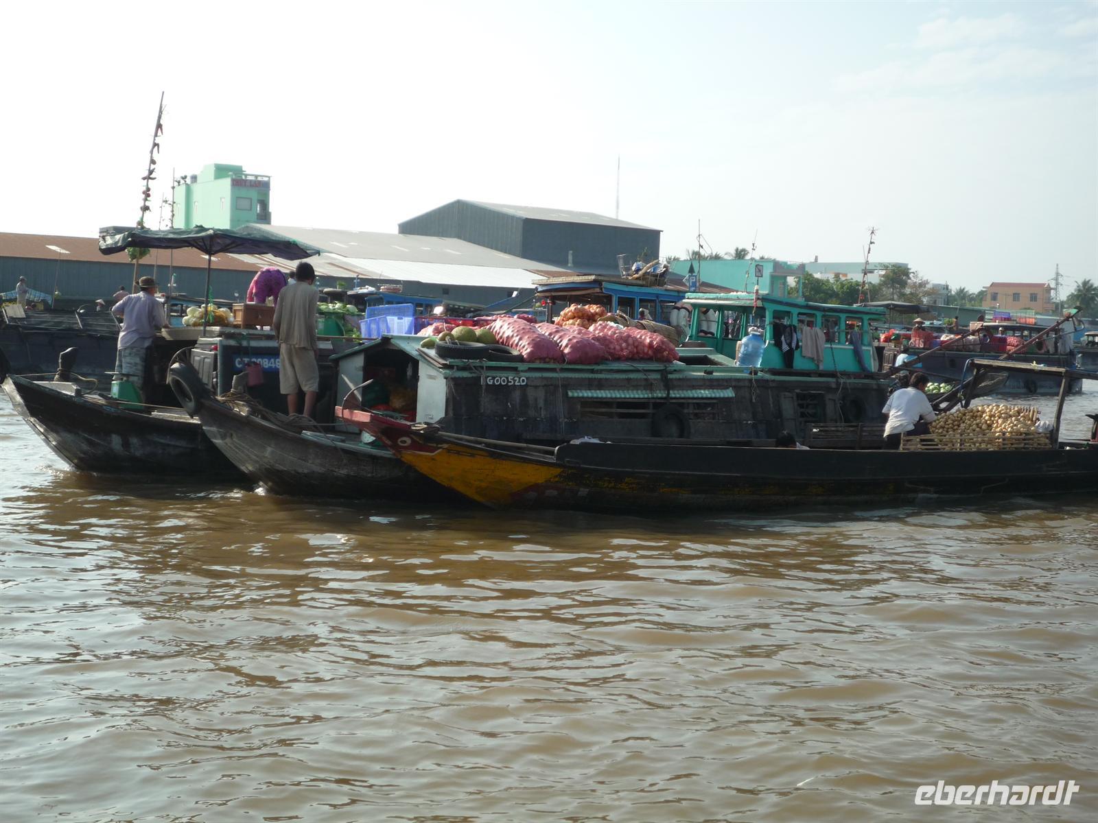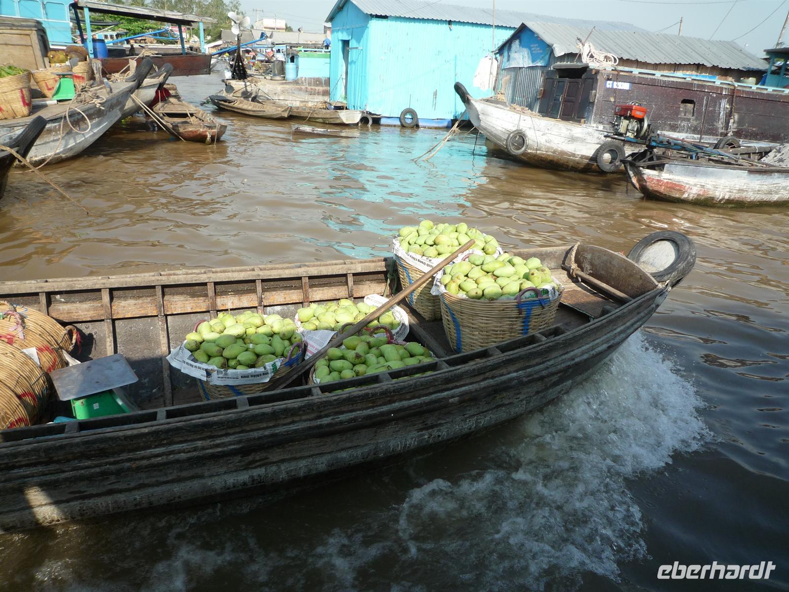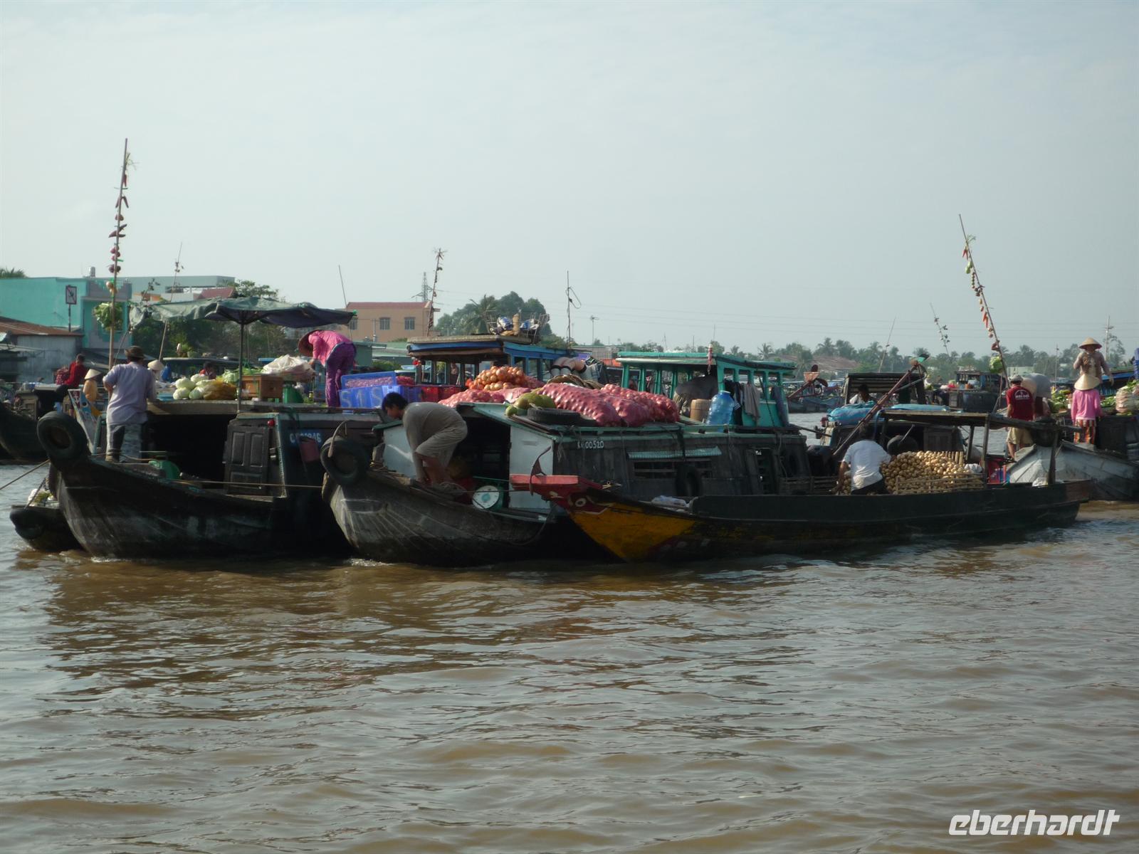 Am Morgen besteigen wir in Can Tho wieder ein Boot und fahren zu den Schwimmenden Märkten. Hier wird noch richtig gehandelt und gefeilscht. Wir beobachten das Treiben, wie die Waren das Boot wechseln. Ot kauft eine Jack-Frucht für uns, die wir anschließend verkosten. Viele tolle Fotomotive ergeben sich für uns. Anschließend fahren wir weiter mit dem Bus in Richtung kambodschanische Grenze. Unterwegs besuchen wir einen Tempel der Sekte Cao Dai, einer Sekte, die sich aus allen anderen Weltreligionen jeweils das Beste heraus nimmt. Wir erreichen Chau Doc am frühen Nachmittag. Nach dem Einchecken steht heute der Tag zur freien Verfügung. Doch Eberhardt und Ot haben mal wieder eine Idee und so treffen wir uns erneut, um einen Bootsausflug zu einem schwimmenden Dorf zu machen. Hier besuchen wir eine Pangasius-Fisch-Aufzuchtsanlage. Viele tausend Fische werden hier auf engstem Raum gehalten. Weiter geht es in ein Cham-Dorf, wo wir herzlich begrüßt werden. Hier im Dorf gibt es sogar eine Mosche. Auf der Rückfahrt geht die Sonne immer weiter unter und das Licht gibt herrliche Farben, die sich im Fluss spiegeln. Wir essen heute sehr gut im Hotel zu Abend.