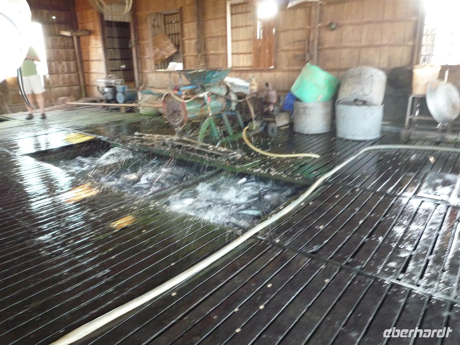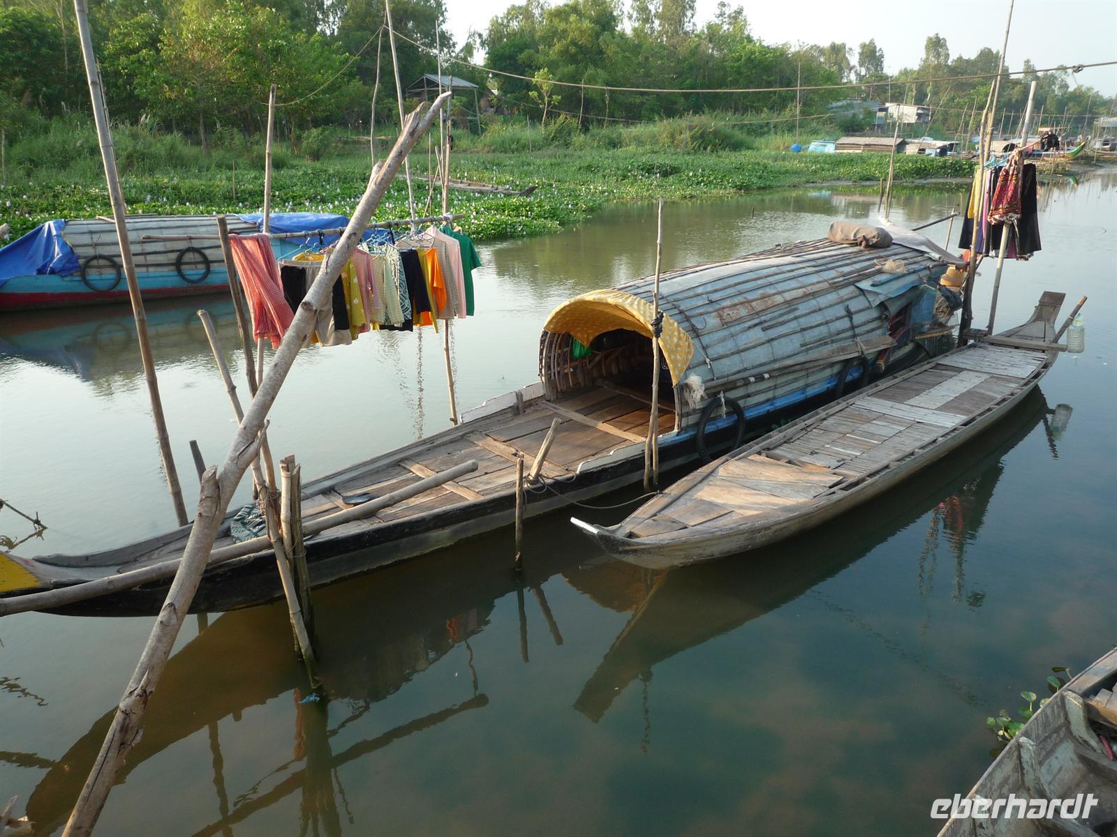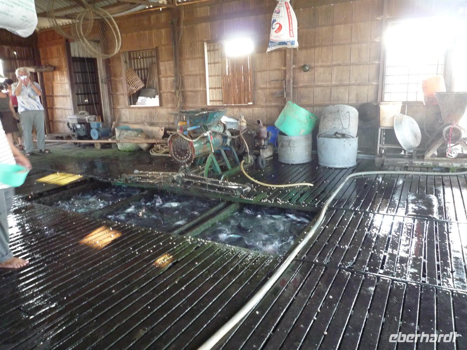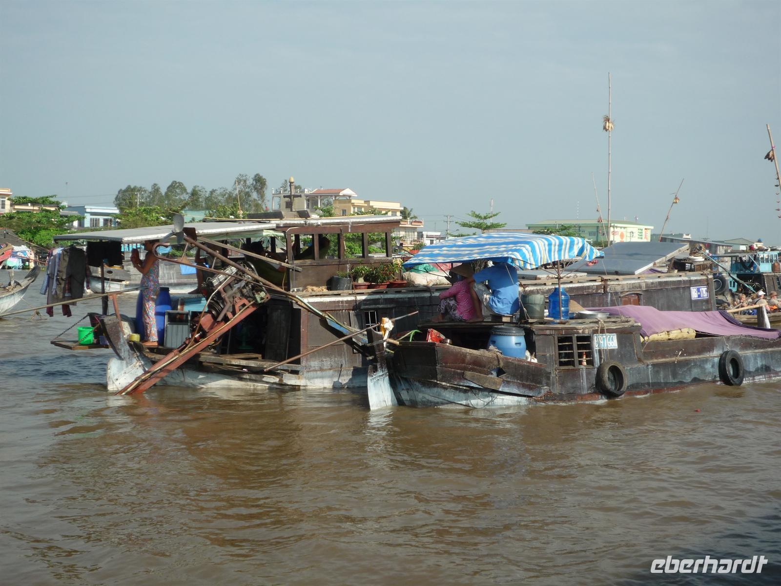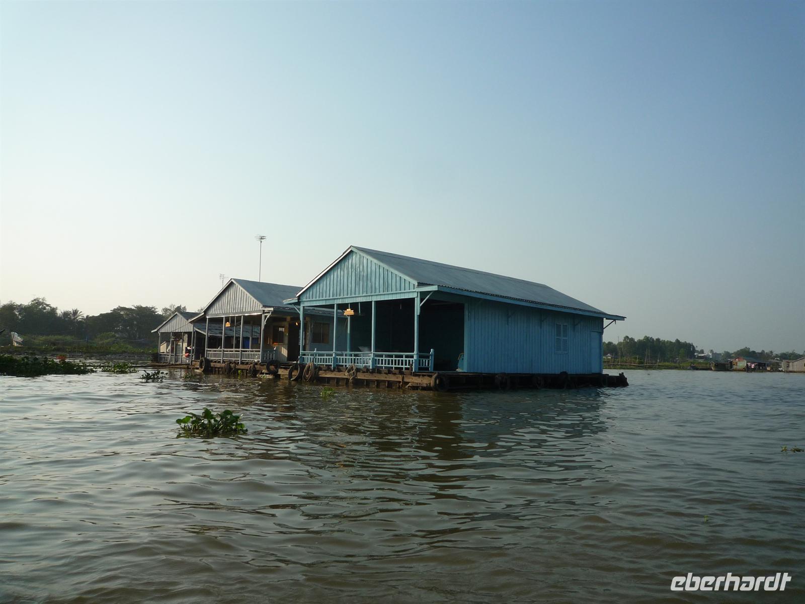 Am Morgen besteigen wir in Can Tho wieder ein Boot und fahren zu den Schwimmenden Märkten. Hier wird noch richtig gehandelt und gefeilscht. Wir beobachten das Treiben, wie die Waren das Boot wechseln. Ot kauft eine Jack-Frucht für uns, die wir anschließend verkosten. Viele tolle Fotomotive ergeben sich für uns. Anschließend fahren wir weiter mit dem Bus in Richtung kambodschanische Grenze. Unterwegs besuchen wir einen Tempel der Sekte Cao Dai, einer Sekte, die sich aus allen anderen Weltreligionen jeweils das Beste heraus nimmt. Wir erreichen Chau Doc am frühen Nachmittag. Nach dem Einchecken steht heute der Tag zur freien Verfügung. Doch Eberhardt und Ot haben mal wieder eine Idee und so treffen wir uns erneut, um einen Bootsausflug zu einem schwimmenden Dorf zu machen. Hier besuchen wir eine Pangasius-Fisch-Aufzuchtsanlage. Viele tausend Fische werden hier auf engstem Raum gehalten. Weiter geht es in ein Cham-Dorf, wo wir herzlich begrüßt werden. Hier im Dorf gibt es sogar eine Mosche. Auf der Rückfahrt geht die Sonne immer weiter unter und das Licht gibt herrliche Farben, die sich im Fluss spiegeln. Wir essen heute sehr gut im Hotel zu Abend.