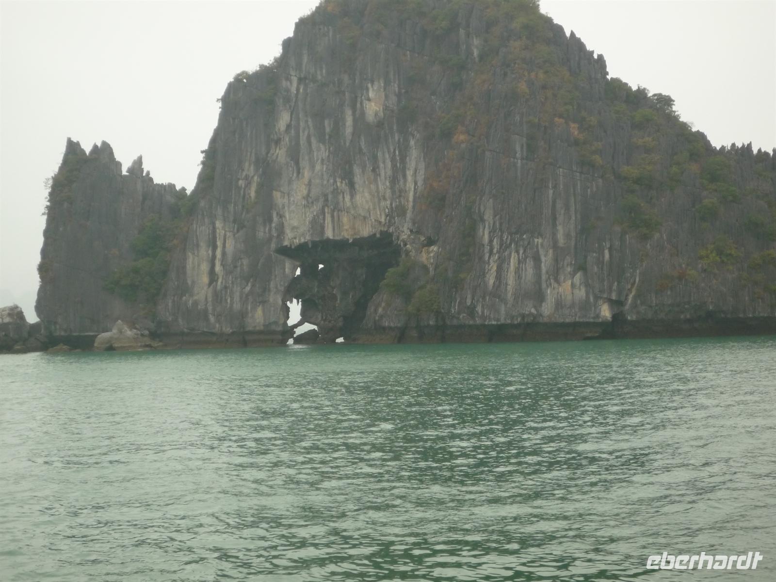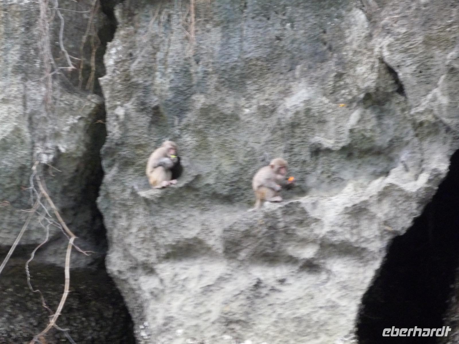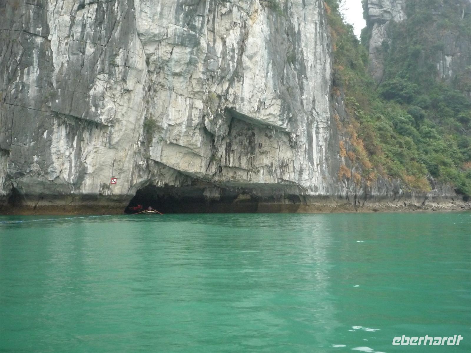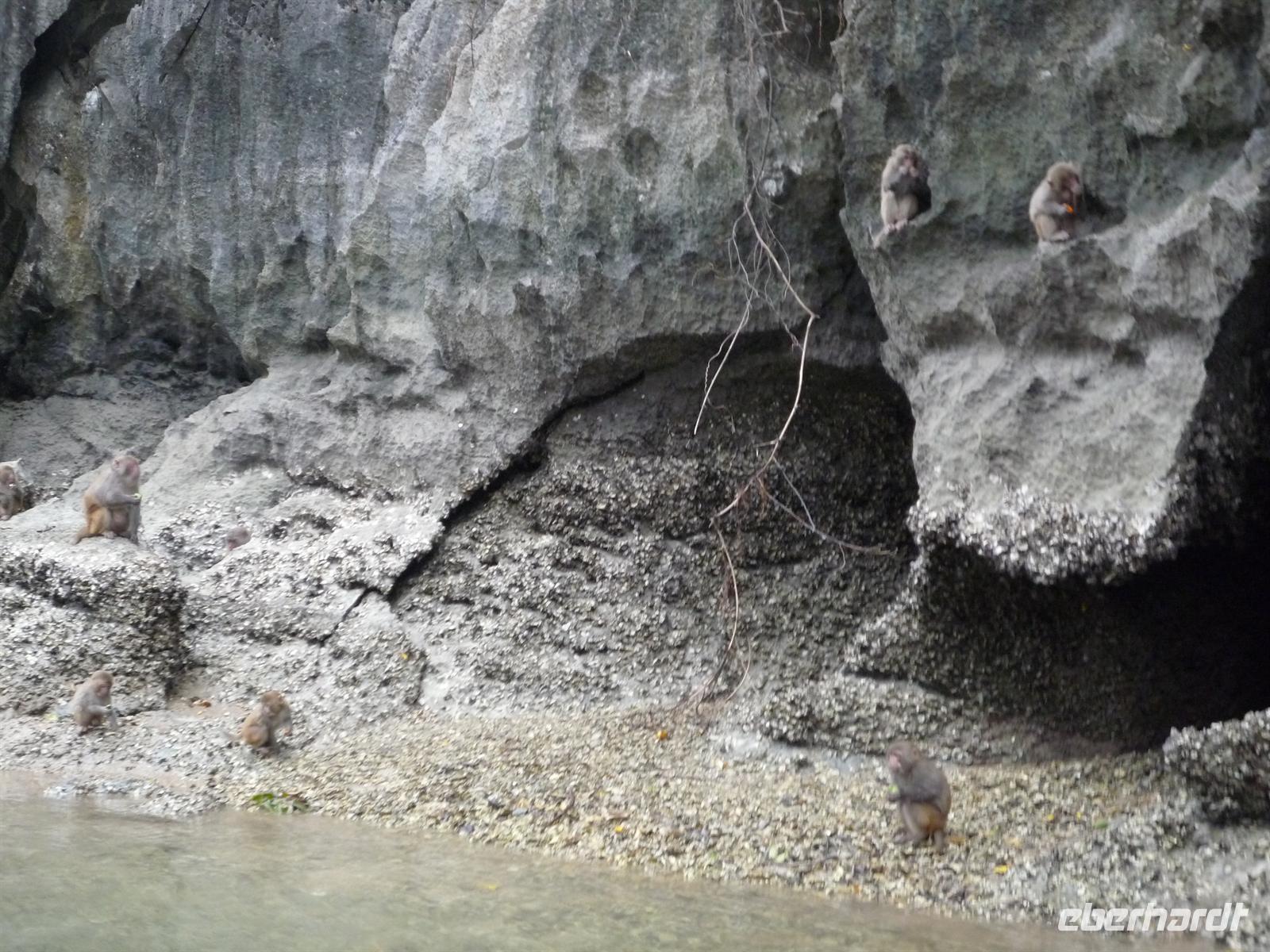 Früh morgens stehen wir auf und bekommen einen Kaffe und Kuchen oder Kekse. Anschließend unternehmen wir schon den ersten Ausflug. Wir steigen um auf kleine Boote und fahren unter einem Karstfelsen hindurch. Auf der anderen Seite begrüßen uns kleine Affen, für alle bieten sich tolle Fotomotive. Anschließend gibt es auf dem Schiff heute einen Brunch. Es gibt ein Buffet mit allerlei Köstlichkeiten. Schon gleitet unser Schiff wieder zum Hafen und gegen Mittag müssen wir uns schönes Boot verlassen.