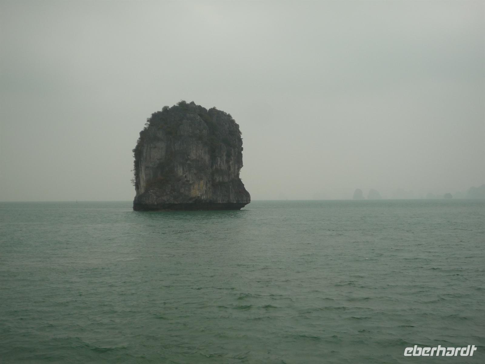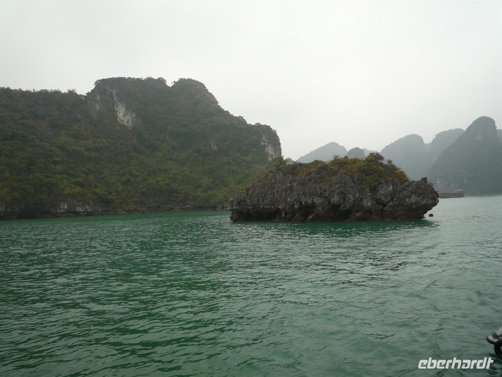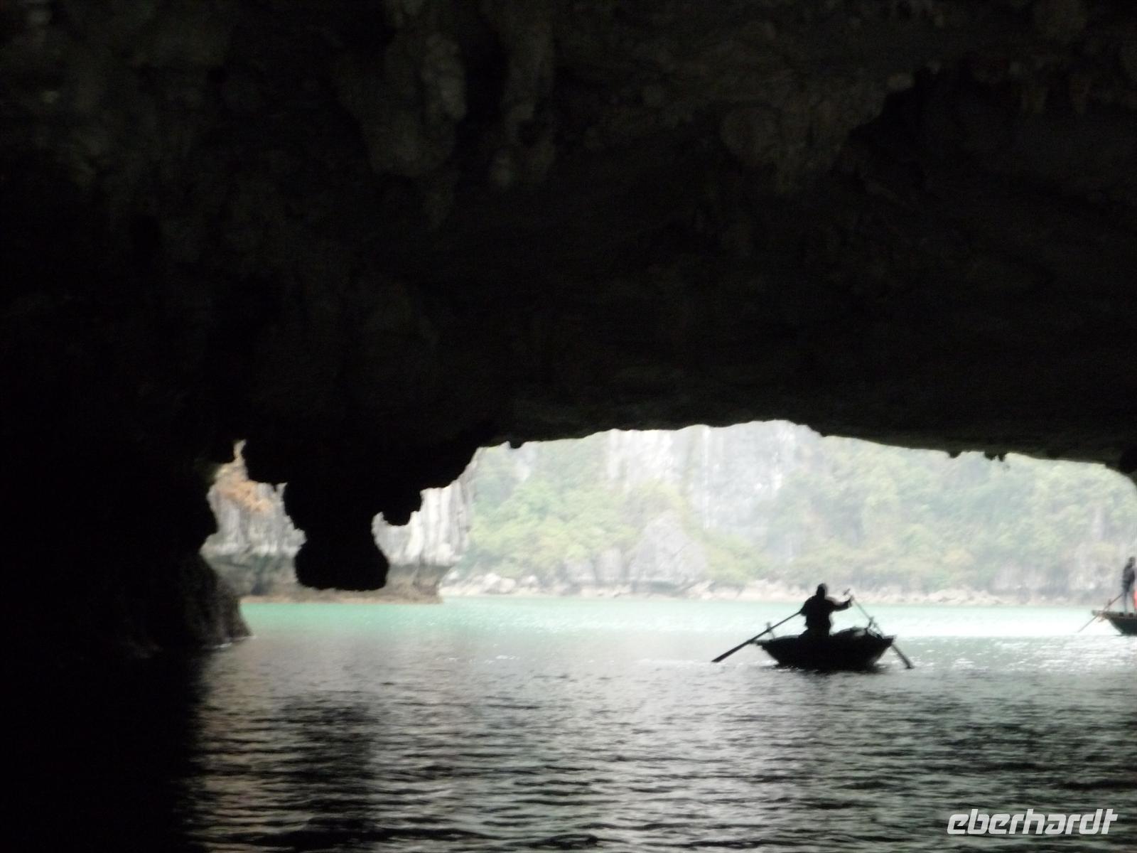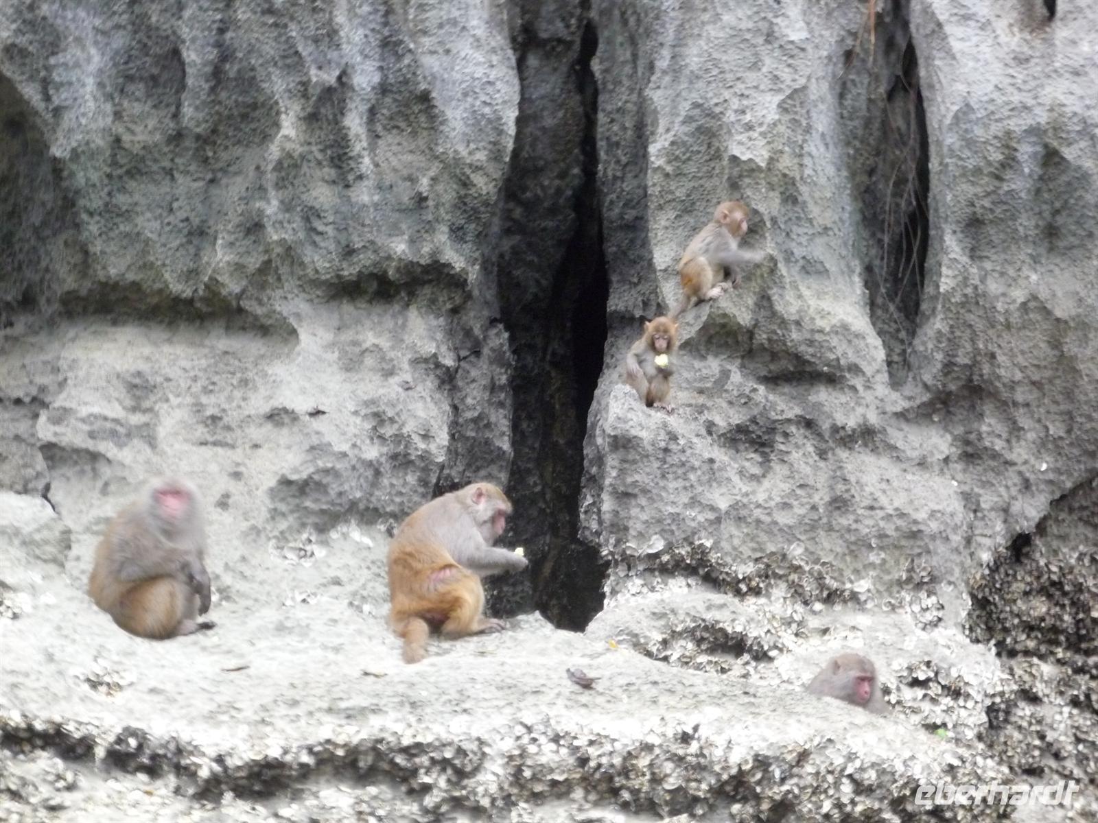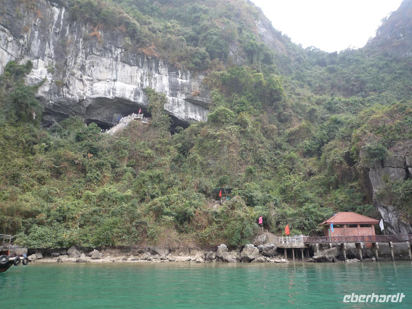 Früh morgens stehen wir auf und bekommen einen Kaffe und Kuchen oder Kekse. Anschließend unternehmen wir schon den ersten Ausflug. Wir steigen um auf kleine Boote und fahren unter einem Karstfelsen hindurch. Auf der anderen Seite begrüßen uns kleine Affen, für alle bieten sich tolle Fotomotive. Anschließend gibt es auf dem Schiff heute einen Brunch. Es gibt ein Buffet mit allerlei Köstlichkeiten. Schon gleitet unser Schiff wieder zum Hafen und gegen Mittag müssen wir uns schönes Boot verlassen.