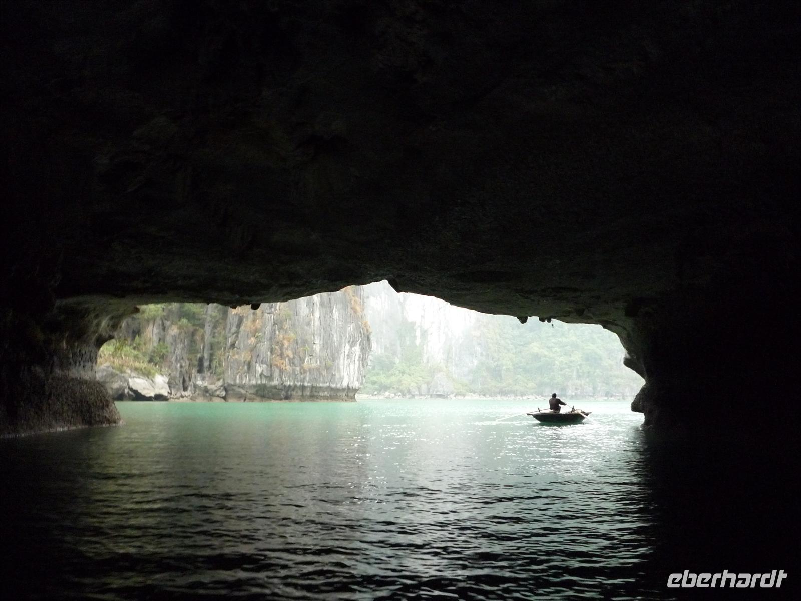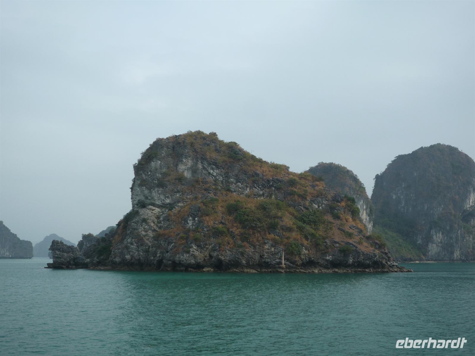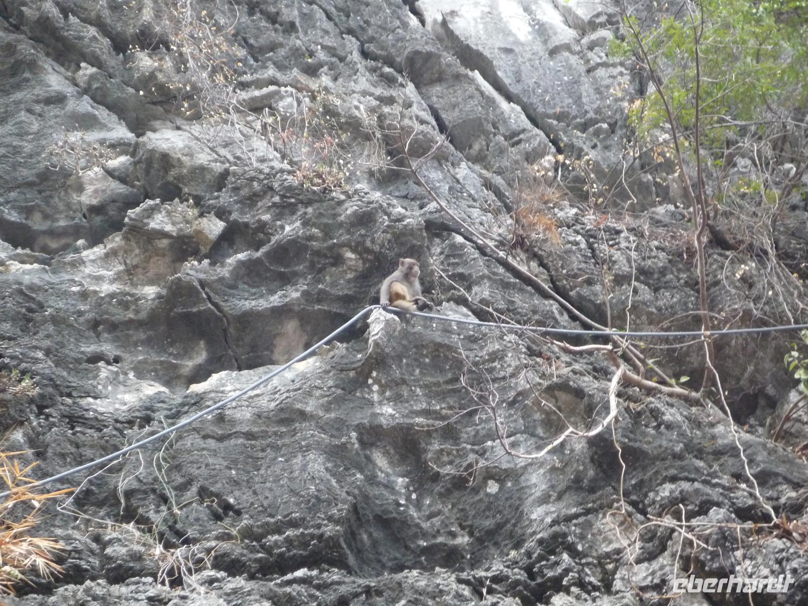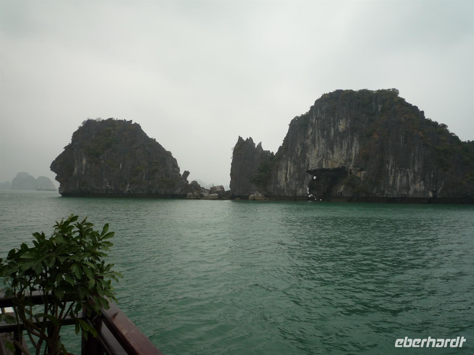 Früh morgens stehen wir auf und bekommen einen Kaffe und Kuchen oder Kekse. Anschließend unternehmen wir schon den ersten Ausflug. Wir steigen um auf kleine Boote und fahren unter einem Karstfelsen hindurch. Auf der anderen Seite begrüßen uns kleine Affen, für alle bieten sich tolle Fotomotive. Anschließend gibt es auf dem Schiff heute einen Brunch. Es gibt ein Buffet mit allerlei Köstlichkeiten. Schon gleitet unser Schiff wieder zum Hafen und gegen Mittag müssen wir uns schönes Boot verlassen.