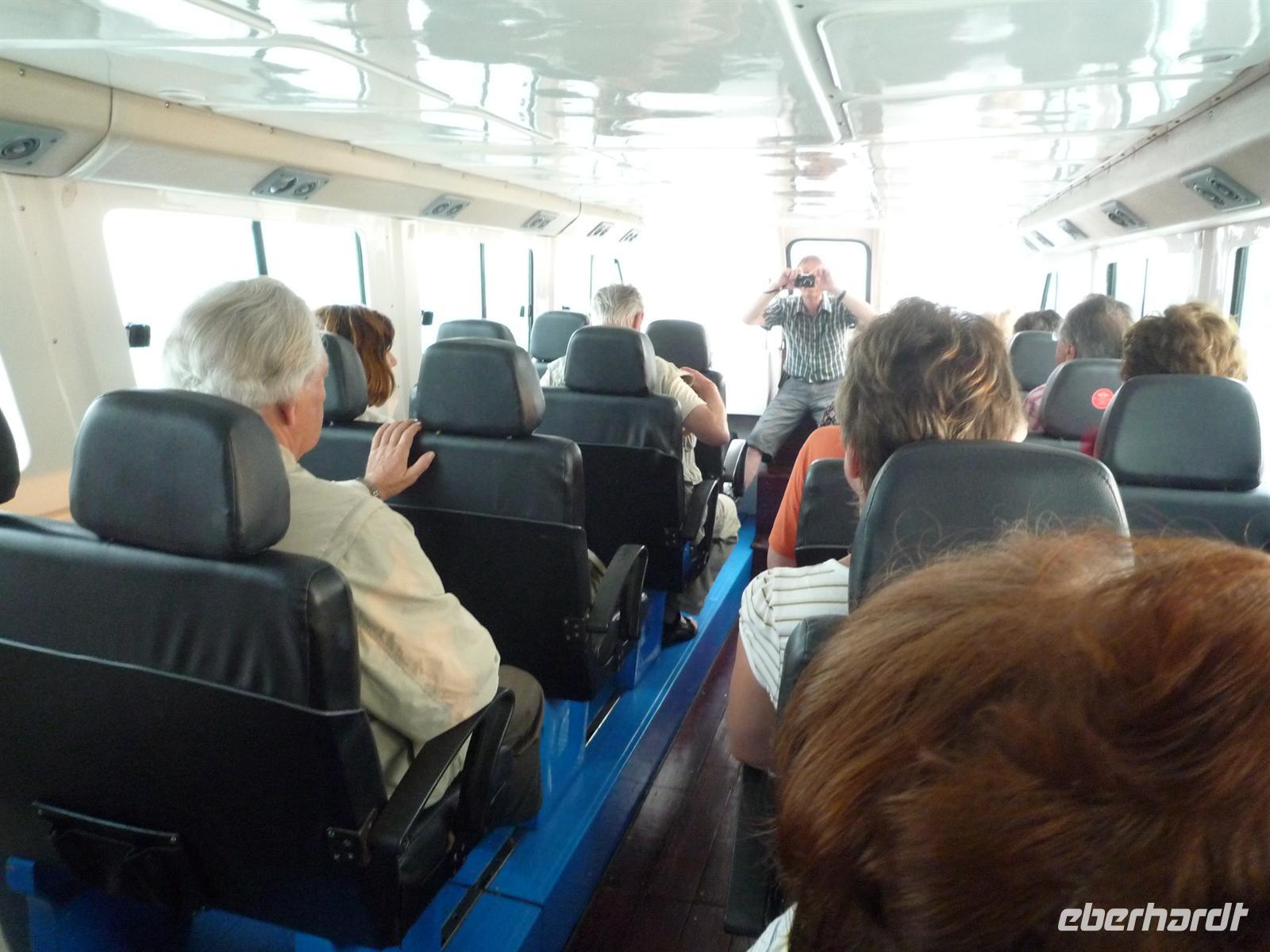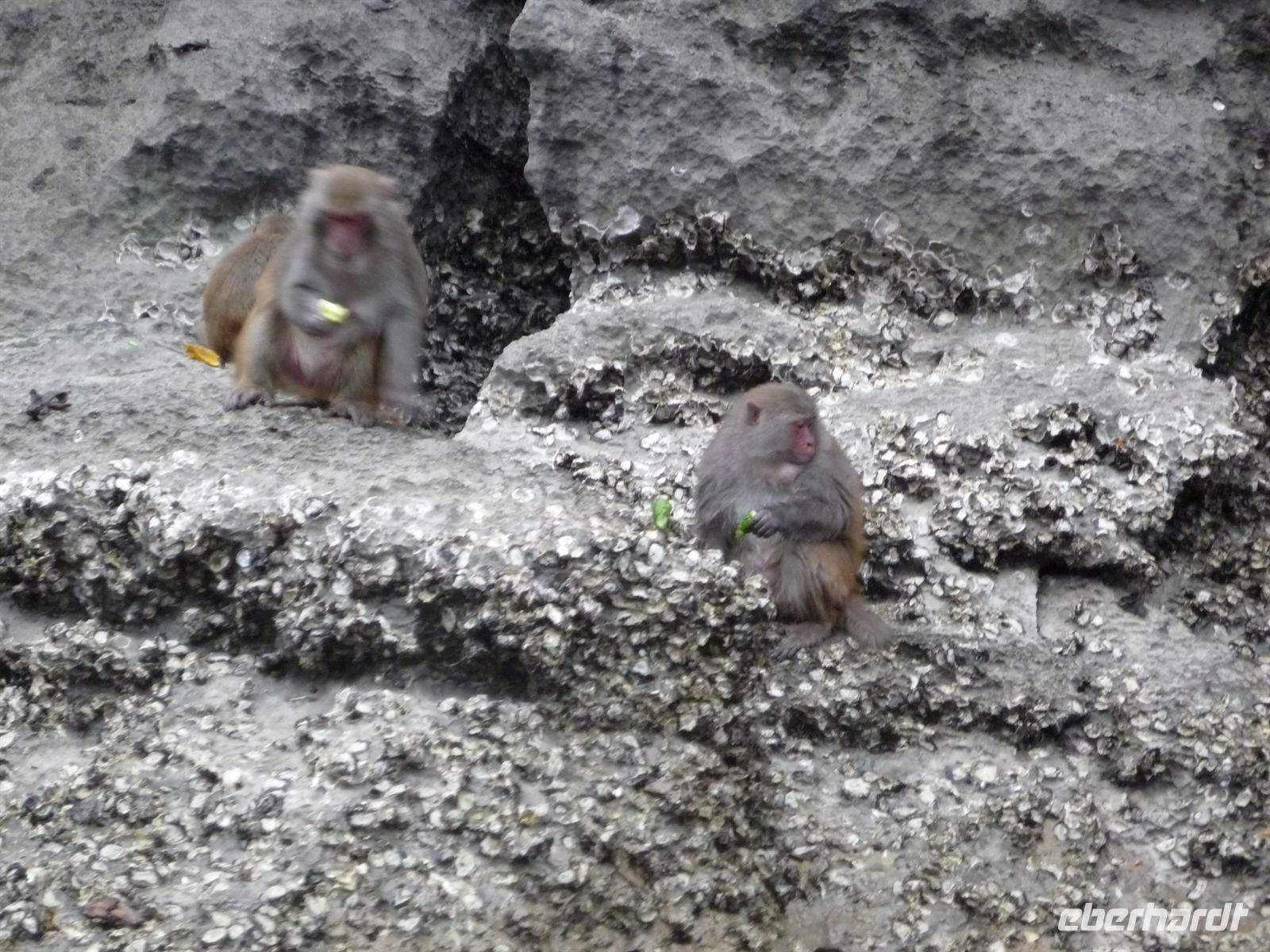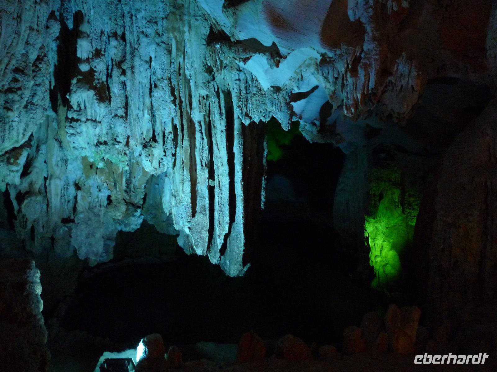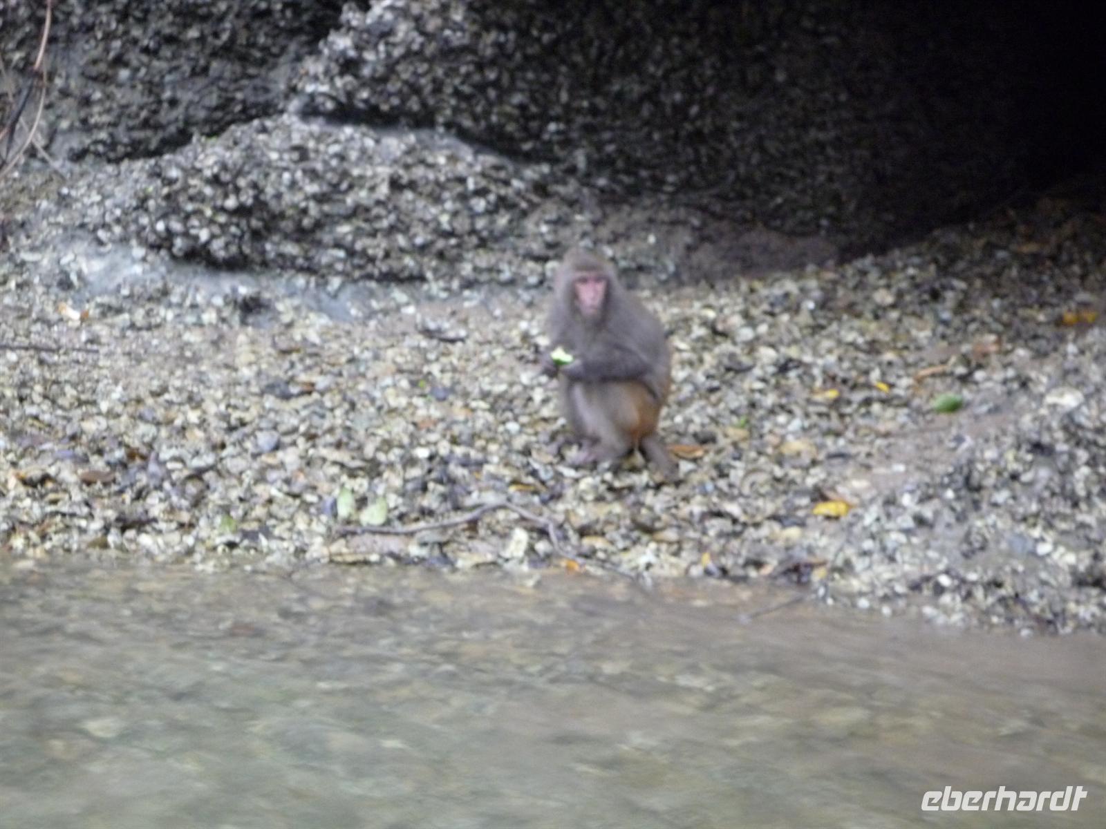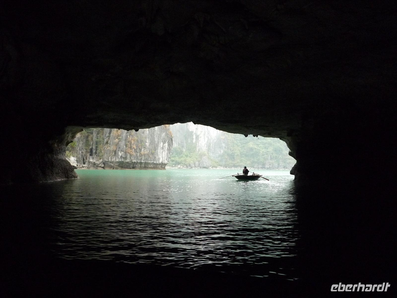 Früh morgens stehen wir auf und bekommen einen Kaffe und Kuchen oder Kekse. Anschließend unternehmen wir schon den ersten Ausflug. Wir steigen um auf kleine Boote und fahren unter einem Karstfelsen hindurch. Auf der anderen Seite begrüßen uns kleine Affen, für alle bieten sich tolle Fotomotive. Anschließend gibt es auf dem Schiff heute einen Brunch. Es gibt ein Buffet mit allerlei Köstlichkeiten. Schon gleitet unser Schiff wieder zum Hafen und gegen Mittag müssen wir uns schönes Boot verlassen.