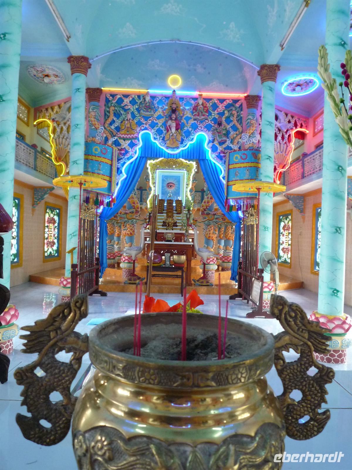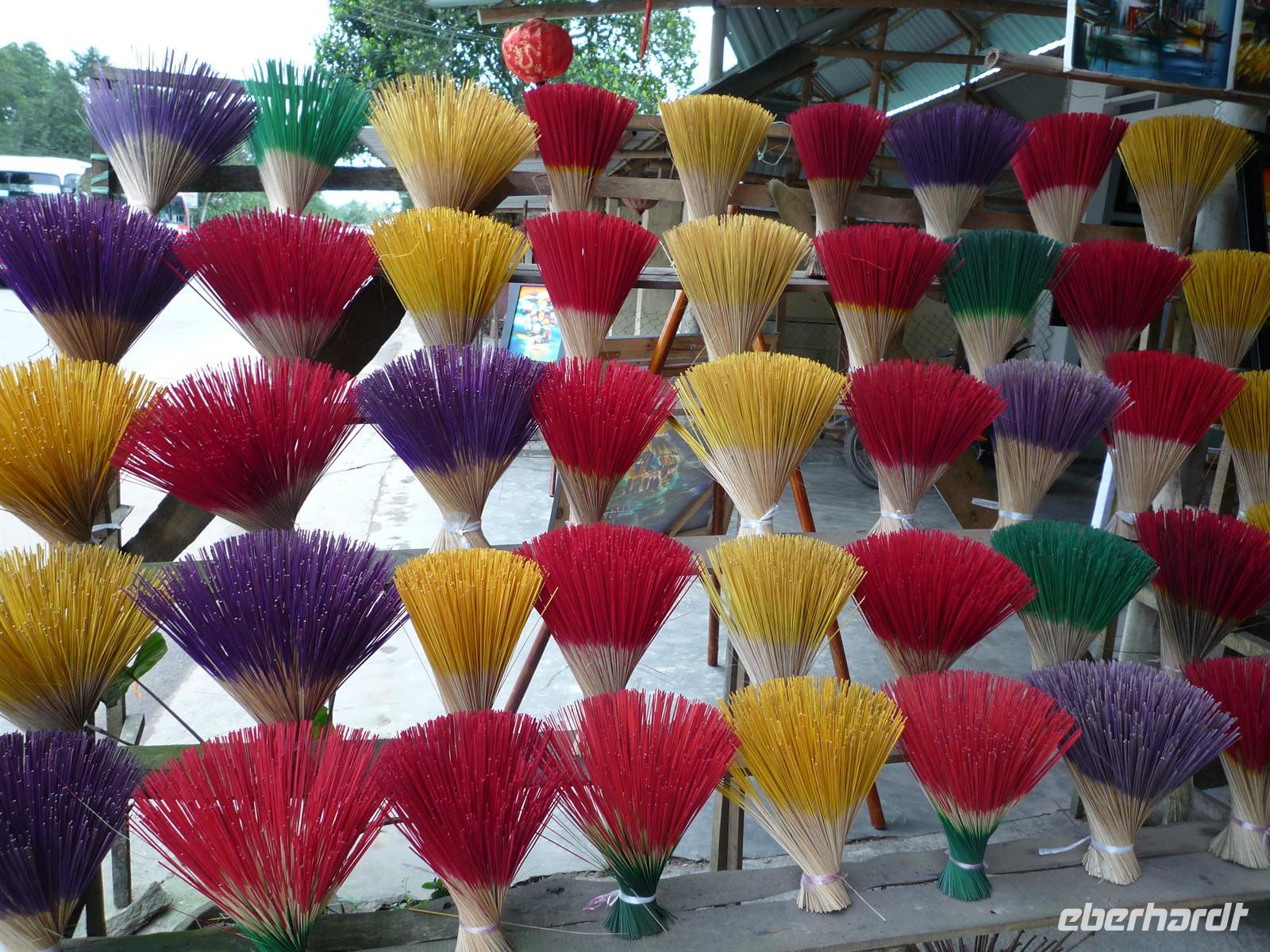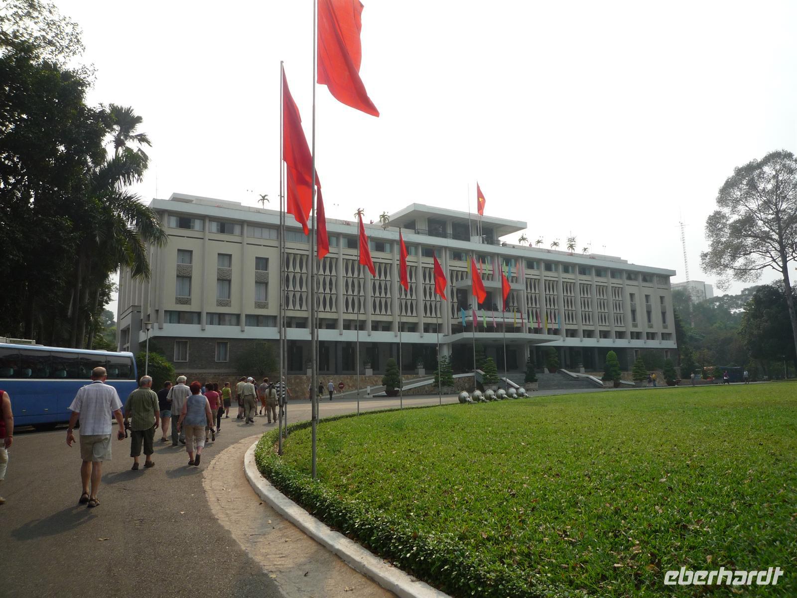 Anschließend fuhren wir nach einer stärkenden Nudelsuppe wieder in die Stadt. Dort besuchten wir zuerst das chinesische Viertel von Saigon „Cholon“, wo etwa 300000 chinesisch stämmige Menschen leben, besuchen wir die Thien-Hau-Pagode. Gebaut ab Ende des 18. Jh. ist sie vor allem wegen ihres Dachfries sehr sehenswert. Erzählt werden dabei chinesische Legenden, das ganze wirkt etwas wie eine Art Puppentheater. Unser Reiseleiter Ot kauft für die Gruppe eine Räucherspirale aus Sandelholz mit einem Wunsch für unsere Gruppe, der in Erfüllung gehen soll, wenn die Räucherkerze abgebrannt ist. Weiter geht es zum Präsidenten-Palast, den wir ausführlich besuchen. Gebaut im Baustil der sechziger Jahre und diente er bis April 1975 dem Präsidenten der Republik Vietnam als Sitz.