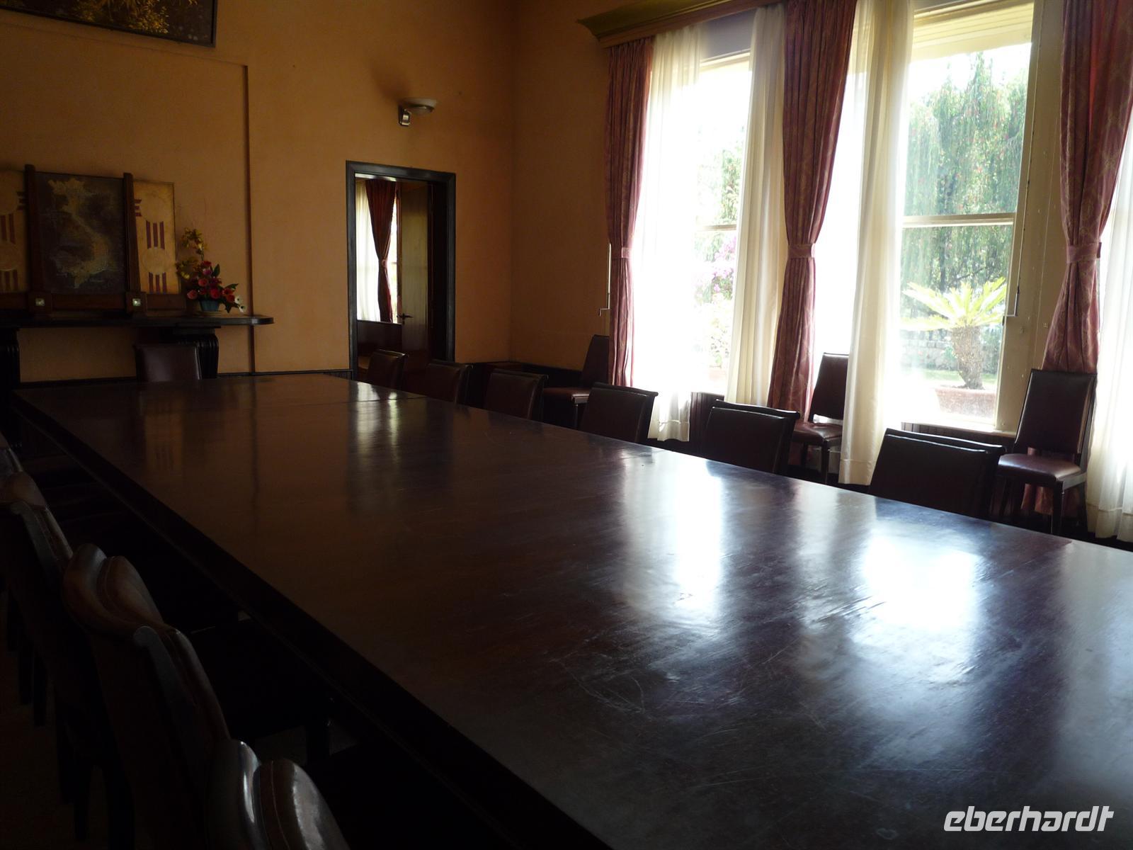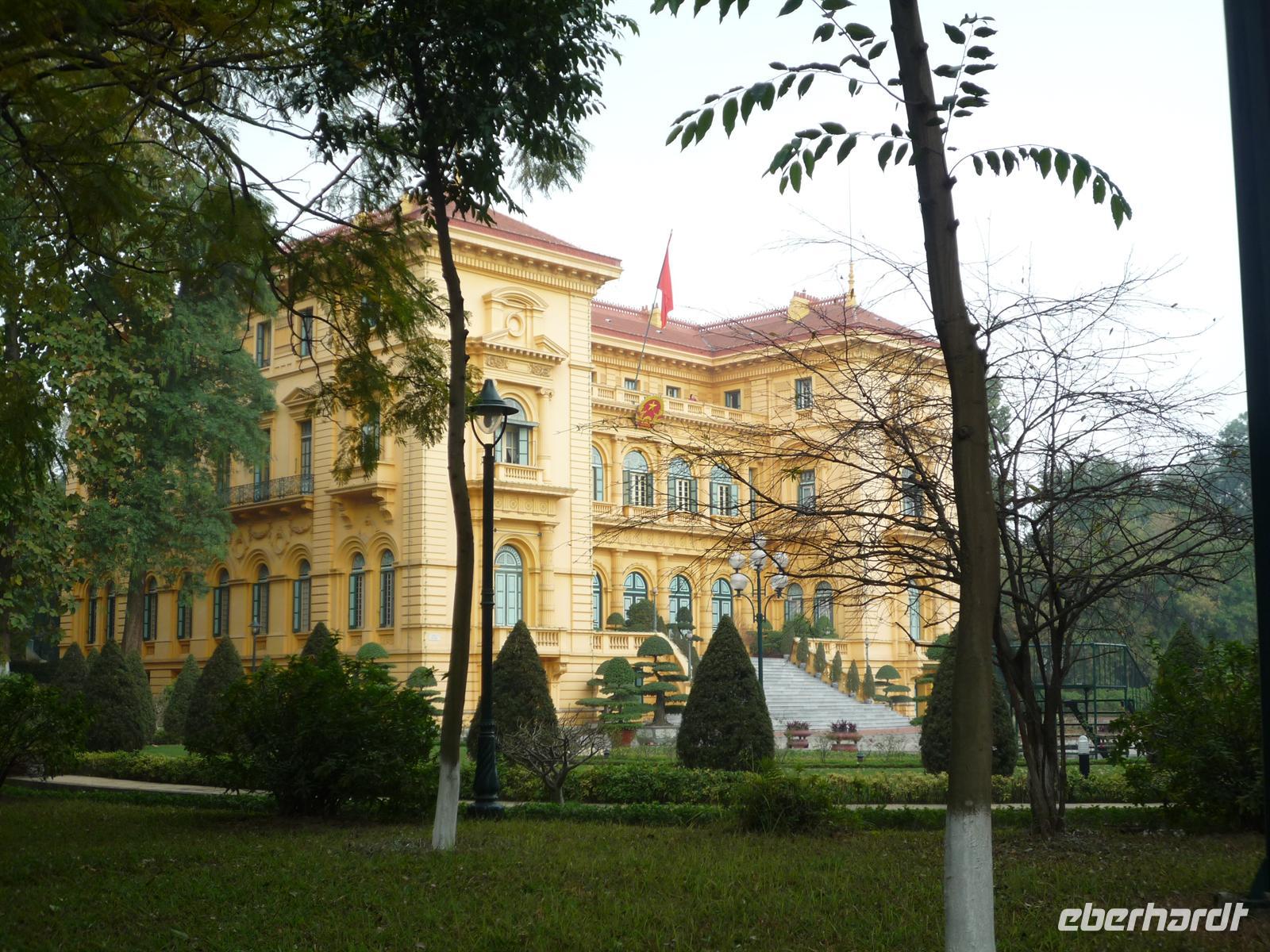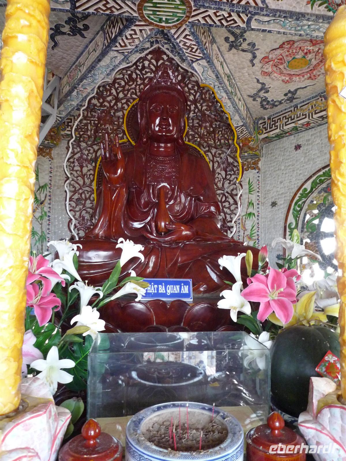 Anschließend fuhren wir nach einer stärkenden Nudelsuppe wieder in die Stadt. Dort besuchten wir zuerst das chinesische Viertel von Saigon „Cholon“, wo etwa 300000 chinesisch stämmige Menschen leben, besuchen wir die Thien-Hau-Pagode. Gebaut ab Ende des 18. Jh. ist sie vor allem wegen ihres Dachfries sehr sehenswert. Erzählt werden dabei chinesische Legenden, das ganze wirkt etwas wie eine Art Puppentheater. Unser Reiseleiter Ot kauft für die Gruppe eine Räucherspirale aus Sandelholz mit einem Wunsch für unsere Gruppe, der in Erfüllung gehen soll, wenn die Räucherkerze abgebrannt ist. Weiter geht es zum Präsidenten-Palast, den wir ausführlich besuchen. Gebaut im Baustil der sechziger Jahre und diente er bis April 1975 dem Präsidenten der Republik Vietnam als Sitz.
