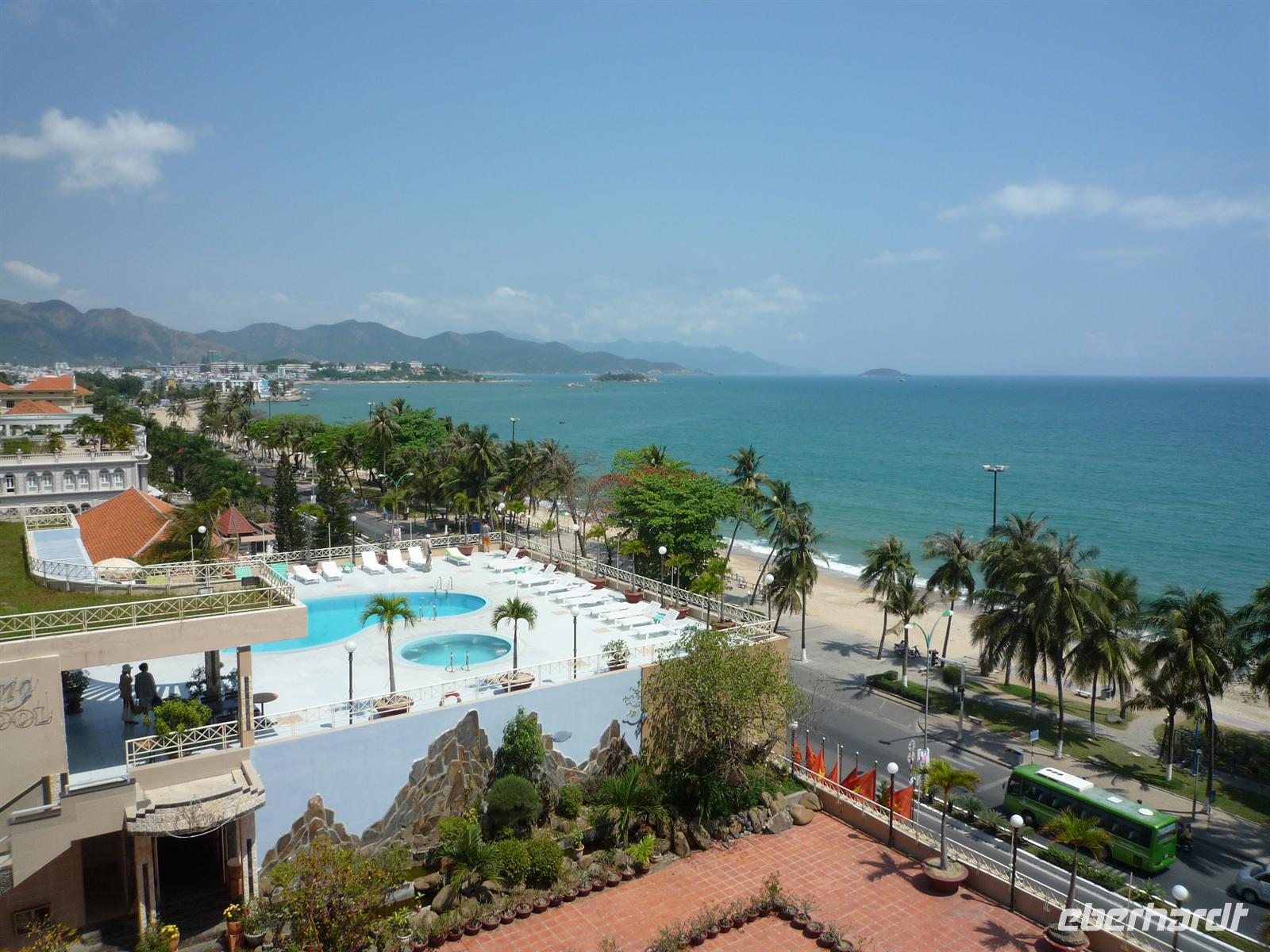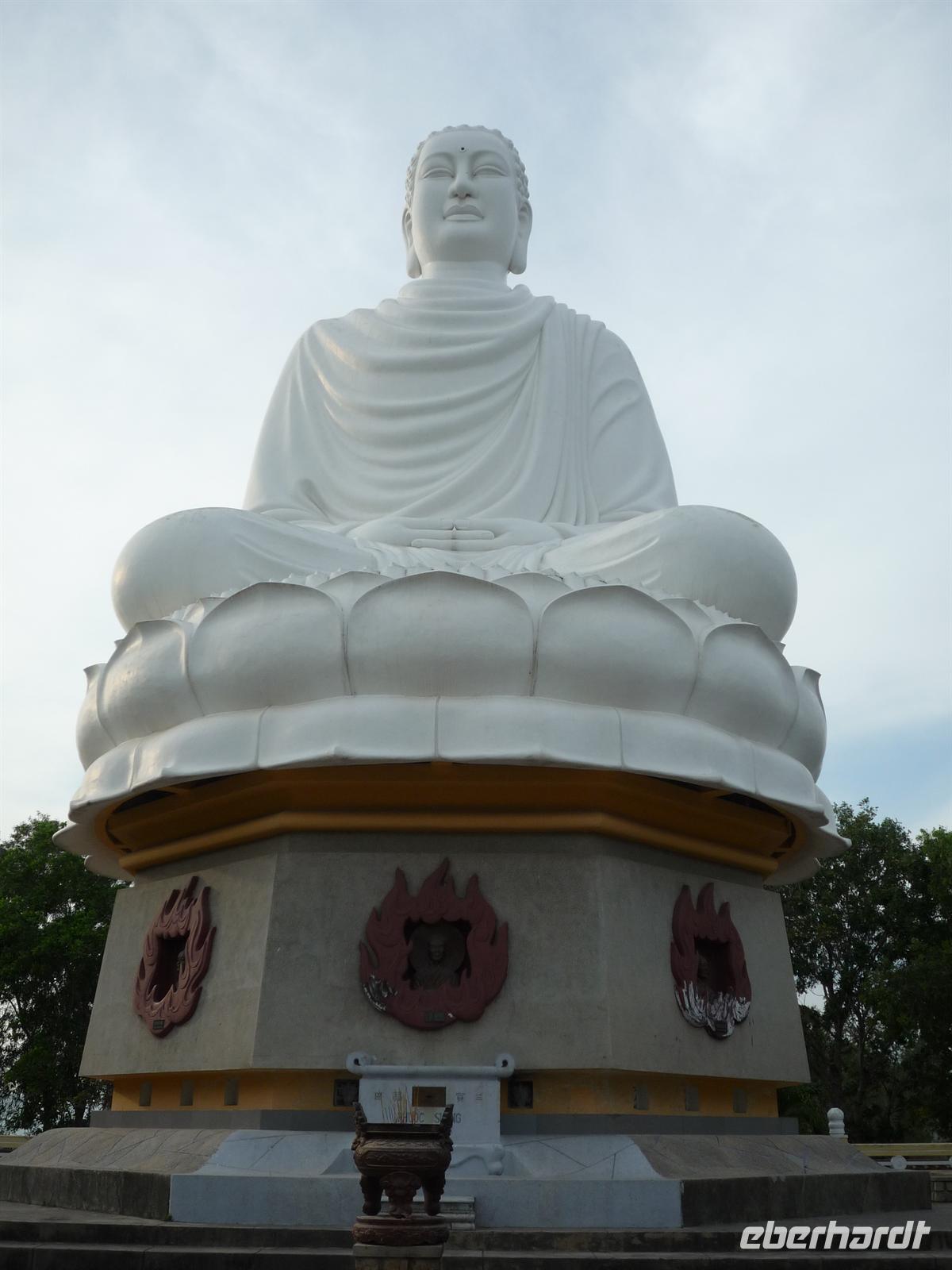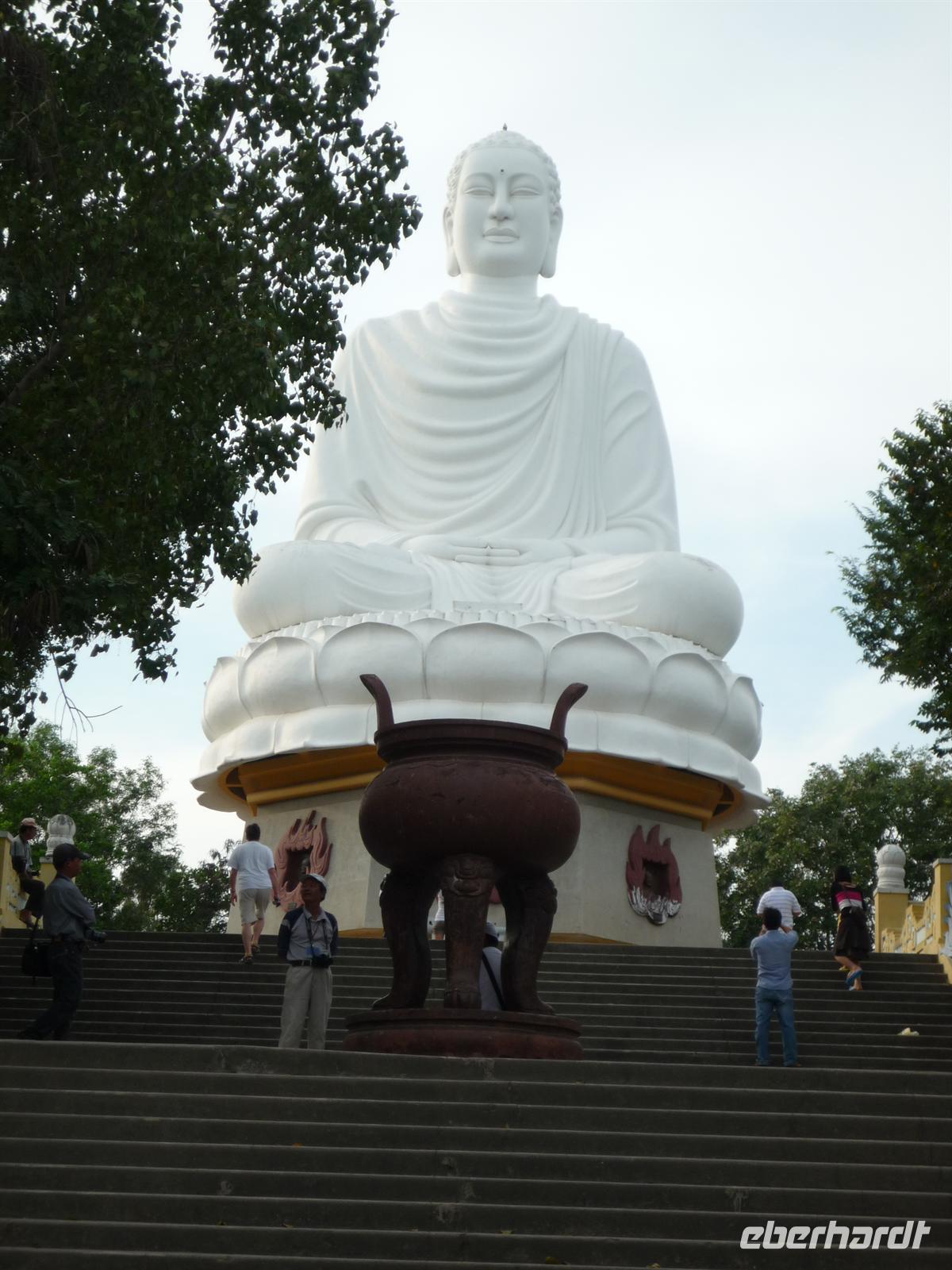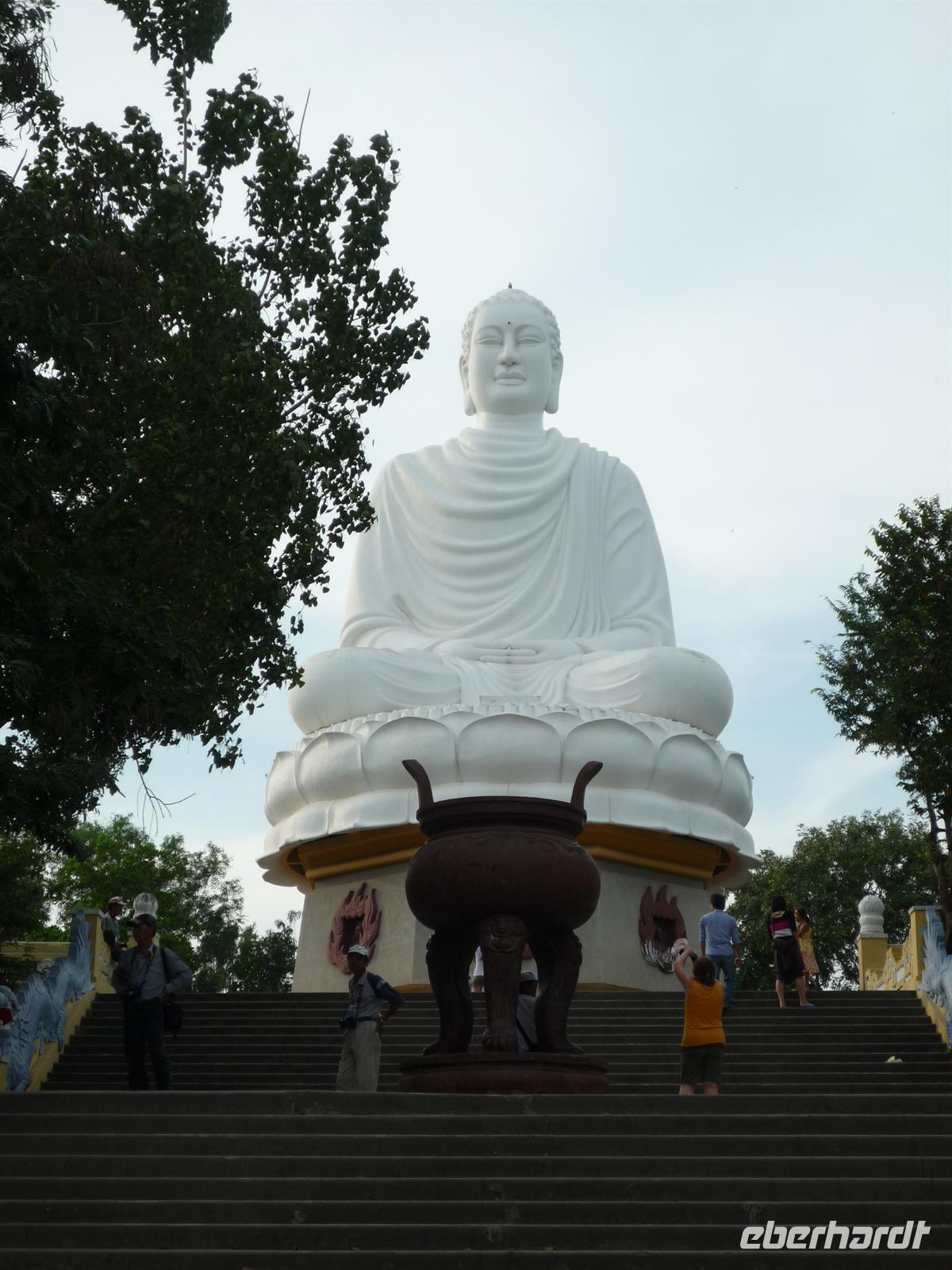 Heute müssen wir einige Kilometer vom Bergland in Richtung Meer zurücklegen. Die Landschaft ist herrlich, hinter jeder Kurve eröffnen sich neue Bergpanoramen. Wir stoppen an der Straße, wo Kaffee am Straßenrand getrocknet wird und verkosten diesen dann auch gleich in einem kleinen Café. Besonders hier schmeckt der Kaffee sehr gut, aber auch auf der ganzen Reise begleitet uns der kräftigte, schmackhafte Kaffee. Wichtig ist nur, dass er ohne Eis bestellt wird, denn die Vietnamesen trinken ihn gern mit Eis, was für uns sehr ungewöhnlich war. Unterwegs sehen wir auch, wie Kaffee angebaut wird. Pro Kaffeestrauch werden etwa 4 kg Bohnen geerntet, nach der Trocknung bleibt die Hälfte davon übrig. Die Sträucher blühen von Februar bis Mai, ihre Blüte riecht fast wie Jasmin. Geerntet wird etwa von November bis Januar, eine Ernte ist pro Jahr möglich. Nach weiteren Fotostopps und einem Halt in einem kleinen, typischen Dorf erreichen wir gegen Mittag Nha Trang. Nha Trang wird auch als die „Cote´d Azur“ Vietnams bezeichnet, da die Stadt herrlich am Meer gelegen ist. Mittlerweile werden unzählige Hotels gebucht und überall sind Baustellen zu sehen. Nach dem Mittagessen besuchen wir das Aquarium, wo wir viel über die Fischwelt erfahren und anschließend die Long-Son Pagode mit der weißen Buddha-Statue, die über die Stadt wacht. Diese wurde 1963 als Symbol der Buddhisten gegen das damals herrschende Diem-Regime errichtet. Eine der Heldenfiguren war der Mönch Thich Quang Duc, welcher mit einer Selbstverbrennung gegen die Diskriminierung der Buddhisten protestierte.