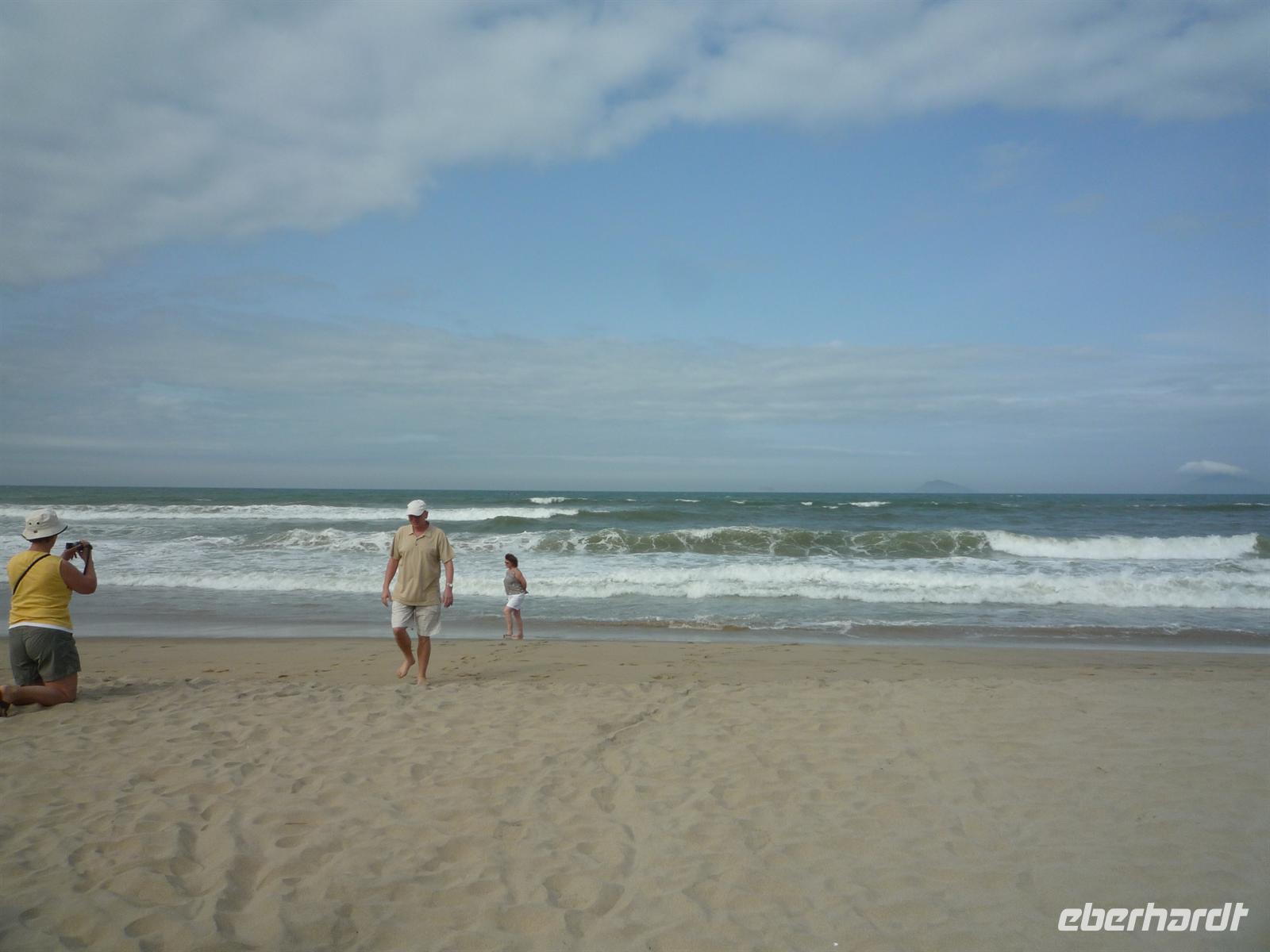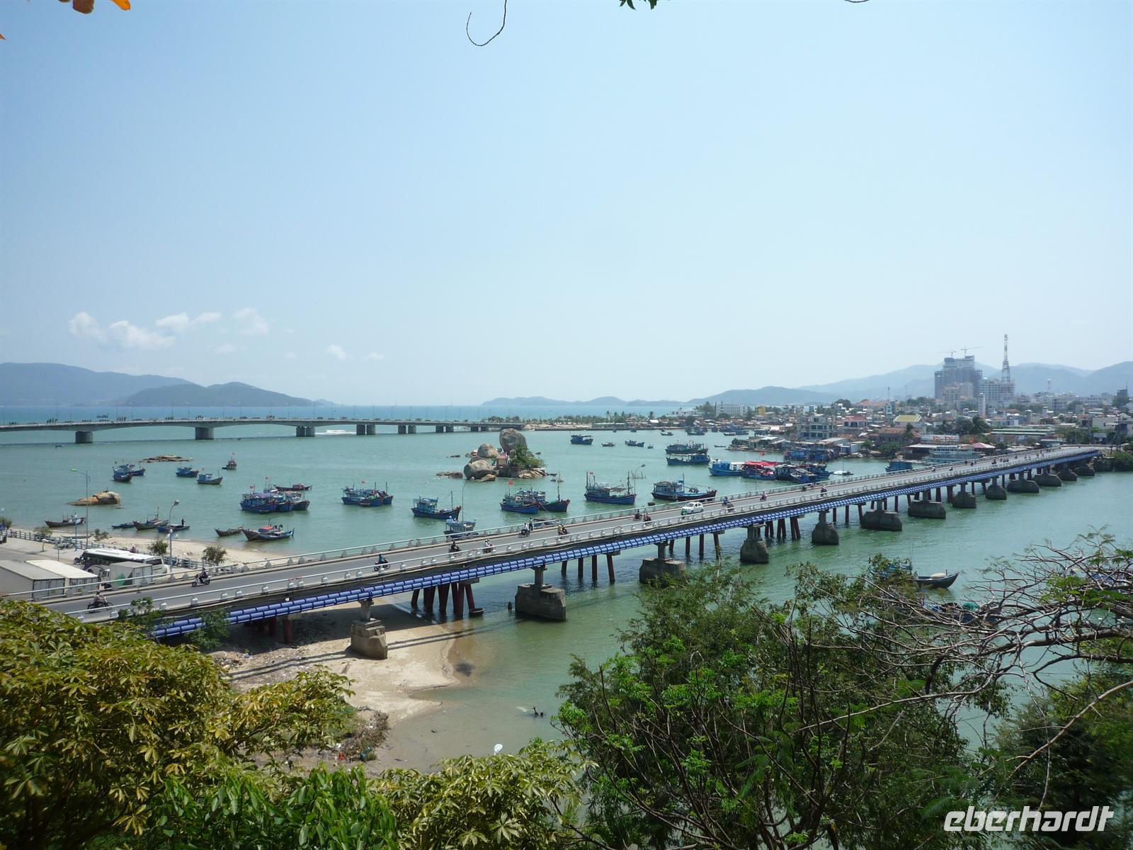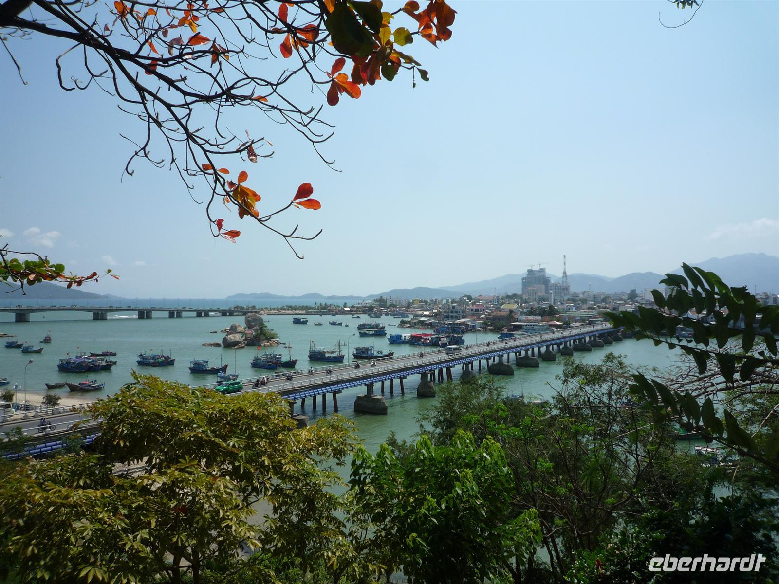 Heute müssen wir einige Kilometer vom Bergland in Richtung Meer zurücklegen. Die Landschaft ist herrlich, hinter jeder Kurve eröffnen sich neue Bergpanoramen. Wir stoppen an der Straße, wo Kaffee am Straßenrand getrocknet wird und verkosten diesen dann auch gleich in einem kleinen Café. Besonders hier schmeckt der Kaffee sehr gut, aber auch auf der ganzen Reise begleitet uns der kräftigte, schmackhafte Kaffee. Wichtig ist nur, dass er ohne Eis bestellt wird, denn die Vietnamesen trinken ihn gern mit Eis, was für uns sehr ungewöhnlich war. Unterwegs sehen wir auch, wie Kaffee angebaut wird. Pro Kaffeestrauch werden etwa 4 kg Bohnen geerntet, nach der Trocknung bleibt die Hälfte davon übrig. Die Sträucher blühen von Februar bis Mai, ihre Blüte riecht fast wie Jasmin. Geerntet wird etwa von November bis Januar, eine Ernte ist pro Jahr möglich. Nach weiteren Fotostopps und einem Halt in einem kleinen, typischen Dorf erreichen wir gegen Mittag Nha Trang. Nha Trang wird auch als die „Cote´d Azur“ Vietnams bezeichnet, da die Stadt herrlich am Meer gelegen ist. Mittlerweile werden unzählige Hotels gebucht und überall sind Baustellen zu sehen. Nach dem Mittagessen besuchen wir das Aquarium, wo wir viel über die Fischwelt erfahren und anschließend die Long-Son Pagode mit der weißen Buddha-Statue, die über die Stadt wacht. Diese wurde 1963 als Symbol der Buddhisten gegen das damals herrschende Diem-Regime errichtet. Eine der Heldenfiguren war der Mönch Thich Quang Duc, welcher mit einer Selbstverbrennung gegen die Diskriminierung der Buddhisten protestierte.