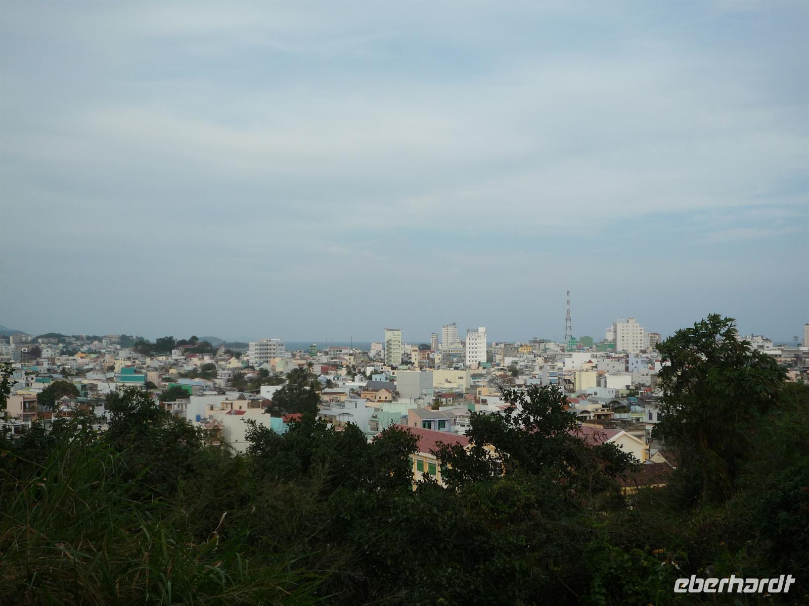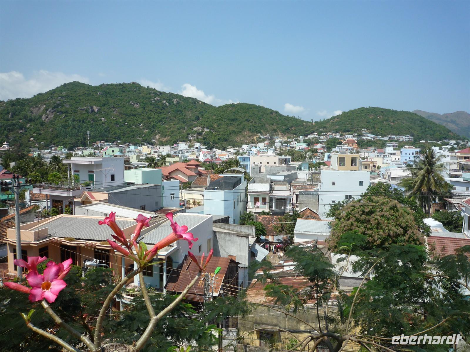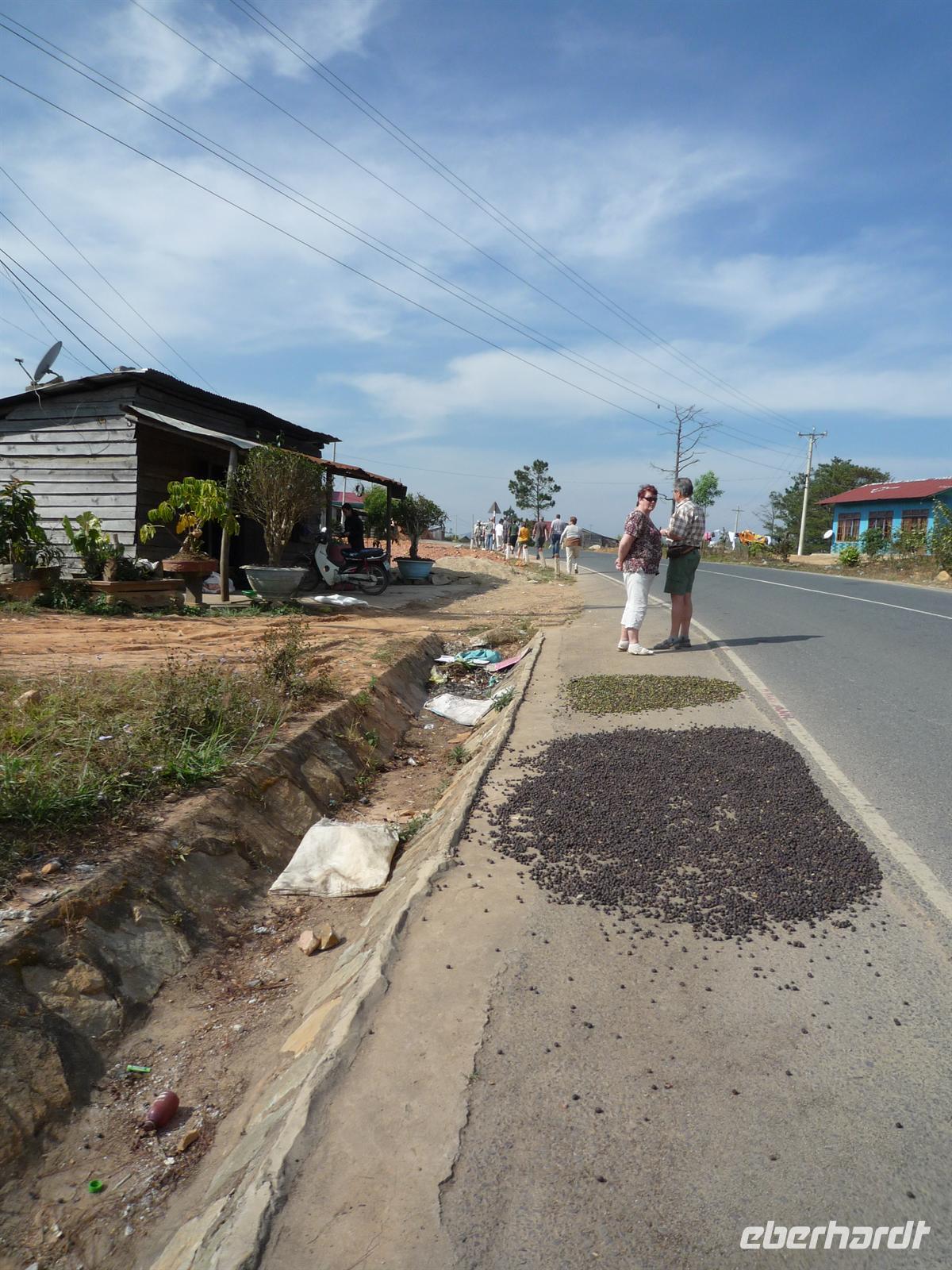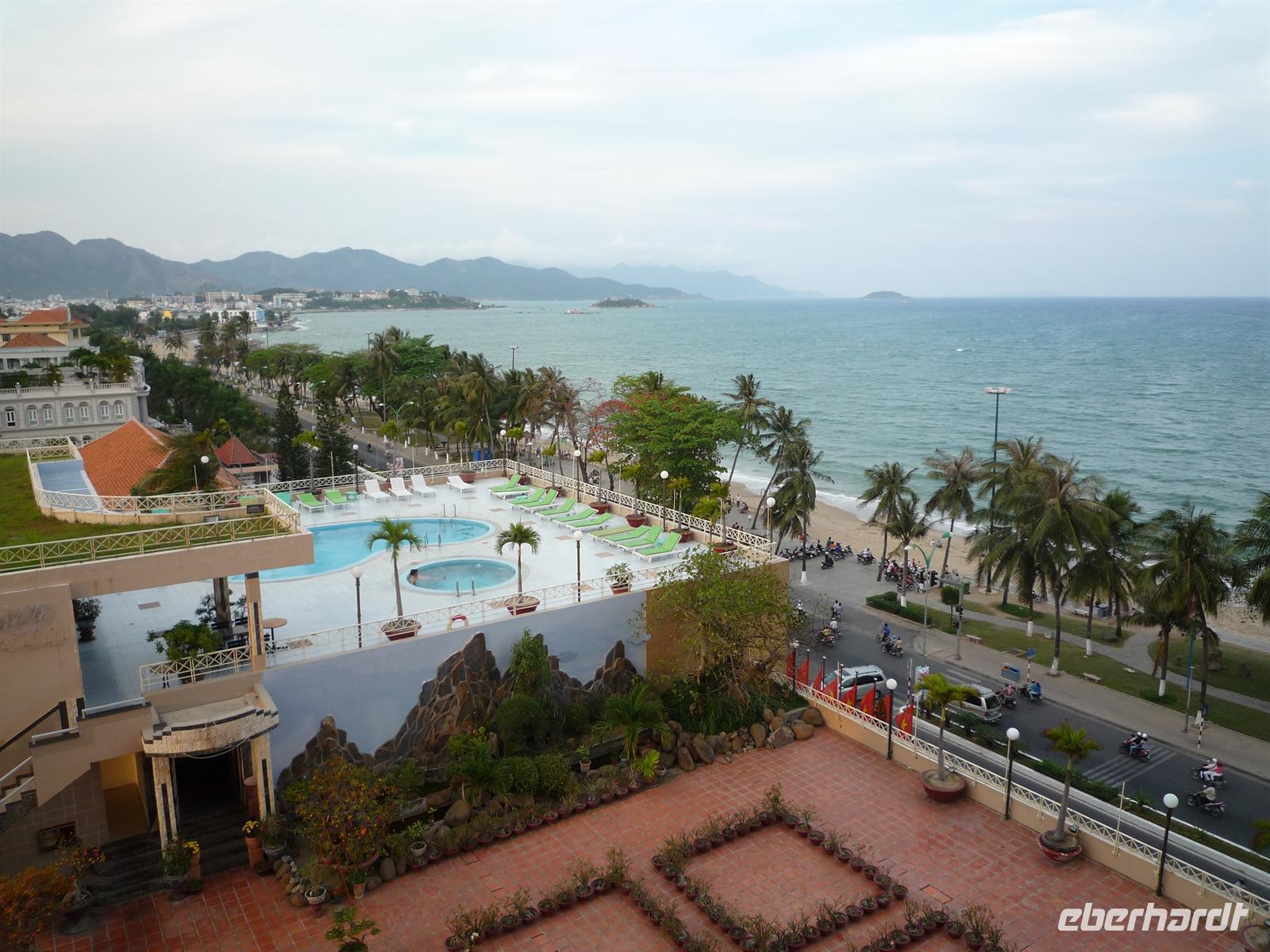 Heute müssen wir einige Kilometer vom Bergland in Richtung Meer zurücklegen. Die Landschaft ist herrlich, hinter jeder Kurve eröffnen sich neue Bergpanoramen. Wir stoppen an der Straße, wo Kaffee am Straßenrand getrocknet wird und verkosten diesen dann auch gleich in einem kleinen Café. Besonders hier schmeckt der Kaffee sehr gut, aber auch auf der ganzen Reise begleitet uns der kräftigte, schmackhafte Kaffee. Wichtig ist nur, dass er ohne Eis bestellt wird, denn die Vietnamesen trinken ihn gern mit Eis, was für uns sehr ungewöhnlich war. Unterwegs sehen wir auch, wie Kaffee angebaut wird. Pro Kaffeestrauch werden etwa 4 kg Bohnen geerntet, nach der Trocknung bleibt die Hälfte davon übrig. Die Sträucher blühen von Februar bis Mai, ihre Blüte riecht fast wie Jasmin. Geerntet wird etwa von November bis Januar, eine Ernte ist pro Jahr möglich. Nach weiteren Fotostopps und einem Halt in einem kleinen, typischen Dorf erreichen wir gegen Mittag Nha Trang. Nha Trang wird auch als die „Cote´d Azur“ Vietnams bezeichnet, da die Stadt herrlich am Meer gelegen ist. Mittlerweile werden unzählige Hotels gebucht und überall sind Baustellen zu sehen. Nach dem Mittagessen besuchen wir das Aquarium, wo wir viel über die Fischwelt erfahren und anschließend die Long-Son Pagode mit der weißen Buddha-Statue, die über die Stadt wacht. Diese wurde 1963 als Symbol der Buddhisten gegen das damals herrschende Diem-Regime errichtet. Eine der Heldenfiguren war der Mönch Thich Quang Duc, welcher mit einer Selbstverbrennung gegen die Diskriminierung der Buddhisten protestierte.
