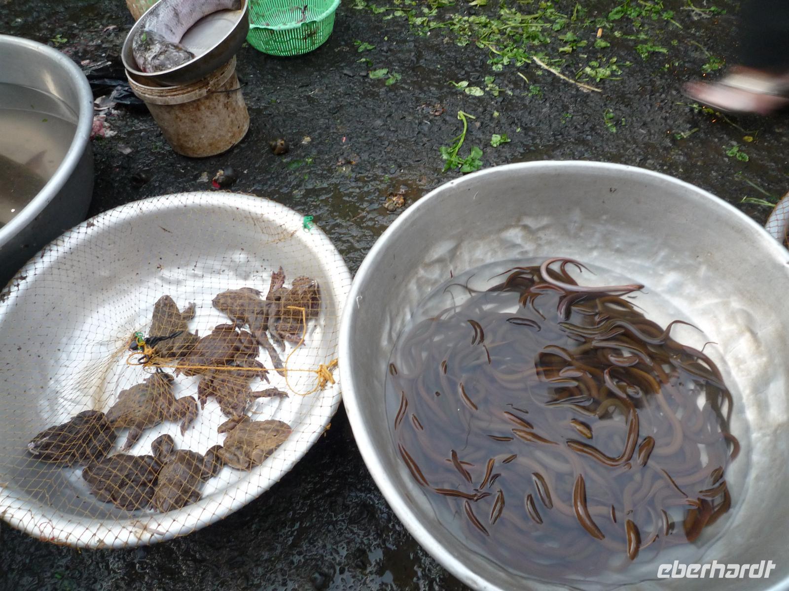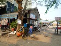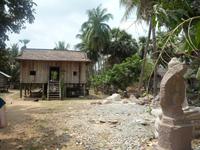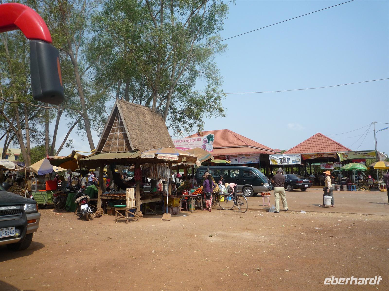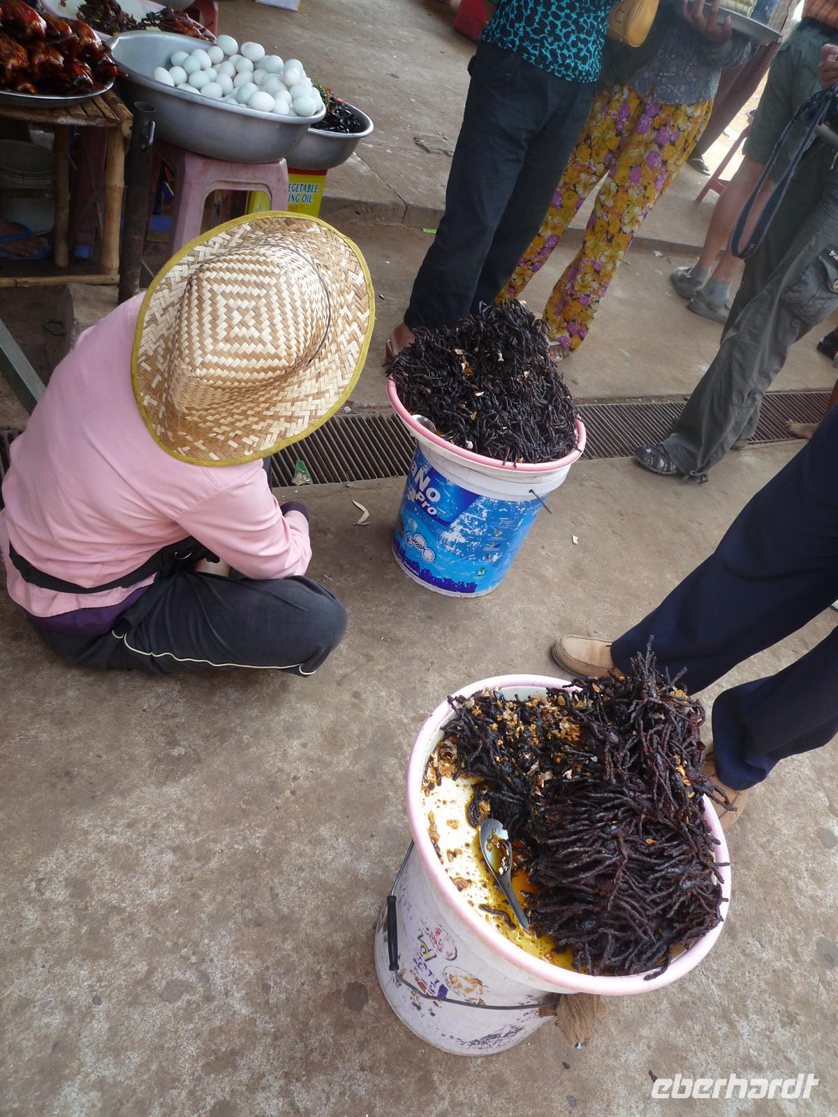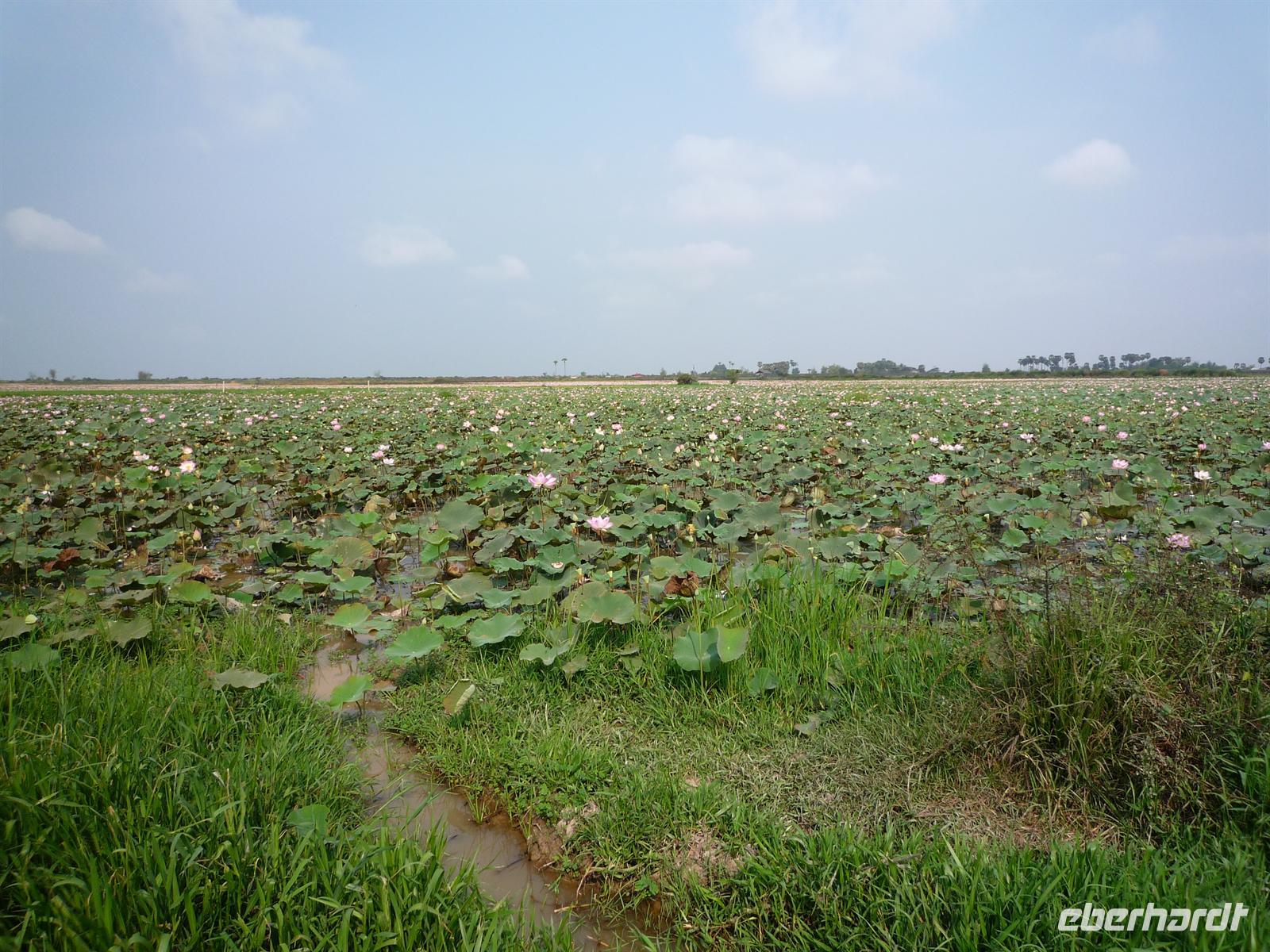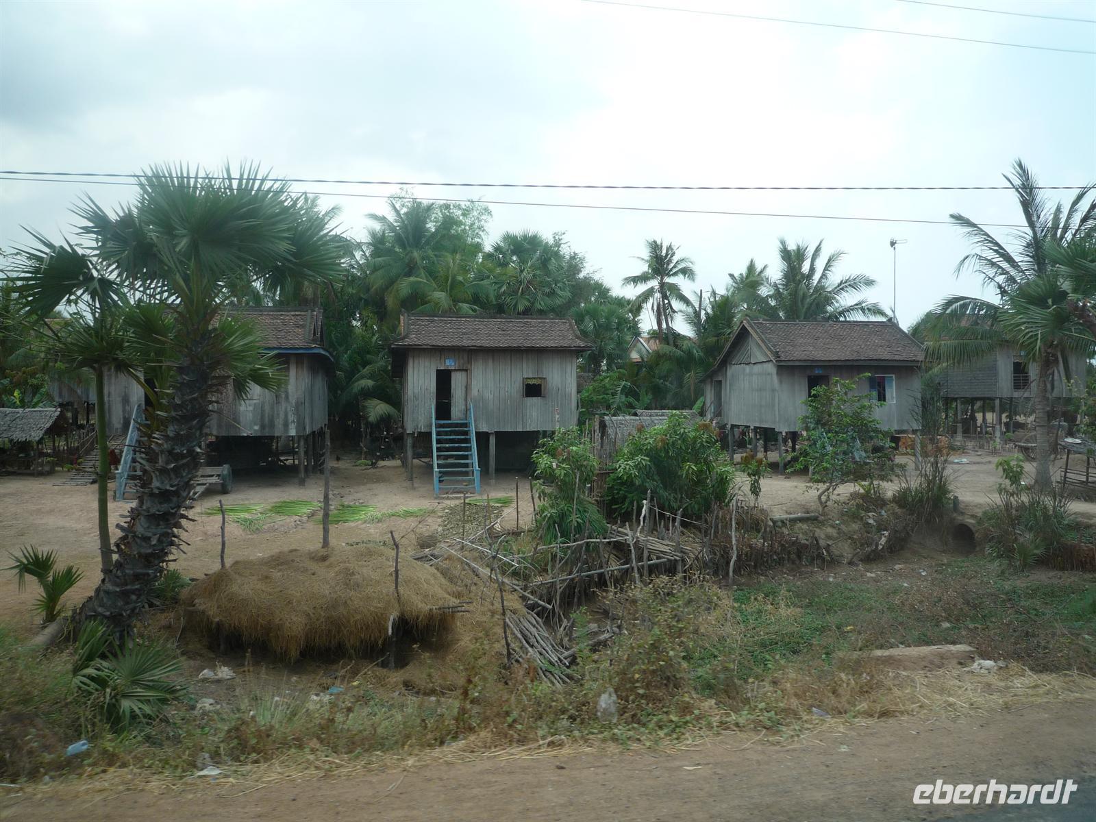 Nach dem Frühstück verlassen wir die Hauptstadt Kambodschas. Begrüßt werden wir heute von unseren Reiseleiter für die nächsten Tage, Thol. Er ist aus Siem Reap gekommen um uns abzuholen. Gemeinsam haben wir heute über 300 Kilometer zurück zu legen. Nachdem wir die Hauptstadt hinter uns gelassen haben geht die Fahrt zügig voran. Unterwegs wird die Straße von Reisfeldern und mit Lotusblüten übersäten Teichen geprägt. Nach gut zwei Stunden halten wir an einem Markt, dessen Spezialität gebratene Spinnen, Heuschrecken und Frösche sind. Ein ganz mutiger kauft sich für einen Dollar vier Spinnen. Zur Verkostung wagt sich dieses Mal keiner. Auf der Fahrt erklärt uns Thol eine ganze Menge wissenswertes zum Land. So erfahren wir, dass von den etwa 30 Mio. Einwohnern 79% als Bauern arbeiten. Die Schulpflicht beträgt neun Jahre, allerdings gehen 11% der Kinder nicht zur Schule, da es in ihren Dörfern keine Schule gibt und die nächste sehr weit weg ist. In einer Klasse lernen bis zu 60 Kinder. Natürlich kann man die Schule auch bis zum Abitur besuchen und danach auf einer der 43 Universitäten im Land studieren. 23% der Bevölkerung sind Studenten. Zum studieren ist allerdings auch Geld notwendig, pro Jahr etwa 5000 USD. Zwei mal im Jahr wird Reis geerntet, der meiste Reis wird exportiert, Hauptabnehmer sind Vietnam und Europa, hier wiederum Deutschland. Für die Einheimischen kostet ein Kilogramm Reis je nach Qualität 800 bis 1300 Riel. 4000 Riel entsprechen einem US-Dollar. Wenig später halten wir in einem Dorf, wo noch alte Pfahlhäuser stehen. Die alten Häuser sind noch ohne einen Nagel gebaut, nur mit Holzsplinten. Diese traditionelle Architektur ist in Kambodscha weit verbreitet. Wegen Hochwasser, den hohen Temperaturen und Tieren wird auf Stelzen gebaut. In den Häusern gibt es meist nur einen Raum, manchmal ist ein extra Zimmer für die Mädchen da, aber meist wird der Raum nur durch Vorhänge getrennt. Zum einfachen Mittagsessen sind wir bei Einheimischen in einem Restaurant. Etwa 50 Kilometer vor Siem Reap sehen wir uns noch eine sogenannte Naga-Brücke an. Die Enden der Brücke sind mit Naga-Köpfen verziert, sieben Stück, denn eine ungerade Zahl bringt Glück. Nach unserer Ankunft in Siem Reap beziehen wir unser Hotel. Vor dem Abendessen machen wir noch einen Bummel durch die beleuchteten Straßen des Zentrums und dem Nachtmarkt. Zahlreiche Köstlichkeiten der Khmer-Küche konnten wir zum Abendessen in einem Buffet-Restaurant probieren.