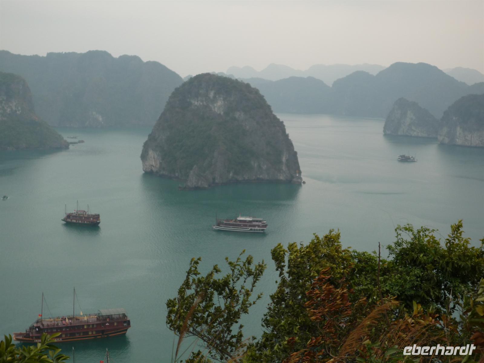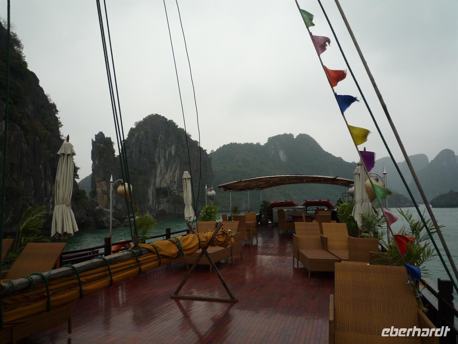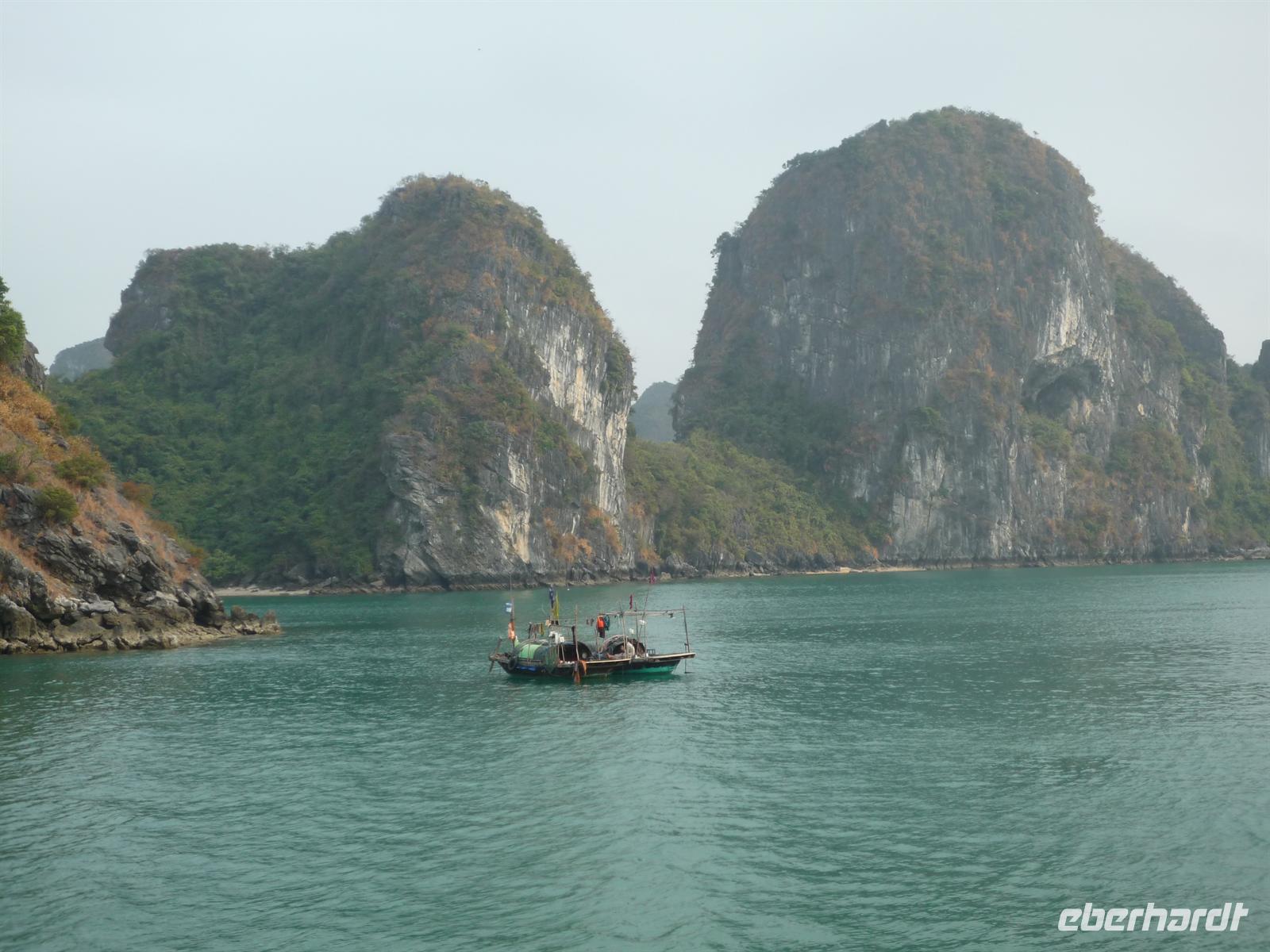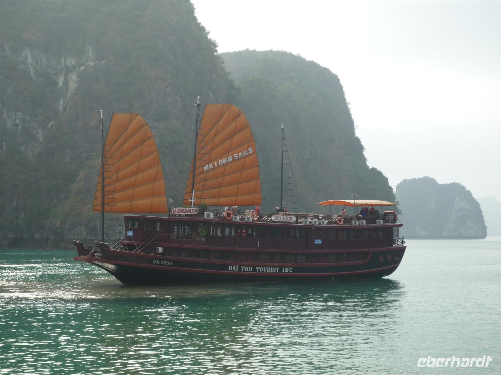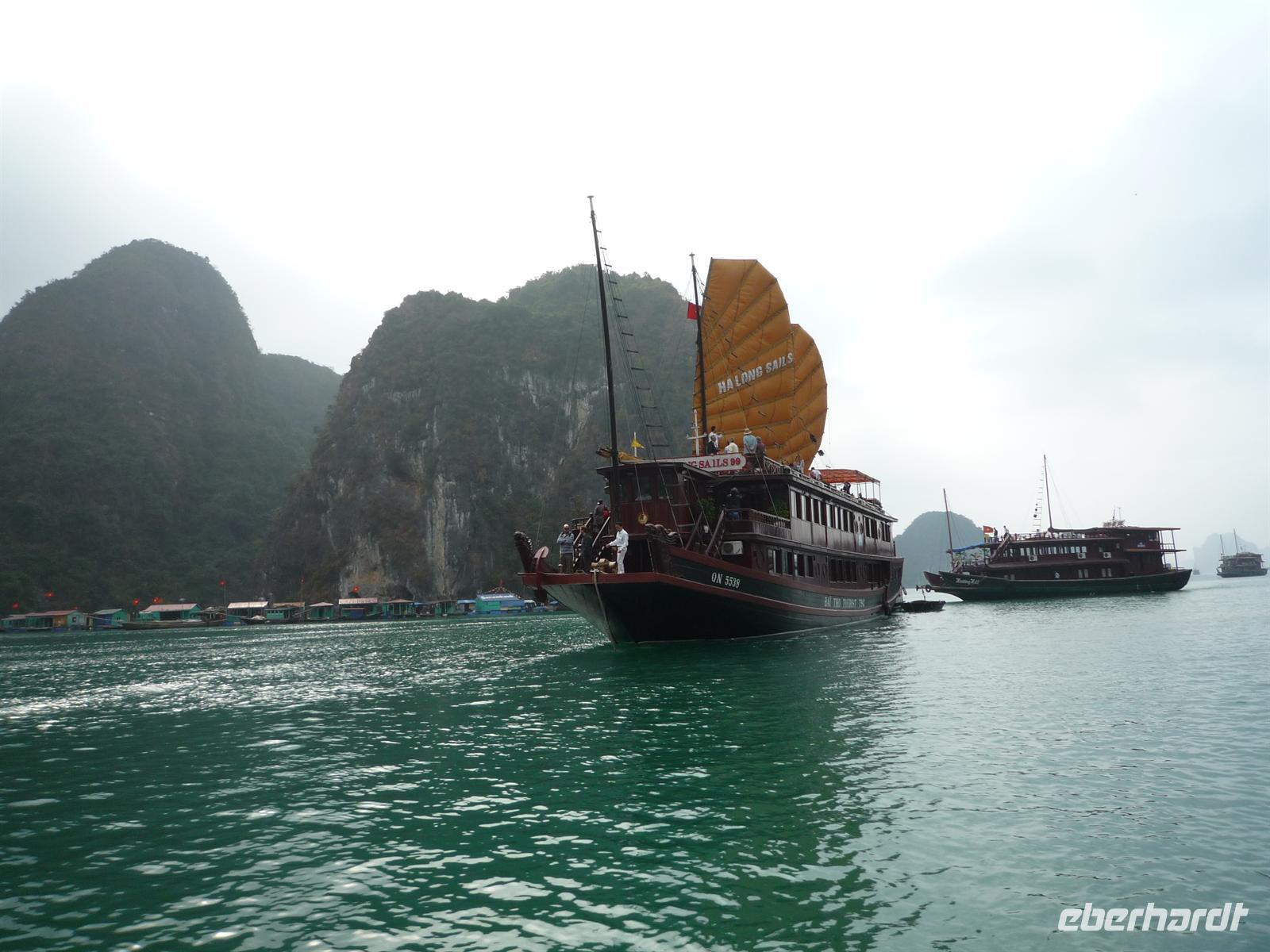 Die Bucht gehört zum UNESCO-Weltnaturerbe. Wir betreten unserer komfortablen Dschunke, die mit allem denkbaren Komfort ausgestattet ist und gleiten nun durch die anmutende Karstfelsen und kleinen schwimmenden Fischerdörfer. Nach jedem Berg eröffnete sich uns ein neuer, atemberaubender Blick. Nach einem stärkenden und sehr guten Mittagessen, natürlich gab es viel Fisch und Meeresfrüchte, legen wir auch schon das erste Mal an für eine Wanderung durch eine riesige Tropfsteinhöhle. Die Höhle ist riesengroß und wir staunen, denn das hätten wir hier nicht erwartet. Anschließend nutzen wir die freie Zeit am Nachmittag, um an einer Insel anzulegen und dort zu einem Aussichtspunkt zu wandern. Von hier aus genossen wir den wunderschönen Sonnenuntergang über der Ha-Long-Bucht. Anschließend nutzten einige Gäste noch die Möglichkeit, zu baden und zum Aufstieg auf einen Aussichtsberg, von dem man einen herrlichen Überblick hat. Am Abend dinieren wir auf unserer Dschunke und das Essen ist wieder vom Feinsten. Es gibt natürlich wieder viel Fisch und Meeresfrüchte, für viele etwas ganz besonderes. Heute feiern wir auch einen Geburtstag und da gibt es noch ein Stück Geburtstagstorte und einen Reisschnaps zum Anstoßen. Ein schöner Abend auf einem schönen Schiff geht zu Ende! Wir ankern in einer Bucht mit vielen weiteren Schiffen, leider ist es etwas bedeckt, so dass wir keine Sterne beobachten können. Unsere Kabinen sind komfortabel ausgestattet und verfügen über ein eigenes Badezimmer.