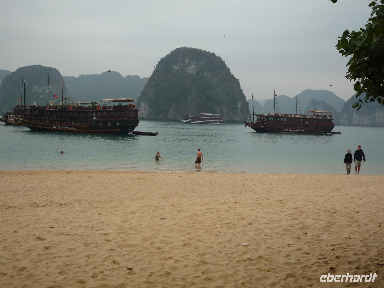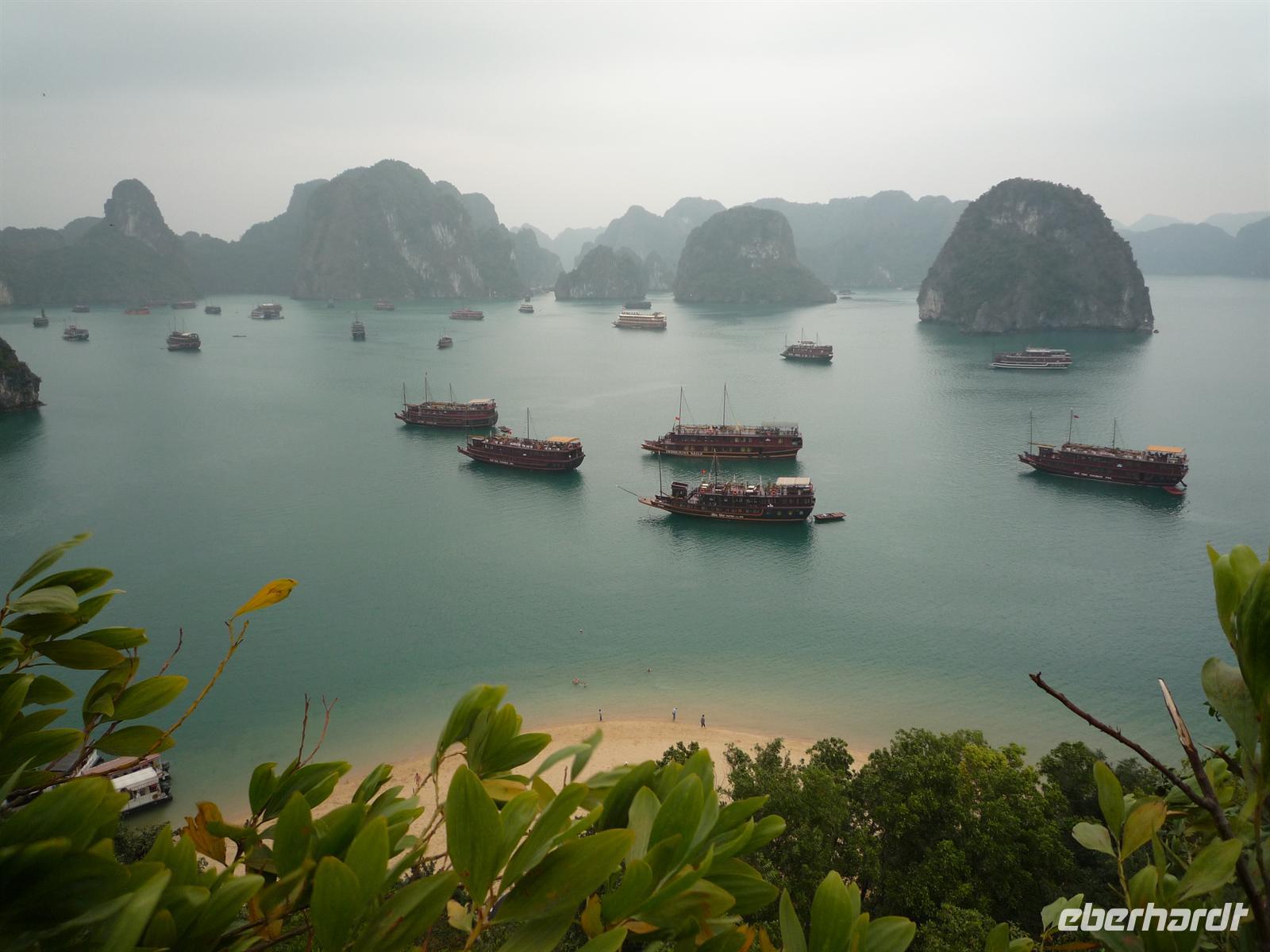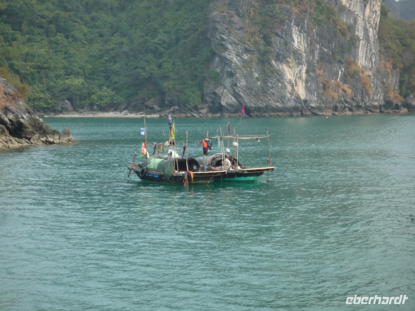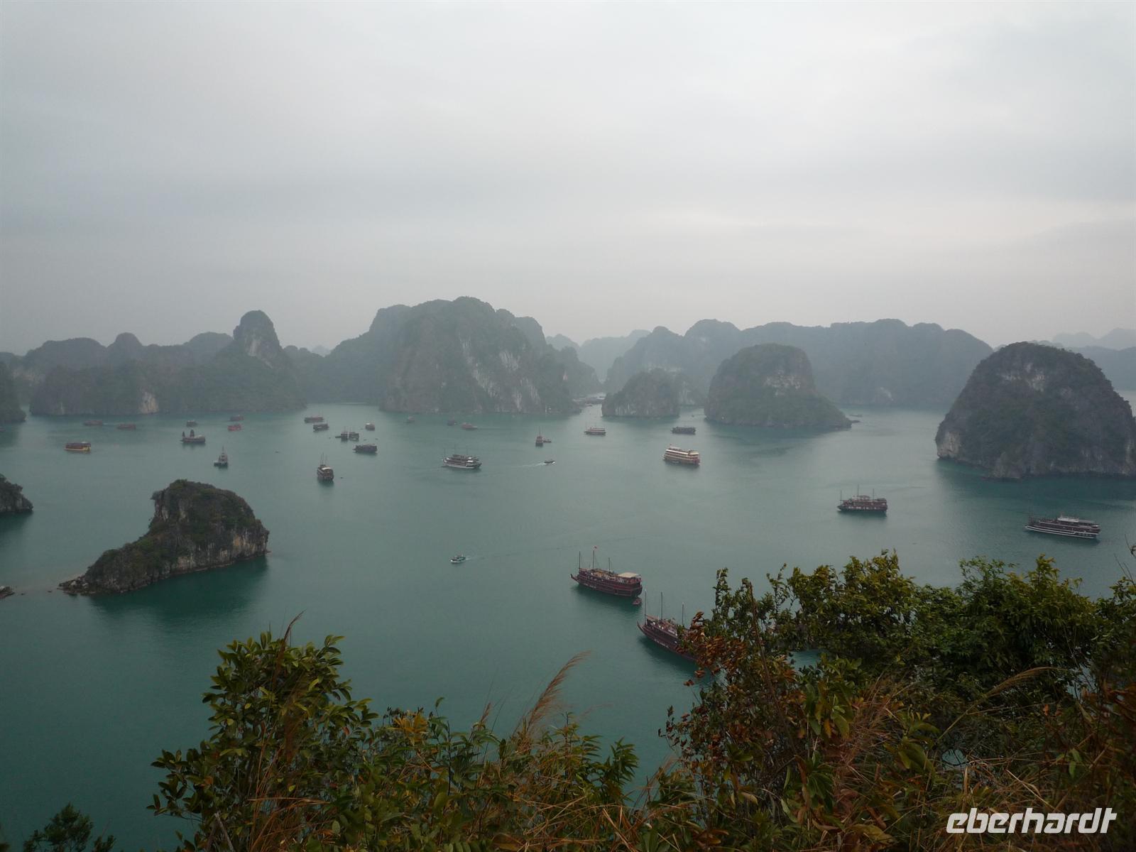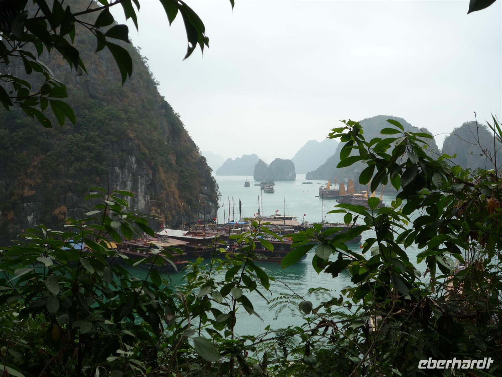 Die Bucht gehört zum UNESCO-Weltnaturerbe. Wir betreten unserer komfortablen Dschunke, die mit allem denkbaren Komfort ausgestattet ist und gleiten nun durch die anmutende Karstfelsen und kleinen schwimmenden Fischerdörfer. Nach jedem Berg eröffnete sich uns ein neuer, atemberaubender Blick. Nach einem stärkenden und sehr guten Mittagessen, natürlich gab es viel Fisch und Meeresfrüchte, legen wir auch schon das erste Mal an für eine Wanderung durch eine riesige Tropfsteinhöhle. Die Höhle ist riesengroß und wir staunen, denn das hätten wir hier nicht erwartet. Anschließend nutzen wir die freie Zeit am Nachmittag, um an einer Insel anzulegen und dort zu einem Aussichtspunkt zu wandern. Von hier aus genossen wir den wunderschönen Sonnenuntergang über der Ha-Long-Bucht. Anschließend nutzten einige Gäste noch die Möglichkeit, zu baden und zum Aufstieg auf einen Aussichtsberg, von dem man einen herrlichen Überblick hat. Am Abend dinieren wir auf unserer Dschunke und das Essen ist wieder vom Feinsten. Es gibt natürlich wieder viel Fisch und Meeresfrüchte, für viele etwas ganz besonderes. Heute feiern wir auch einen Geburtstag und da gibt es noch ein Stück Geburtstagstorte und einen Reisschnaps zum Anstoßen. Ein schöner Abend auf einem schönen Schiff geht zu Ende! Wir ankern in einer Bucht mit vielen weiteren Schiffen, leider ist es etwas bedeckt, so dass wir keine Sterne beobachten können. Unsere Kabinen sind komfortabel ausgestattet und verfügen über ein eigenes Badezimmer.