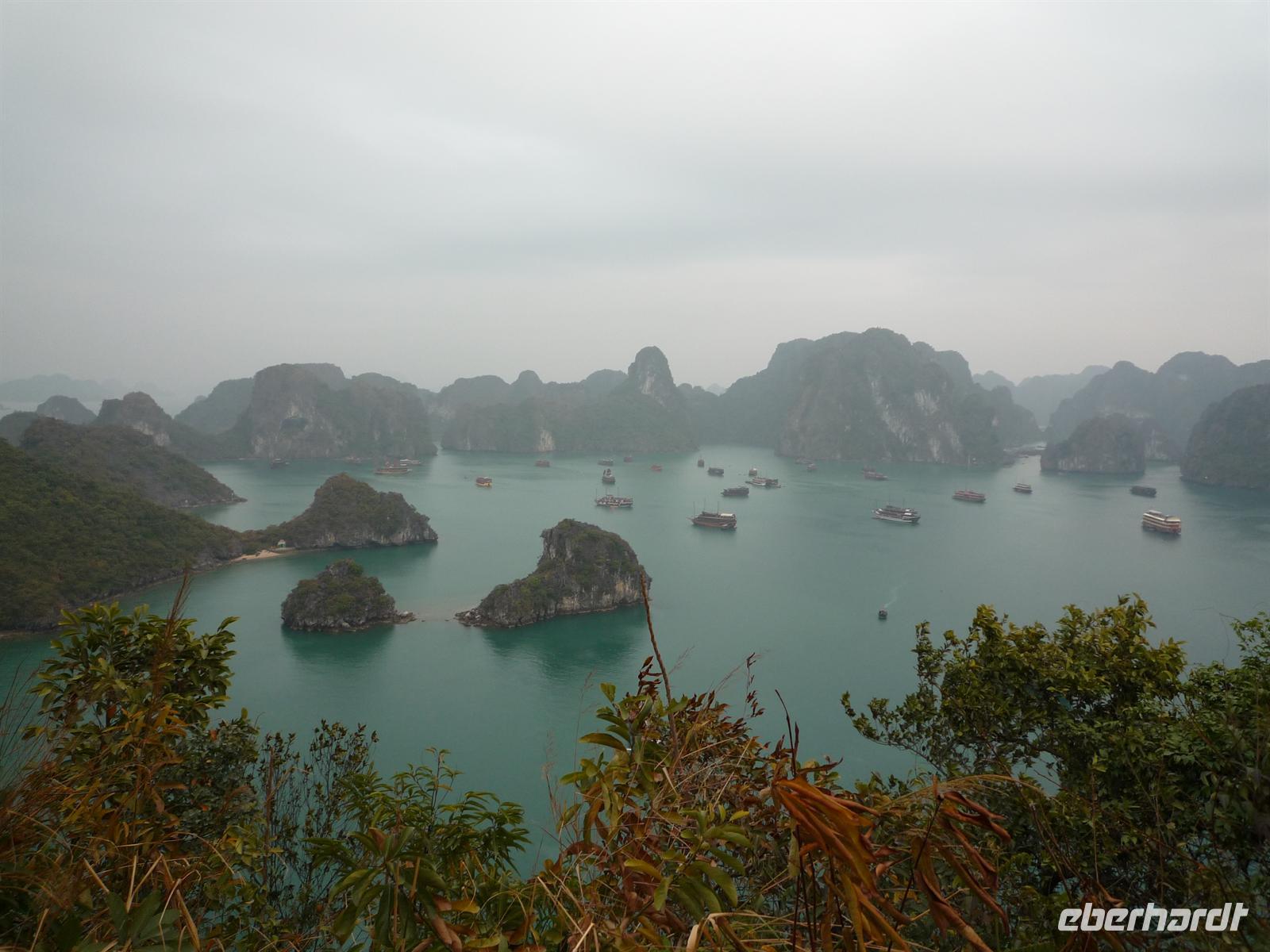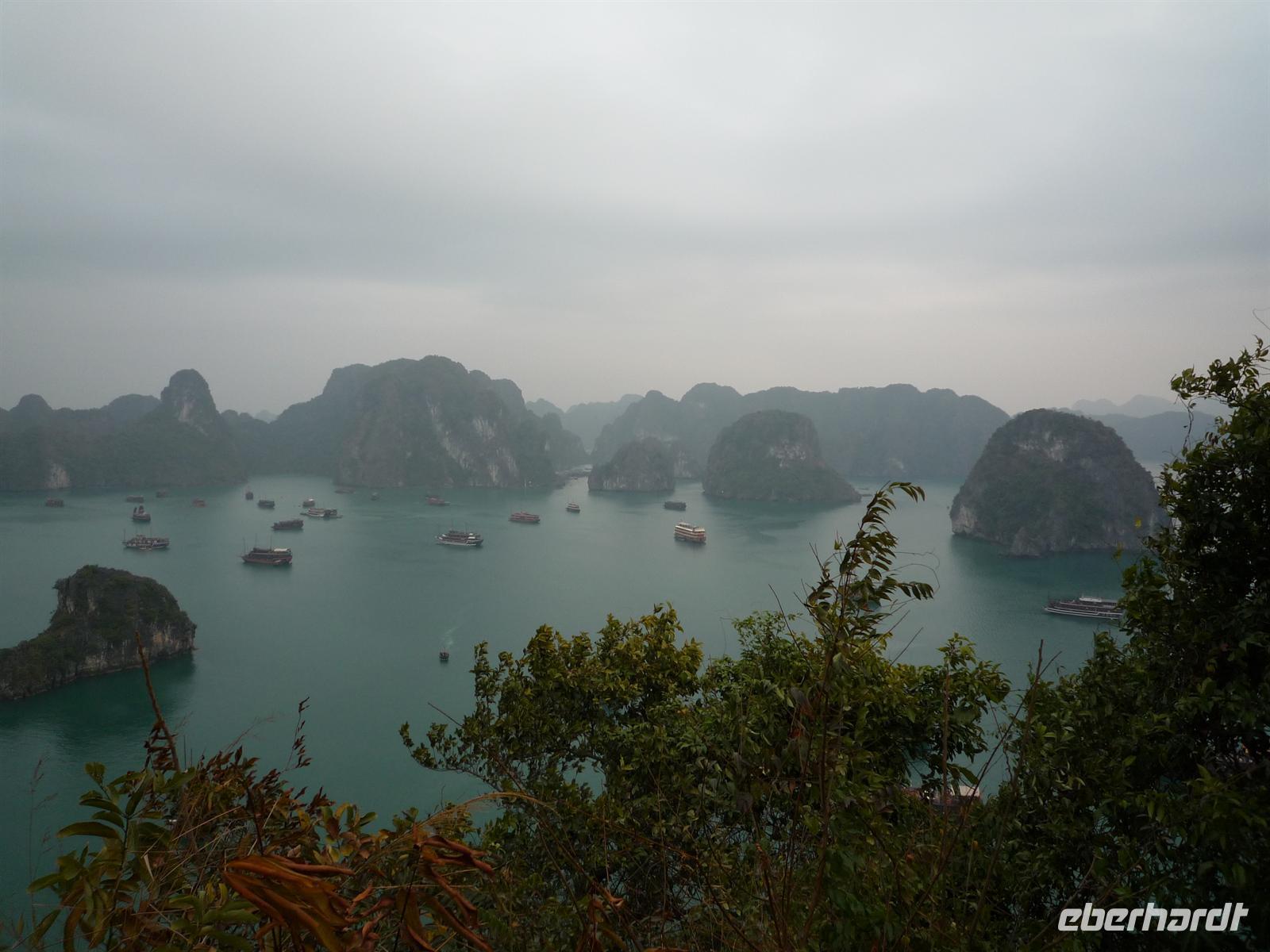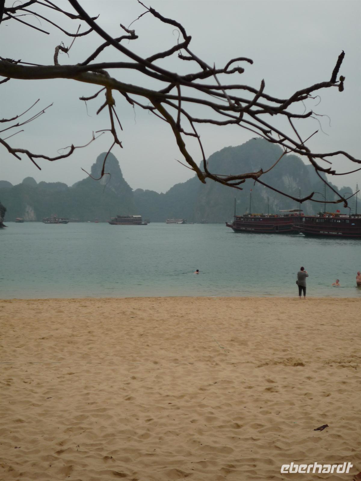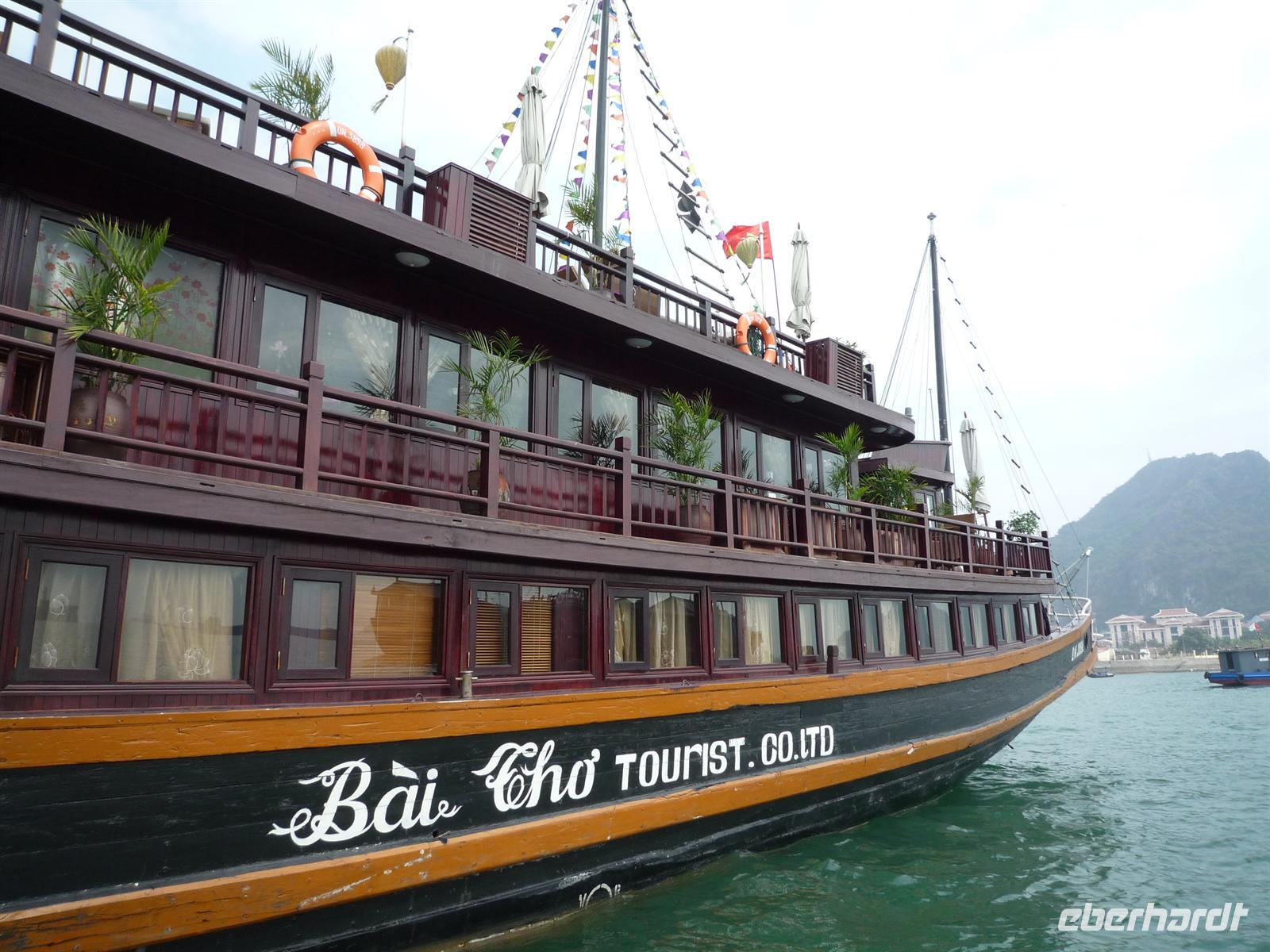 Die Bucht gehört zum UNESCO-Weltnaturerbe. Wir betreten unserer komfortablen Dschunke, die mit allem denkbaren Komfort ausgestattet ist und gleiten nun durch die anmutende Karstfelsen und kleinen schwimmenden Fischerdörfer. Nach jedem Berg eröffnete sich uns ein neuer, atemberaubender Blick. Nach einem stärkenden und sehr guten Mittagessen, natürlich gab es viel Fisch und Meeresfrüchte, legen wir auch schon das erste Mal an für eine Wanderung durch eine riesige Tropfsteinhöhle. Die Höhle ist riesengroß und wir staunen, denn das hätten wir hier nicht erwartet. Anschließend nutzen wir die freie Zeit am Nachmittag, um an einer Insel anzulegen und dort zu einem Aussichtspunkt zu wandern. Von hier aus genossen wir den wunderschönen Sonnenuntergang über der Ha-Long-Bucht. Anschließend nutzten einige Gäste noch die Möglichkeit, zu baden und zum Aufstieg auf einen Aussichtsberg, von dem man einen herrlichen Überblick hat. Am Abend dinieren wir auf unserer Dschunke und das Essen ist wieder vom Feinsten. Es gibt natürlich wieder viel Fisch und Meeresfrüchte, für viele etwas ganz besonderes. Heute feiern wir auch einen Geburtstag und da gibt es noch ein Stück Geburtstagstorte und einen Reisschnaps zum Anstoßen. Ein schöner Abend auf einem schönen Schiff geht zu Ende! Wir ankern in einer Bucht mit vielen weiteren Schiffen, leider ist es etwas bedeckt, so dass wir keine Sterne beobachten können. Unsere Kabinen sind komfortabel ausgestattet und verfügen über ein eigenes Badezimmer.
