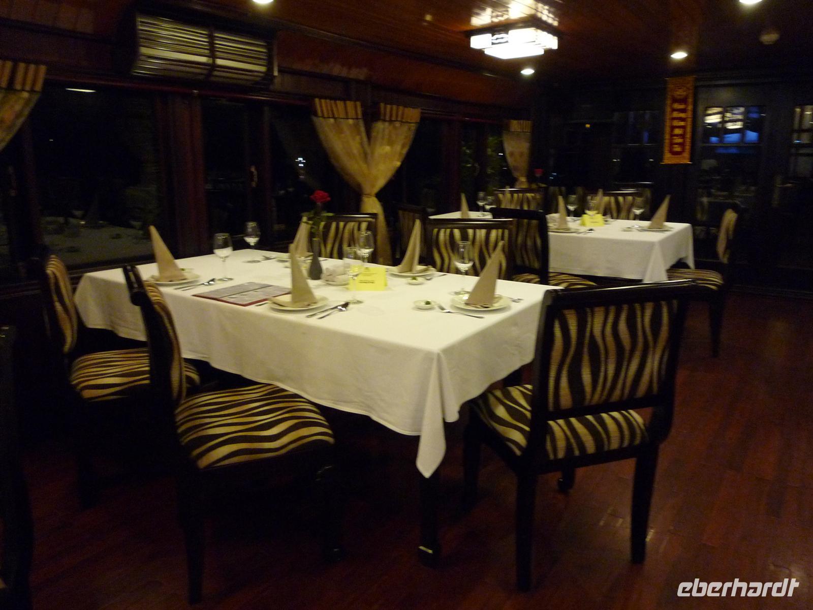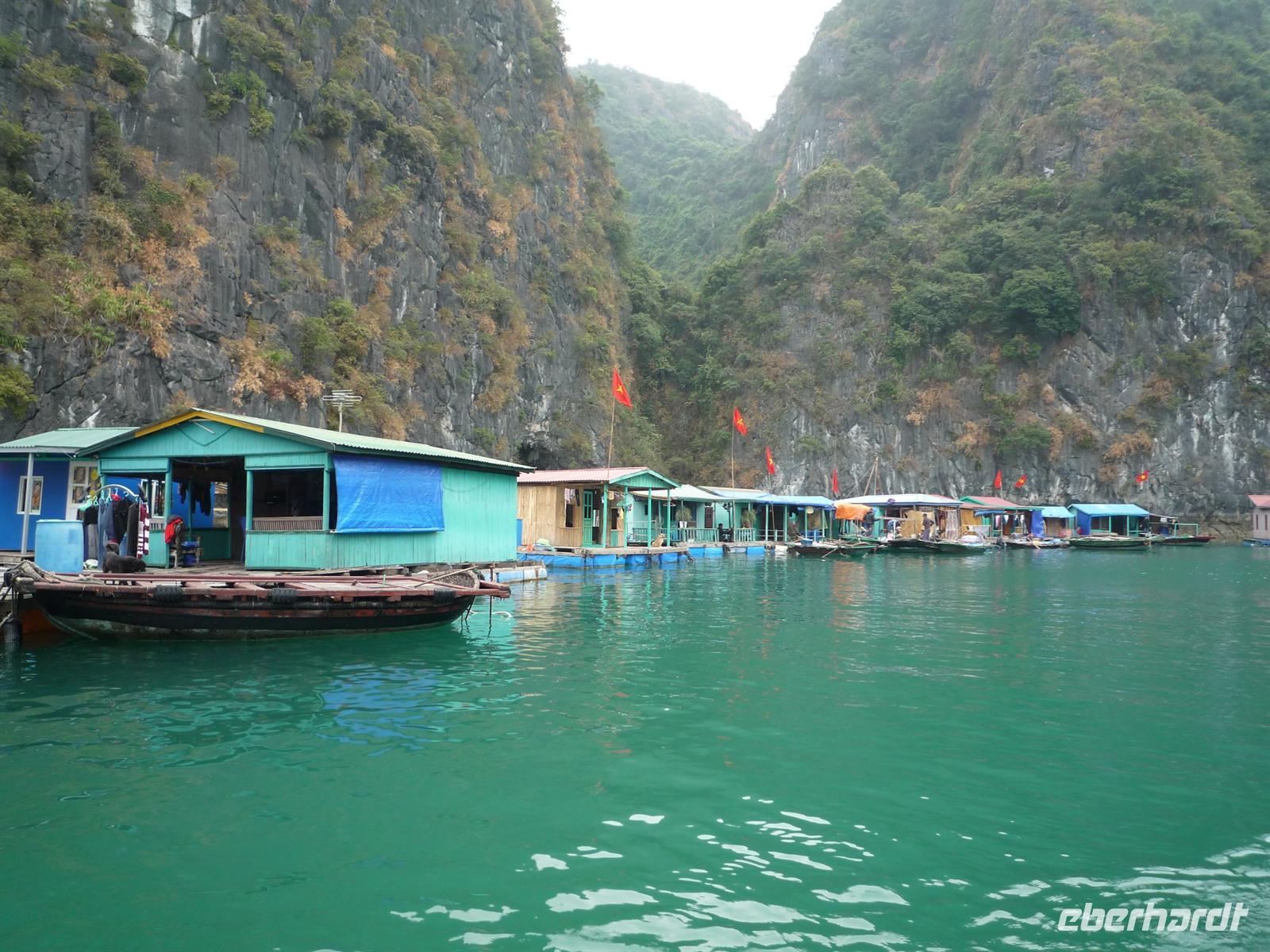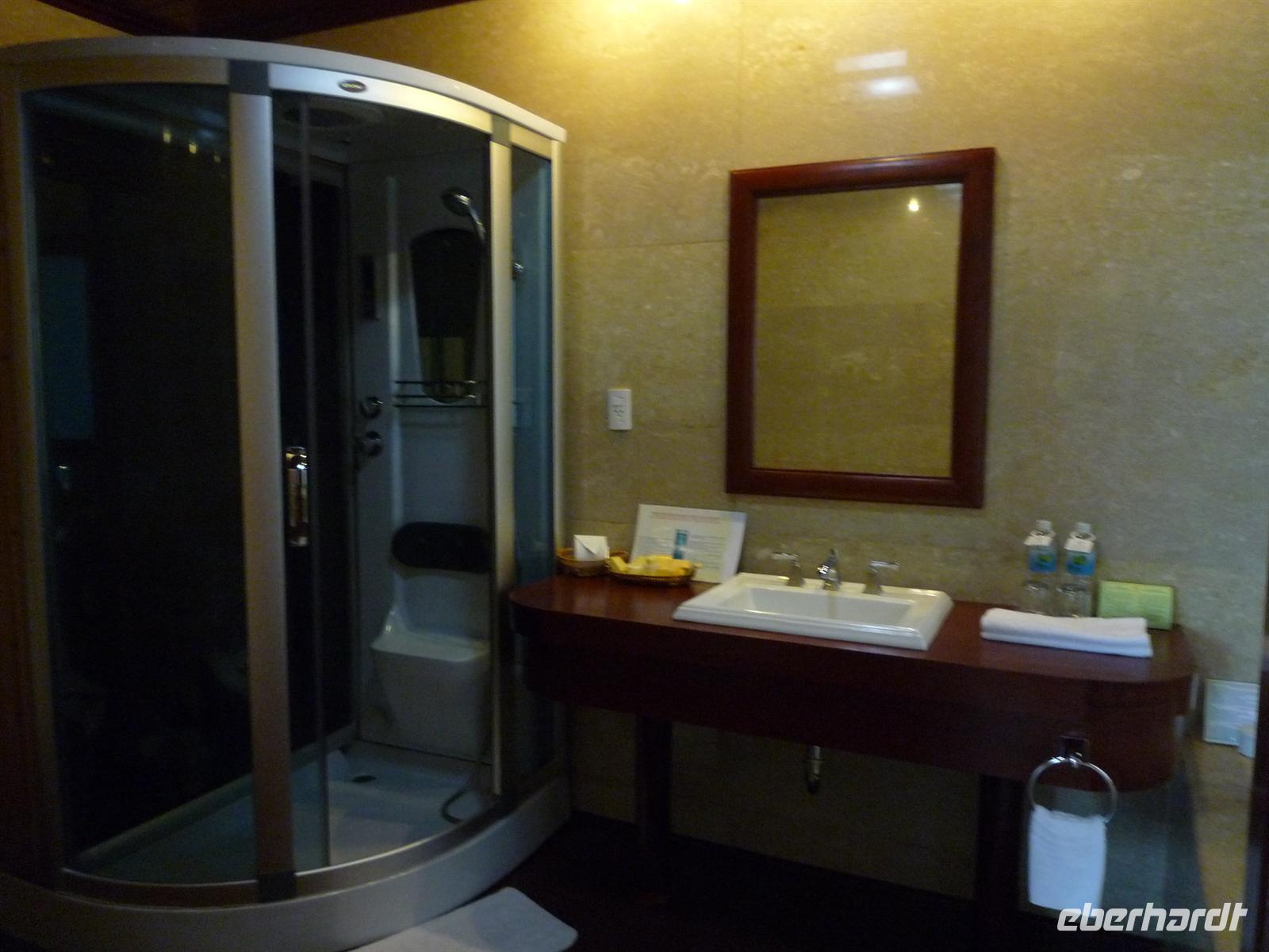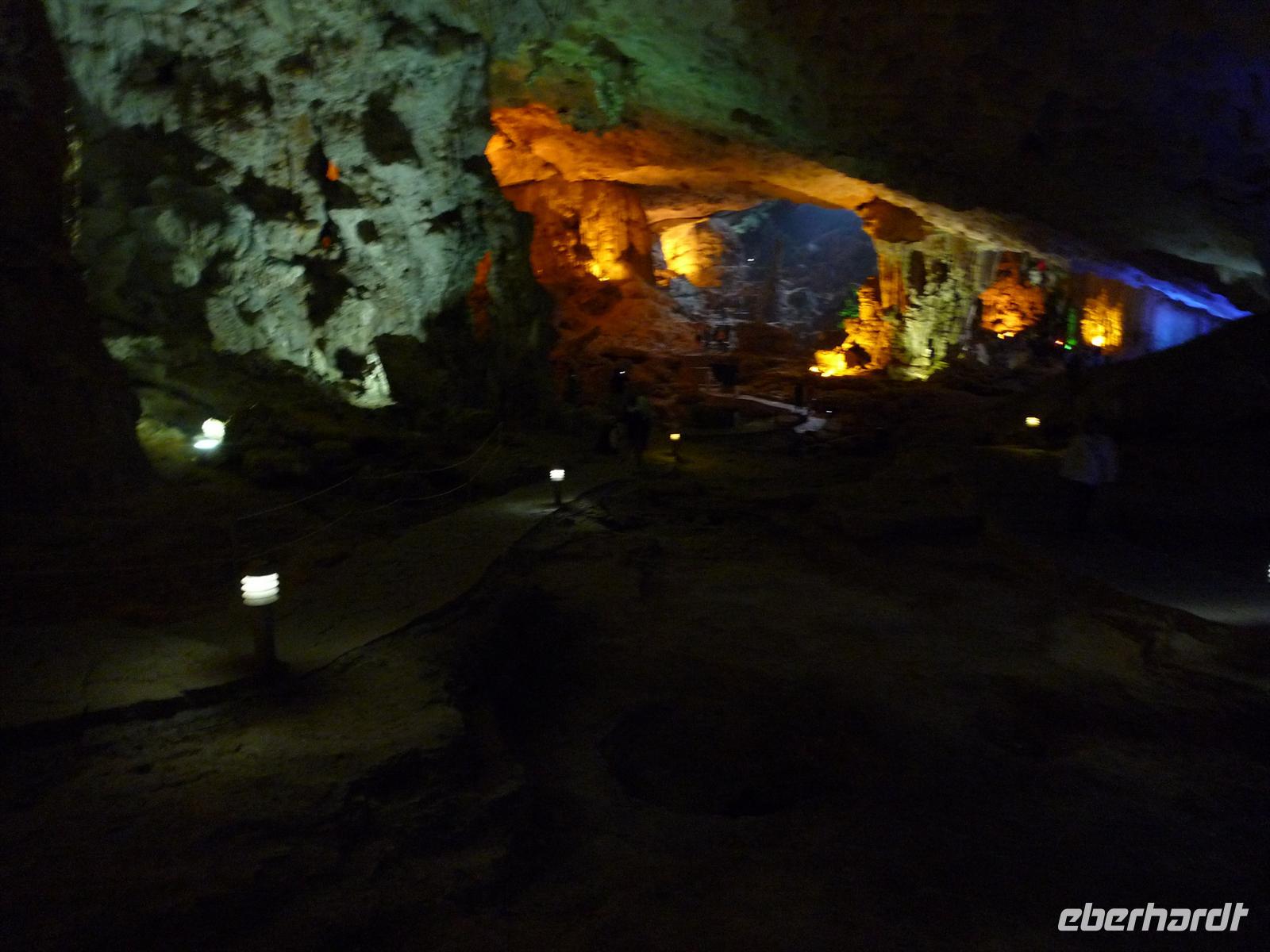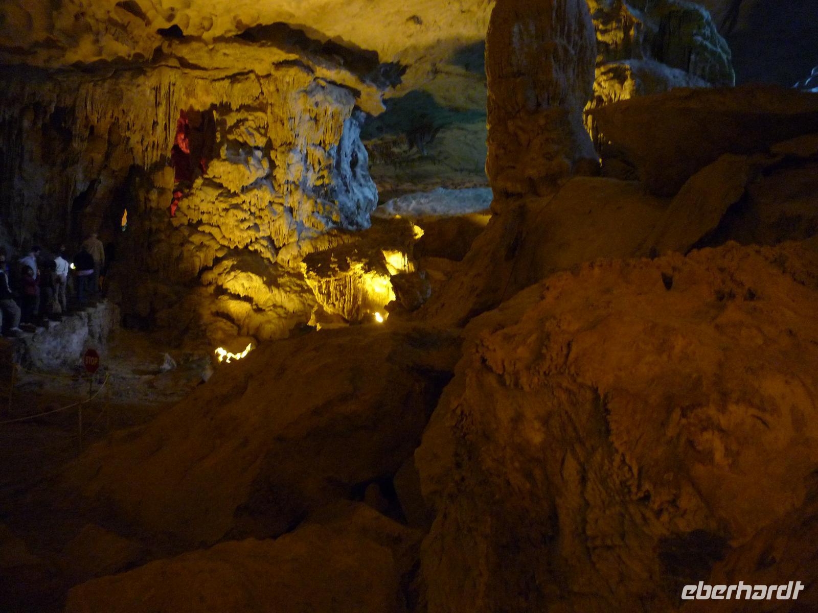Die Bucht gehört zum UNESCO-Weltnaturerbe. Wir betreten unserer komfortablen Dschunke, die mit allem denkbaren Komfort ausgestattet ist und gleiten nun durch die anmutende Karstfelsen und kleinen schwimmenden Fischerdörfer. Nach jedem Berg eröffnete sich uns ein neuer, atemberaubender Blick. Nach einem stärkenden und sehr guten Mittagessen, natürlich gab es viel Fisch und Meeresfrüchte, legen wir auch schon das erste Mal an für eine Wanderung durch eine riesige Tropfsteinhöhle. Die Höhle ist riesengroß und wir staunen, denn das hätten wir hier nicht erwartet. Anschließend nutzen wir die freie Zeit am Nachmittag, um an einer Insel anzulegen und dort zu einem Aussichtspunkt zu wandern. Von hier aus genossen wir den wunderschönen Sonnenuntergang über der Ha-Long-Bucht. Anschließend nutzten einige Gäste noch die Möglichkeit, zu baden und zum Aufstieg auf einen Aussichtsberg, von dem man einen herrlichen Überblick hat. Am Abend dinieren wir auf unserer Dschunke und das Essen ist wieder vom Feinsten. Es gibt natürlich wieder viel Fisch und Meeresfrüchte, für viele etwas ganz besonderes. Heute feiern wir auch einen Geburtstag und da gibt es noch ein Stück Geburtstagstorte und einen Reisschnaps zum Anstoßen. Ein schöner Abend auf einem schönen Schiff geht zu Ende! Wir ankern in einer Bucht mit vielen weiteren Schiffen, leider ist es etwas bedeckt, so dass wir keine Sterne beobachten können. Unsere Kabinen sind komfortabel ausgestattet und verfügen über ein eigenes Badezimmer.